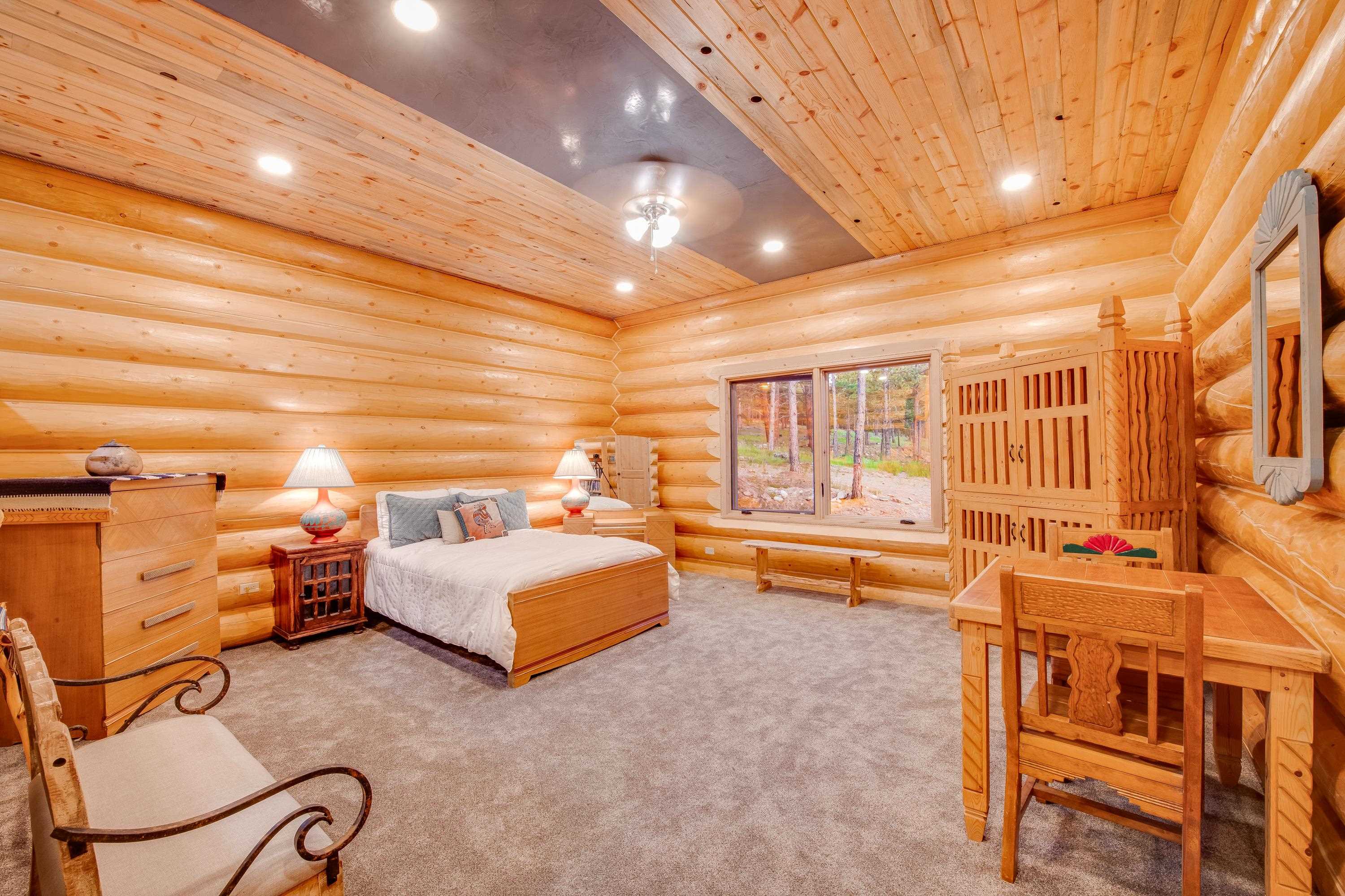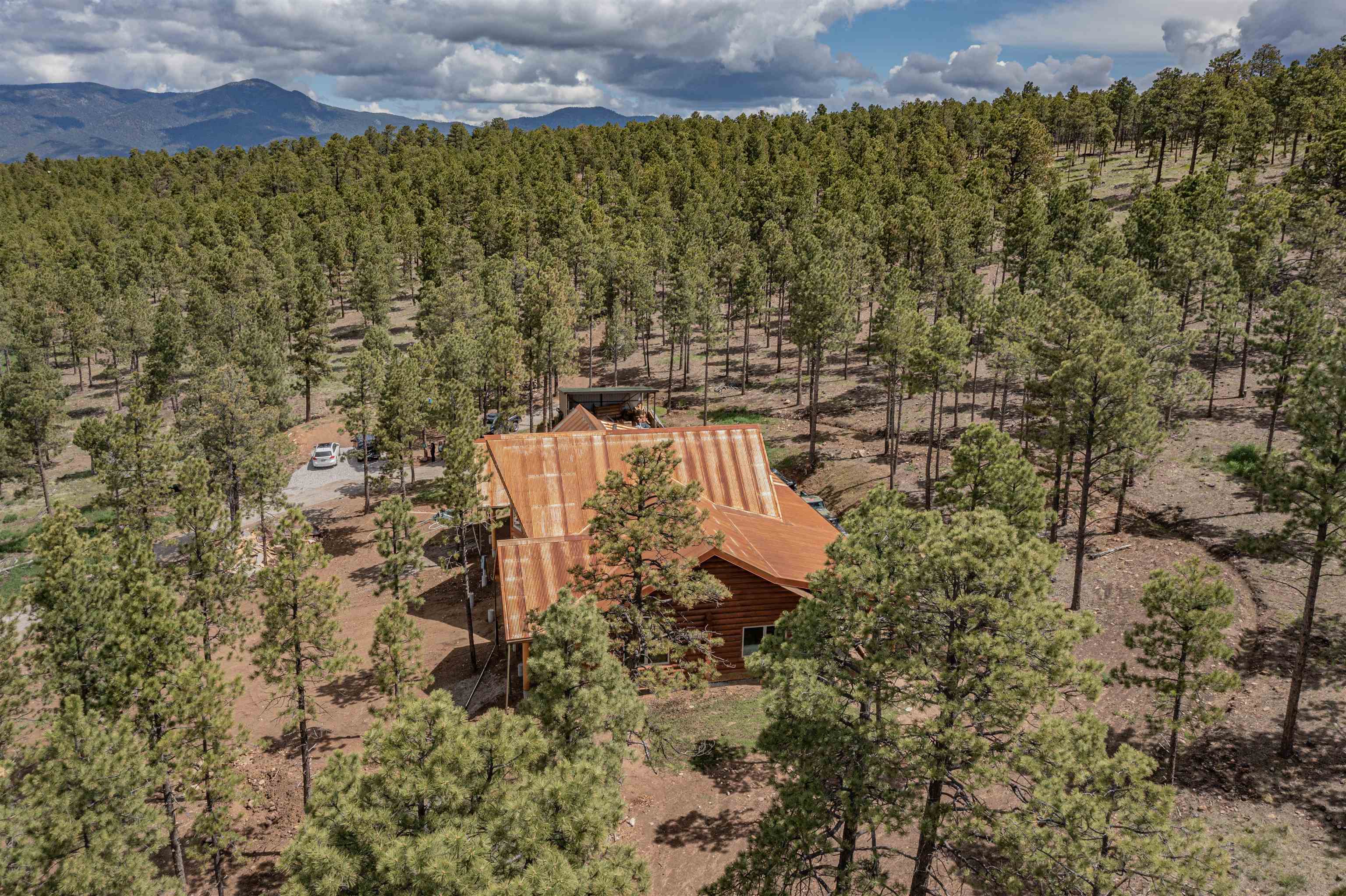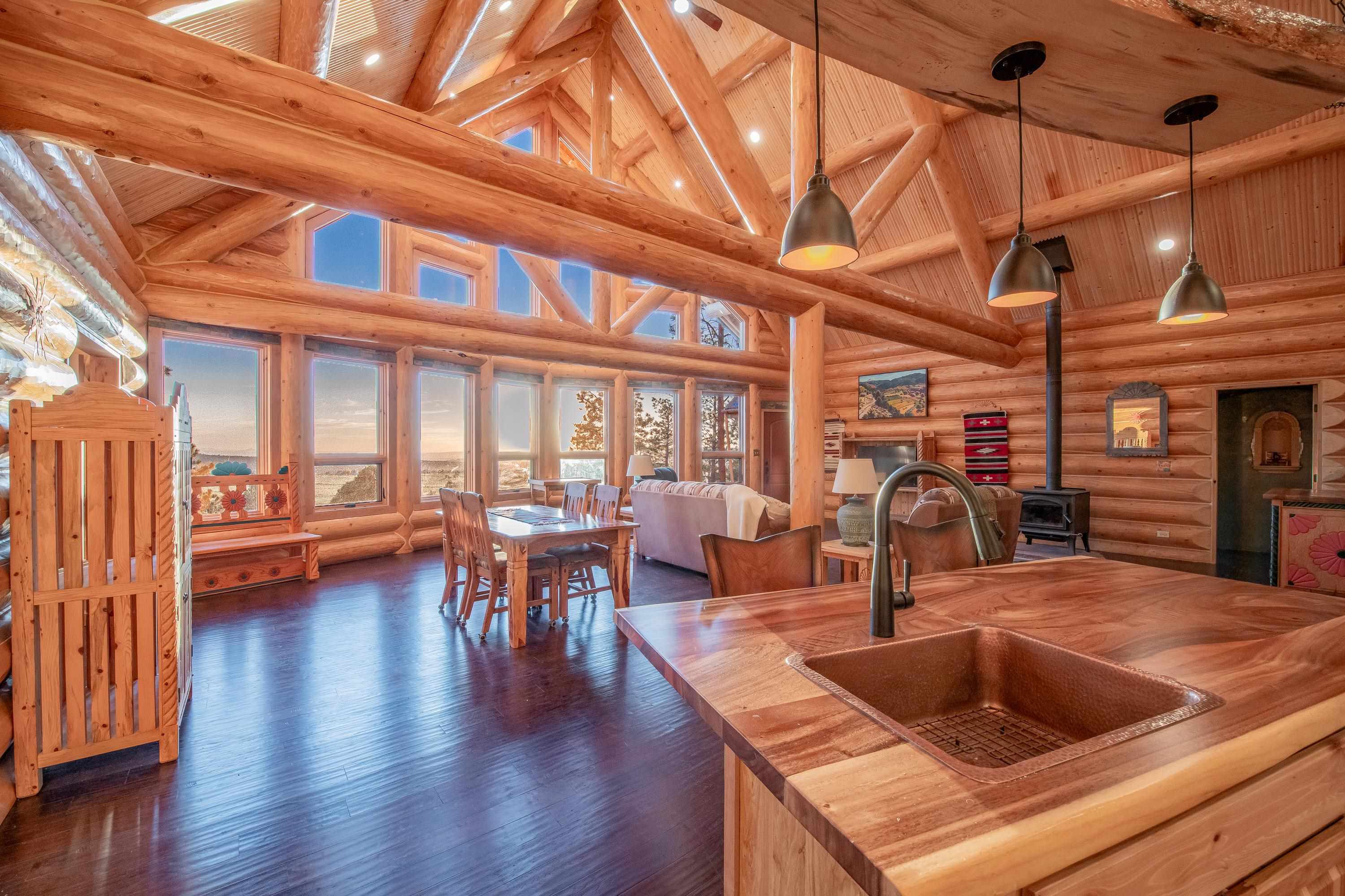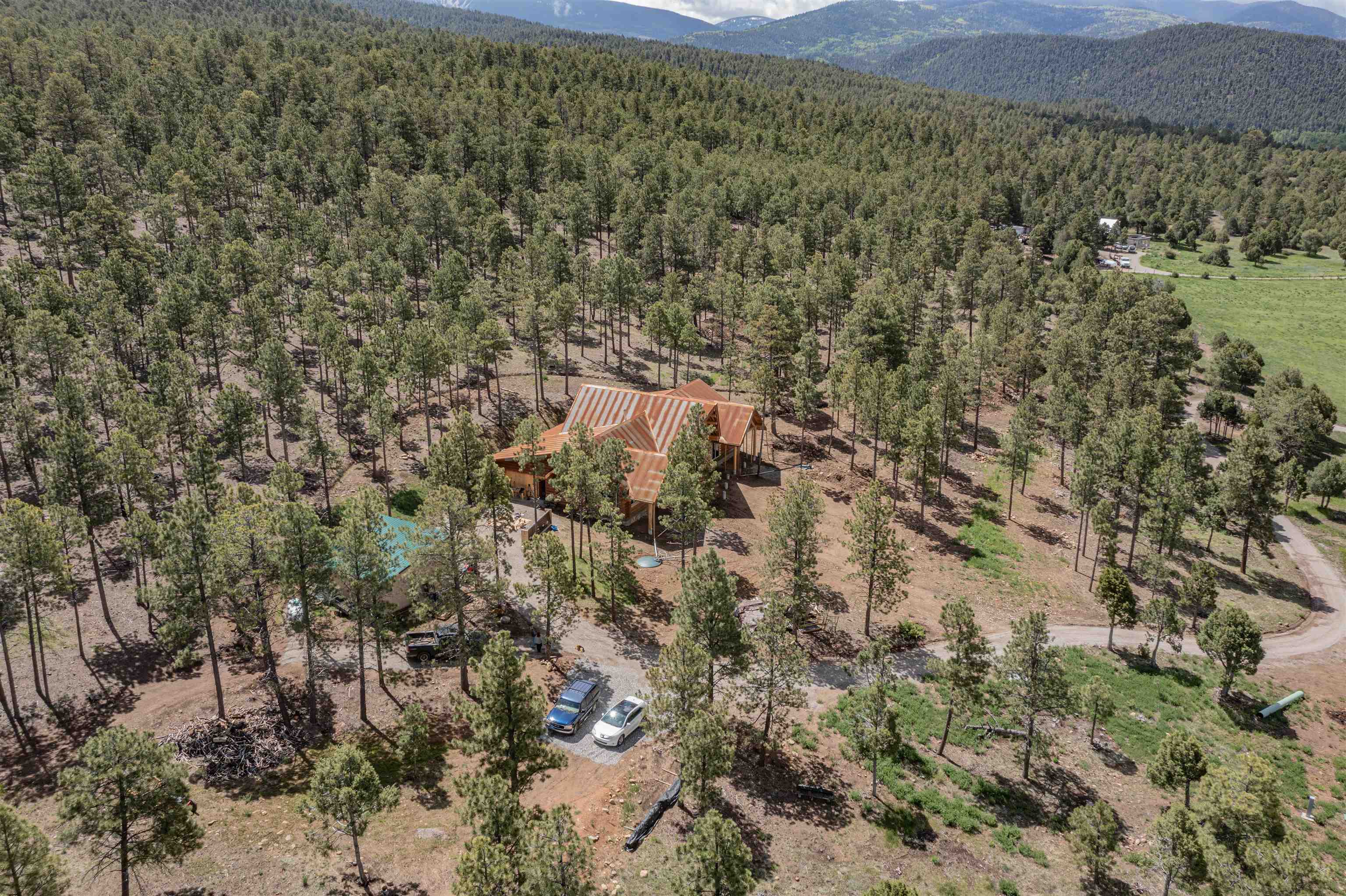 Nestled in a grove of ponderosa pine and embraced by the fresh mountain air of the Sangre de Cristo Mountain range, this property offers more than a view… It offers a way of life. Following the natural movement of the hillsides, the private road leads you on a welcoming path to a unique home, resting perfectly in-tune with its environment. Unbothered by population density, this home is located on the southern end of the Rocky Mountains, just 30 miles south of historic Taos, New Mexico. At 8,500 ft, this 285+- acre landscape lends airspace to a stunning view of the 13,000 feet Jicarita Peak (a mountain held sacred by the local Picuris Pueblo people) and neighbors the Carson National Forest and Pecos Wilderness. It stands ideally situated amongst a bountiful, restored ponderosa pine forest (an officially Registered American Tree Farm) and produces a synergistic ecosystem and wildlife habitat for local flowers, grasses, shrubs, elk, turkey, hawk and deer! Venture farther and you will discover a canyon with flourishing Aspen and Fir trees and two natural earth-fed springs. Numerous ponds (9) created specifically to provide water to wildlife and for erosion control sit on the property. This spacious ranch provides twenty +- acres of flood irrigated pasture from two well-maintained acequias and 14+- acres of dry pasture. They yield an abundance of hay for horses or space for other crops. Clearing and maintaining the registered American Tree Farm have been a source of income in the past and can continue to do so. The ranch is registered with New Mexico Fish and Game for landowner elk tags in Unit 45 and is located within 60 to 70 miles of five ski resorts, namely Sipapu (14 miles), Taos Ski Valley, Angel Fire, Red River and Ski Santa Fe, supplying an outstanding selection of diverse activities for people of all ages and abilities. This log cabin lodge is brand new! Having been recently completed, it boasts a 27-foot cathedral ceiling, three bedrooms, two bathrooms, hot tub, wood burning stove, and a four-car garage/workshop with a 350 square foot bonus room upstairs, within its approximate 4,000+- square feet, with an additional 1,200 square feet of flawless decks - perfect for small intimate dinners or larger sophisticated gatherings. The 12-inch logs and floor plans that foundationally support this home were purchased from Montana Custom Log Homes Inc, the acclaimed creators and designers of custom-built, versatile, and handcrafted homes for generations. The distinctive prow of this floor plan allows for a view of hundreds of square miles of northern New Mexico valleys and mountains out of the 25 west facing windows. Sunsets are glorious! With a roof, specially treated to give an ancient or aged feel, this expansive home packs in the details! Including a rich hand carved door into the pantry, a copper lined kitchen sink and copper hood over range, live edge countertops, specialty tiled bathrooms, distinctive glass and onyx basins on bathroom vanities and specialty wood ceilings. Hand crafted southwestern style furnishings (may be negotiated with sale of property). Underground utilities, highspeed fiberoptic internet cable, gravel driveway, cisterns for water catchment, seeded lawns, 25 x 25 carport and so much more. Property excellent for that unique family get a way, secondary or primary home compound, or corporate retreat, the use is endless. A truly special and unique property awaits you! Don’t miss out! Schedule your viewing today.