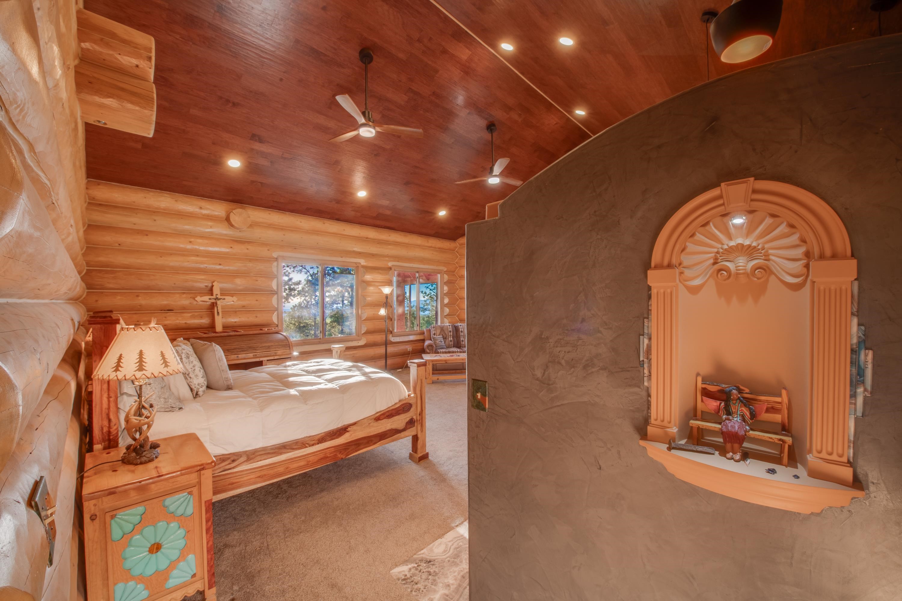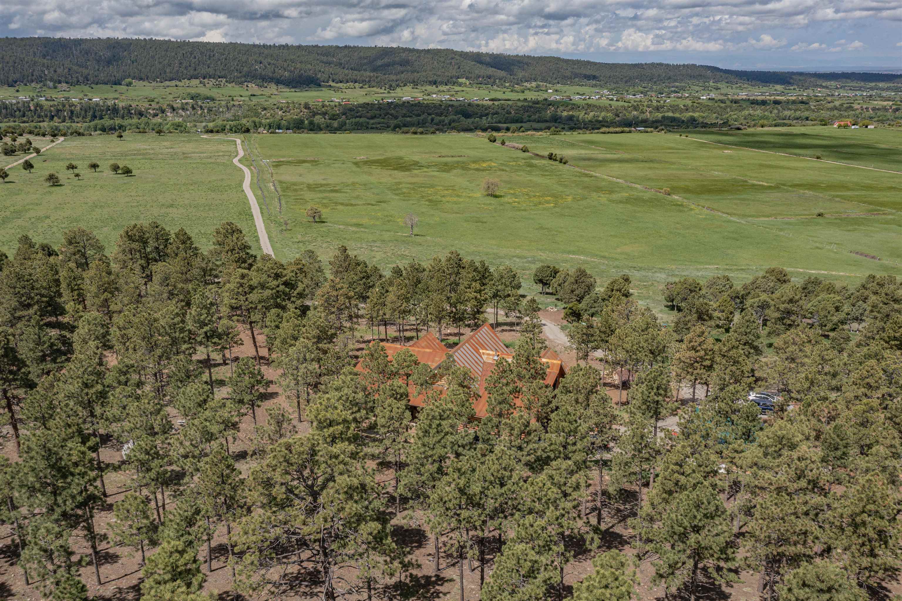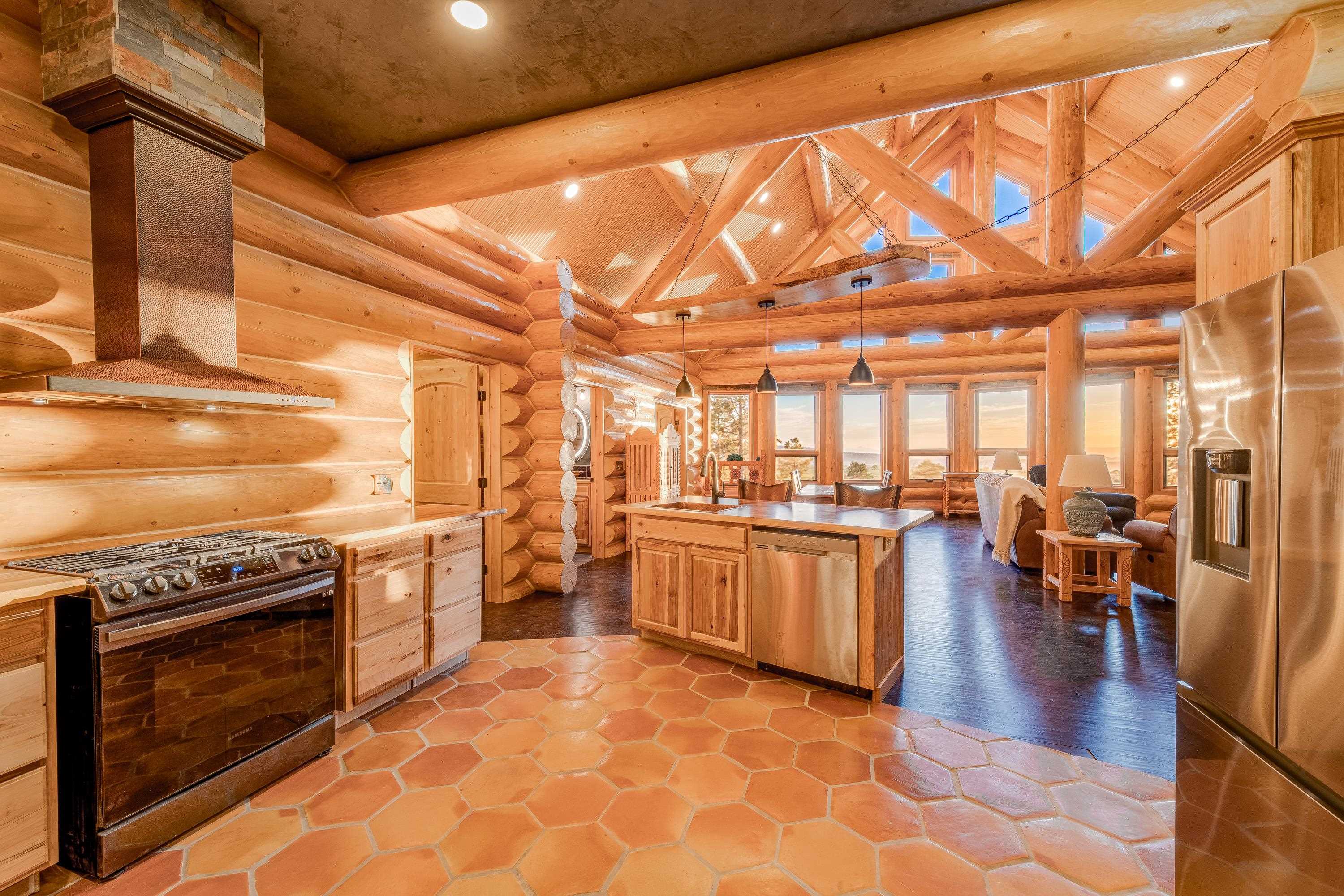 Nestled in a grove of ponderosa pine and embraced by the fresh mountain air of the Sangre de Cristo Mountain range, this property offers more than a view… It offers a way of life. Following the natural movement of the hillsides, the private road leads you on a welcoming path to a unique home, resting perfectly in-tune with its environment. Unbothered by population density, this home is located on the southern end of the Rocky Mountains, just 30 miles south of historic Taos, New Mexico. At 8,500 ft, this 285+- acre landscape lends airspace to a stunning view of the 13,000 feet Jicarita Peak (a mountain held sacred by the local Picuris Pueblo people) and neighbors the Carson National Forest and Pecos Wilderness. It stands ideally situated amongst a bountiful, restored ponderosa pine forest (an officially Registered American Tree Farm) and produces a synergistic ecosystem and wildlife habitat for local flowers, grasses, shrubs, elk, turkey, hawk and deer! Venture farther and you will discover a canyon with flourishing Aspen and Fir trees and two natural earth-fed springs. Numerous ponds (9) created specifically to provide water to wildlife and for erosion control sit on the property. This spacious ranch provides twenty +- acres of flood irrigated pasture from two well-maintained acequias and 14+- acres of dry pasture. They yield an abundance of hay for horses or space for other crops. Clearing and maintaining the registered American Tree Farm have been a source of income in the past and can continue to do so. The ranch is registered with New Mexico Fish and Game for landowner elk tags in Unit 45 and is located within 60 to 70 miles of five ski resorts, namely Sipapu (14 miles), Taos Ski Valley, Angel Fire, Red River and Ski Santa Fe, supplying an outstanding selection of diverse activities for people of all ages and abilities. This log cabin lodge is brand new! Having been recently completed, it boasts a 27-foot cathedral ceiling, three bedrooms, two bathrooms, hot tub, wood burning stove, and a four-car garage/workshop with a 350 square foot bonus room upstairs, within its approximate 4,000+- square feet, with an additional 1,200 square feet of flawless decks - perfect for small intimate dinners or larger sophisticated gatherings. The 12-inch logs and floor plans that foundationally support this home were purchased from Montana Custom Log Homes Inc, the acclaimed creators and designers of custom-built, versatile, and handcrafted homes for generations. The distinctive prow of this floor plan allows for a view of hundreds of square miles of northern New Mexico valleys and mountains out of the 25 west facing windows. Sunsets are glorious! With a roof, specially treated to give an ancient or aged feel, this expansive home packs in the details! Including a rich hand carved door into the pantry, a copper lined kitchen sink and copper hood over range, live edge countertops, specialty tiled bathrooms, distinctive glass and onyx basins on bathroom vanities and specialty wood ceilings. Hand crafted southwestern style furnishings (may be negotiated with sale of property). Underground utilities, highspeed fiberoptic internet cable, gravel driveway, cisterns for water catchment, seeded lawns, 25 x 25 carport and so much more. Property excellent for that unique family get a way, secondary or primary home compound, or corporate retreat, the use is endless. A truly special and unique property awaits you! Don’t miss out! Schedule your viewing today.