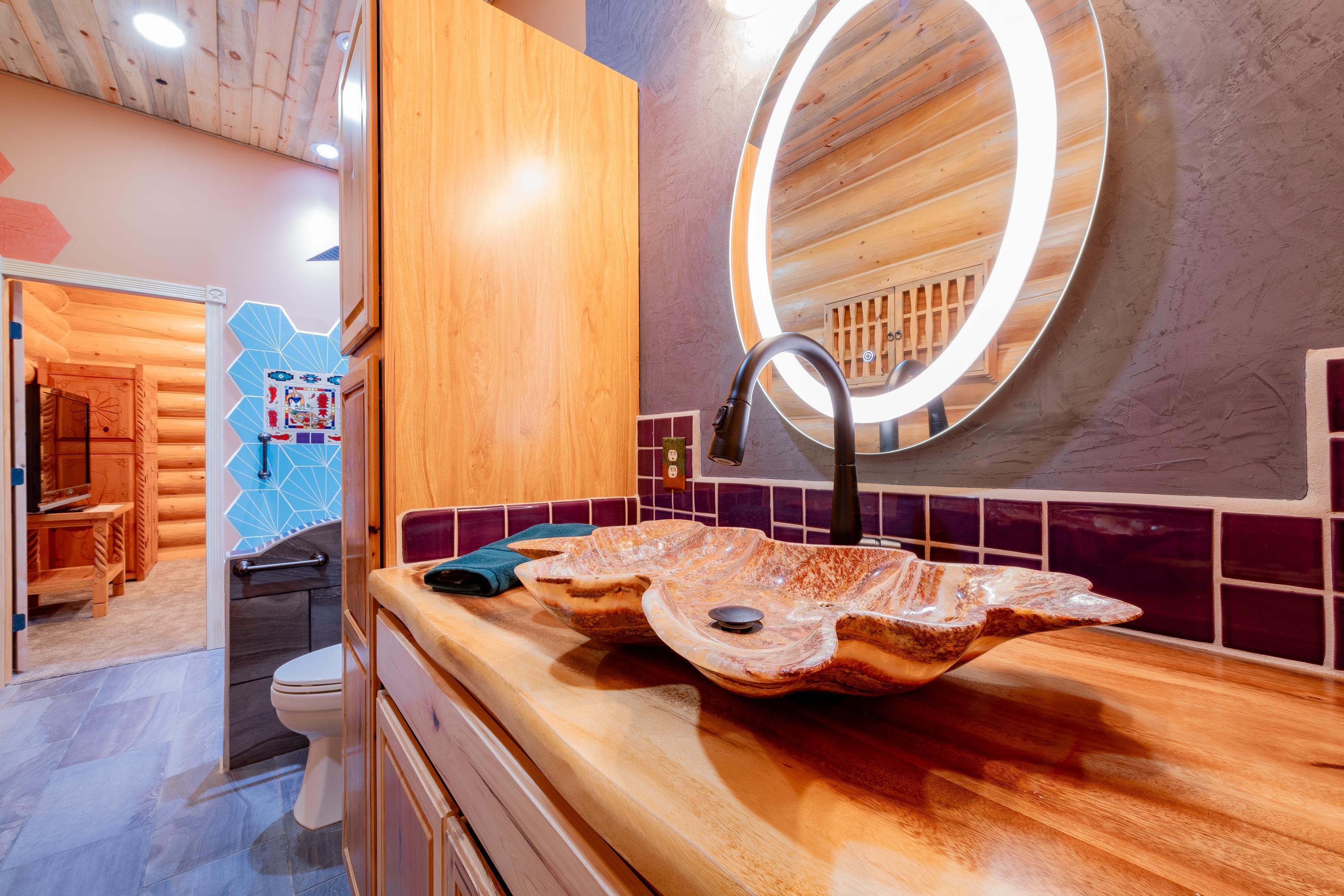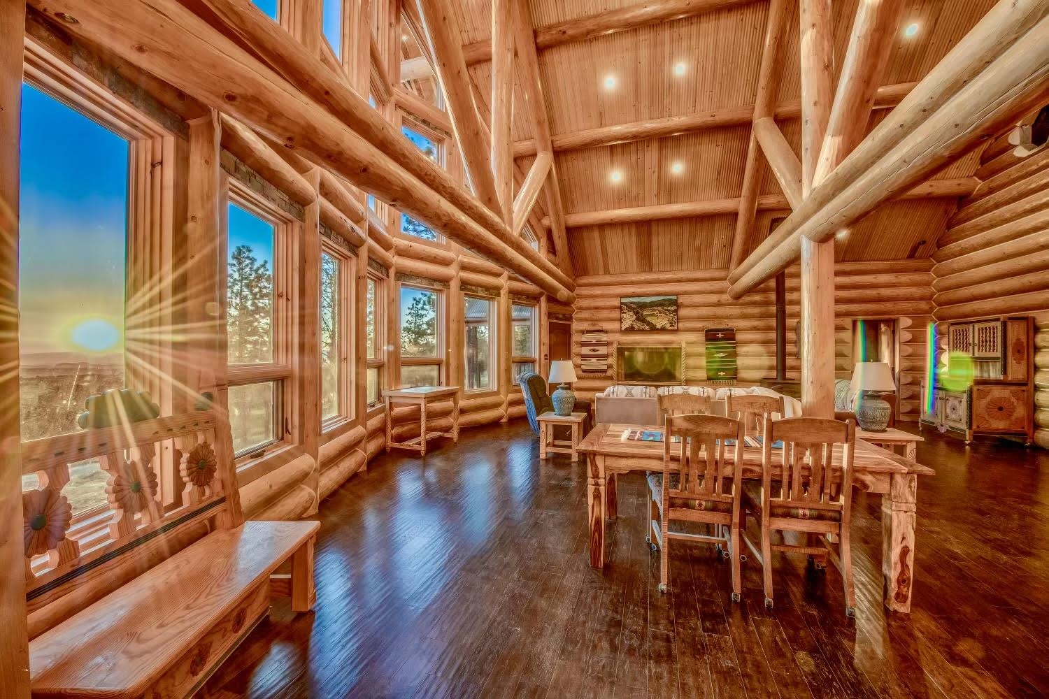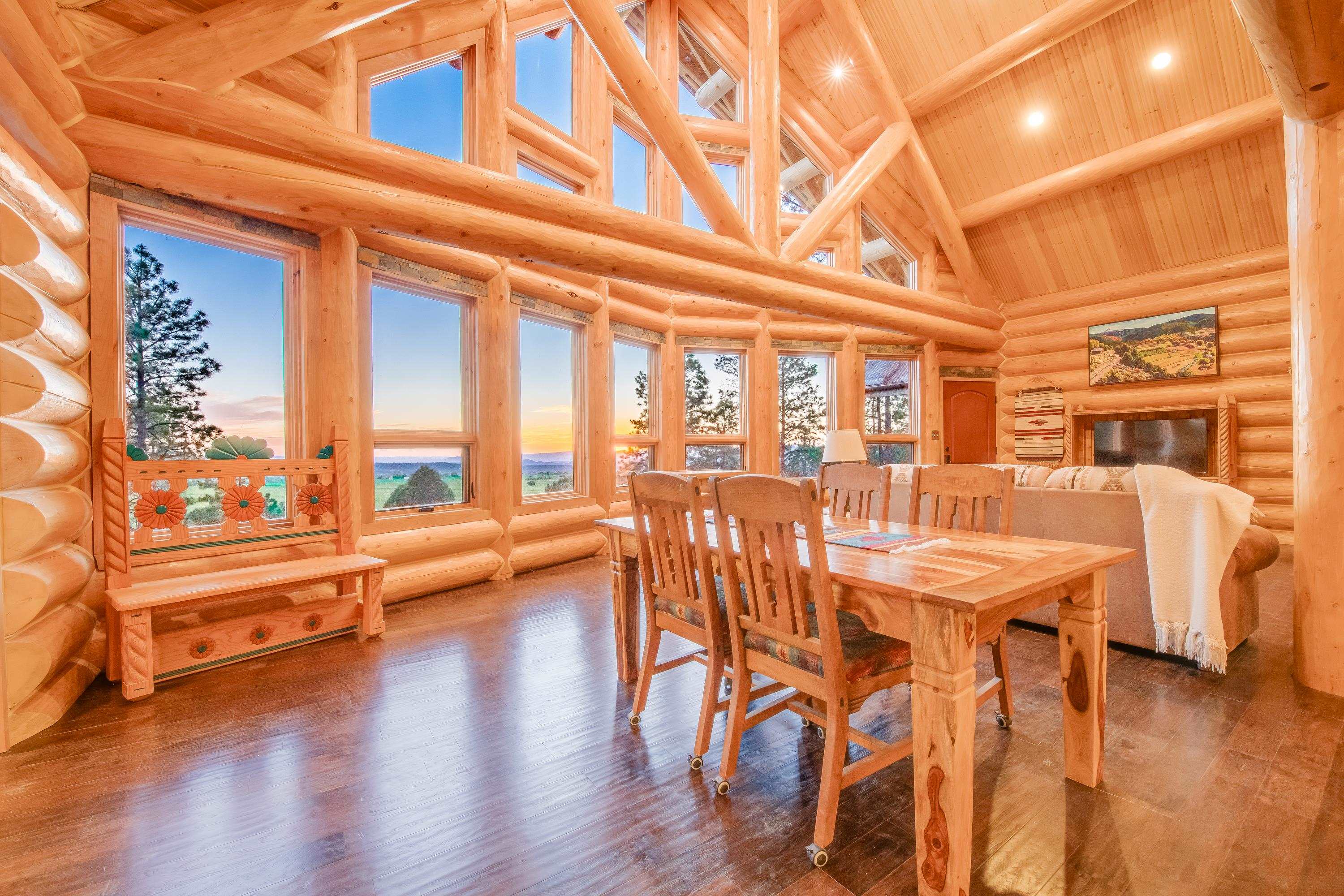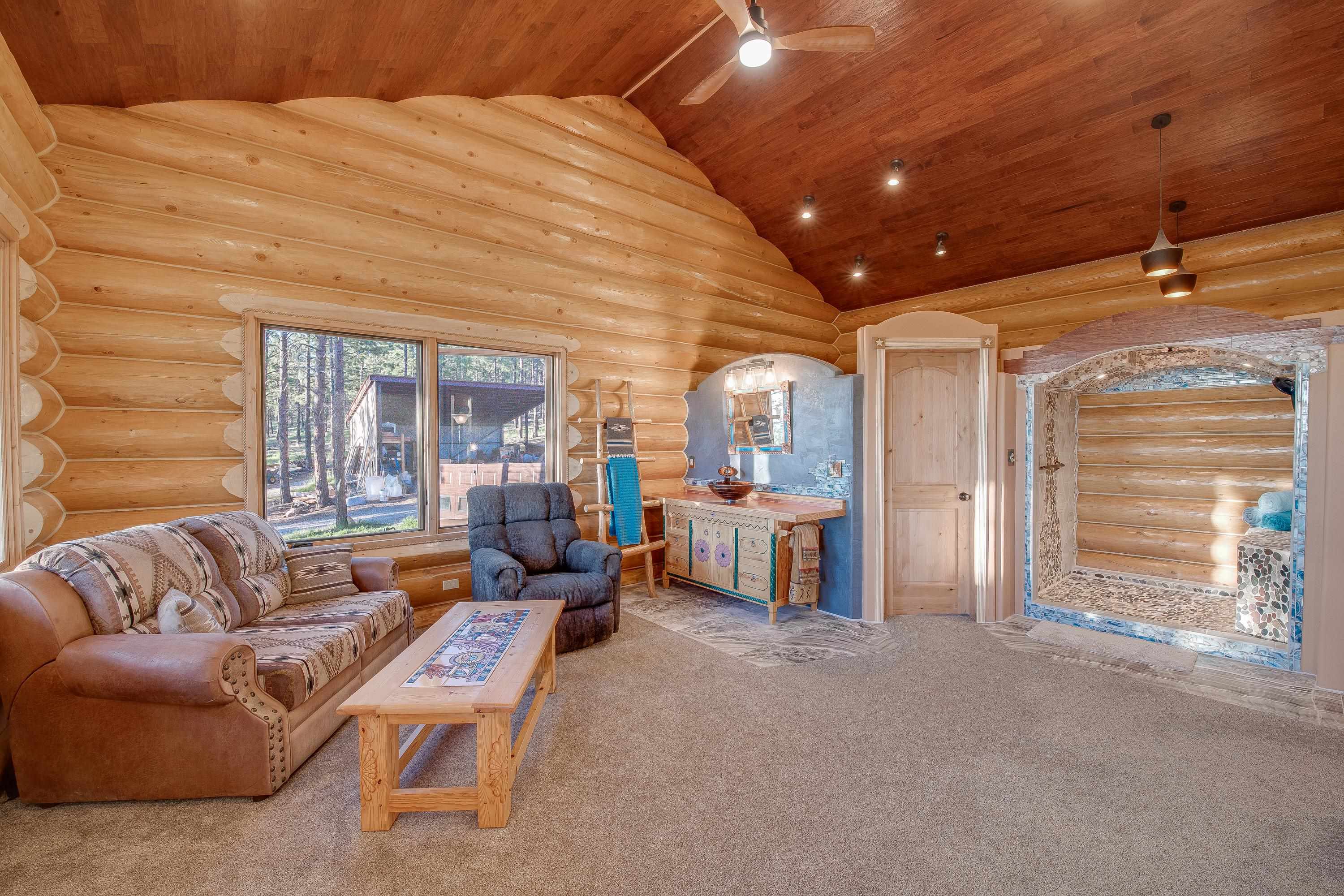 Nestled in a grove of ponderosa pine and embraced by the fresh mountain air of the Sangre de Cristo Mountain range, this property offers more than a view… It offers a way of life. Following the natural movement of the hillsides, the private road leads you on a welcoming path to a unique home, resting perfectly in-tune with its environment. Unbothered by population density, this home is located on the southern end of the Rocky Mountains, just 30 miles south of historic Taos, New Mexico. At 8,500 ft, this 285+- acre landscape lends airspace to a stunning view of the 13,000 feet Jicarita Peak (a mountain held sacred by the local Picuris Pueblo people) and neighbors the Carson National Forest and Pecos Wilderness. It stands ideally situated amongst a bountiful, restored ponderosa pine forest (an officially Registered American Tree Farm) and produces a synergistic ecosystem and wildlife habitat for local flowers, grasses, shrubs, elk, turkey, hawk and deer! Venture farther and you will discover a canyon with flourishing Aspen and Fir trees and two natural earth-fed springs. Numerous ponds (9) created specifically to provide water to wildlife and for erosion control sit on the property. This spacious ranch provides twenty +- acres of flood irrigated pasture from two well-maintained acequias and 14+- acres of dry pasture. They yield an abundance of hay for horses or space for other crops. Clearing and maintaining the registered American Tree Farm have been a source of income in the past and can continue to do so. The ranch is registered with New Mexico Fish and Game for landowner elk tags in Unit 45 and is located within 60 to 70 miles of five ski resorts, namely Sipapu (14 miles), Taos Ski Valley, Angel Fire, Red River and Ski Santa Fe, supplying an outstanding selection of diverse activities for people of all ages and abilities. This log cabin lodge is brand new! Having been recently completed, it boasts a 27-foot cathedral ceiling, three bedrooms, two bathrooms, hot tub, wood burning stove, and a four-car garage/workshop with a 350 square foot bonus room upstairs, within its approximate 4,000+- square feet, with an additional 1,200 square feet of flawless decks - perfect for small intimate dinners or larger sophisticated gatherings. The 12-inch logs and floor plans that foundationally support this home were purchased from Montana Custom Log Homes Inc, the acclaimed creators and designers of custom-built, versatile, and handcrafted homes for generations. The distinctive prow of this floor plan allows for a view of hundreds of square miles of northern New Mexico valleys and mountains out of the 25 west facing windows. Sunsets are glorious! With a roof, specially treated to give an ancient or aged feel, this expansive home packs in the details! Including a rich hand carved door into the pantry, a copper lined kitchen sink and copper hood over range, live edge countertops, specialty tiled bathrooms, distinctive glass and onyx basins on bathroom vanities and specialty wood ceilings. Hand crafted southwestern style furnishings (may be negotiated with sale of property). Underground utilities, highspeed fiberoptic internet cable, gravel driveway, cisterns for water catchment, seeded lawns, 25 x 25 carport and so much more. Property excellent for that unique family get a way, secondary or primary home compound, or corporate retreat, the use is endless. A truly special and unique property awaits you! Don’t miss out! Schedule your viewing today.