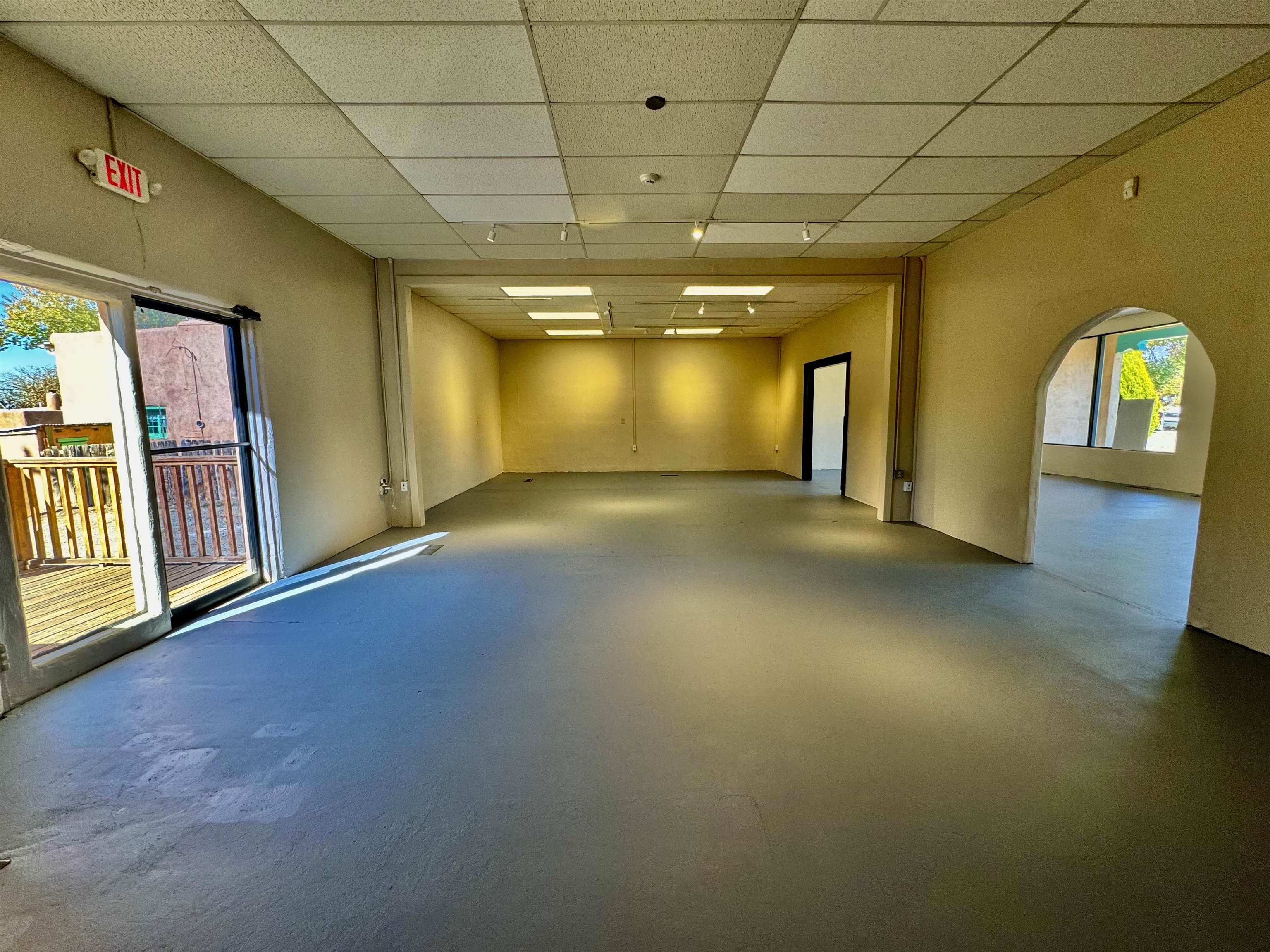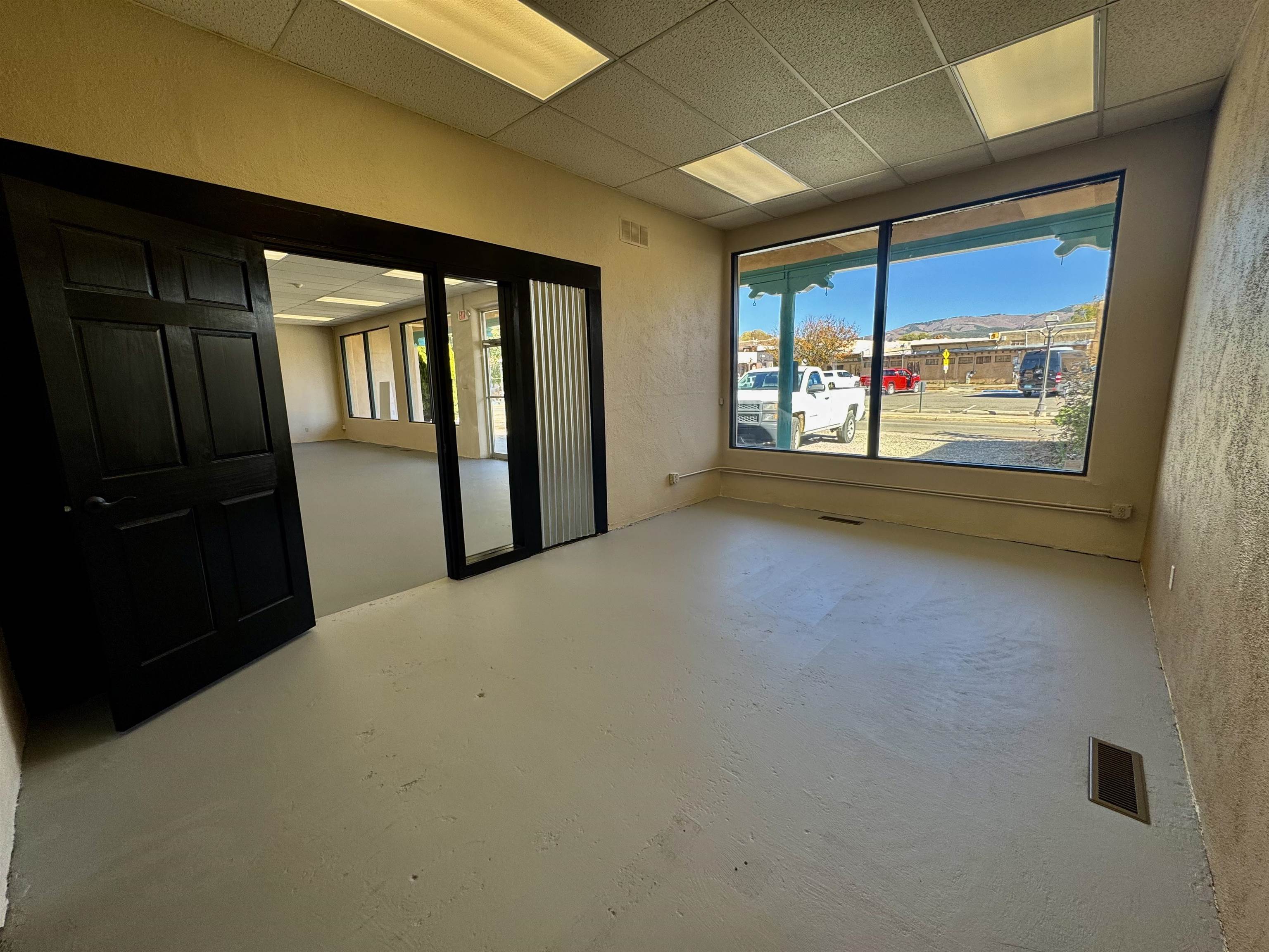 An extremely rare and versatile commercial or residential development opportunity awaits you in an unparalleled location—just 100 yards from the Taos Plaza. This approximately 2,100 square foot blank canvas is ready for your vision. Situated in a high-traffic corridor within the historic and commercial districts of Taos, this property is not only steps from the Plaza, but it also boasts 10 designated parking spots, which is a valuable asset given that there are new parking meters in the area. The eye-catching southwestern-style frontage invites business through its doors, enhanced by a beautiful front covered portal patio ideal for café seating, benches, gardens, and more. Nearly floor-to-ceiling windows flood the space with natural light and offer spectacular views of Taos Mountain and the Sangre de Cristo mountain range. Inside, the property features two large open spaces with high ceilings, adaptable to a wide range of business needs. A smaller 208 square foot room, currently used as a conference room, has large windows and an adjacent half bath. Toward the back, a 163 square foot room includes a kitchenette and opens into a second half bath. The property is equipped with forced heat and central air conditioning, ensuring comfort year-round. This commercial space has a robust rental history spanning over a decade, having previously housed a bike shop, childcare center, and real estate brokerage among other businesses. Currently tenant-occupied, it offers the potential for passive income. Whether you're envisioning a café, restaurant, yoga studio, bookstore, quirky shop, live/work option, or office, this property provides a versatile canvas to bring your ideas to life. Opportunities to own prime commercial or residential real estate in Taos are rare. Contact us today to view this exceptional property and let your dreams take shape.