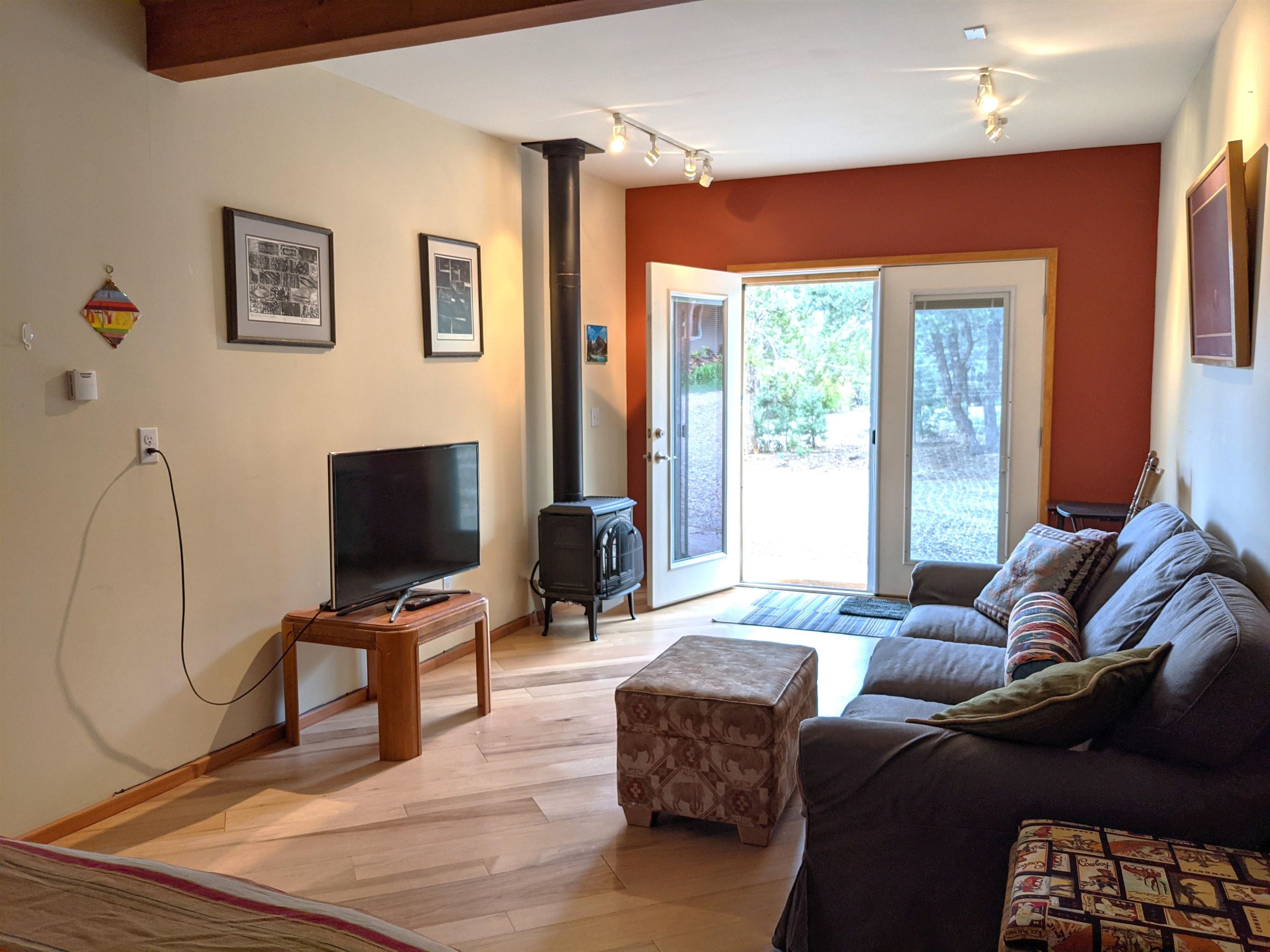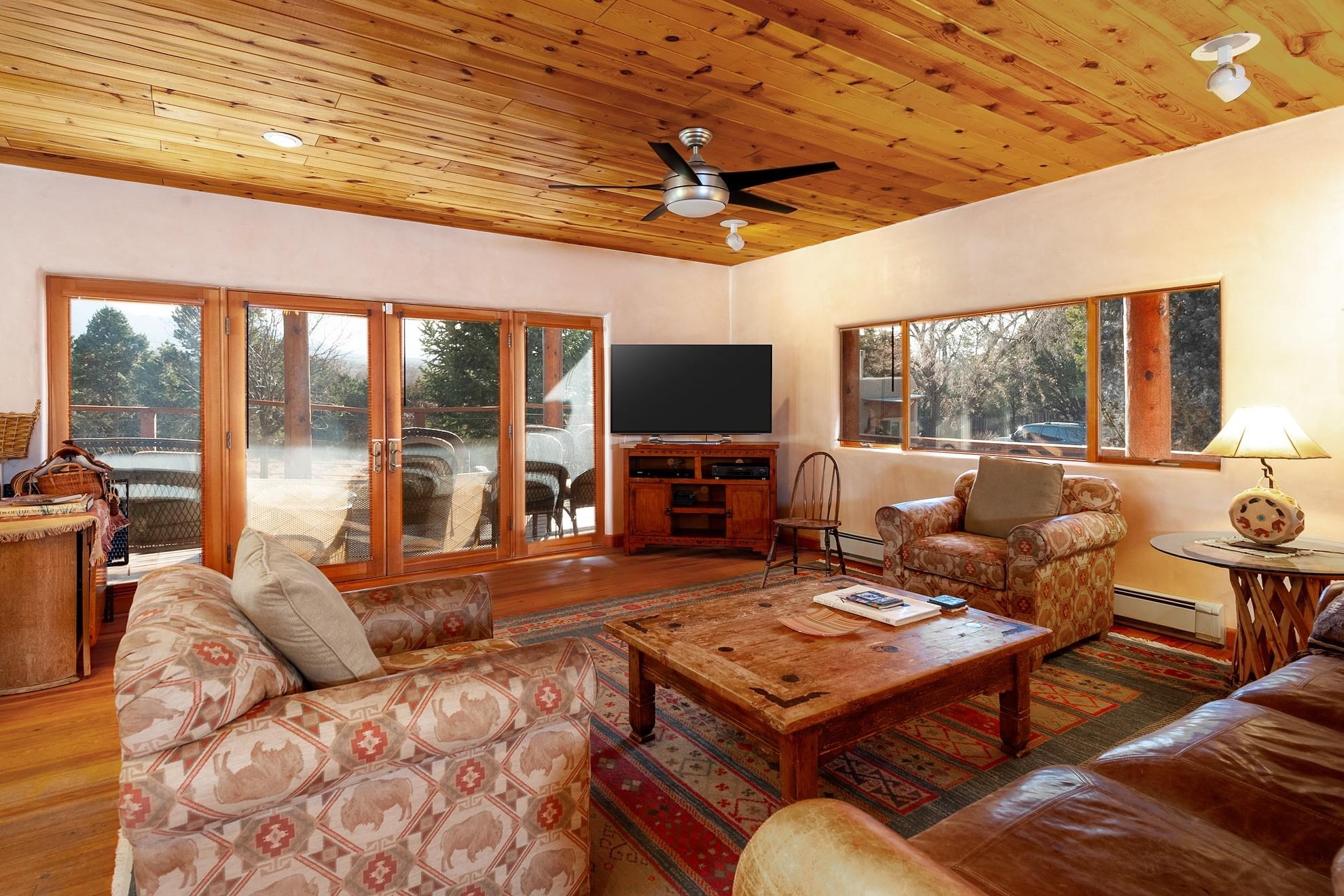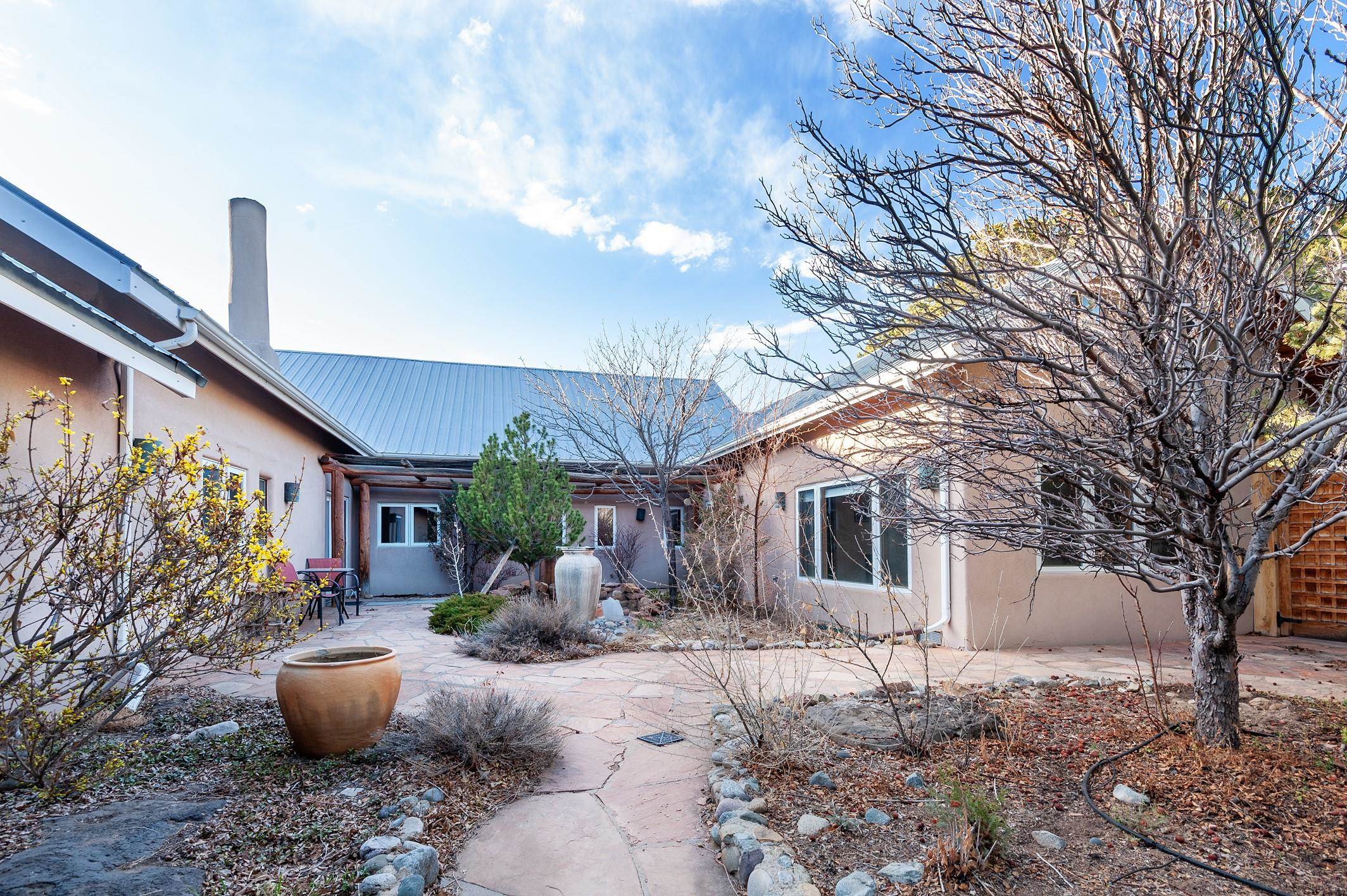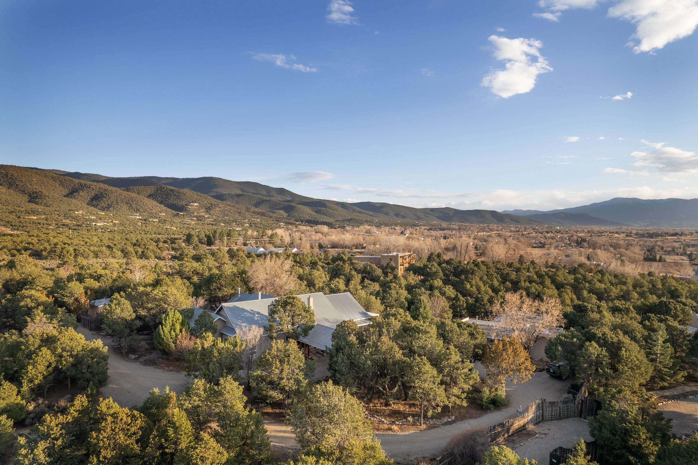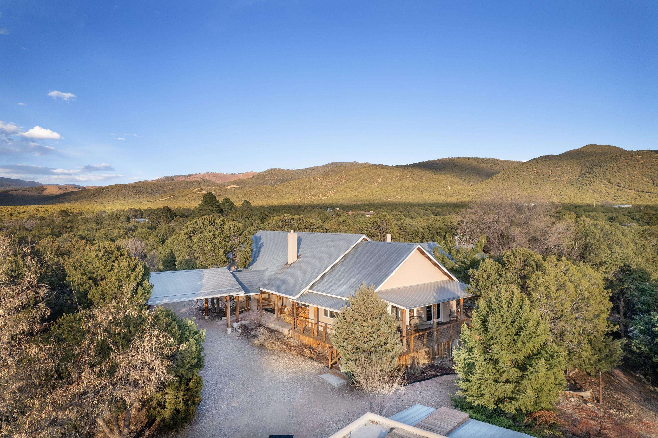 Perched atop a scenic hill, this captivating 3-bedroom, 3-bath residence sits on 3.7 acres of stunning landscape, complemented by a charming one-bedroom guesthouse, a versatile studio, and a spacious garage. The home showcases an open-concept design that floods the interiors with natural light, creating a seamless connection between indoor comfort and outdoor beauty—ideal for entertaining or relaxing in tranquility. The gourmet kitchen is a true chef’s dream, featuring generous counter space, modern appliances, and abundant storage to inspire culinary creativity. Overlooking the inviting living room with its cozy fireplace, the space is perfect for gatherings and quiet evenings alike. Elegant touches such as traditional vigas, tongue-and-groove ceilings, and coved ceilings add depth and character, while smooth plaster finishes lend a sleek, contemporary aesthetic. Wood and tile floors flow throughout, complemented by three authentic kiva fireplaces that evoke classic Southwestern charm. Track, recessed, and skylight lighting create a warm, inviting atmosphere throughout. Designed with accessibility in mind, this home thoughtfully incorporates features that ensure comfort for all. At its heart, a beautifully landscaped courtyard with a charming fountain adds an element of serenity and elegance to your daily living. Sustainable living is made easy with a solar panel system that reduces energy costs and supports eco-friendly practices. The detached guesthouse offers a private retreat for visitors or potential rental income, while the dedicated studio provides an inspiring space for artists, writers, or anyone seeking creative inspiration. Step outside onto expansive decks and patios—perfect for relaxing, entertaining, or enjoying panoramic views of the surrounding landscape. Horse lovers will appreciate the spacious run-in shed, offering shelter and comfort for your animals year-round. With direct access to national forest trails, outdoor adventures are right outside your door. While feeling worlds away from the hustle and bustle, this property is conveniently close to local amenities, dining, and recreational opportunities. Whether sipping coffee at sunrise or hosting memorable gatherings under a blanket of stars, this extraordinary retreat offers a lifestyle of unparalleled beauty and serenity. Don’t miss your chance to own this remarkable piece of nature-filled paradise! ---
