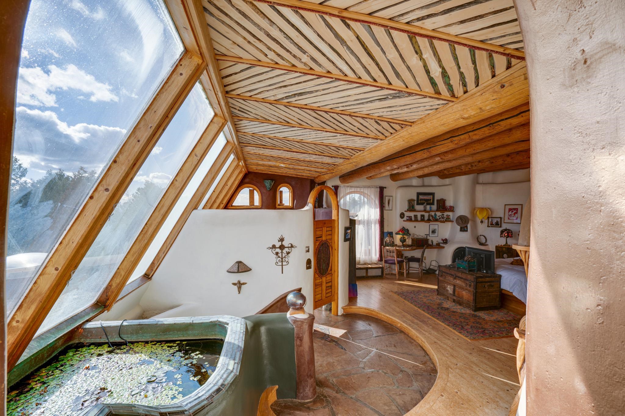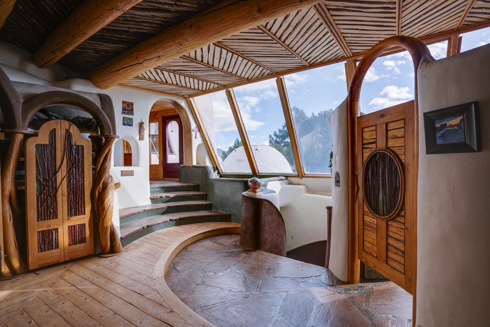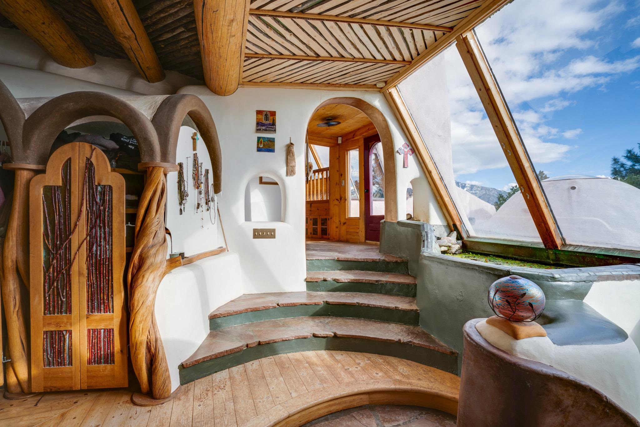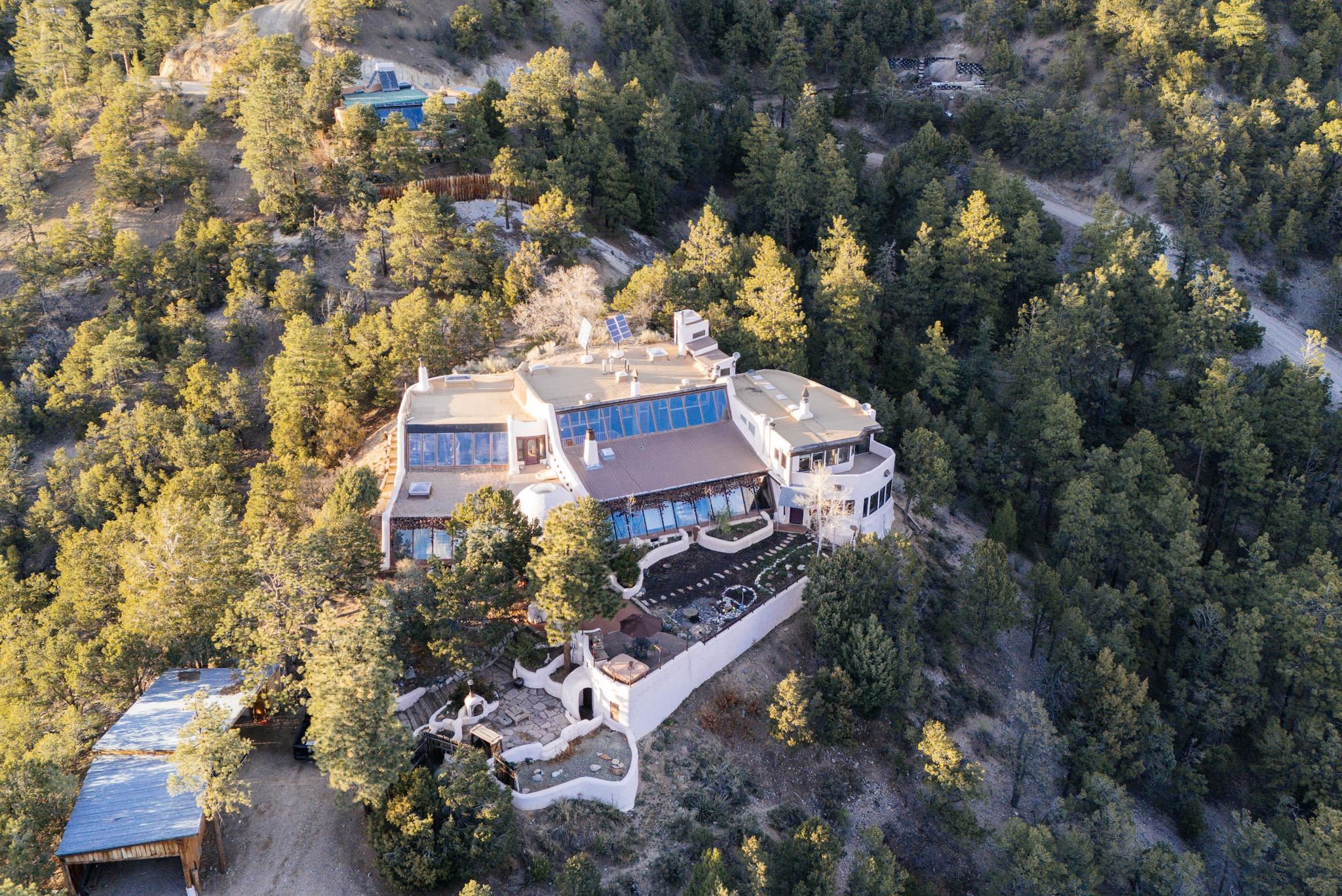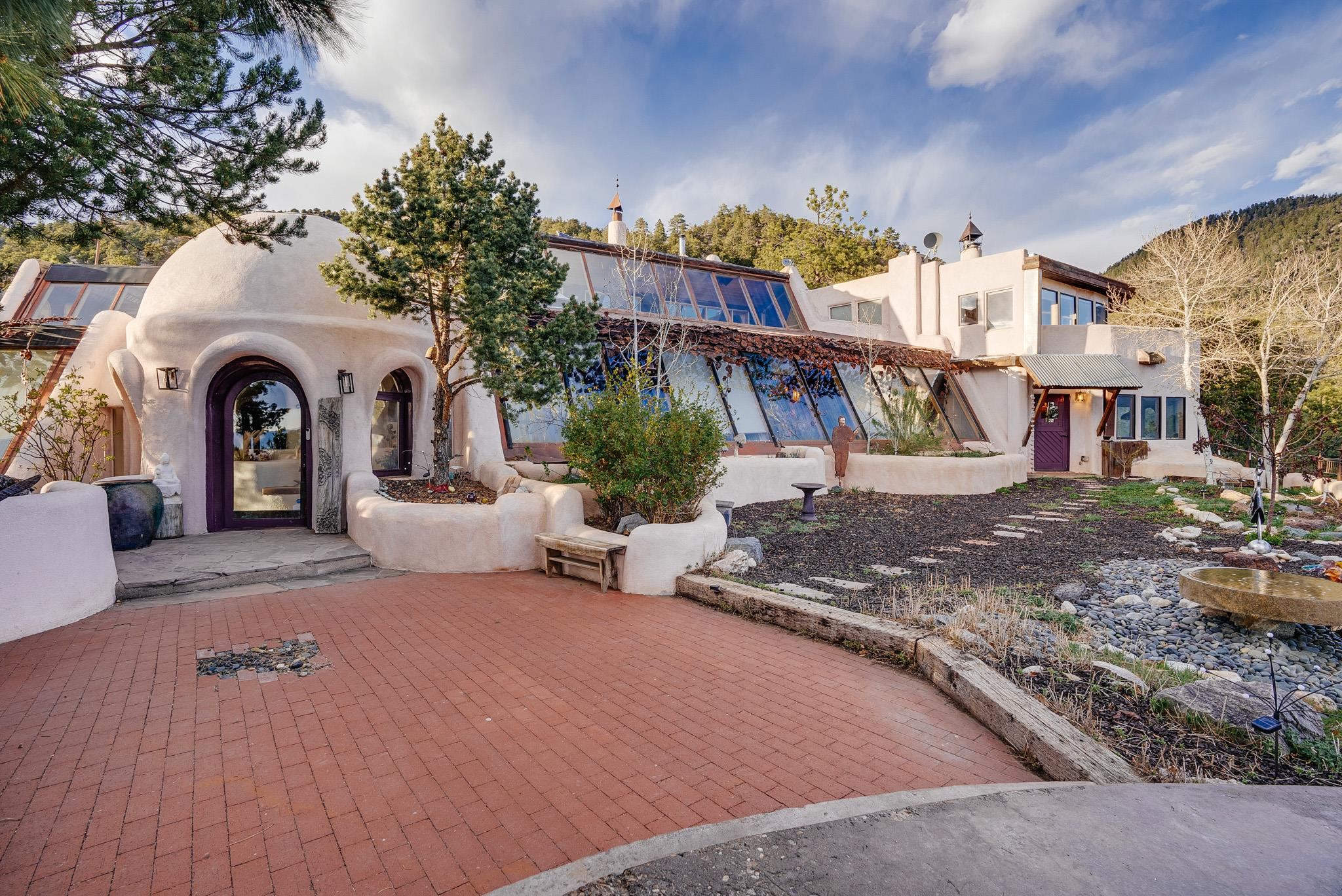 This impressive, pounded-earth home in the Valdez mountains offers 360-degree mountain views that overlook Taos County and Taos Pueblo. Soak inside your hot tub and overlook the entire valley of Taos. Inside this perfectly curated masterpiece of adobe, pounded earth, and frame construction is the perfect blend of sustainability. Every detail was curated to blend sustainability, comfort, and tranquility. Emerge yourself into the wild and surround yourself with the fresh scents of aspens, juniper, and piñon trees. Imagine relaxing on your front patio with breathtaking views of the Sangre de Cristo Mountains. This home is not just a place to live; it is a luxurious mountain escape for the artist seeking the uniqueness of a home with a story. Built by well-known builders Michael Reynolds and Peter Kolshorn, the home sits on 6.87 acres of forest land. Every part of this home is a piece of art. From the hand-carved wooden doors made on-site to the detailed metalwork and stained-glass window inserts, every detail has its own story. The metalwork includes the patio gates, metal trim on the stucco wall, whimsical chimney caps, all five fireplace screens, hand-hammered leaves above the windows, and a unique dragonfly chandelier in the living room. All these beautiful pieces were designed for this property and crafted by artist Christine Sporrong, who is known for her ability to create stunning metal art. She is well known for her work at Meow Wolf in Santa Fe, New Mexico. All the copper work in the home was hand-made by Marion Moore, a local artist who has received the Rising Star Award. Marion is known for her beautiful sconces. Each corner of this home shares a story or displays art from talented artists. Discover your peaceful oasis in this passively heated adobe home, featuring four spacious bedrooms and four well-designed bathrooms. Two vehicle carport and acreage to explore. If you're interested in generating income, the attached/lock-off studio has a full kitchen, bathroom, and private entrance. Want to go off-grid? Update the solar panels, and this home can support off-grid living. Three large 3,000-gallon water cisterns collect water for the hydroponics system and gray water system in the home. There is a 1,200 feet deep well and a well share agreement if you decide to connect to additional resources. You can grow fresh herbs or flowers with your very own hydroponic watering system. Enjoy the soothing sounds from the foyer fountain or relax by the lily pond and take in the flowers' beauty. Stay warm in winter with passive solar heating and five inviting fireplaces inside. You can also enjoy the outdoors with a patio fireplace and bar on the lower-level deck. The possibilities to entertain are endless. Host stargazing parties on the roof and make homemade pizza in your custom wood-burning pizza oven from Italy. This home has plenty of space for everyone. With two large living areas, it offers lots of room for family activities. An extra loft area can serve as a quiet study or guest sleeping space. The private office with beautiful views is the perfect spot for enjoying your morning coffee or tea on the adjoining deck. Need a separate workshop or workspace? One spacious room serves as an artist’s dream studio, filled with natural light. With endless possibilities, ask about scheduling your tour today.