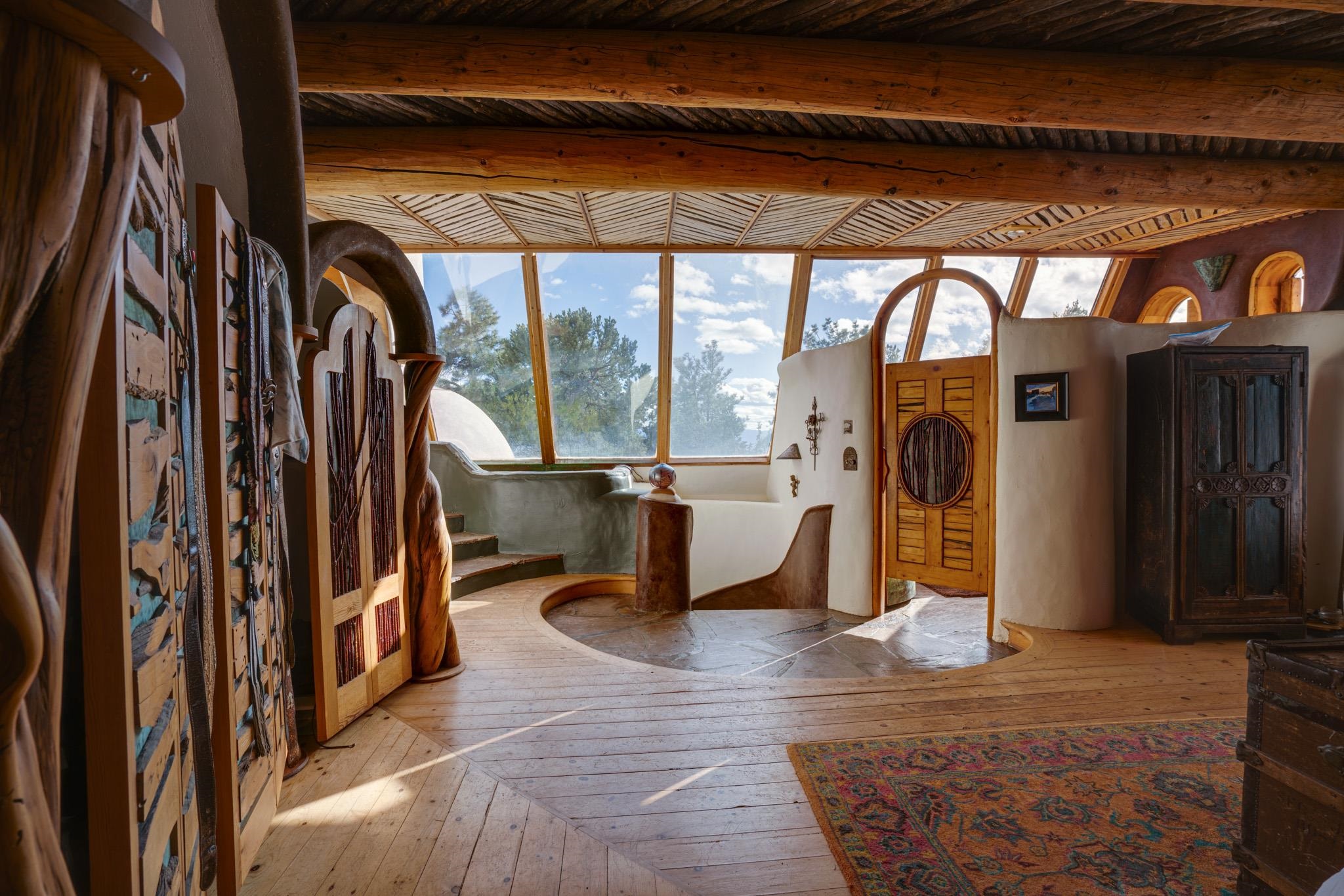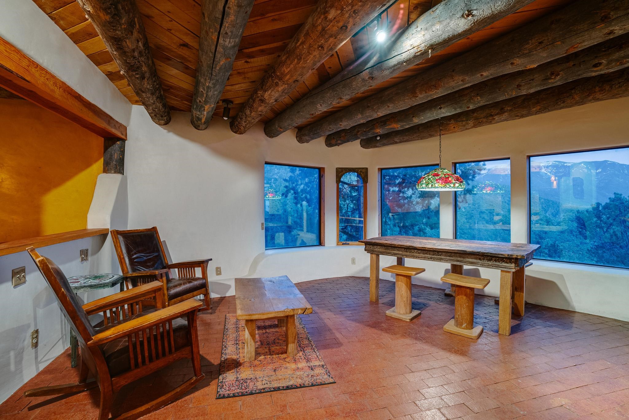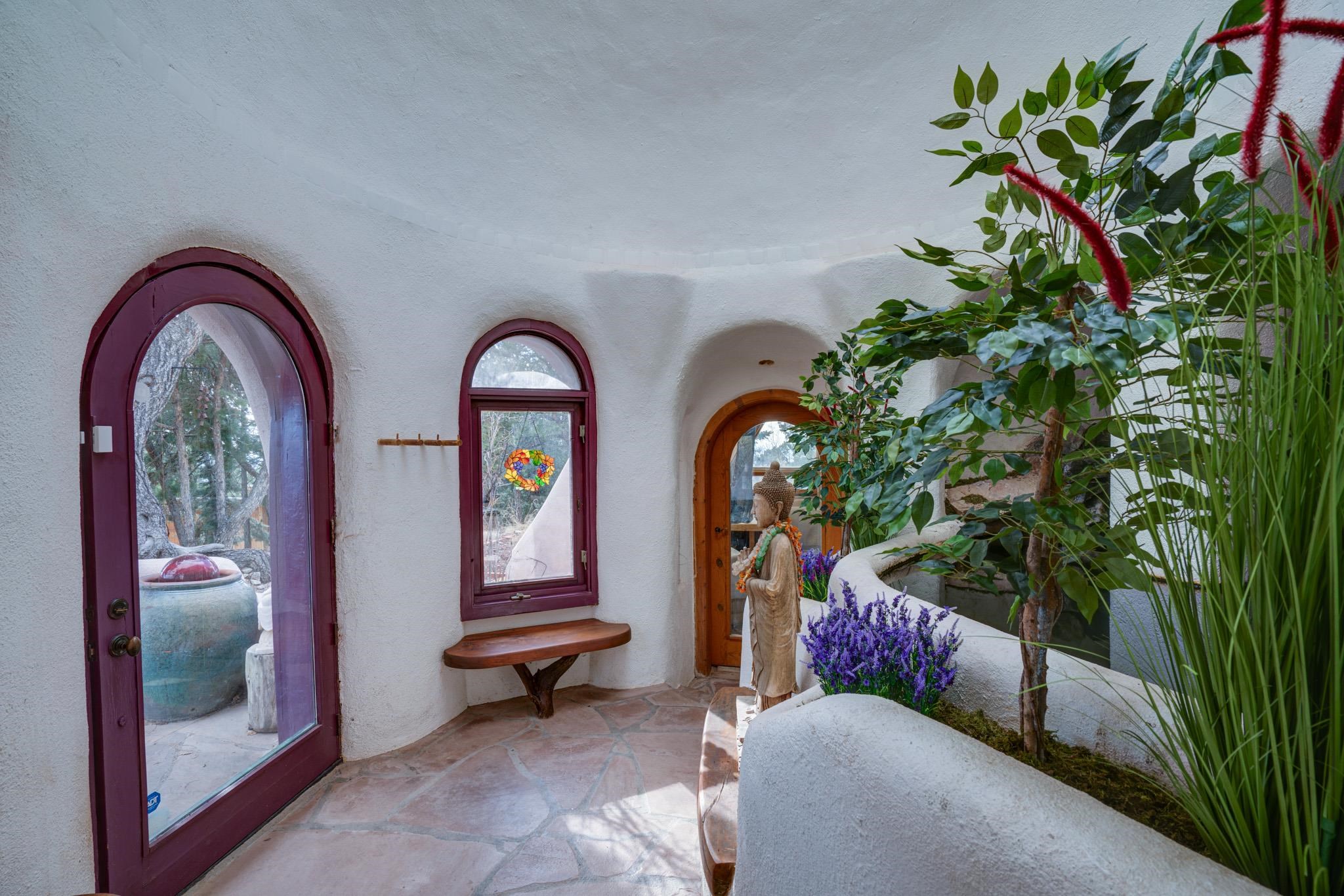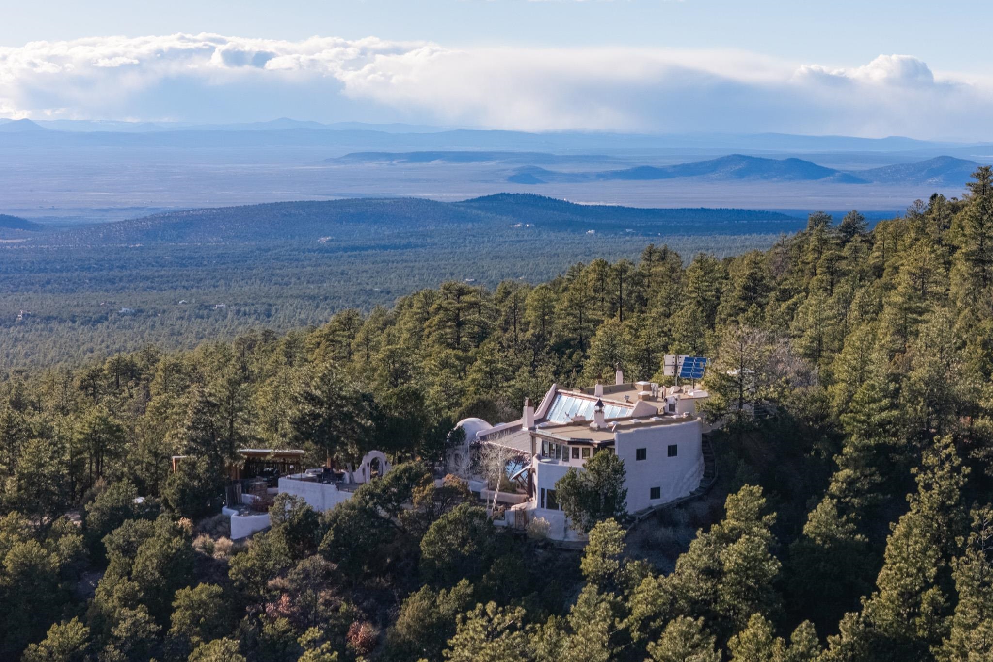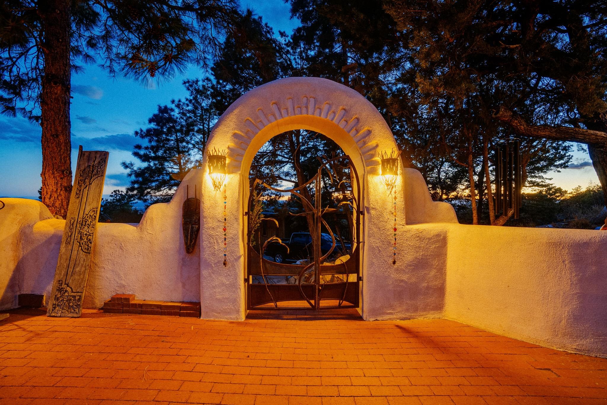 This impressive, pounded-earth home in the Valdez mountains offers 360-degree mountain views that overlook Taos County and Taos Pueblo. Soak inside your hot tub and overlook the entire valley of Taos. Inside this perfectly curated masterpiece of adobe, pounded earth, and frame construction is the perfect blend of sustainability. Every detail was curated to blend sustainability, comfort, and tranquility. Emerge yourself into the wild and surround yourself with the fresh scents of aspens, juniper, and piñon trees. Imagine relaxing on your front patio with breathtaking views of the Sangre de Cristo Mountains. This home is not just a place to live; it is a luxurious mountain escape for the artist seeking the uniqueness of a home with a story. Built by well-known builders Michael Reynolds and Peter Kolshorn, the home sits on 6.87 acres of forest land. Every part of this home is a piece of art. From the hand-carved wooden doors made on-site to the detailed metalwork and stained-glass window inserts, every detail has its own story. The metalwork includes the patio gates, metal trim on the stucco wall, whimsical chimney caps, all five fireplace screens, hand-hammered leaves above the windows, and a unique dragonfly chandelier in the living room. All these beautiful pieces were designed for this property and crafted by artist Christine Sporrong, who is known for her ability to create stunning metal art. She is well known for her work at Meow Wolf in Santa Fe, New Mexico. All the copper work in the home was hand-made by Marion Moore, a local artist who has received the Rising Star Award. Marion is known for her beautiful sconces. Each corner of this home shares a story or displays art from talented artists. Discover your peaceful oasis in this passively heated adobe home, featuring four spacious bedrooms and four well-designed bathrooms. Two vehicle carport and acreage to explore. If you're interested in generating income, the attached/lock-off studio has a full kitchen, bathroom, and private entrance. Want to go off-grid? Update the solar panels, and this home can support off-grid living. Three large 3,000-gallon water cisterns collect water for the hydroponics system and gray water system in the home. There is a 1,200 feet deep well and a well share agreement if you decide to connect to additional resources. You can grow fresh herbs or flowers with your very own hydroponic watering system. Enjoy the soothing sounds from the foyer fountain or relax by the lily pond and take in the flowers' beauty. Stay warm in winter with passive solar heating and five inviting fireplaces inside. You can also enjoy the outdoors with a patio fireplace and bar on the lower-level deck. The possibilities to entertain are endless. Host stargazing parties on the roof and make homemade pizza in your custom wood-burning pizza oven from Italy. This home has plenty of space for everyone. With two large living areas, it offers lots of room for family activities. An extra loft area can serve as a quiet study or guest sleeping space. The private office with beautiful views is the perfect spot for enjoying your morning coffee or tea on the adjoining deck. Need a separate workshop or workspace? One spacious room serves as an artist’s dream studio, filled with natural light. With endless possibilities, ask about scheduling your tour today.