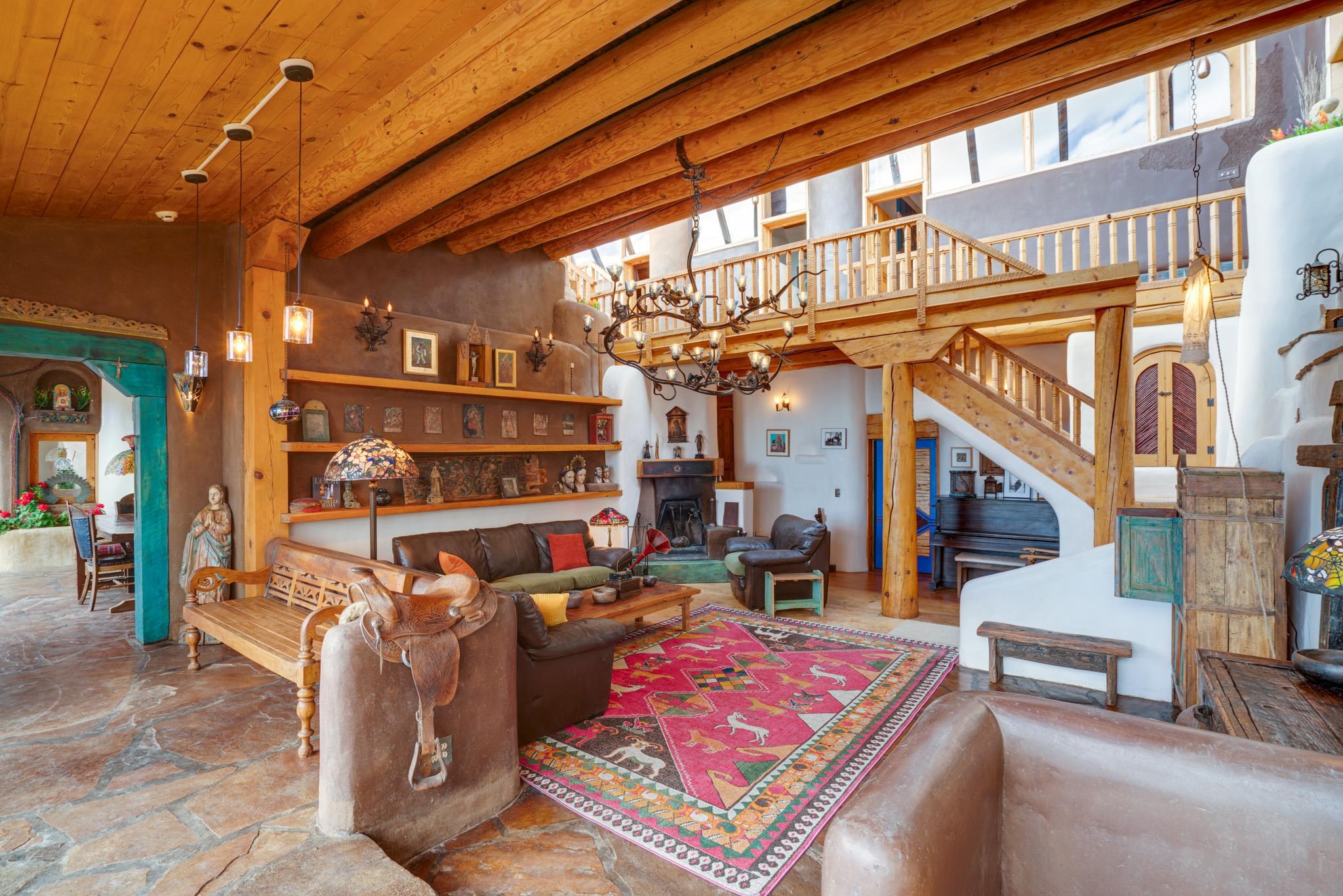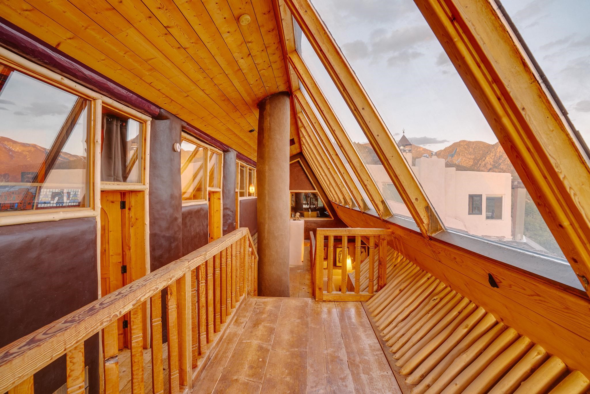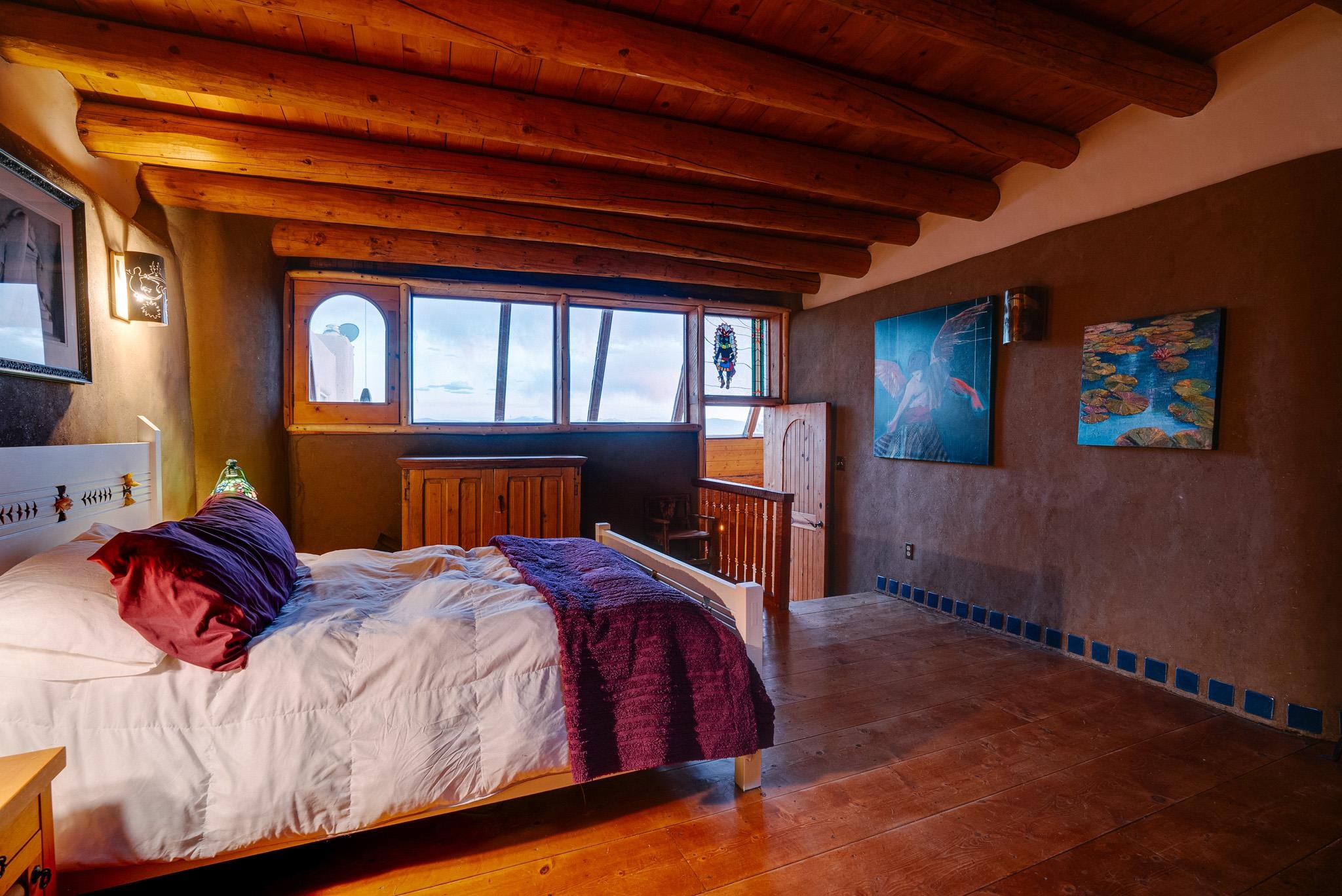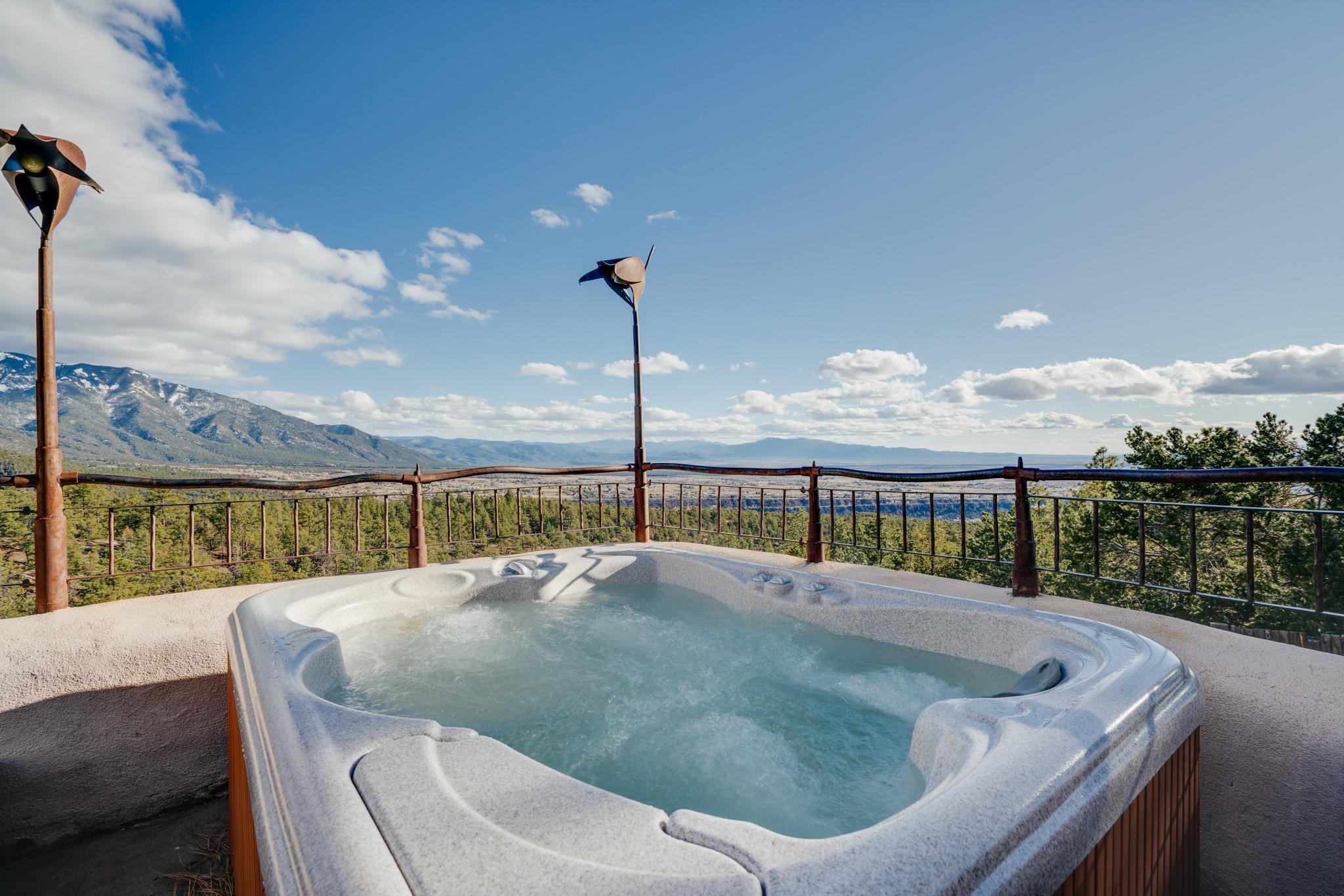 This impressive, pounded-earth home in the Valdez mountains offers 360-degree mountain views that overlook Taos County and Taos Pueblo. Soak inside your hot tub and overlook the entire valley of Taos. Inside this perfectly curated masterpiece of adobe, pounded earth, and frame construction is the perfect blend of sustainability. Every detail was curated to blend sustainability, comfort, and tranquility. Emerge yourself into the wild and surround yourself with the fresh scents of aspens, juniper, and piñon trees. Imagine relaxing on your front patio with breathtaking views of the Sangre de Cristo Mountains. This home is not just a place to live; it is a luxurious mountain escape for the artist seeking the uniqueness of a home with a story. Built by well-known builders Michael Reynolds and Peter Kolshorn, the home sits on 6.87 acres of forest land. Every part of this home is a piece of art. From the hand-carved wooden doors made on-site to the detailed metalwork and stained-glass window inserts, every detail has its own story. The metalwork includes the patio gates, metal trim on the stucco wall, whimsical chimney caps, all five fireplace screens, hand-hammered leaves above the windows, and a unique dragonfly chandelier in the living room. All these beautiful pieces were designed for this property and crafted by artist Christine Sporrong, who is known for her ability to create stunning metal art. She is well known for her work at Meow Wolf in Santa Fe, New Mexico. All the copper work in the home was hand-made by Marion Moore, a local artist who has received the Rising Star Award. Marion is known for her beautiful sconces. Each corner of this home shares a story or displays art from talented artists. Discover your peaceful oasis in this passively heated adobe home, featuring four spacious bedrooms and four well-designed bathrooms. Two vehicle carport and acreage to explore. If you're interested in generating income, the attached/lock-off studio has a full kitchen, bathroom, and private entrance. Want to go off-grid? Update the solar panels, and this home can support off-grid living. Three large 3,000-gallon water cisterns collect water for the hydroponics system and gray water system in the home. There is a 1,200 feet deep well and a well share agreement if you decide to connect to additional resources. You can grow fresh herbs or flowers with your very own hydroponic watering system. Enjoy the soothing sounds from the foyer fountain or relax by the lily pond and take in the flowers' beauty. Stay warm in winter with passive solar heating and five inviting fireplaces inside. You can also enjoy the outdoors with a patio fireplace and bar on the lower-level deck. The possibilities to entertain are endless. Host stargazing parties on the roof and make homemade pizza in your custom wood-burning pizza oven from Italy. This home has plenty of space for everyone. With two large living areas, it offers lots of room for family activities. An extra loft area can serve as a quiet study or guest sleeping space. The private office with beautiful views is the perfect spot for enjoying your morning coffee or tea on the adjoining deck. Need a separate workshop or workspace? One spacious room serves as an artist’s dream studio, filled with natural light. With endless possibilities, ask about scheduling your tour today.