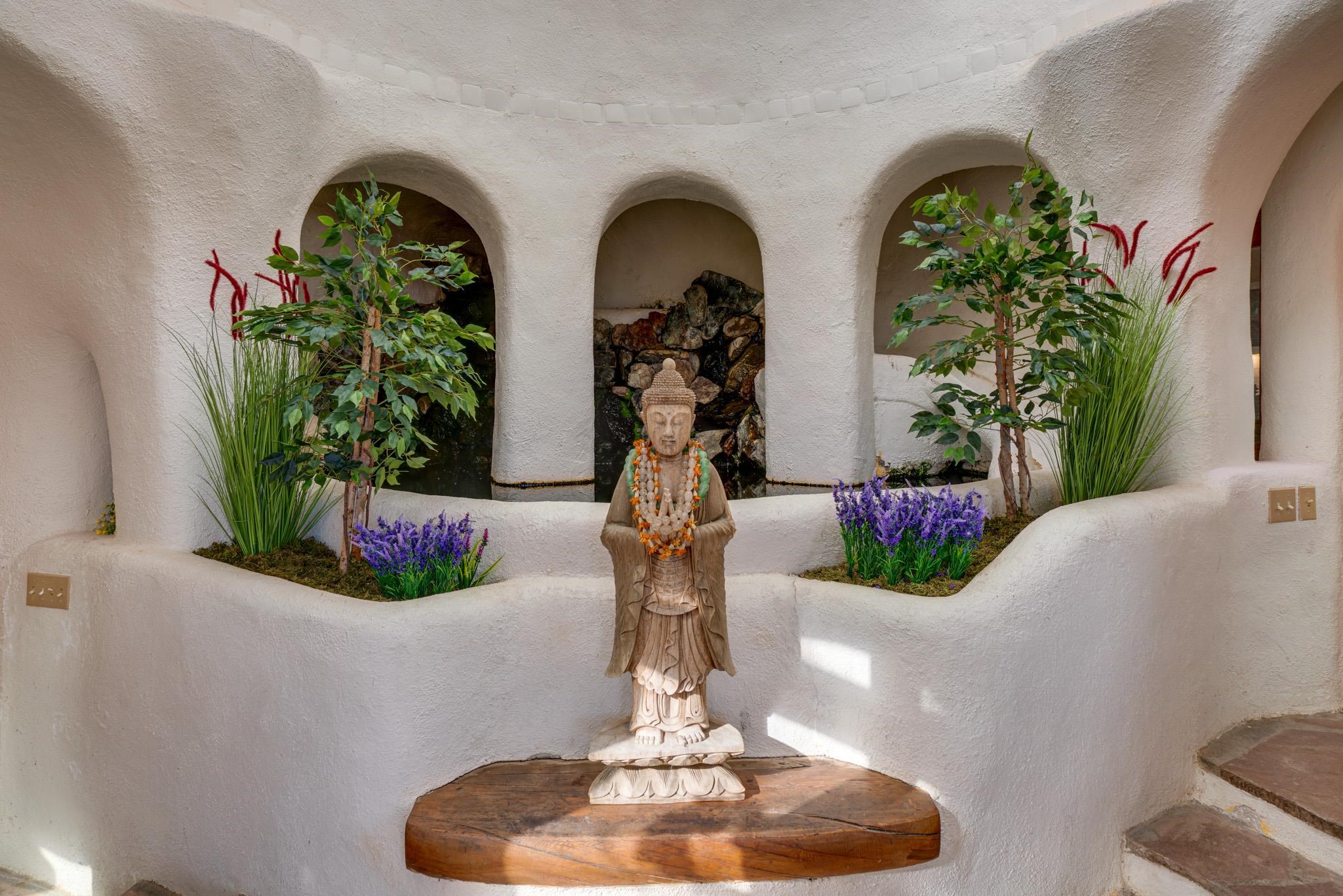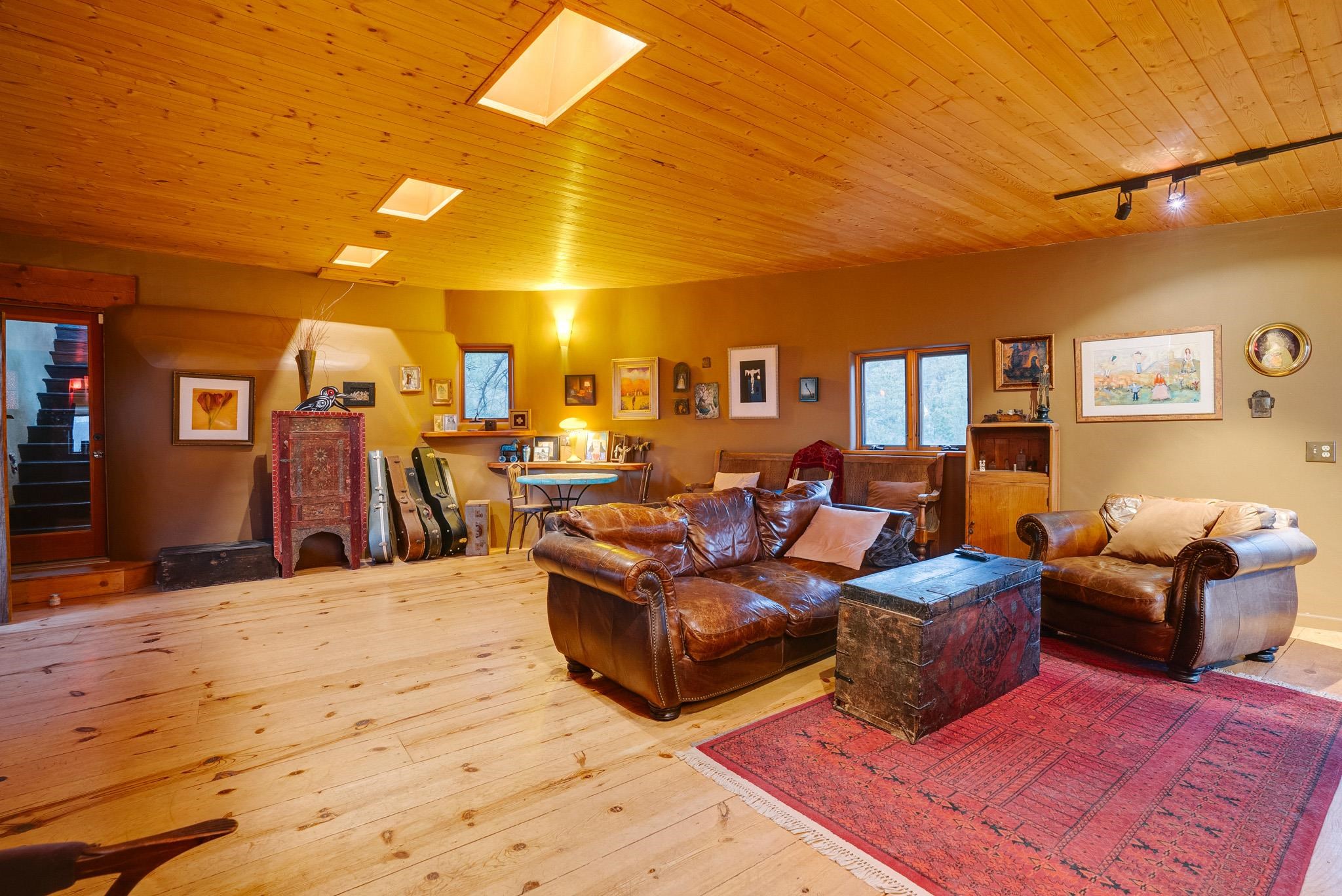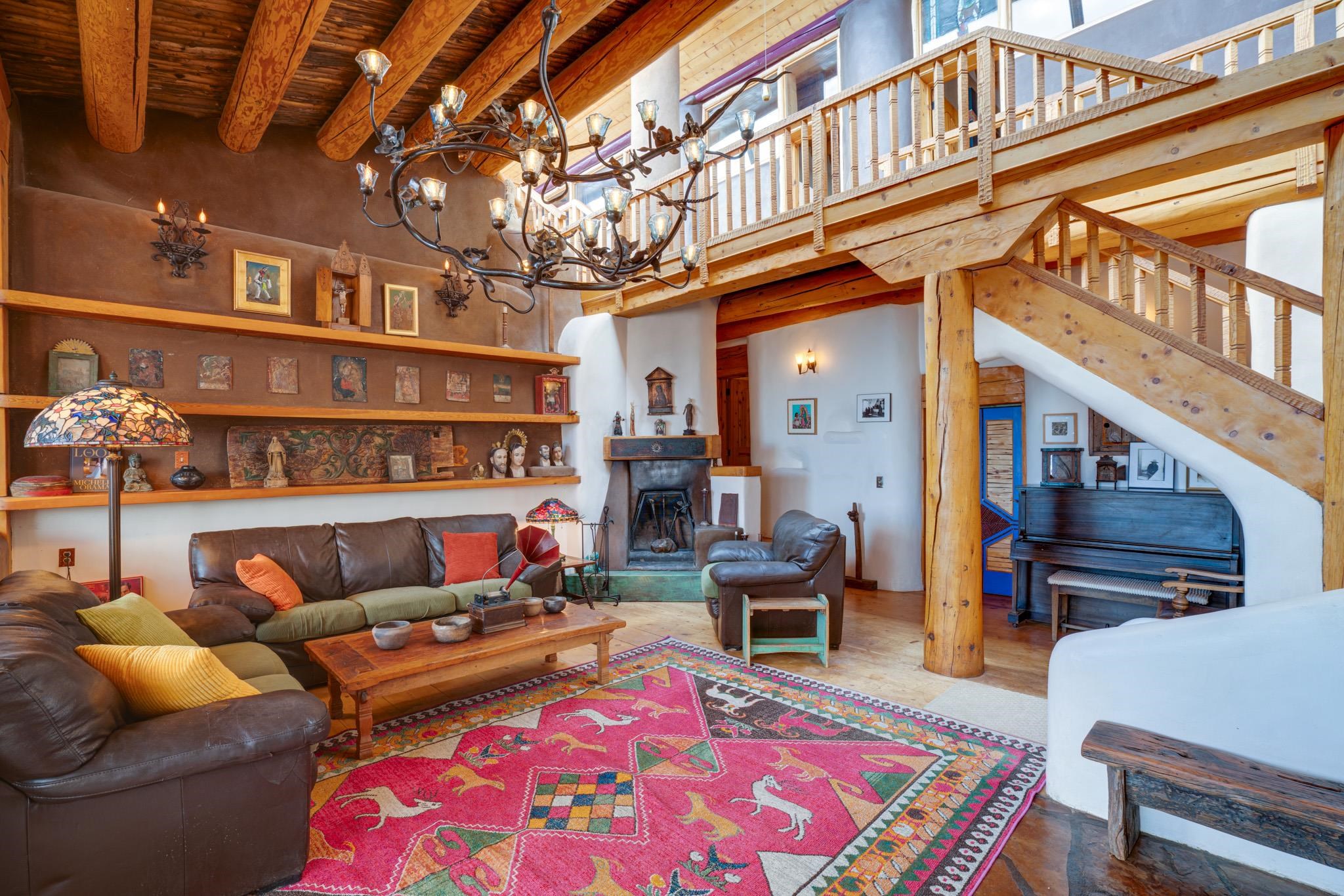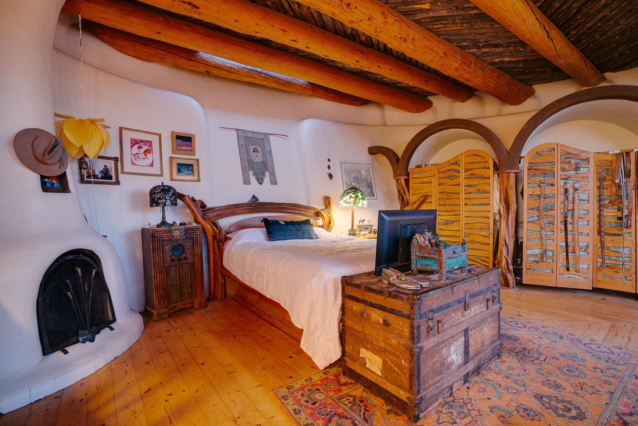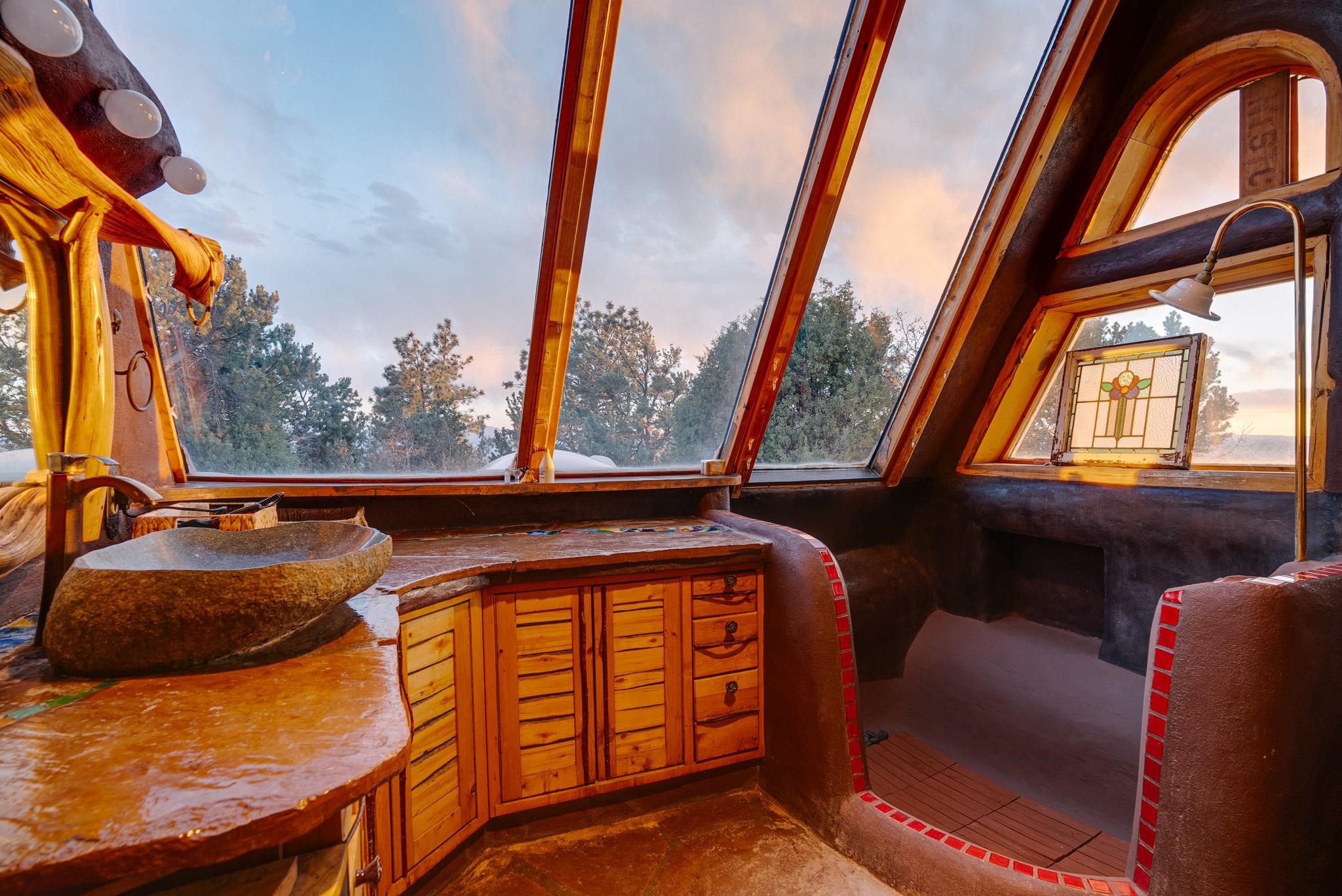 This impressive, pounded-earth home in the Valdez mountains offers 360-degree mountain views that overlook Taos County and Taos Pueblo. Soak inside your hot tub and overlook the entire valley of Taos. Inside this perfectly curated masterpiece of adobe, pounded earth, and frame construction is the perfect blend of sustainability. Every detail was curated to blend sustainability, comfort, and tranquility. Emerge yourself into the wild and surround yourself with the fresh scents of aspens, juniper, and piñon trees. Imagine relaxing on your front patio with breathtaking views of the Sangre de Cristo Mountains. This home is not just a place to live; it is a luxurious mountain escape for the artist seeking the uniqueness of a home with a story. Built by well-known builders Michael Reynolds and Peter Kolshorn, the home sits on 6.87 acres of forest land. Every part of this home is a piece of art. From the hand-carved wooden doors made on-site to the detailed metalwork and stained-glass window inserts, every detail has its own story. The metalwork includes the patio gates, metal trim on the stucco wall, whimsical chimney caps, all five fireplace screens, hand-hammered leaves above the windows, and a unique dragonfly chandelier in the living room. All these beautiful pieces were designed for this property and crafted by artist Christine Sporrong, who is known for her ability to create stunning metal art. She is well known for her work at Meow Wolf in Santa Fe, New Mexico. All the copper work in the home was hand-made by Marion Moore, a local artist who has received the Rising Star Award. Marion is known for her beautiful sconces. Each corner of this home shares a story or displays art from talented artists. Discover your peaceful oasis in this passively heated adobe home, featuring four spacious bedrooms and four well-designed bathrooms. Two vehicle carport and acreage to explore. If you're interested in generating income, the attached/lock-off studio has a full kitchen, bathroom, and private entrance. Want to go off-grid? Update the solar panels, and this home can support off-grid living. Three large 3,000-gallon water cisterns collect water for the hydroponics system and gray water system in the home. There is a 1,200 feet deep well and a well share agreement if you decide to connect to additional resources. You can grow fresh herbs or flowers with your very own hydroponic watering system. Enjoy the soothing sounds from the foyer fountain or relax by the lily pond and take in the flowers' beauty. Stay warm in winter with passive solar heating and five inviting fireplaces inside. You can also enjoy the outdoors with a patio fireplace and bar on the lower-level deck. The possibilities to entertain are endless. Host stargazing parties on the roof and make homemade pizza in your custom wood-burning pizza oven from Italy. This home has plenty of space for everyone. With two large living areas, it offers lots of room for family activities. An extra loft area can serve as a quiet study or guest sleeping space. The private office with beautiful views is the perfect spot for enjoying your morning coffee or tea on the adjoining deck. Need a separate workshop or workspace? One spacious room serves as an artist’s dream studio, filled with natural light. With endless possibilities, ask about scheduling your tour today.