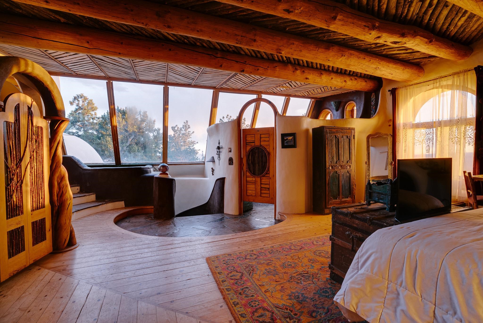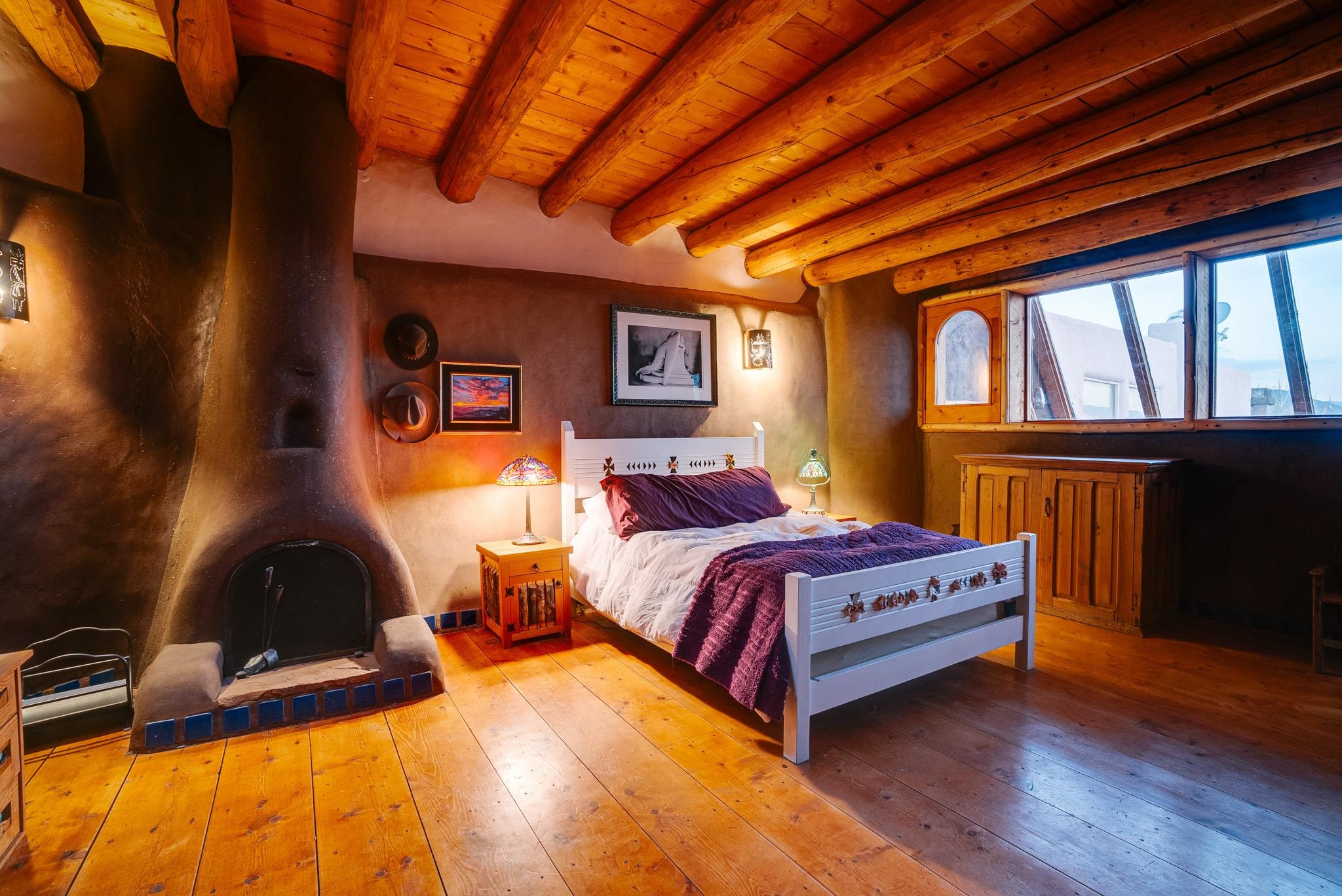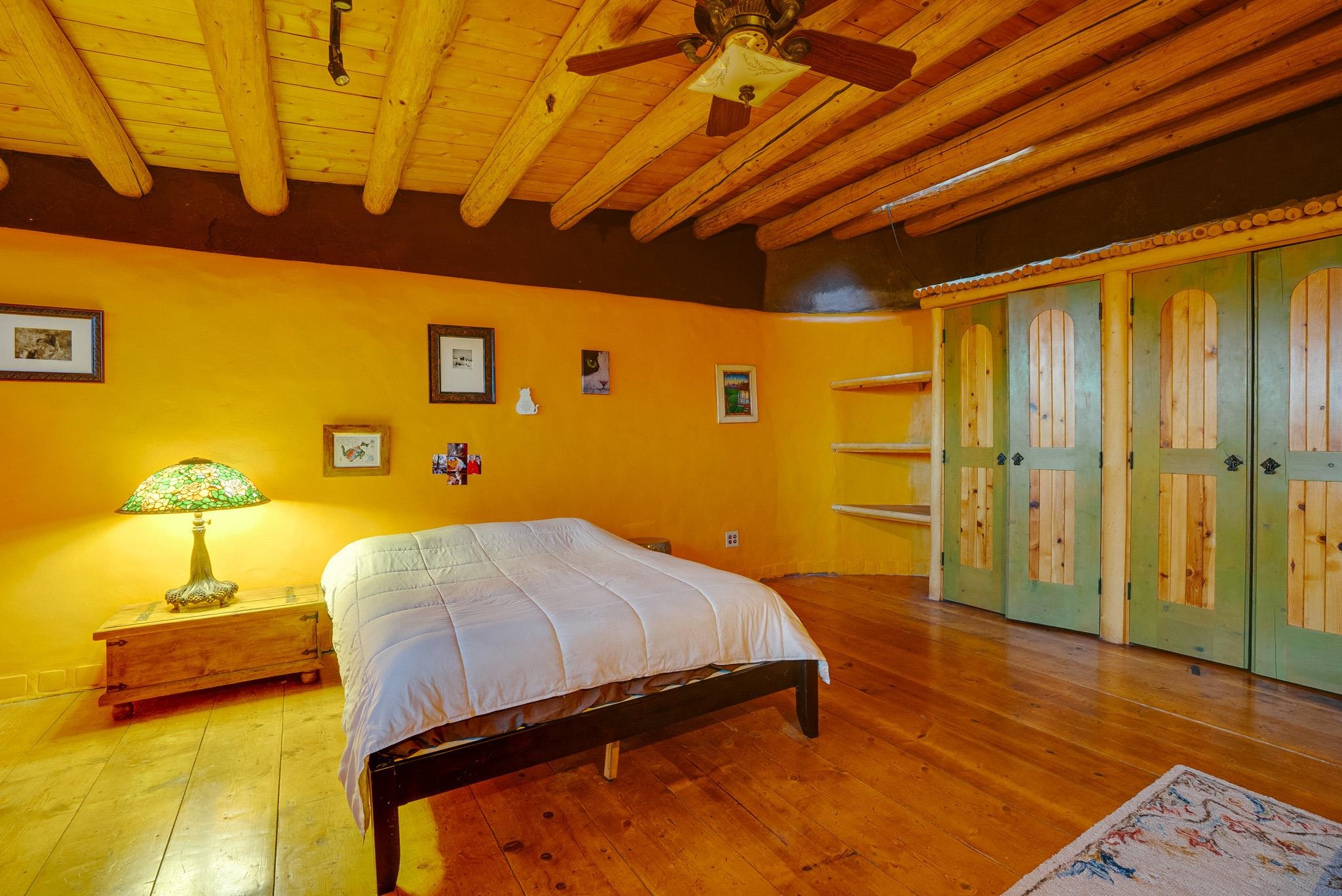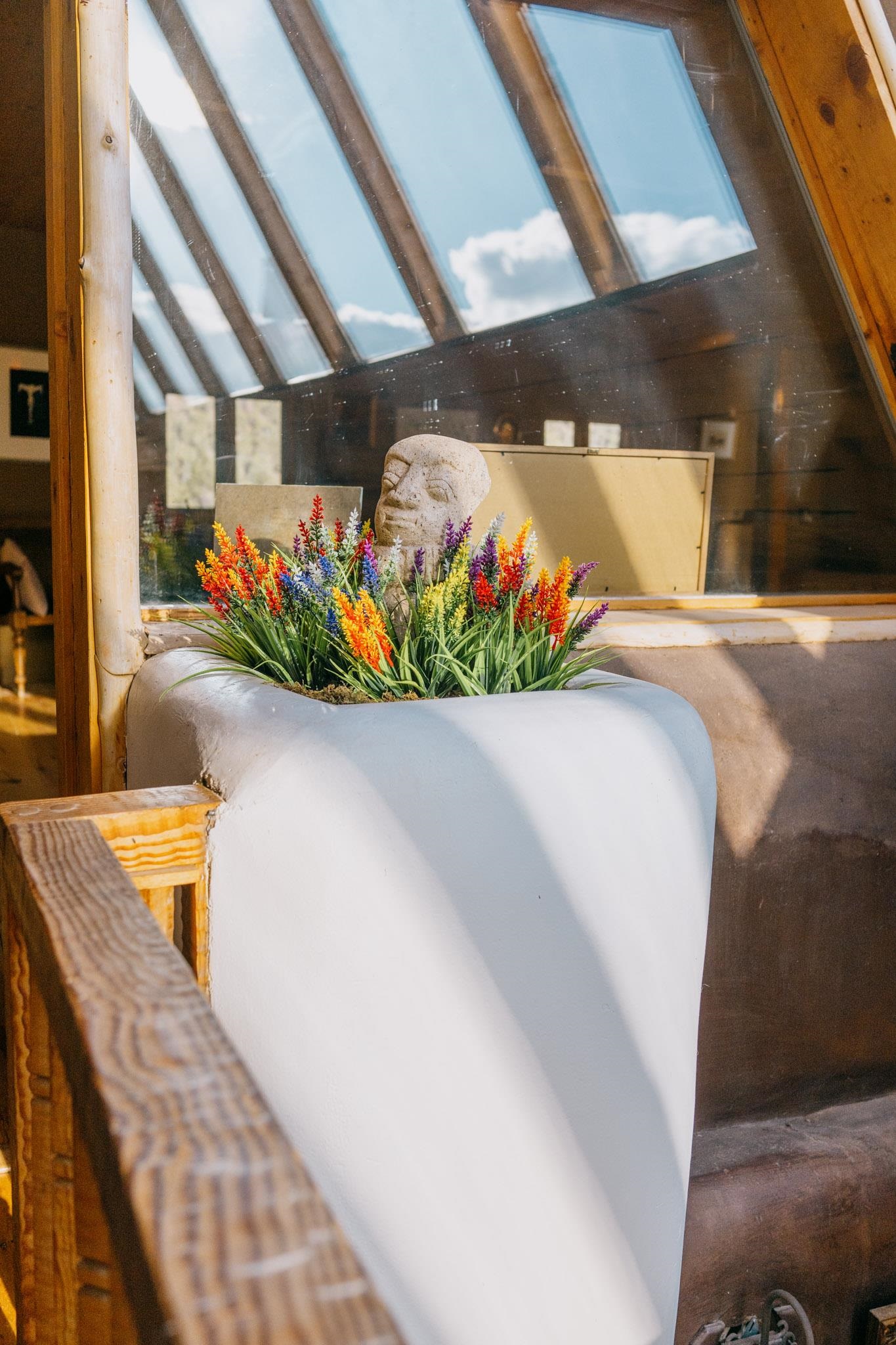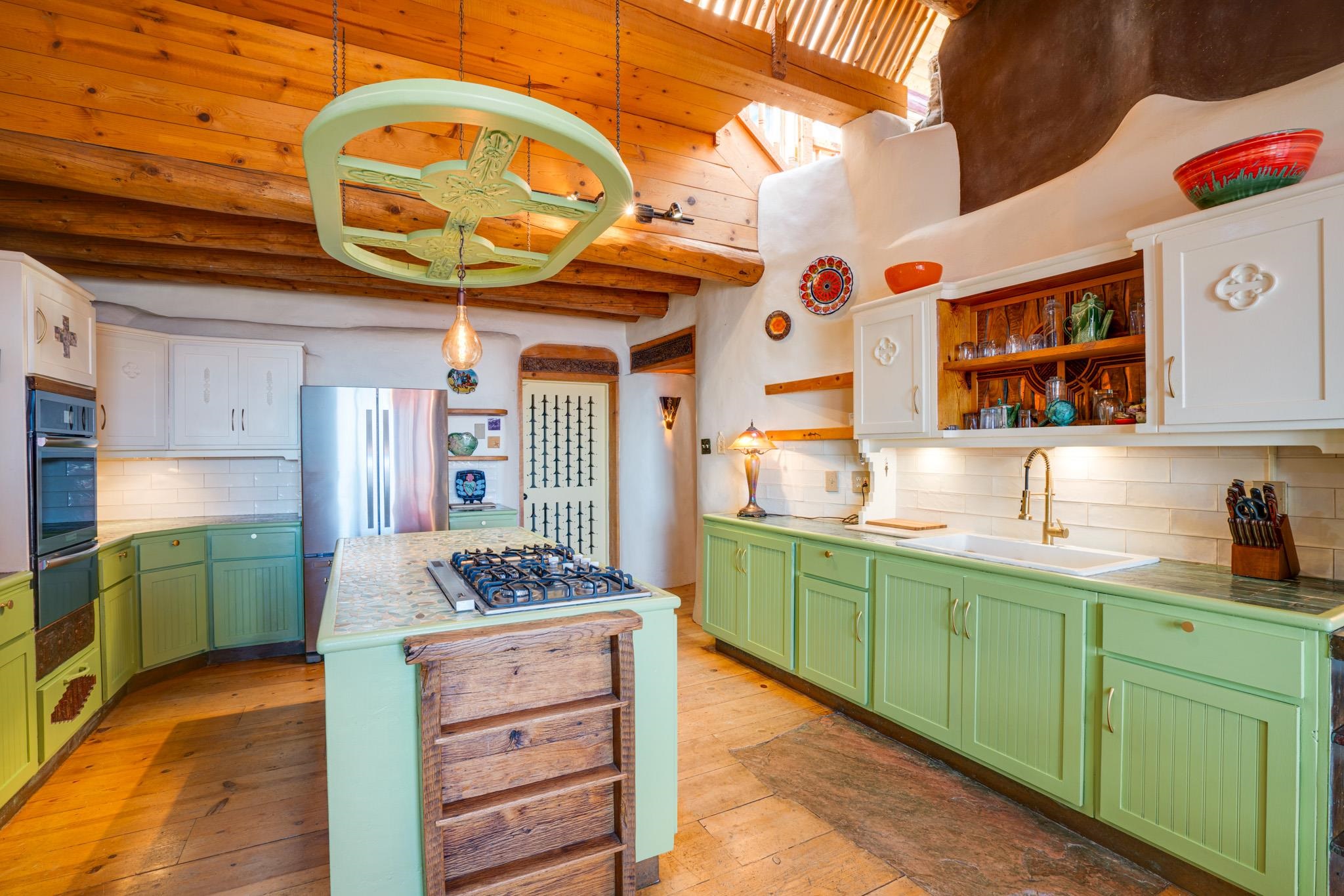 This impressive, pounded-earth home in the Valdez mountains offers 360-degree mountain views that overlook Taos County and Taos Pueblo. Soak inside your hot tub and overlook the entire valley of Taos. Inside this perfectly curated masterpiece of adobe, pounded earth, and frame construction is the perfect blend of sustainability. Every detail was curated to blend sustainability, comfort, and tranquility. Emerge yourself into the wild and surround yourself with the fresh scents of aspens, juniper, and piñon trees. Imagine relaxing on your front patio with breathtaking views of the Sangre de Cristo Mountains. This home is not just a place to live; it is a luxurious mountain escape for the artist seeking the uniqueness of a home with a story. Built by well-known builders Michael Reynolds and Peter Kolshorn, the home sits on 6.87 acres of forest land. Every part of this home is a piece of art. From the hand-carved wooden doors made on-site to the detailed metalwork and stained-glass window inserts, every detail has its own story. The metalwork includes the patio gates, metal trim on the stucco wall, whimsical chimney caps, all five fireplace screens, hand-hammered leaves above the windows, and a unique dragonfly chandelier in the living room. All these beautiful pieces were designed for this property and crafted by artist Christine Sporrong, who is known for her ability to create stunning metal art. She is well known for her work at Meow Wolf in Santa Fe, New Mexico. All the copper work in the home was hand-made by Marion Moore, a local artist who has received the Rising Star Award. Marion is known for her beautiful sconces. Each corner of this home shares a story or displays art from talented artists. Discover your peaceful oasis in this passively heated adobe home, featuring four spacious bedrooms and four well-designed bathrooms. Two vehicle carport and acreage to explore. If you're interested in generating income, the attached/lock-off studio has a full kitchen, bathroom, and private entrance. Want to go off-grid? Update the solar panels, and this home can support off-grid living. Three large 3,000-gallon water cisterns collect water for the hydroponics system and gray water system in the home. There is a 1,200 feet deep well and a well share agreement if you decide to connect to additional resources. You can grow fresh herbs or flowers with your very own hydroponic watering system. Enjoy the soothing sounds from the foyer fountain or relax by the lily pond and take in the flowers' beauty. Stay warm in winter with passive solar heating and five inviting fireplaces inside. You can also enjoy the outdoors with a patio fireplace and bar on the lower-level deck. The possibilities to entertain are endless. Host stargazing parties on the roof and make homemade pizza in your custom wood-burning pizza oven from Italy. This home has plenty of space for everyone. With two large living areas, it offers lots of room for family activities. An extra loft area can serve as a quiet study or guest sleeping space. The private office with beautiful views is the perfect spot for enjoying your morning coffee or tea on the adjoining deck. Need a separate workshop or workspace? One spacious room serves as an artist’s dream studio, filled with natural light. With endless possibilities, ask about scheduling your tour today.