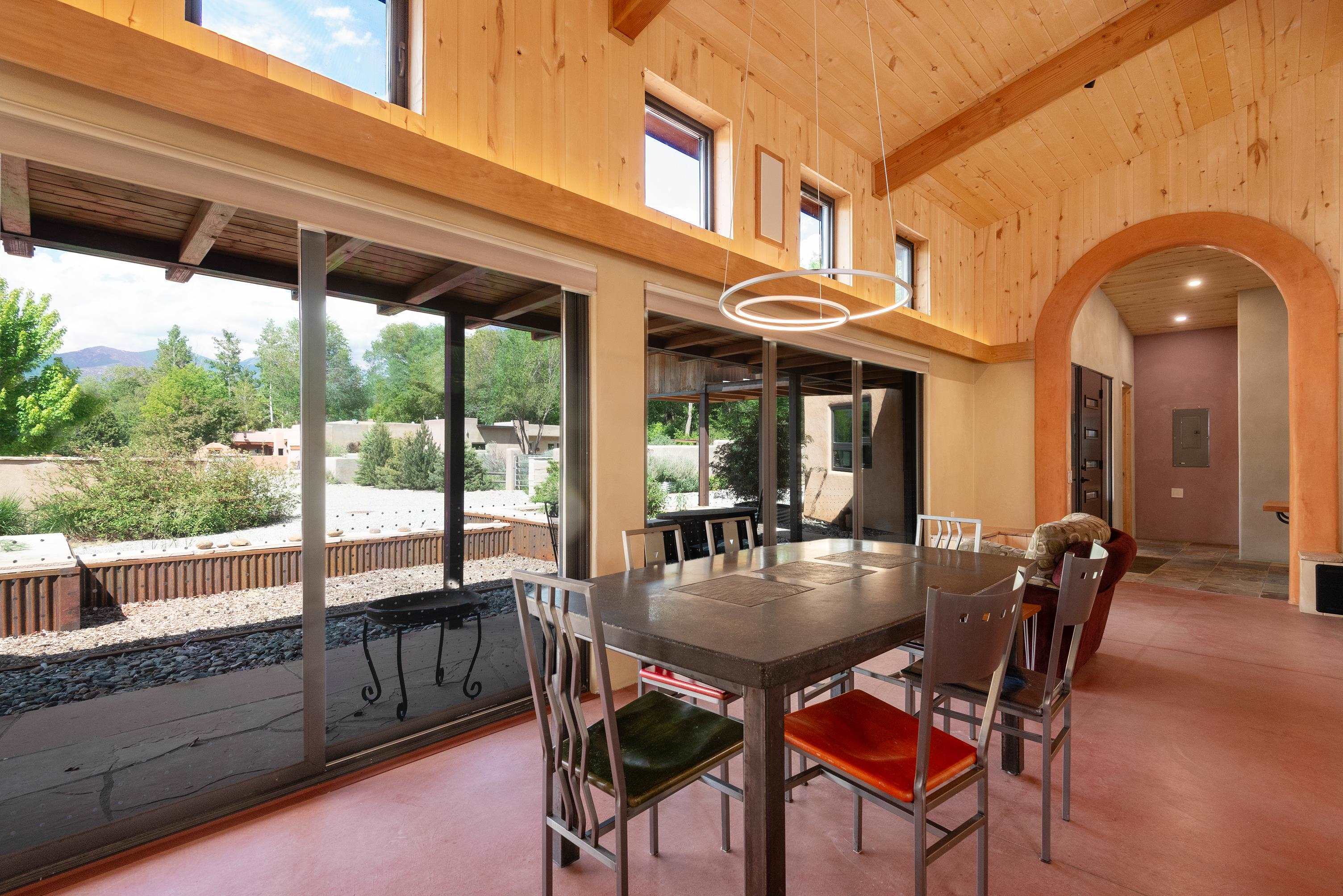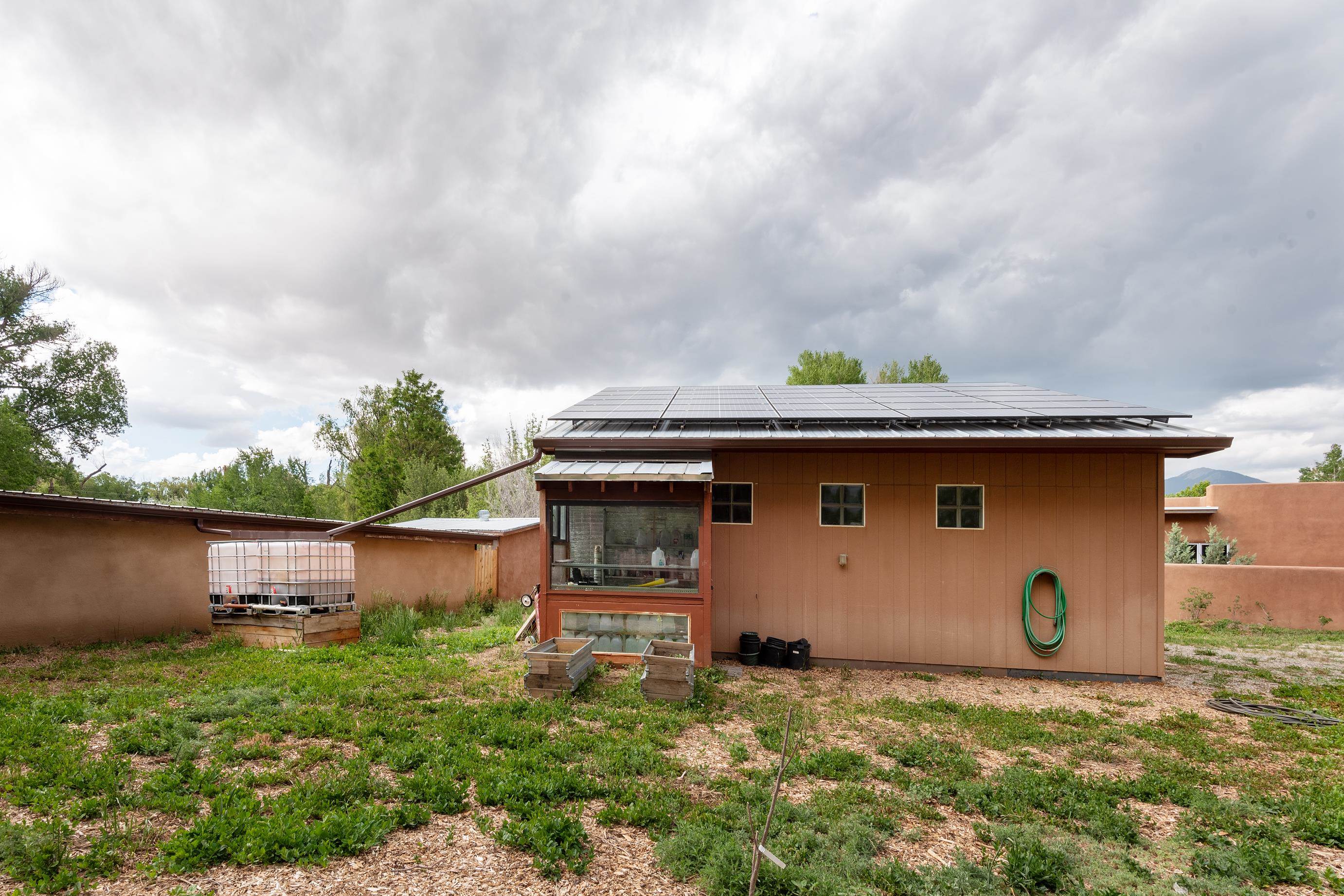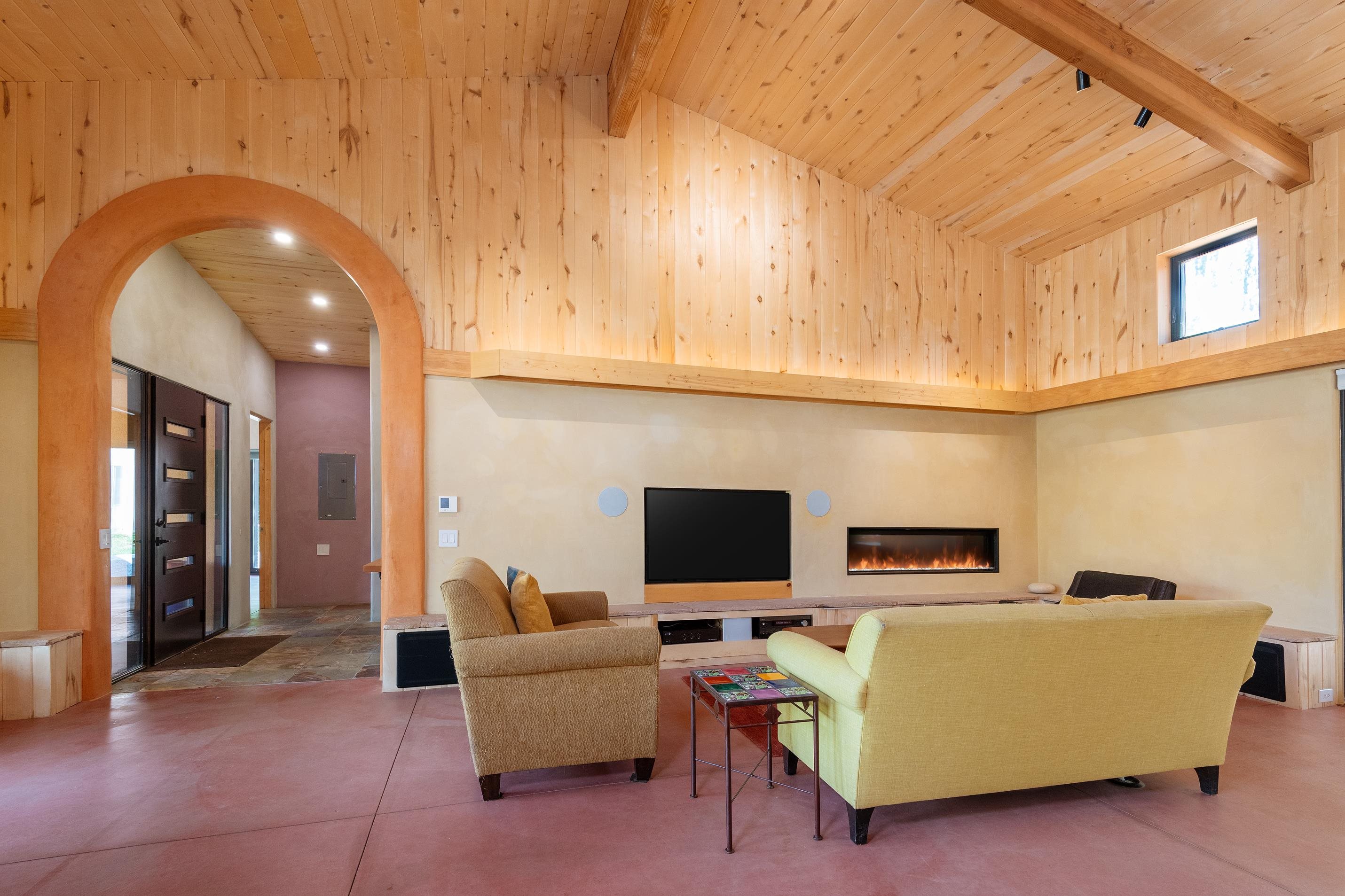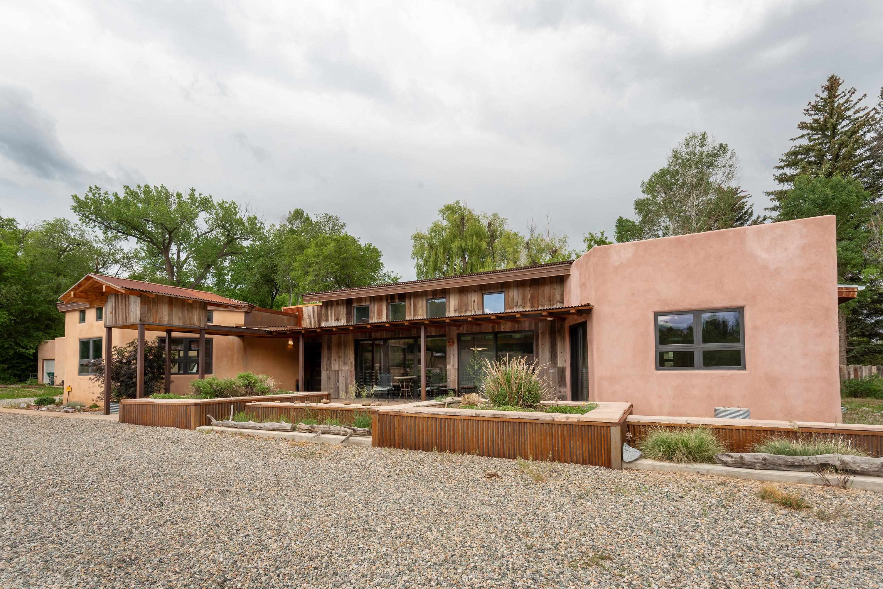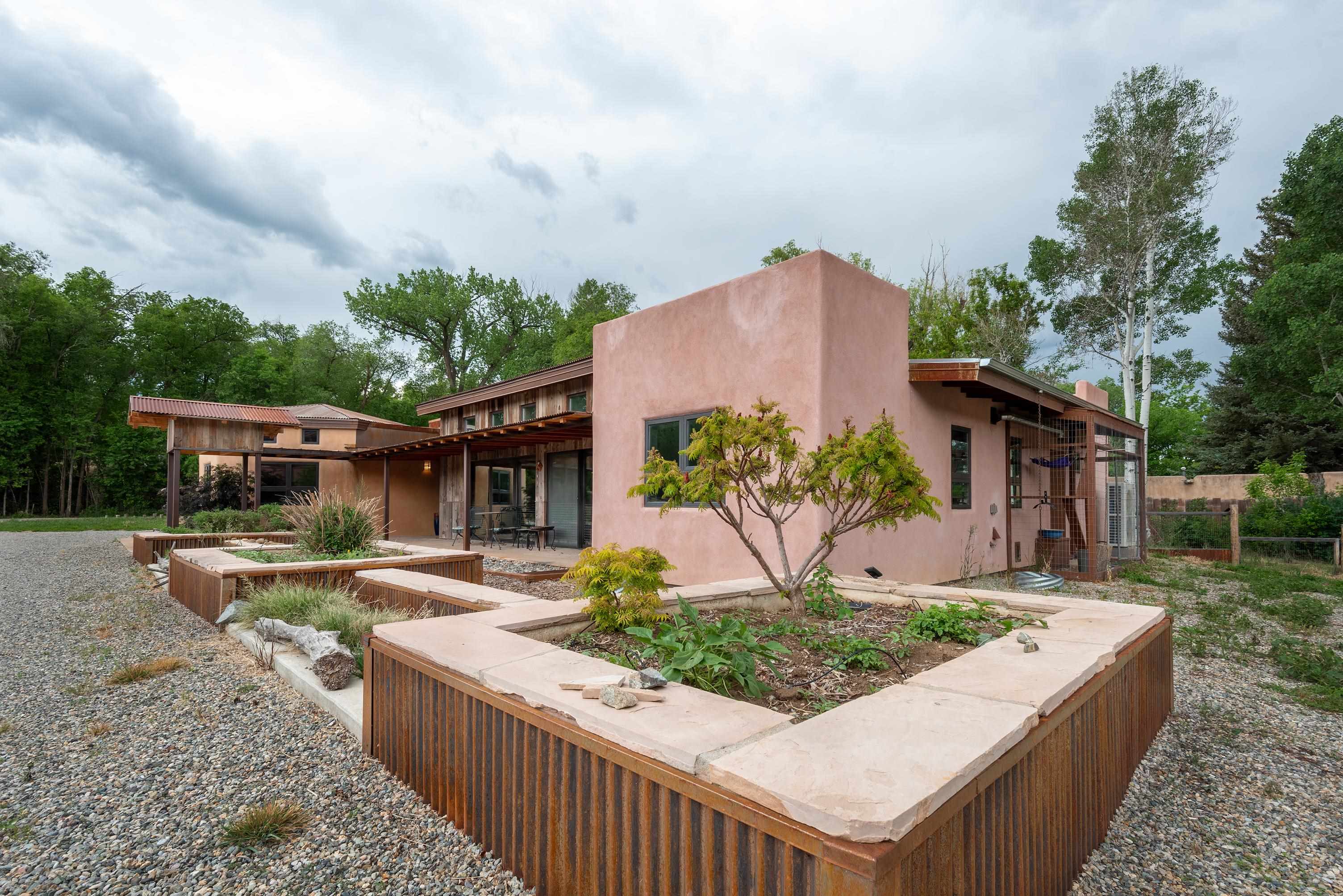 This Beautiful and unique home has great views, and a great location with many wonderful custom features. No monthly gas bills and very low electric bills. Everything needed to make for a wonderful home on an approximate ½ acre fee simple lot in the heart of Taos. This architecturally designed home is exceptionally well built, highly energy efficient and is in a perfect location in the heart of Taos. Its quiet location is at the back of a secluded neighborhood cul-de-sac within easy walking distance to Taos Plaza, numerous restaurants, museums, shopping and Kit Carson Park. The home features a magnificent view of Pueblo Peak from all the major rooms. The open floor plan and generous portals provide plenty of opportunities for comfortable living. Located near the historic district, the property is not encumbered by architectural restrictions or any homeowner association. The architect/owner designed the home to exceed LEED Platinum energy efficiency standards. With no connection to the gas line, the all electric house and separate workshop has an array of solar panels that generate enough electricity to balance out all electrical usage annually. With Kit Carson Electric's net metering policy, there is a minimum monthly charge of $ 28 which is basically the price for providing back up power. The air source heat pump provides hot water for both domestic use and for the zoned radiant floor heating. In summer the system can be switched to provide cold water to cool the home while still providing hot water for domestic use. The exterior walls and roof structure were built with Ray-Core insulated panels plus 2" of exterior rigid foam insulation for a total R value of 55. The roof has an R-value of over 66. The tinted concrete floors (R-10 value with underfloor insulation) are integrally colored, making the surface very durable. The very high quality Alpen windows and patio doors are quad glazed - (yes, you read that correctly, 4 layers of glazing) and have fiberglass frames to minimize heat loss. Windows and patio doors have honeycomb insulating blinds, some are motorized. Special care was taken to seal all seams and joints during construction to minimize air intrusion and associated heat loss. A heat recovery ventilator assures high air quality and is timed to operate 2 hours each day. Interior walls are finished with an earthen plaster product from NM based American Clay which gives the house a certain warm, organic feel. All interior wood doors were custom made on site. There is a propane fueled gas fireplace that is see through and can be enjoyed from the den or living room sides of the wall. This is the only nonelectric appliance, depending upon usage, it uses 1 or 2 four gallon tanks of propane per year. While primarily for aesthetic enjoyment it can serve as a heating source during an extended power outage. The open plan KITCHEN features a built-in Sub Zero refrigerator/freezer, induction cooktop, wall oven, dishwasher and oversized stainless steel sink, The large island invites guests to join in with meal preparation and has storage on both sides. The microwave and coffee station are inside cabinets and are hidden from view. Counter tops are copper and hardwood, and a pantry closet is just off to the side. The whole house air ventilation system with intake above the range can be used to remove cooking odors if needed. THE GREAT ROOM with high ceilings has portals on both north and south sides, clerestory windows and Aspen tongue and groove high walls and ceiling for woodsy warmth above the earthen plastered walls. The stereo system will stay with 9 built-in speakers, including 2 subwoofers. The large recessed TV will also remain. Outdoor living is premium with large porches on both north and south sides of the home which are perfect for entertaining and enjoying the unobstructed view of Pueblo Peak. In addition to the oversized 2 car garage, there is a 720 sf heated shop with a small attached greenhouse.