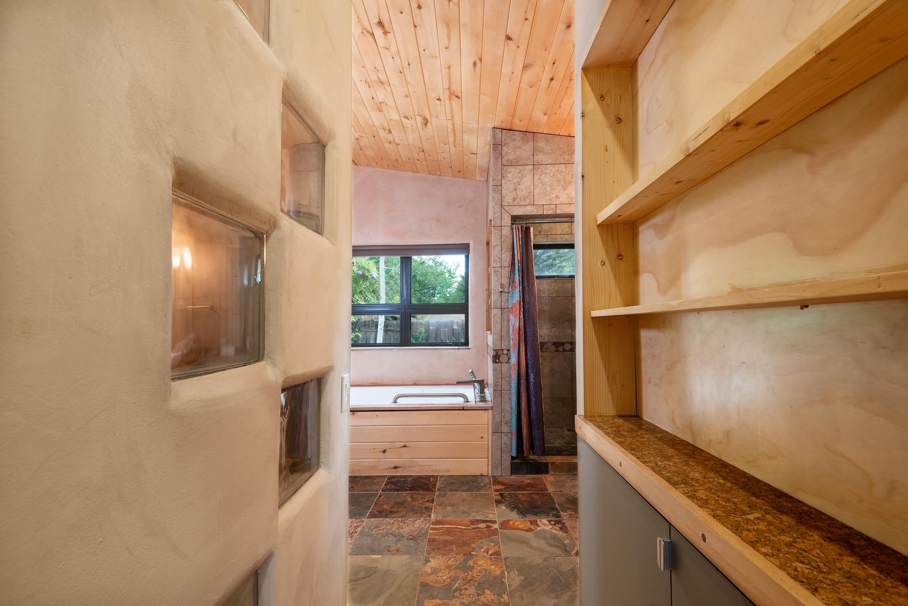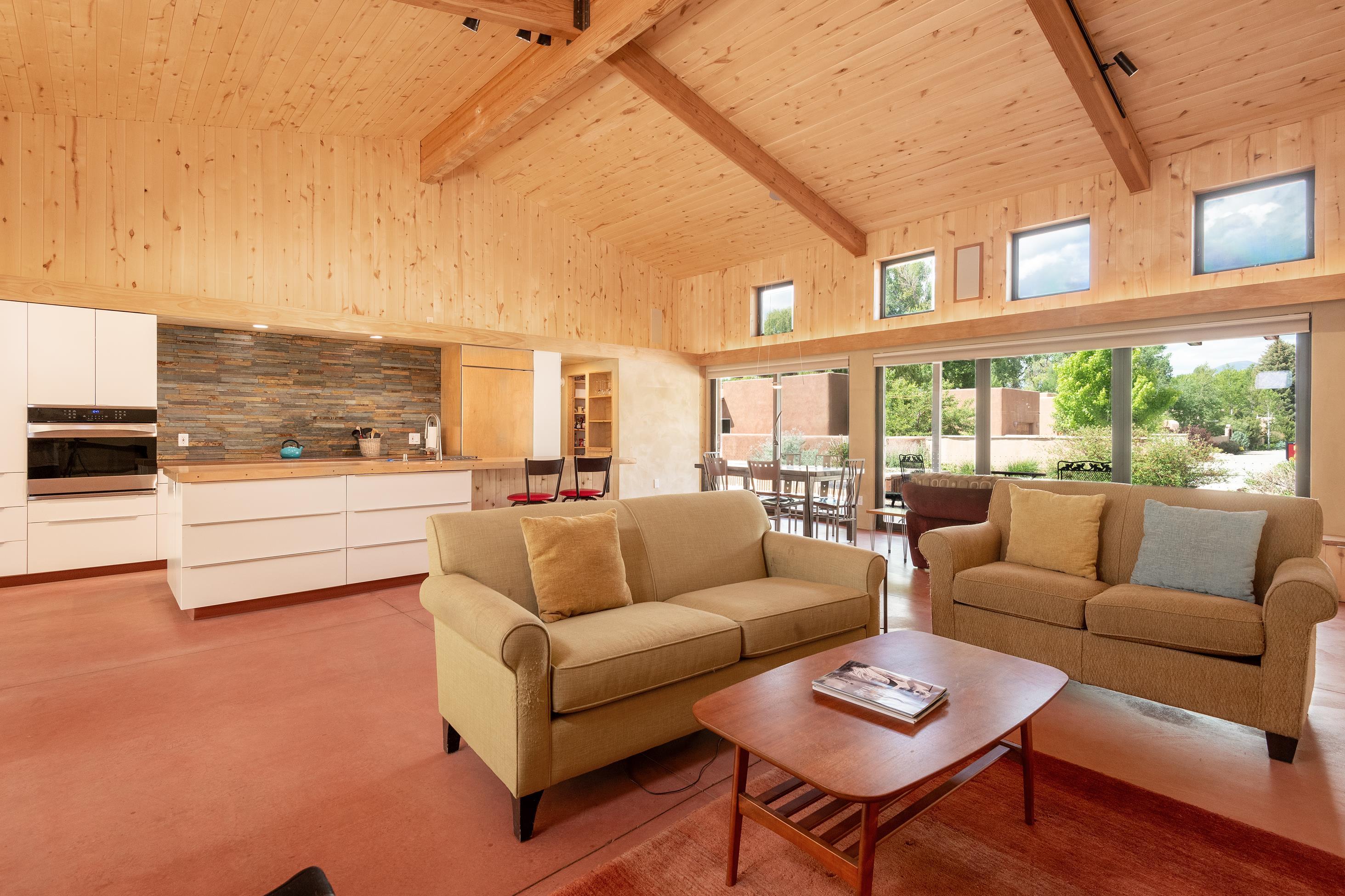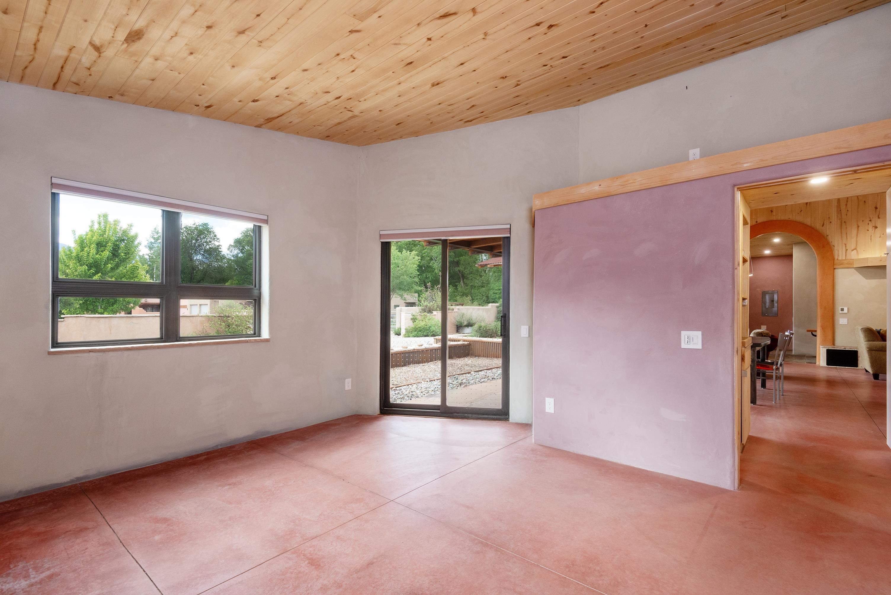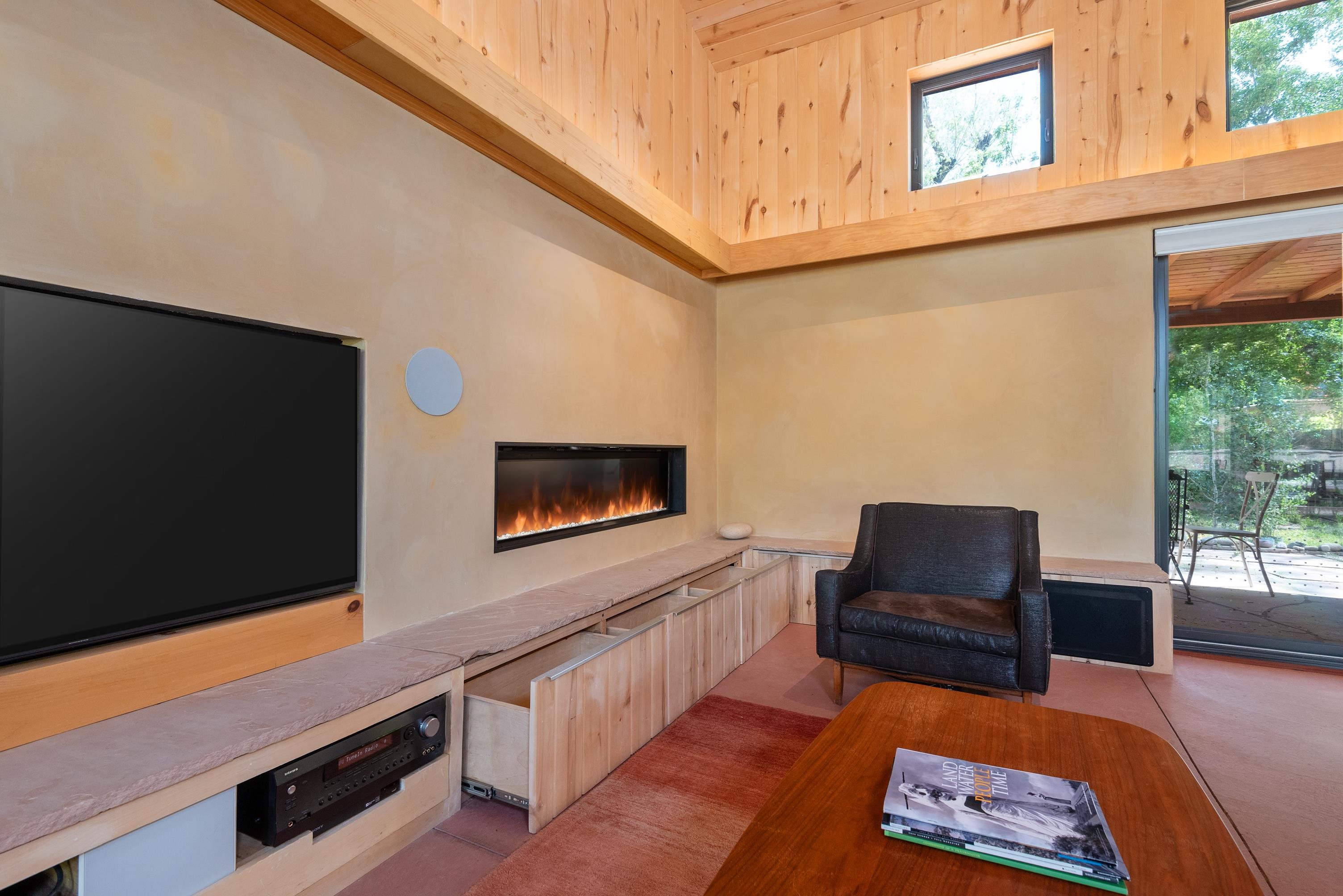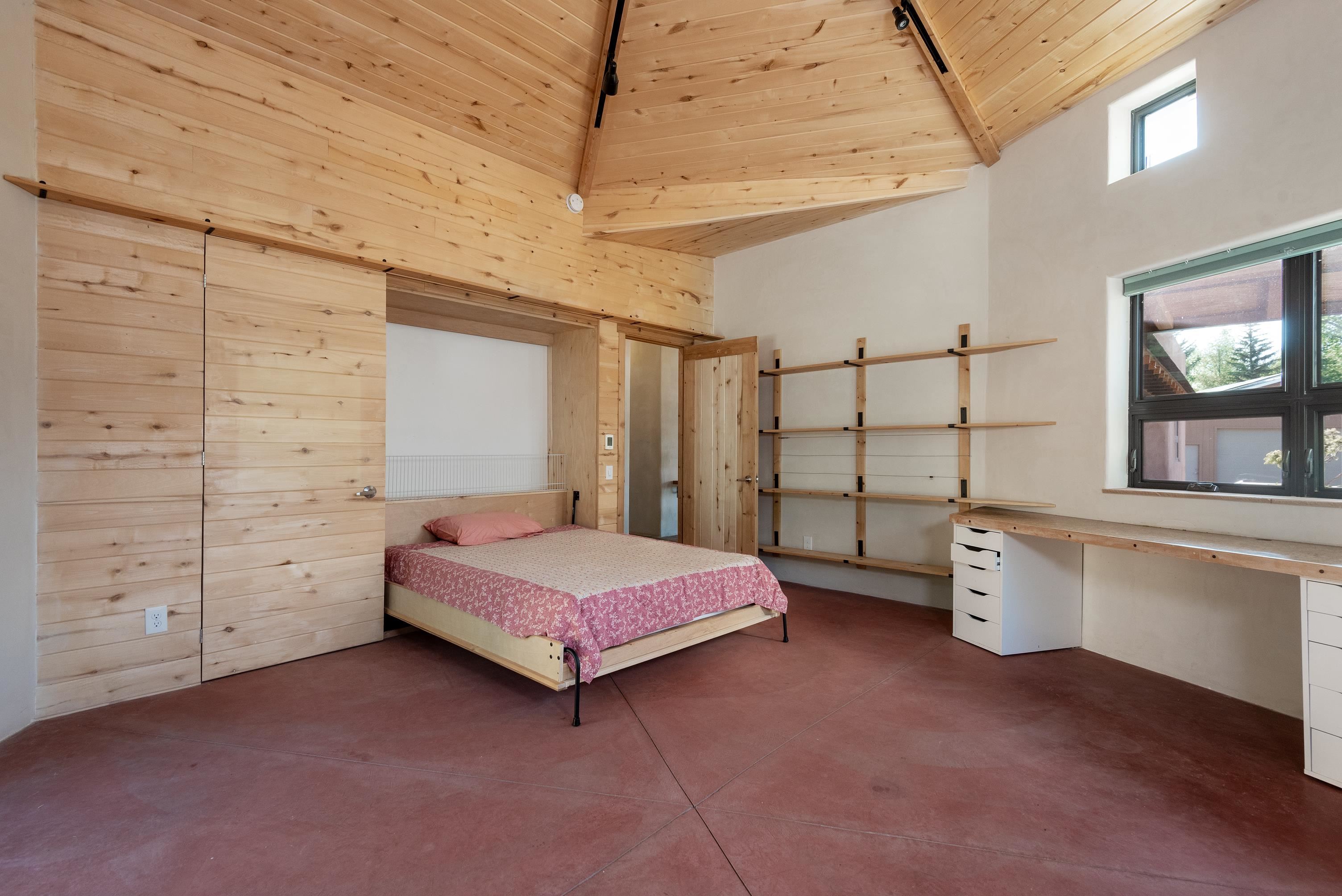 This Beautiful and unique home has great views, and a great location with many wonderful custom features. No monthly gas bills and very low electric bills. Everything needed to make for a wonderful home on an approximate ½ acre fee simple lot in the heart of Taos. This architecturally designed home is exceptionally well built, highly energy efficient and is in a perfect location in the heart of Taos. Its quiet location is at the back of a secluded neighborhood cul-de-sac within easy walking distance to Taos Plaza, numerous restaurants, museums, shopping and Kit Carson Park. The home features a magnificent view of Pueblo Peak from all the major rooms. The open floor plan and generous portals provide plenty of opportunities for comfortable living. Located near the historic district, the property is not encumbered by architectural restrictions or any homeowner association. The architect/owner designed the home to exceed LEED Platinum energy efficiency standards. With no connection to the gas line, the all electric house and separate workshop has an array of solar panels that generate enough electricity to balance out all electrical usage annually. With Kit Carson Electric's net metering policy, there is a minimum monthly charge of $ 28 which is basically the price for providing back up power. The air source heat pump provides hot water for both domestic use and for the zoned radiant floor heating. In summer the system can be switched to provide cold water to cool the home while still providing hot water for domestic use. The exterior walls and roof structure were built with Ray-Core insulated panels plus 2" of exterior rigid foam insulation for a total R value of 55. The roof has an R-value of over 66. The tinted concrete floors (R-10 value with underfloor insulation) are integrally colored, making the surface very durable. The very high quality Alpen windows and patio doors are quad glazed - (yes, you read that correctly, 4 layers of glazing) and have fiberglass frames to minimize heat loss. Windows and patio doors have honeycomb insulating blinds, some are motorized. Special care was taken to seal all seams and joints during construction to minimize air intrusion and associated heat loss. A heat recovery ventilator assures high air quality and is timed to operate 2 hours each day. Interior walls are finished with an earthen plaster product from NM based American Clay which gives the house a certain warm, organic feel. All interior wood doors were custom made on site. There is a propane fueled gas fireplace that is see through and can be enjoyed from the den or living room sides of the wall. This is the only nonelectric appliance, depending upon usage, it uses 1 or 2 four gallon tanks of propane per year. While primarily for aesthetic enjoyment it can serve as a heating source during an extended power outage. The open plan KITCHEN features a built-in Sub Zero refrigerator/freezer, induction cooktop, wall oven, dishwasher and oversized stainless steel sink, The large island invites guests to join in with meal preparation and has storage on both sides. The microwave and coffee station are inside cabinets and are hidden from view. Counter tops are copper and hardwood, and a pantry closet is just off to the side. The whole house air ventilation system with intake above the range can be used to remove cooking odors if needed. THE GREAT ROOM with high ceilings has portals on both north and south sides, clerestory windows and Aspen tongue and groove high walls and ceiling for woodsy warmth above the earthen plastered walls. The stereo system will stay with 9 built-in speakers, including 2 subwoofers. The large recessed TV will also remain. Outdoor living is premium with large porches on both north and south sides of the home which are perfect for entertaining and enjoying the unobstructed view of Pueblo Peak. In addition to the oversized 2 car garage, there is a 720 sf heated shop with a small attached greenhouse.