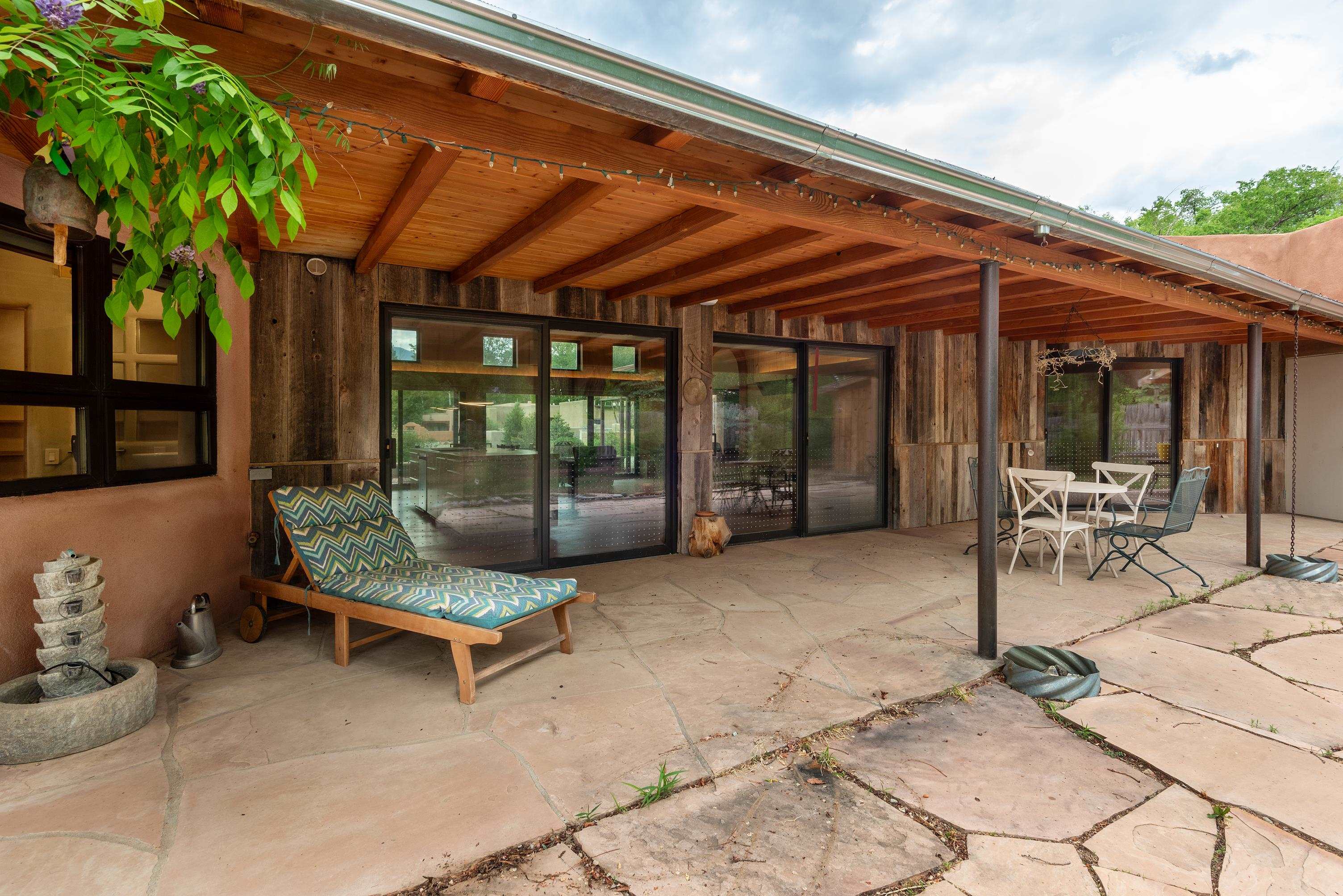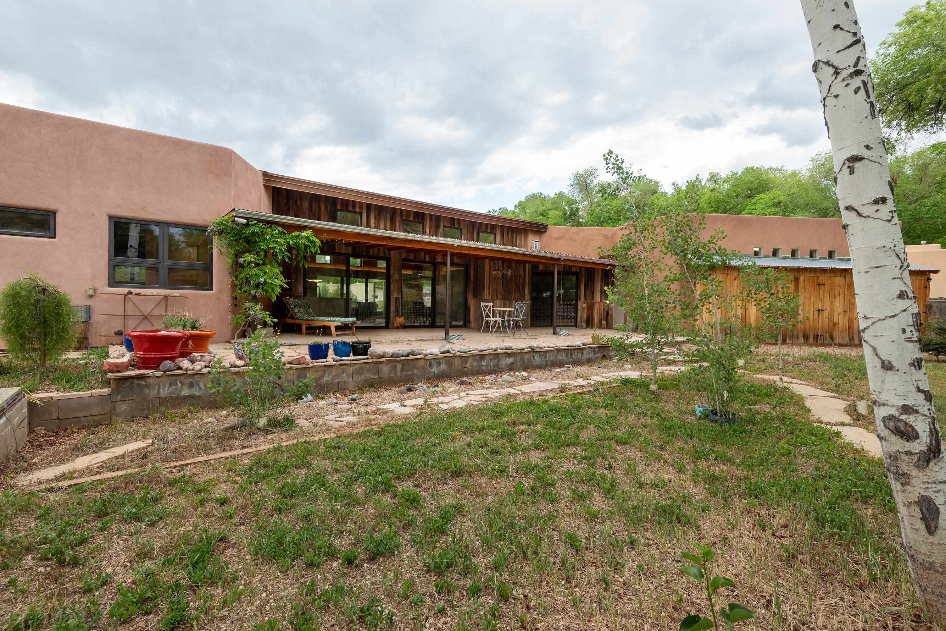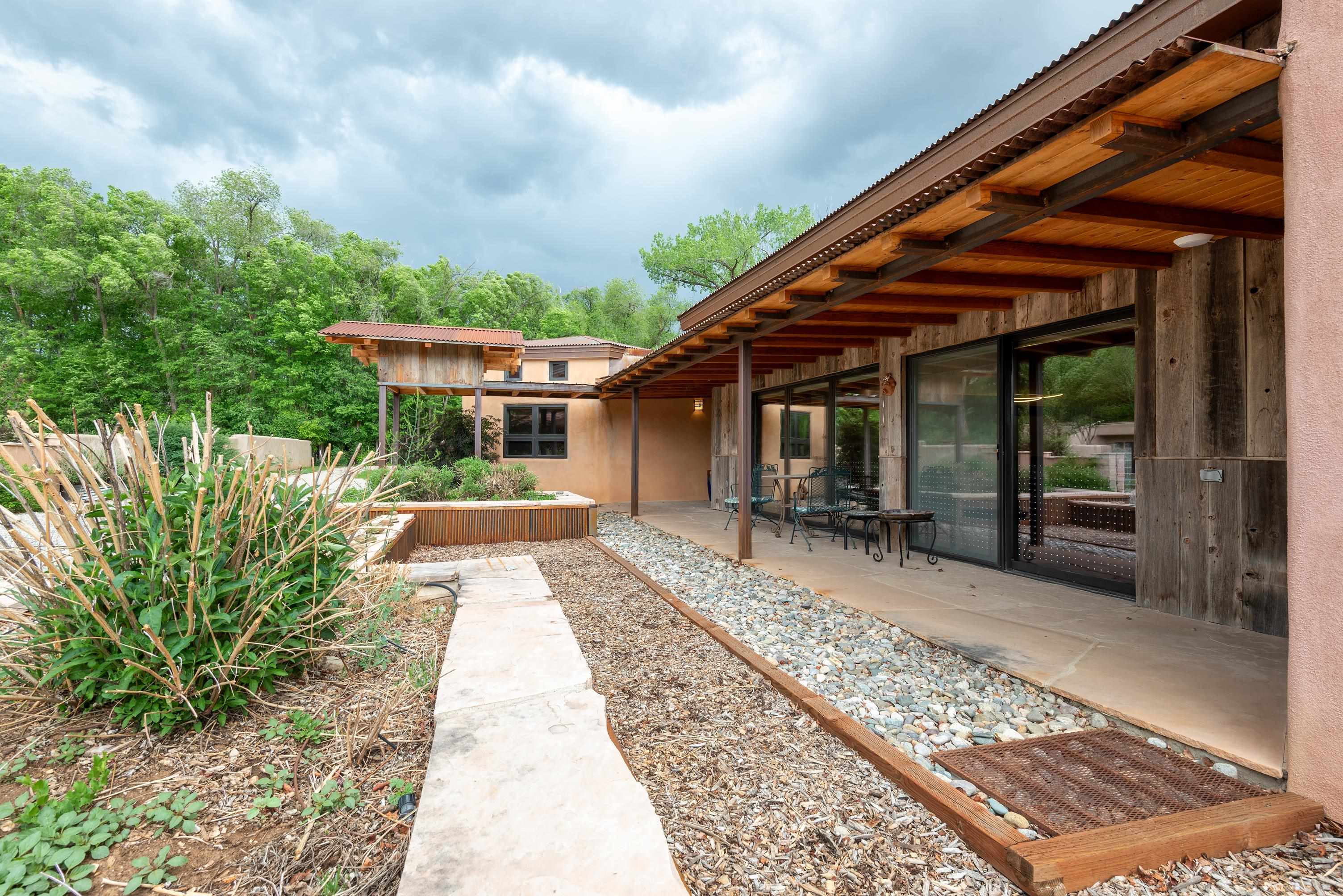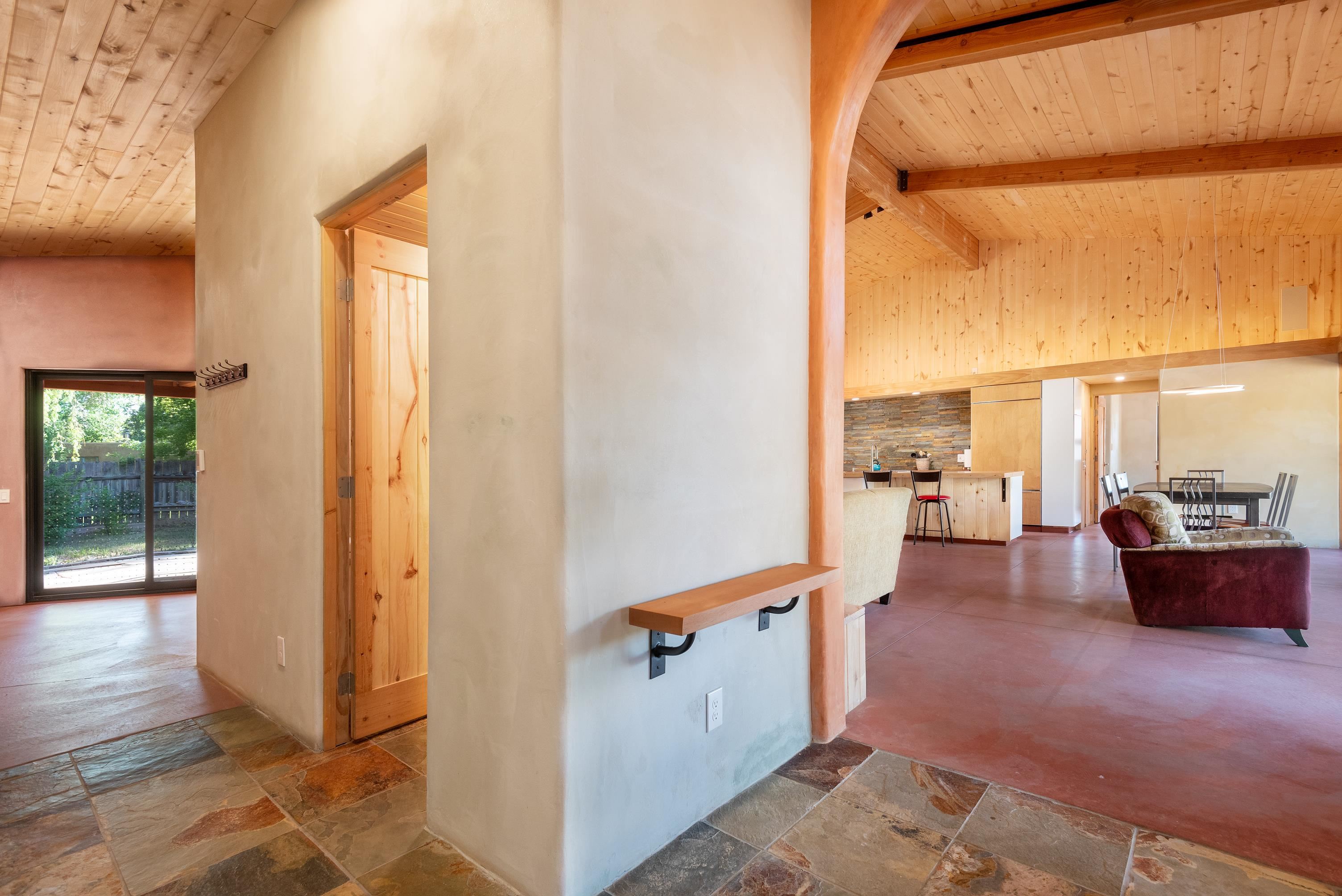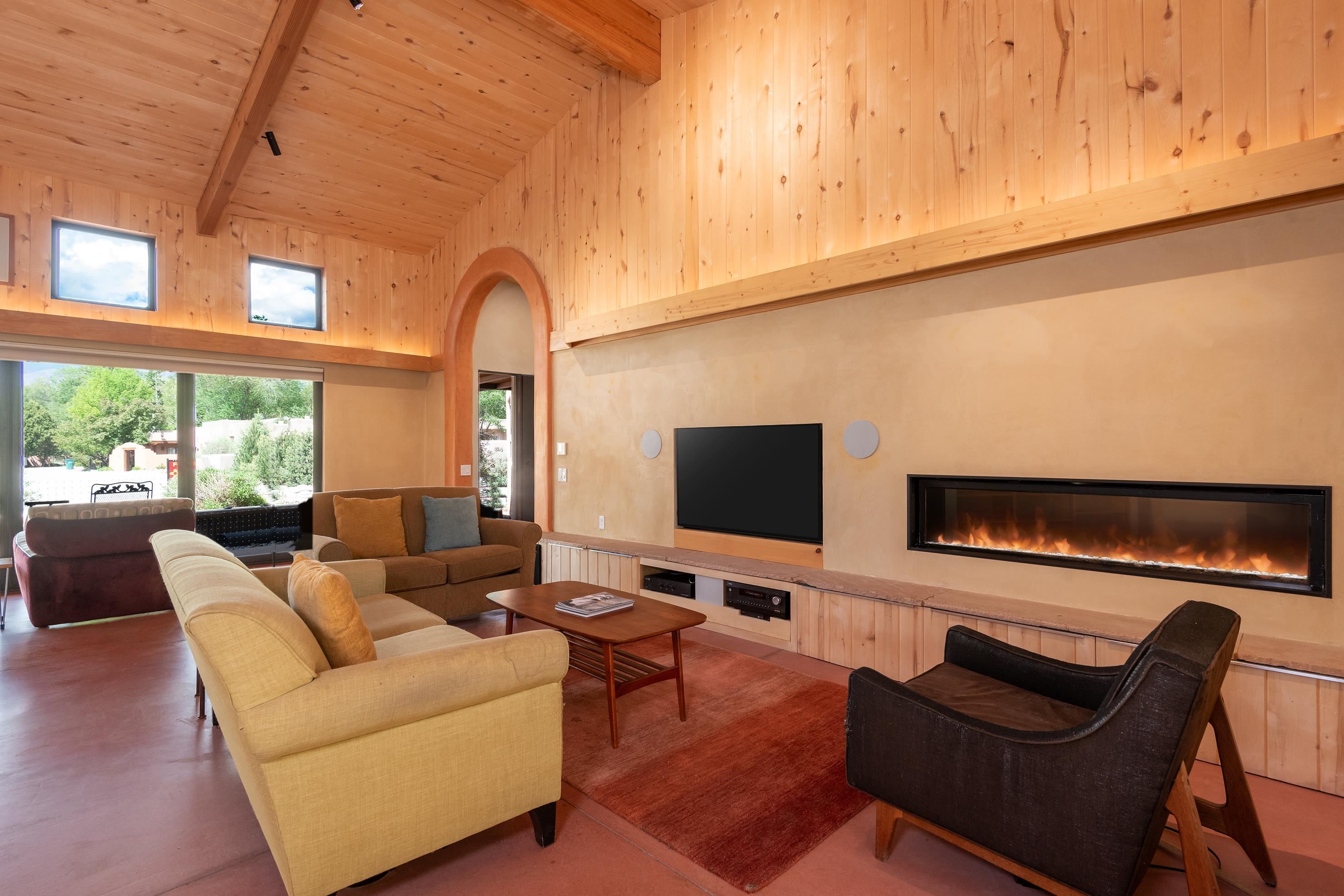 This Beautiful and unique home has great views, and a great location with many wonderful custom features. No monthly gas bills and very low electric bills. Everything needed to make for a wonderful home on an approximate ½ acre fee simple lot in the heart of Taos. This architecturally designed home is exceptionally well built, highly energy efficient and is in a perfect location in the heart of Taos. Its quiet location is at the back of a secluded neighborhood cul-de-sac within easy walking distance to Taos Plaza, numerous restaurants, museums, shopping and Kit Carson Park. The home features a magnificent view of Pueblo Peak from all the major rooms. The open floor plan and generous portals provide plenty of opportunities for comfortable living. Located near the historic district, the property is not encumbered by architectural restrictions or any homeowner association. The architect/owner designed the home to exceed LEED Platinum energy efficiency standards. With no connection to the gas line, the all electric house and separate workshop has an array of solar panels that generate enough electricity to balance out all electrical usage annually. With Kit Carson Electric's net metering policy, there is a minimum monthly charge of $ 28 which is basically the price for providing back up power. The air source heat pump provides hot water for both domestic use and for the zoned radiant floor heating. In summer the system can be switched to provide cold water to cool the home while still providing hot water for domestic use. The exterior walls and roof structure were built with Ray-Core insulated panels plus 2" of exterior rigid foam insulation for a total R value of 55. The roof has an R-value of over 66. The tinted concrete floors (R-10 value with underfloor insulation) are integrally colored, making the surface very durable. The very high quality Alpen windows and patio doors are quad glazed - (yes, you read that correctly, 4 layers of glazing) and have fiberglass frames to minimize heat loss. Windows and patio doors have honeycomb insulating blinds, some are motorized. Special care was taken to seal all seams and joints during construction to minimize air intrusion and associated heat loss. A heat recovery ventilator assures high air quality and is timed to operate 2 hours each day. Interior walls are finished with an earthen plaster product from NM based American Clay which gives the house a certain warm, organic feel. All interior wood doors were custom made on site. There is a propane fueled gas fireplace that is see through and can be enjoyed from the den or living room sides of the wall. This is the only nonelectric appliance, depending upon usage, it uses 1 or 2 four gallon tanks of propane per year. While primarily for aesthetic enjoyment it can serve as a heating source during an extended power outage. The open plan KITCHEN features a built-in Sub Zero refrigerator/freezer, induction cooktop, wall oven, dishwasher and oversized stainless steel sink, The large island invites guests to join in with meal preparation and has storage on both sides. The microwave and coffee station are inside cabinets and are hidden from view. Counter tops are copper and hardwood, and a pantry closet is just off to the side. The whole house air ventilation system with intake above the range can be used to remove cooking odors if needed. THE GREAT ROOM with high ceilings has portals on both north and south sides, clerestory windows and Aspen tongue and groove high walls and ceiling for woodsy warmth above the earthen plastered walls. The stereo system will stay with 9 built-in speakers, including 2 subwoofers. The large recessed TV will also remain. Outdoor living is premium with large porches on both north and south sides of the home which are perfect for entertaining and enjoying the unobstructed view of Pueblo Peak. In addition to the oversized 2 car garage, there is a 720 sf heated shop with a small attached greenhouse.