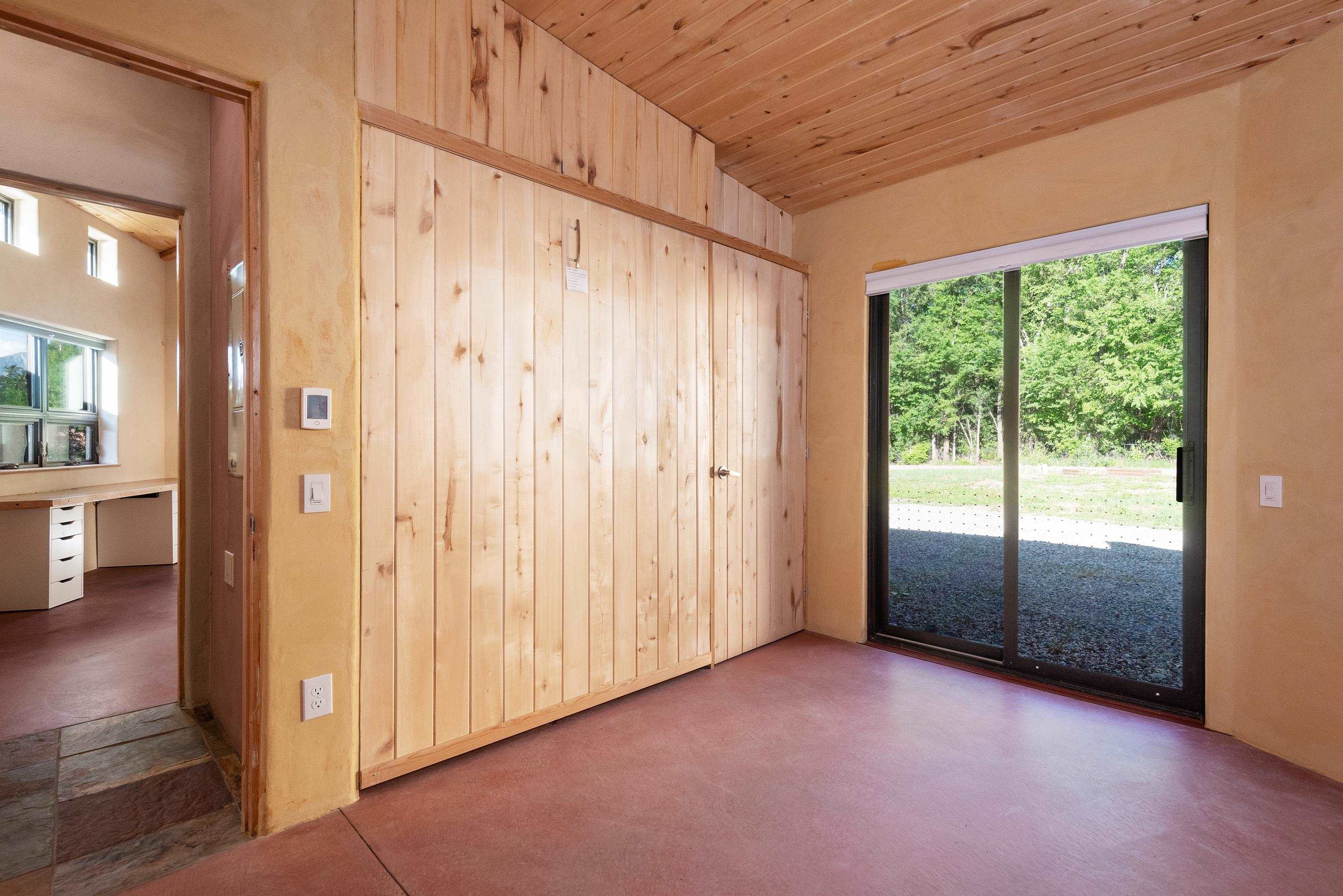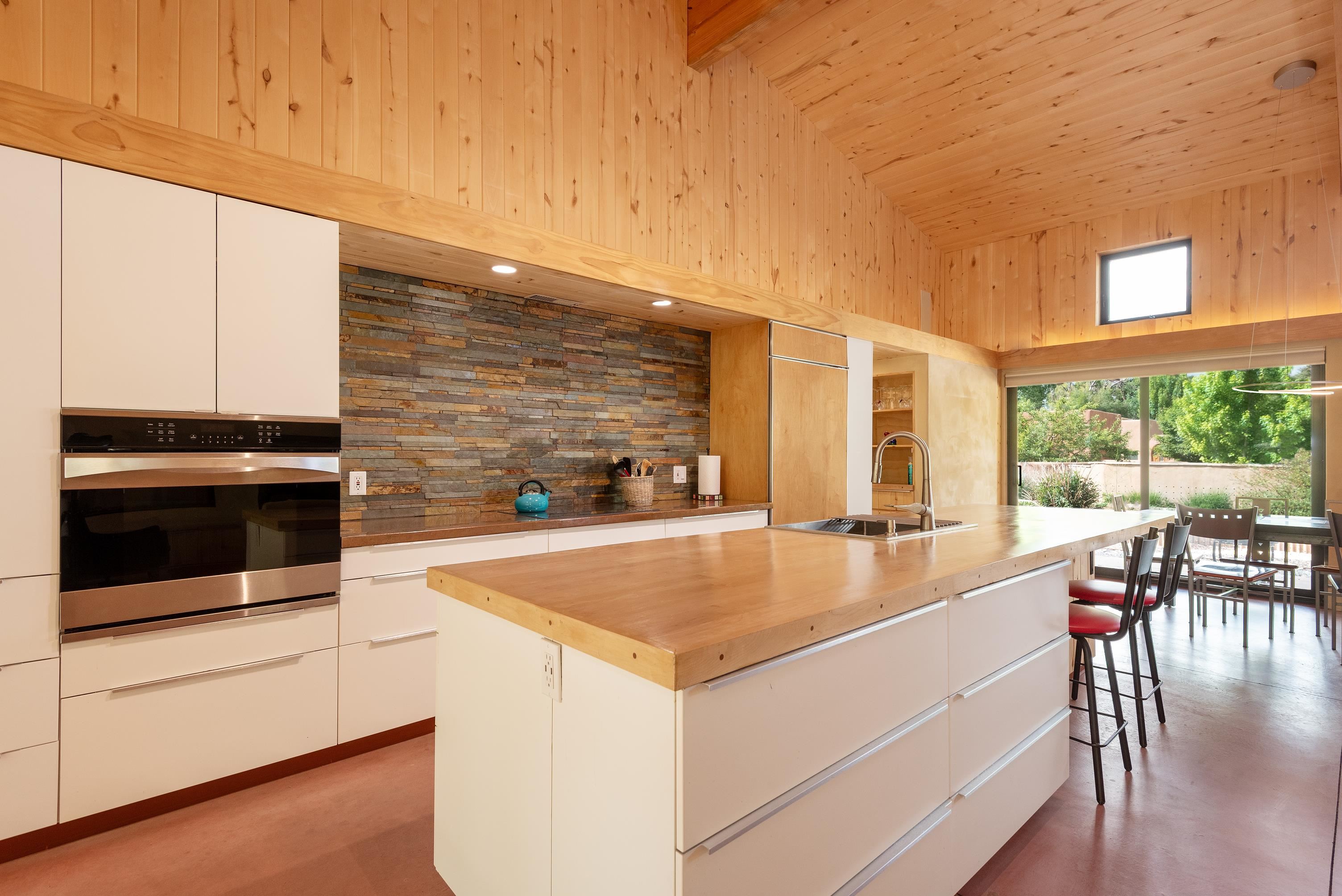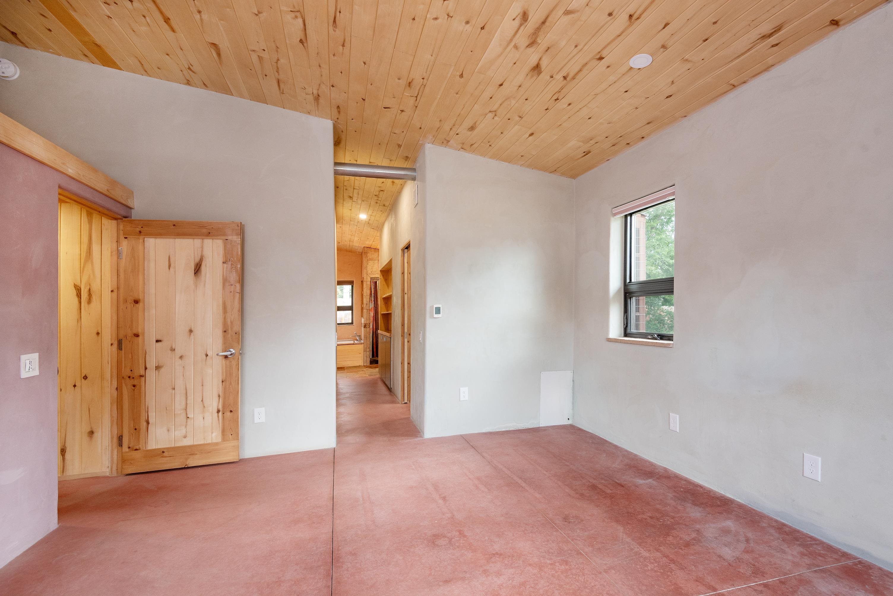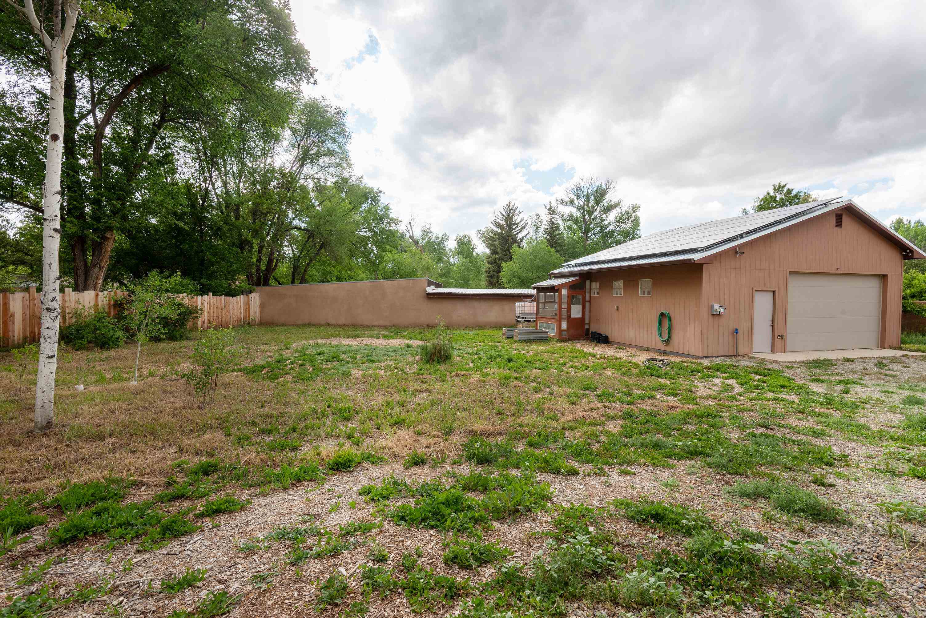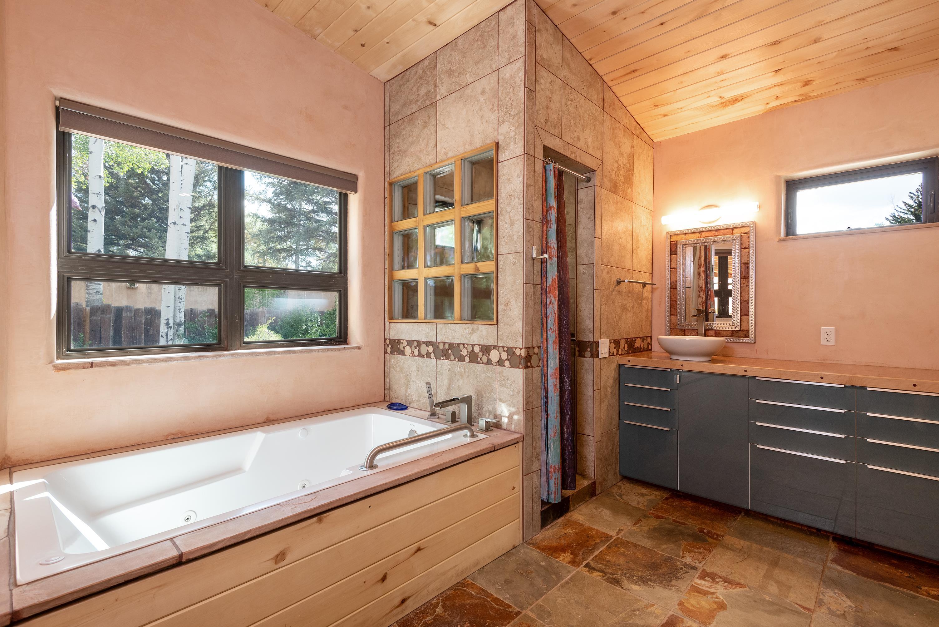 This Beautiful and unique home has great views, and a great location with many wonderful custom features. No monthly gas bills and very low electric bills. Everything needed to make for a wonderful home on an approximate ½ acre fee simple lot in the heart of Taos. This architecturally designed home is exceptionally well built, highly energy efficient and is in a perfect location in the heart of Taos. Its quiet location is at the back of a secluded neighborhood cul-de-sac within easy walking distance to Taos Plaza, numerous restaurants, museums, shopping and Kit Carson Park. The home features a magnificent view of Pueblo Peak from all the major rooms. The open floor plan and generous portals provide plenty of opportunities for comfortable living. Located near the historic district, the property is not encumbered by architectural restrictions or any homeowner association. The architect/owner designed the home to exceed LEED Platinum energy efficiency standards. With no connection to the gas line, the all electric house and separate workshop has an array of solar panels that generate enough electricity to balance out all electrical usage annually. With Kit Carson Electric's net metering policy, there is a minimum monthly charge of $ 28 which is basically the price for providing back up power. The air source heat pump provides hot water for both domestic use and for the zoned radiant floor heating. In summer the system can be switched to provide cold water to cool the home while still providing hot water for domestic use. The exterior walls and roof structure were built with Ray-Core insulated panels plus 2" of exterior rigid foam insulation for a total R value of 55. The roof has an R-value of over 66. The tinted concrete floors (R-10 value with underfloor insulation) are integrally colored, making the surface very durable. The very high quality Alpen windows and patio doors are quad glazed - (yes, you read that correctly, 4 layers of glazing) and have fiberglass frames to minimize heat loss. Windows and patio doors have honeycomb insulating blinds, some are motorized. Special care was taken to seal all seams and joints during construction to minimize air intrusion and associated heat loss. A heat recovery ventilator assures high air quality and is timed to operate 2 hours each day. Interior walls are finished with an earthen plaster product from NM based American Clay which gives the house a certain warm, organic feel. All interior wood doors were custom made on site. There is a propane fueled gas fireplace that is see through and can be enjoyed from the den or living room sides of the wall. This is the only nonelectric appliance, depending upon usage, it uses 1 or 2 four gallon tanks of propane per year. While primarily for aesthetic enjoyment it can serve as a heating source during an extended power outage. The open plan KITCHEN features a built-in Sub Zero refrigerator/freezer, induction cooktop, wall oven, dishwasher and oversized stainless steel sink, The large island invites guests to join in with meal preparation and has storage on both sides. The microwave and coffee station are inside cabinets and are hidden from view. Counter tops are copper and hardwood, and a pantry closet is just off to the side. The whole house air ventilation system with intake above the range can be used to remove cooking odors if needed. THE GREAT ROOM with high ceilings has portals on both north and south sides, clerestory windows and Aspen tongue and groove high walls and ceiling for woodsy warmth above the earthen plastered walls. The stereo system will stay with 9 built-in speakers, including 2 subwoofers. The large recessed TV will also remain. Outdoor living is premium with large porches on both north and south sides of the home which are perfect for entertaining and enjoying the unobstructed view of Pueblo Peak. In addition to the oversized 2 car garage, there is a 720 sf heated shop with a small attached greenhouse.