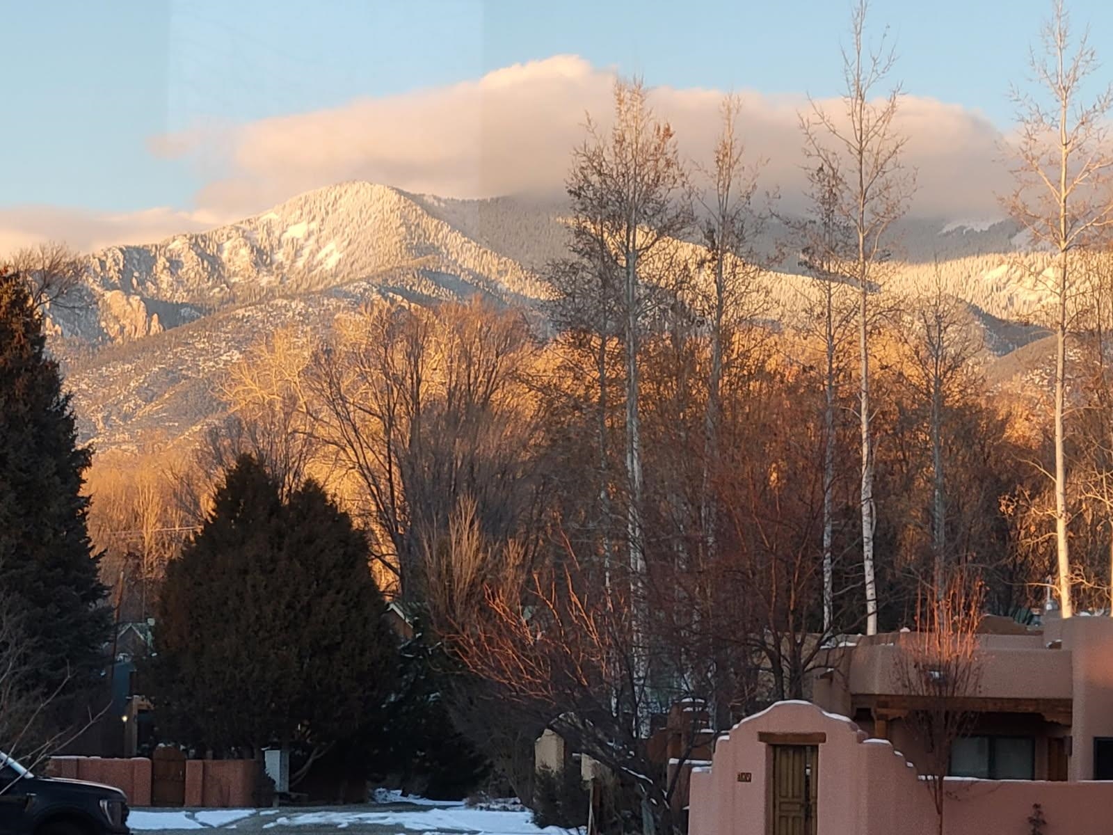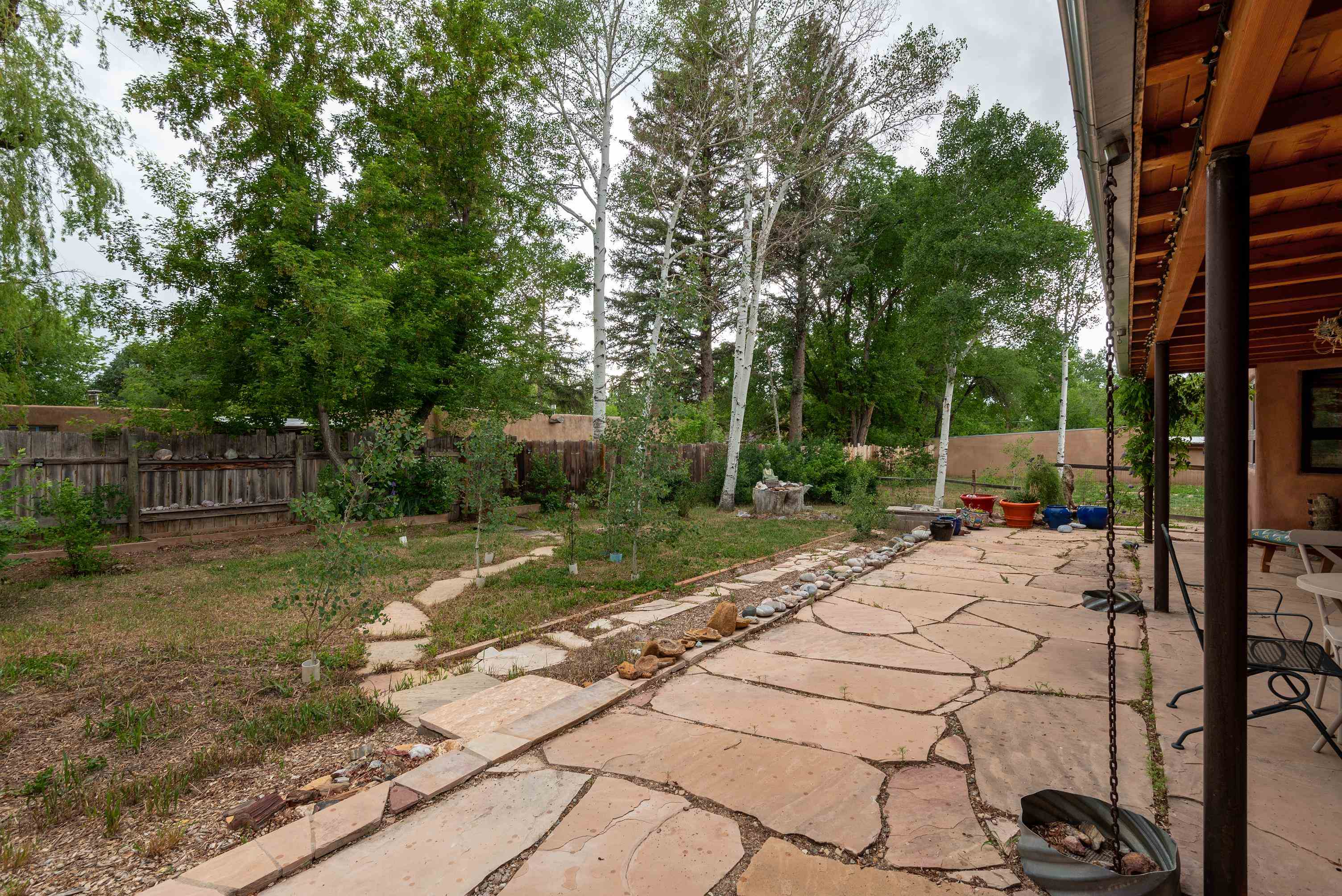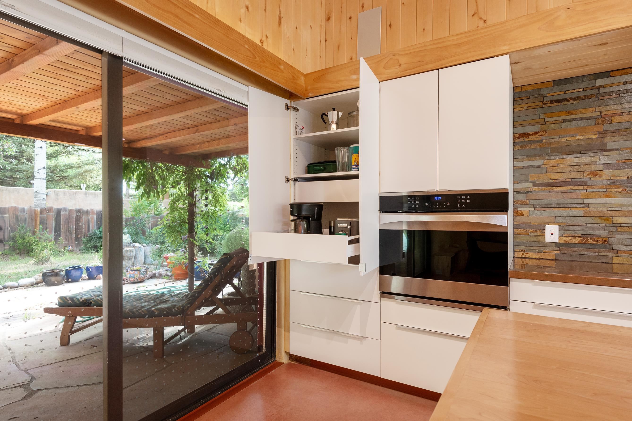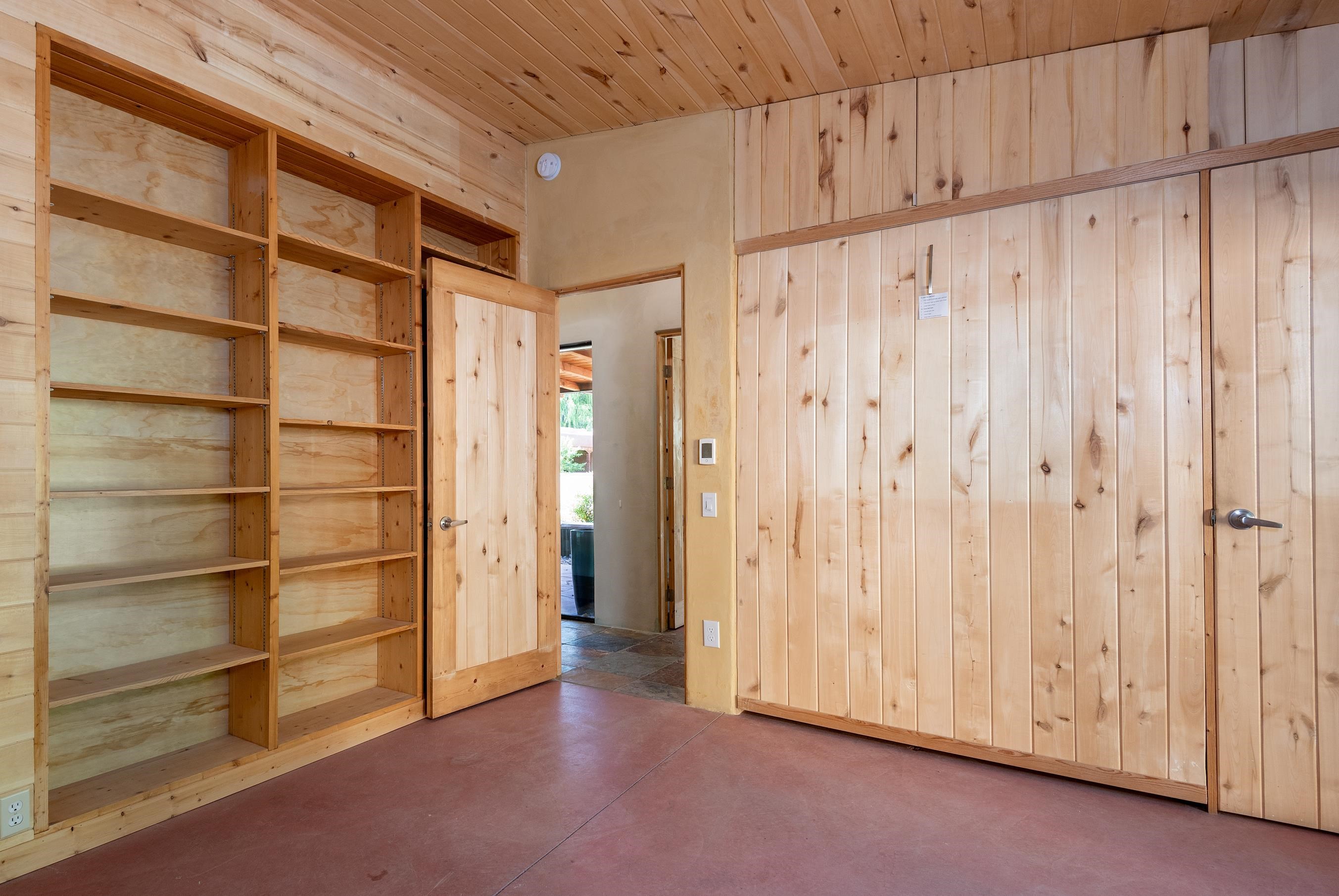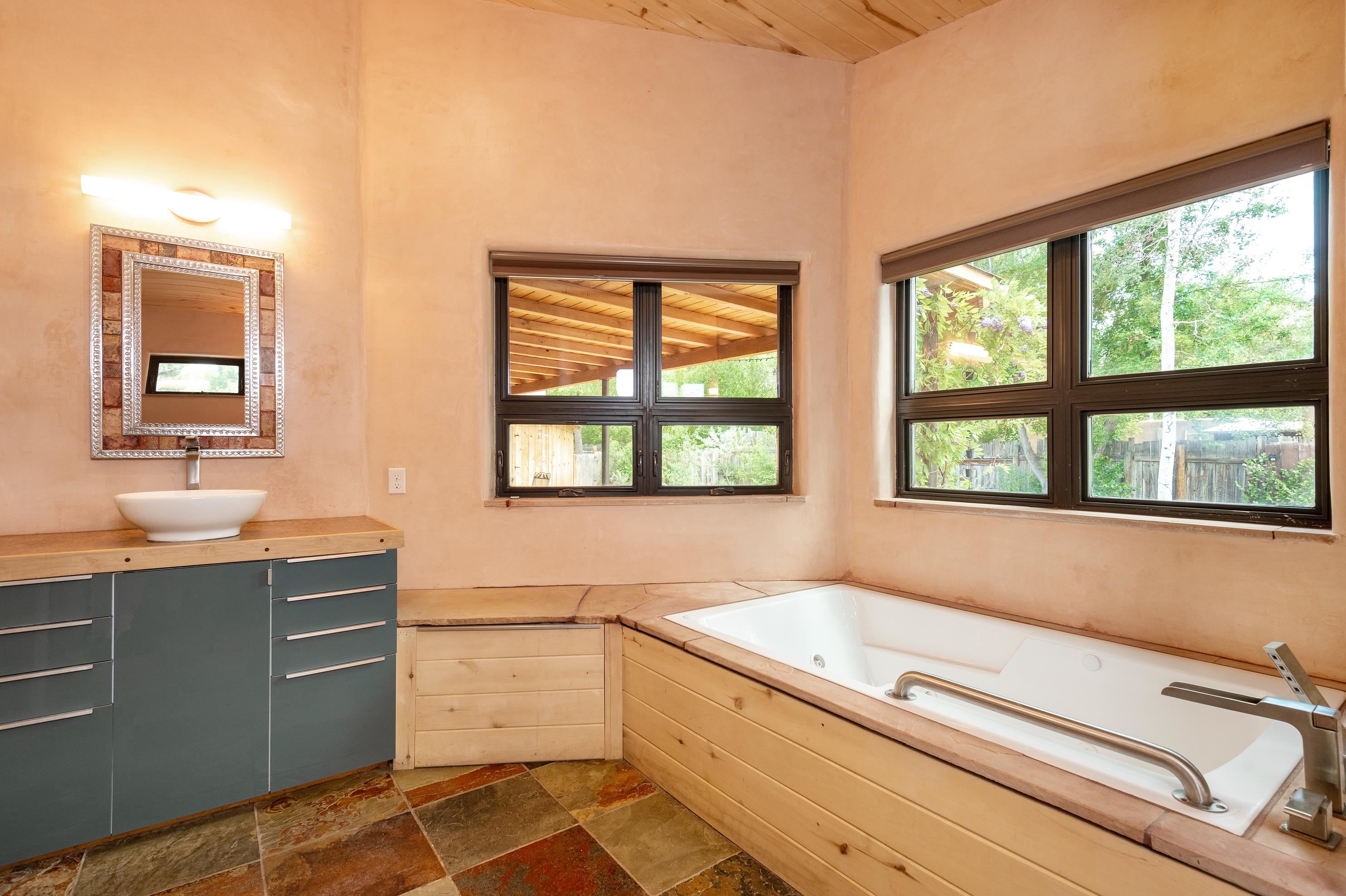 This Beautiful and unique home has great views, and a great location with many wonderful custom features. No monthly gas bills and very low electric bills. Everything needed to make for a wonderful home on an approximate ½ acre fee simple lot in the heart of Taos. This architecturally designed home is exceptionally well built, highly energy efficient and is in a perfect location in the heart of Taos. Its quiet location is at the back of a secluded neighborhood cul-de-sac within easy walking distance to Taos Plaza, numerous restaurants, museums, shopping and Kit Carson Park. The home features a magnificent view of Pueblo Peak from all the major rooms. The open floor plan and generous portals provide plenty of opportunities for comfortable living. Located near the historic district, the property is not encumbered by architectural restrictions or any homeowner association. The architect/owner designed the home to exceed LEED Platinum energy efficiency standards. With no connection to the gas line, the all electric house and separate workshop has an array of solar panels that generate enough electricity to balance out all electrical usage annually. With Kit Carson Electric's net metering policy, there is a minimum monthly charge of $ 28 which is basically the price for providing back up power. The air source heat pump provides hot water for both domestic use and for the zoned radiant floor heating. In summer the system can be switched to provide cold water to cool the home while still providing hot water for domestic use. The exterior walls and roof structure were built with Ray-Core insulated panels plus 2" of exterior rigid foam insulation for a total R value of 55. The roof has an R-value of over 66. The tinted concrete floors (R-10 value with underfloor insulation) are integrally colored, making the surface very durable. The very high quality Alpen windows and patio doors are quad glazed - (yes, you read that correctly, 4 layers of glazing) and have fiberglass frames to minimize heat loss. Windows and patio doors have honeycomb insulating blinds, some are motorized. Special care was taken to seal all seams and joints during construction to minimize air intrusion and associated heat loss. A heat recovery ventilator assures high air quality and is timed to operate 2 hours each day. Interior walls are finished with an earthen plaster product from NM based American Clay which gives the house a certain warm, organic feel. All interior wood doors were custom made on site. There is a propane fueled gas fireplace that is see through and can be enjoyed from the den or living room sides of the wall. This is the only nonelectric appliance, depending upon usage, it uses 1 or 2 four gallon tanks of propane per year. While primarily for aesthetic enjoyment it can serve as a heating source during an extended power outage. The open plan KITCHEN features a built-in Sub Zero refrigerator/freezer, induction cooktop, wall oven, dishwasher and oversized stainless steel sink, The large island invites guests to join in with meal preparation and has storage on both sides. The microwave and coffee station are inside cabinets and are hidden from view. Counter tops are copper and hardwood, and a pantry closet is just off to the side. The whole house air ventilation system with intake above the range can be used to remove cooking odors if needed. THE GREAT ROOM with high ceilings has portals on both north and south sides, clerestory windows and Aspen tongue and groove high walls and ceiling for woodsy warmth above the earthen plastered walls. The stereo system will stay with 9 built-in speakers, including 2 subwoofers. The large recessed TV will also remain. Outdoor living is premium with large porches on both north and south sides of the home which are perfect for entertaining and enjoying the unobstructed view of Pueblo Peak. In addition to the oversized 2 car garage, there is a 720 sf heated shop with a small attached greenhouse.