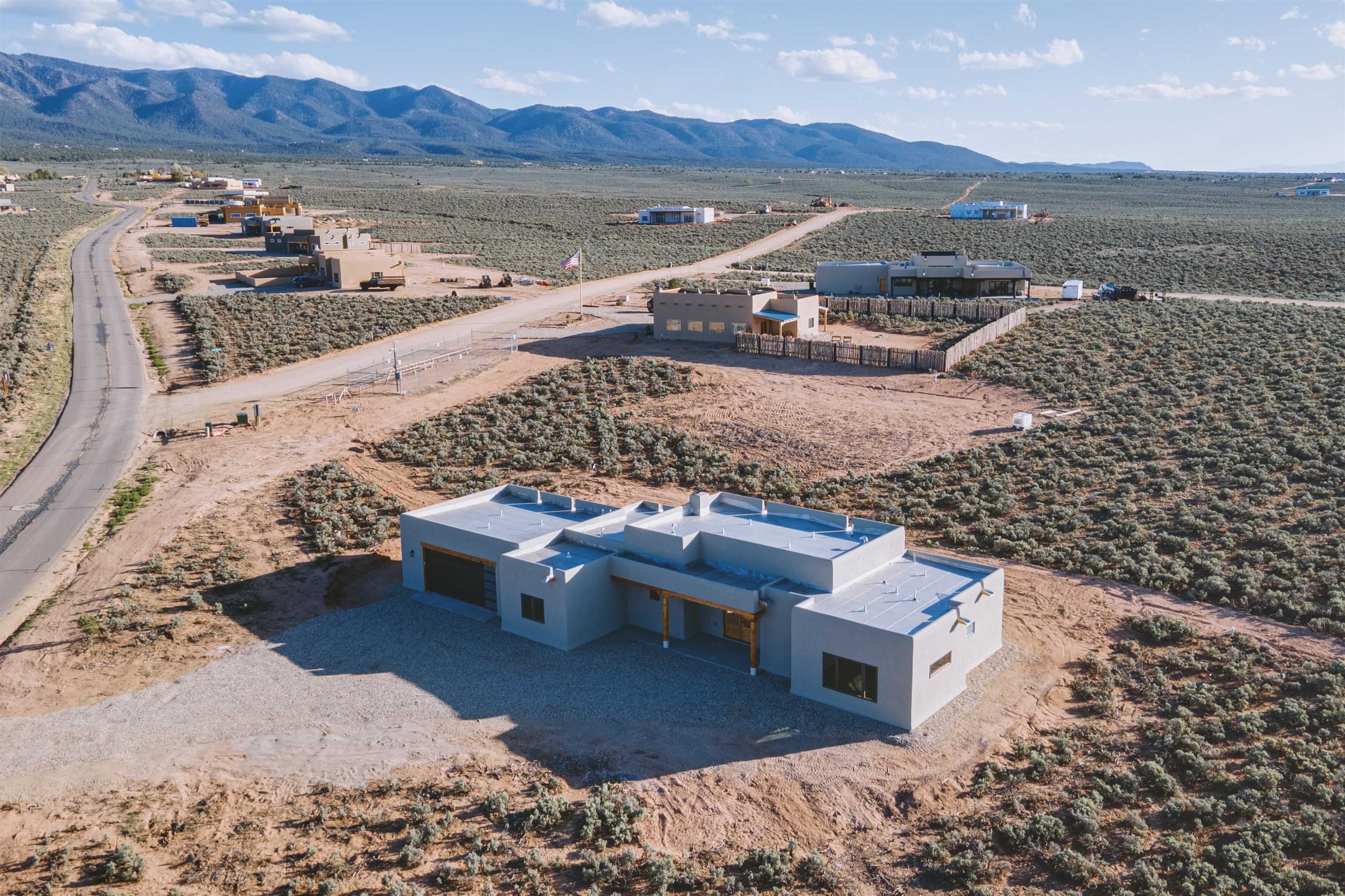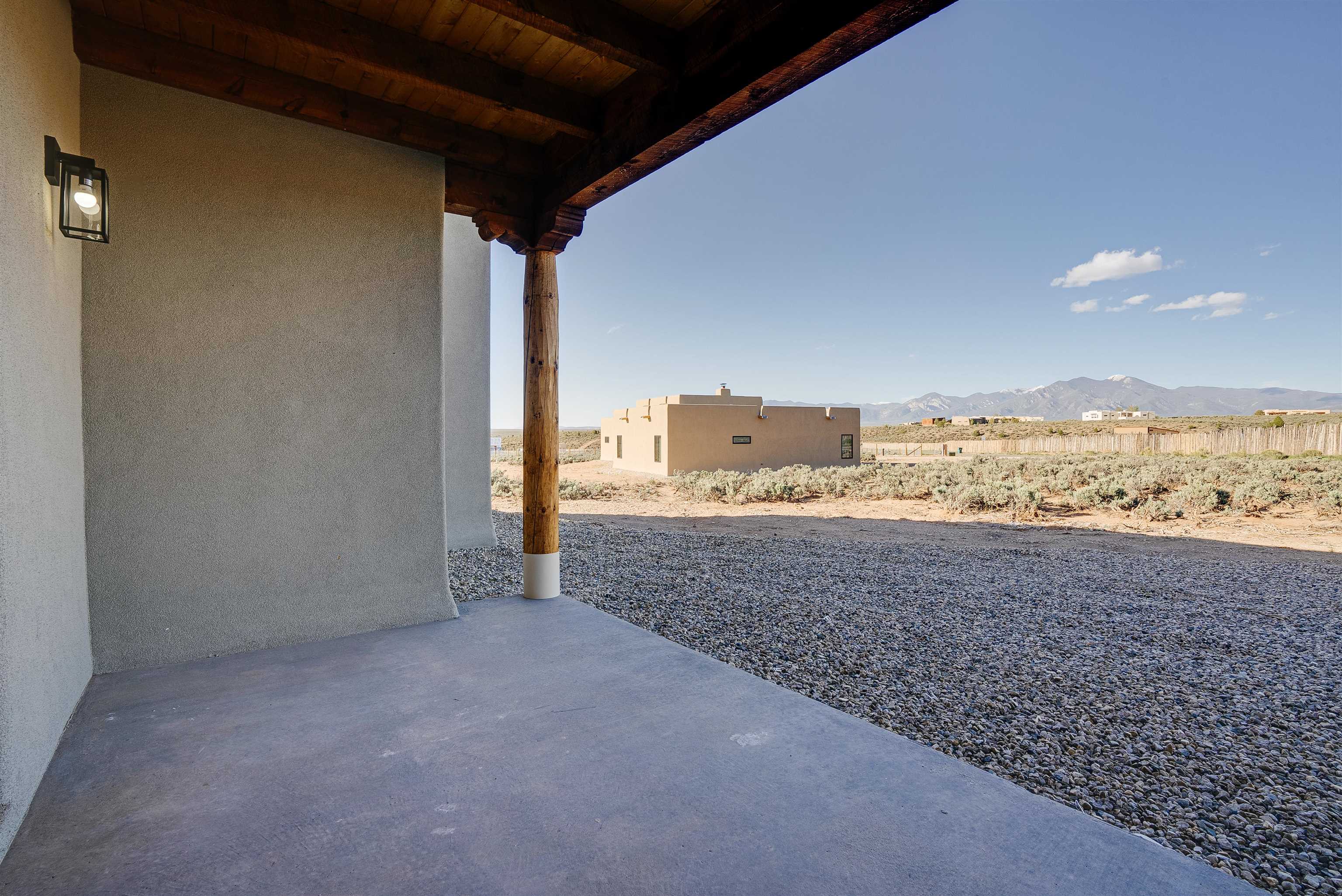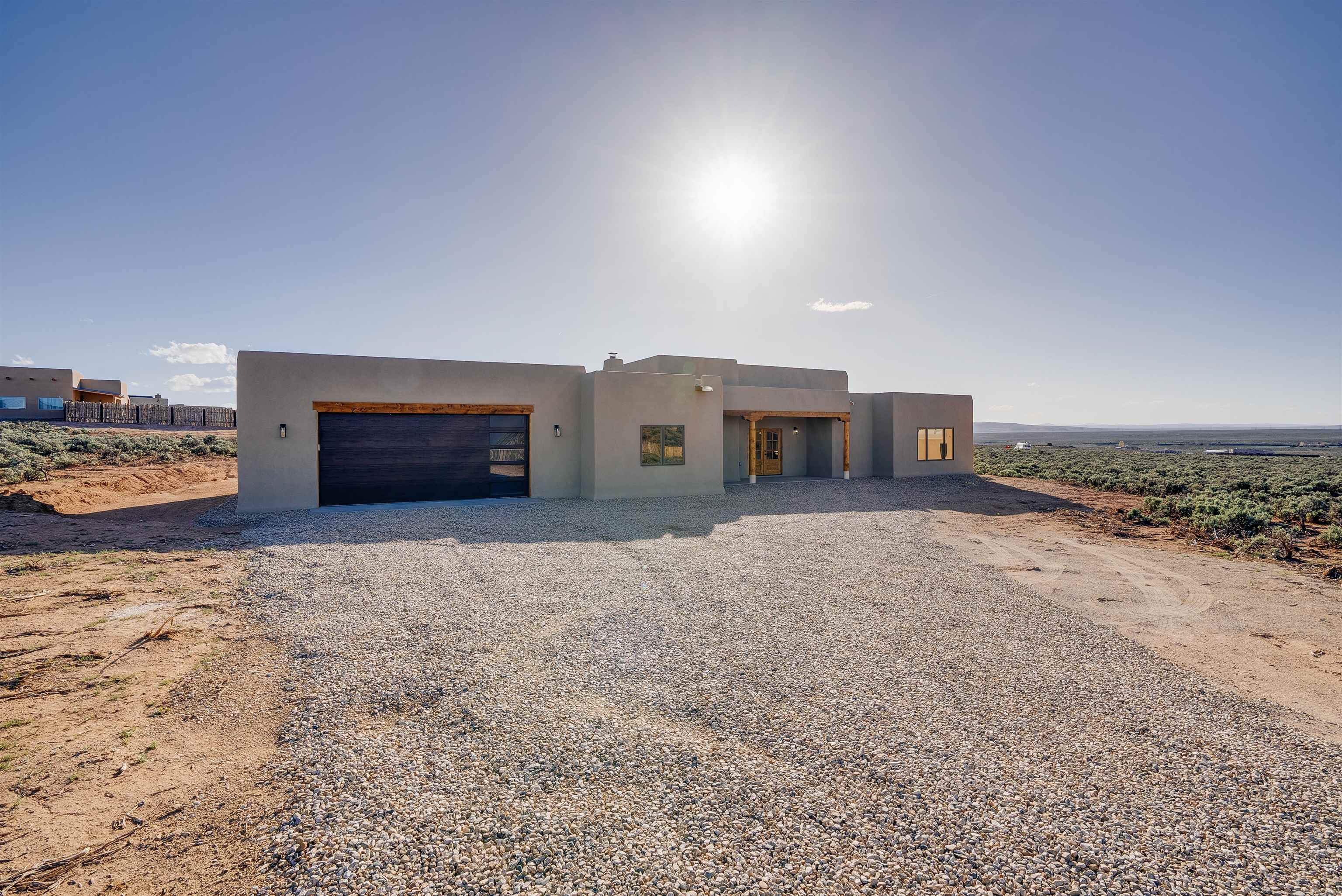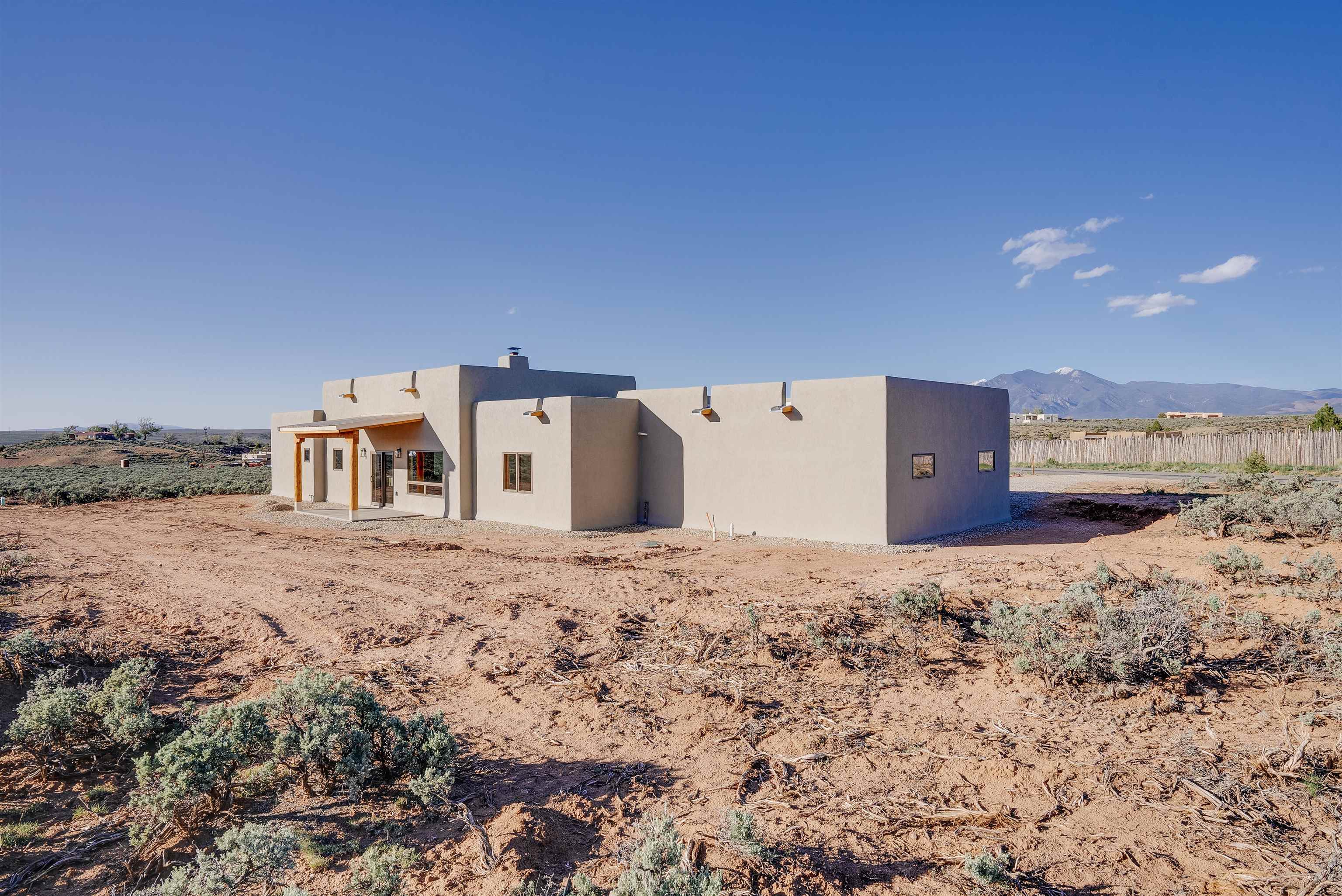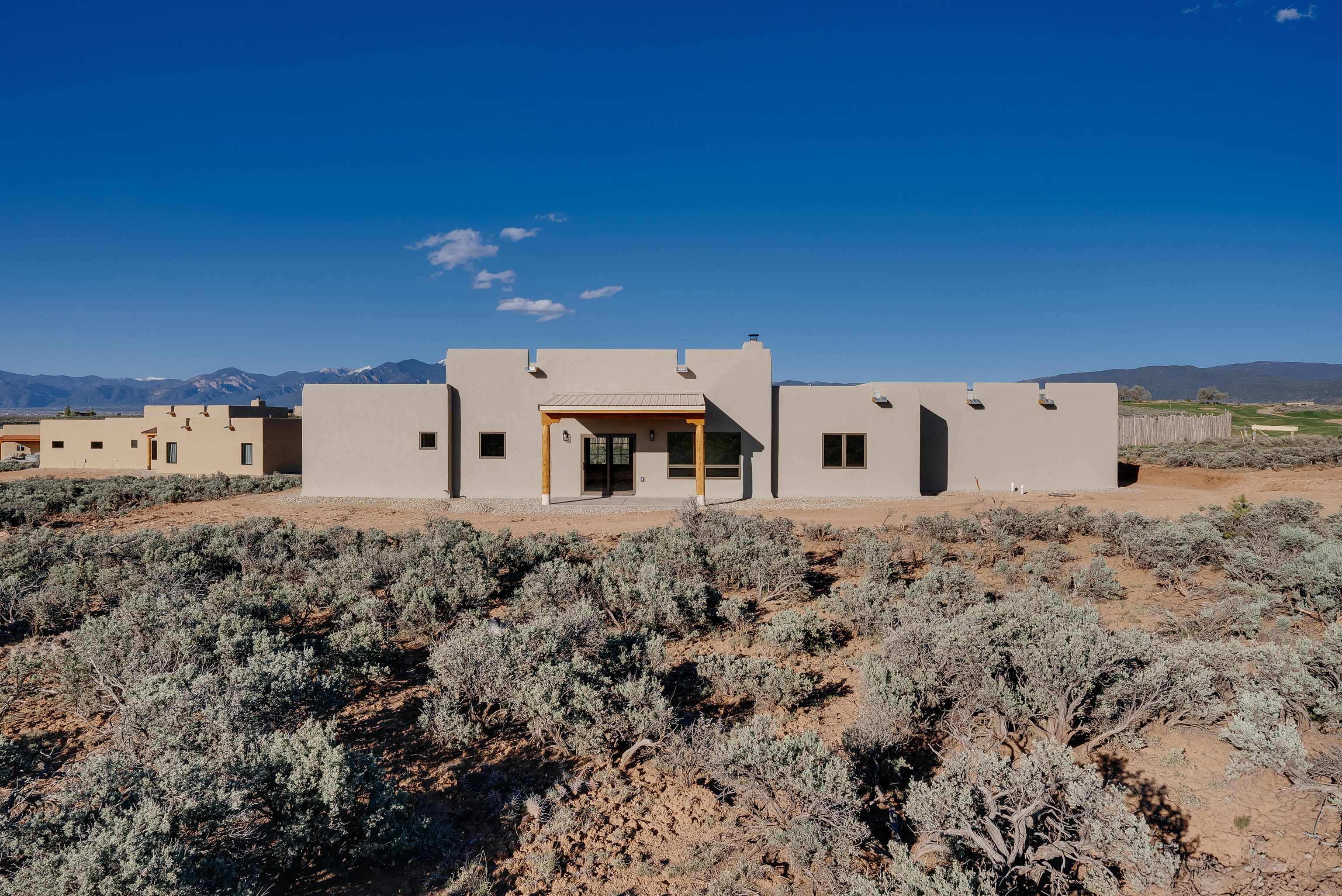 Nestled in a tranquil setting just off the pavement and adjacent to the renowned Taos Country Club, this brand-new 3-bedroom, 2-bathroom home offers the perfect blend of modern luxury and Southwestern charm. With a spacious 2-car garage and expansive floor plan, this residence is designed for both comfort and style. Enjoy the benefits of a newly built home with contemporary finishes and energy-efficient design. The open kitchen boasts sleek granite countertops, complemented by stainless steel appliances and custom cabinetry. Architectural details such as vigas and a cozy fireplace in the living room enhance the home's Southwestern appeal. The primary suite features a generous walk-in shower. Located near the Taos Rift Trail, with easy access to hiking and biking trails, perfect for outdoor enthusiasts. Revel in breathtaking views of the Taos Mountains from various vantage points within the home. This property is ideal for those seeking a serene lifestyle with proximity to recreational activities and the charm of Taos living.