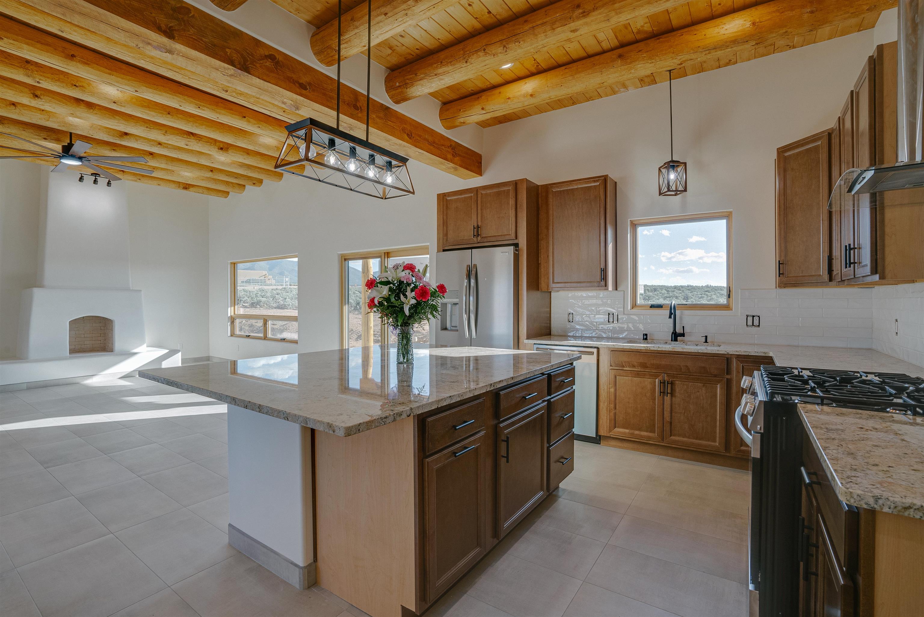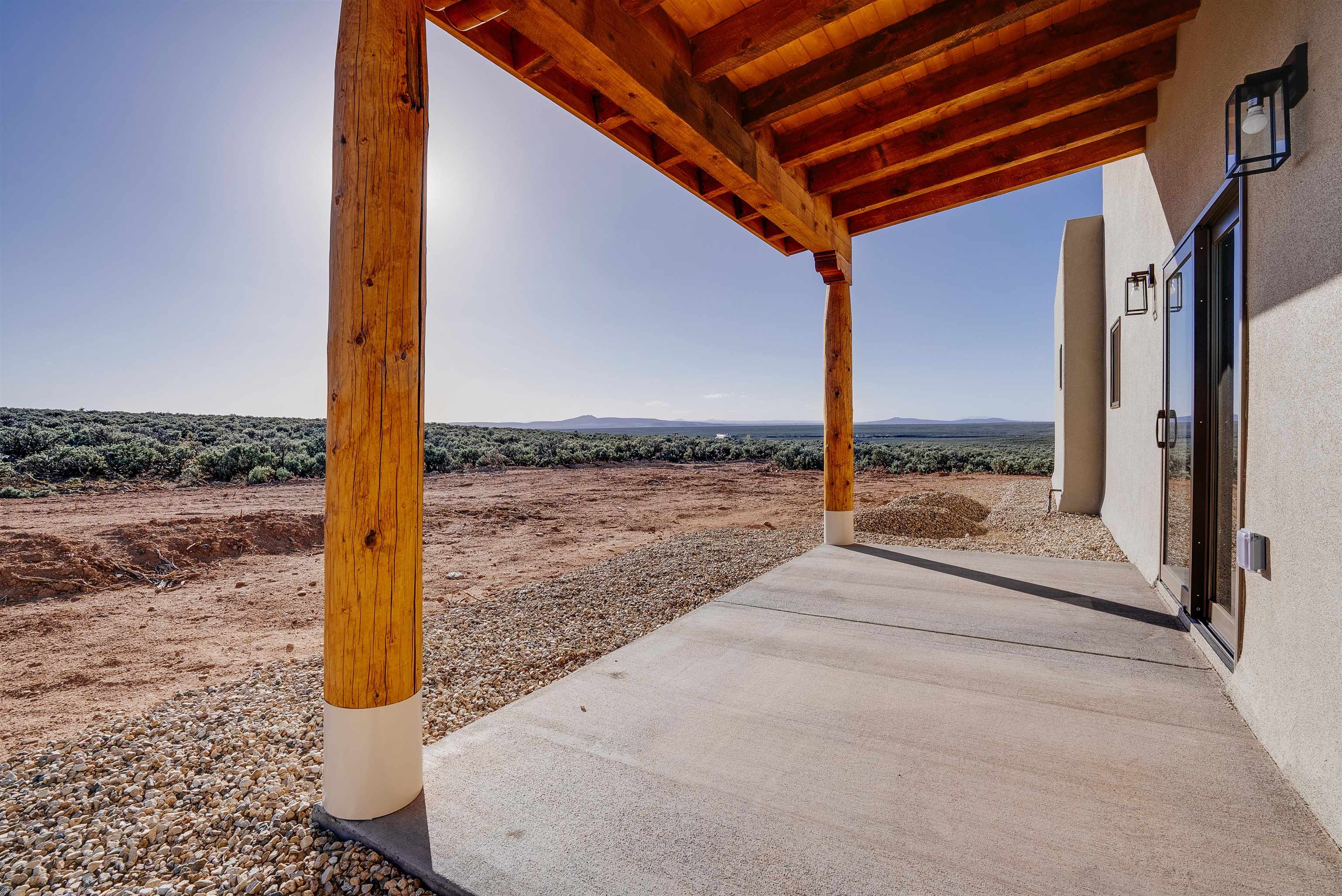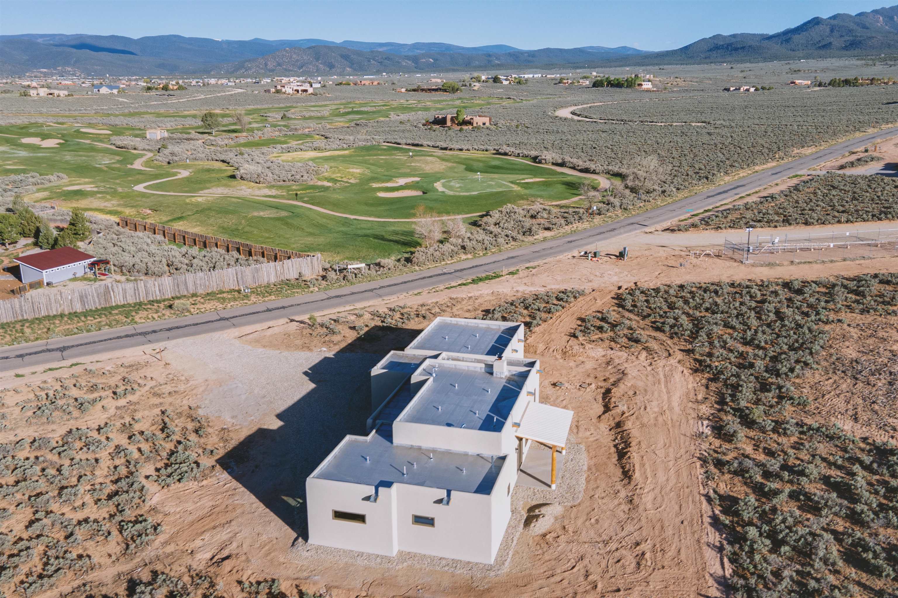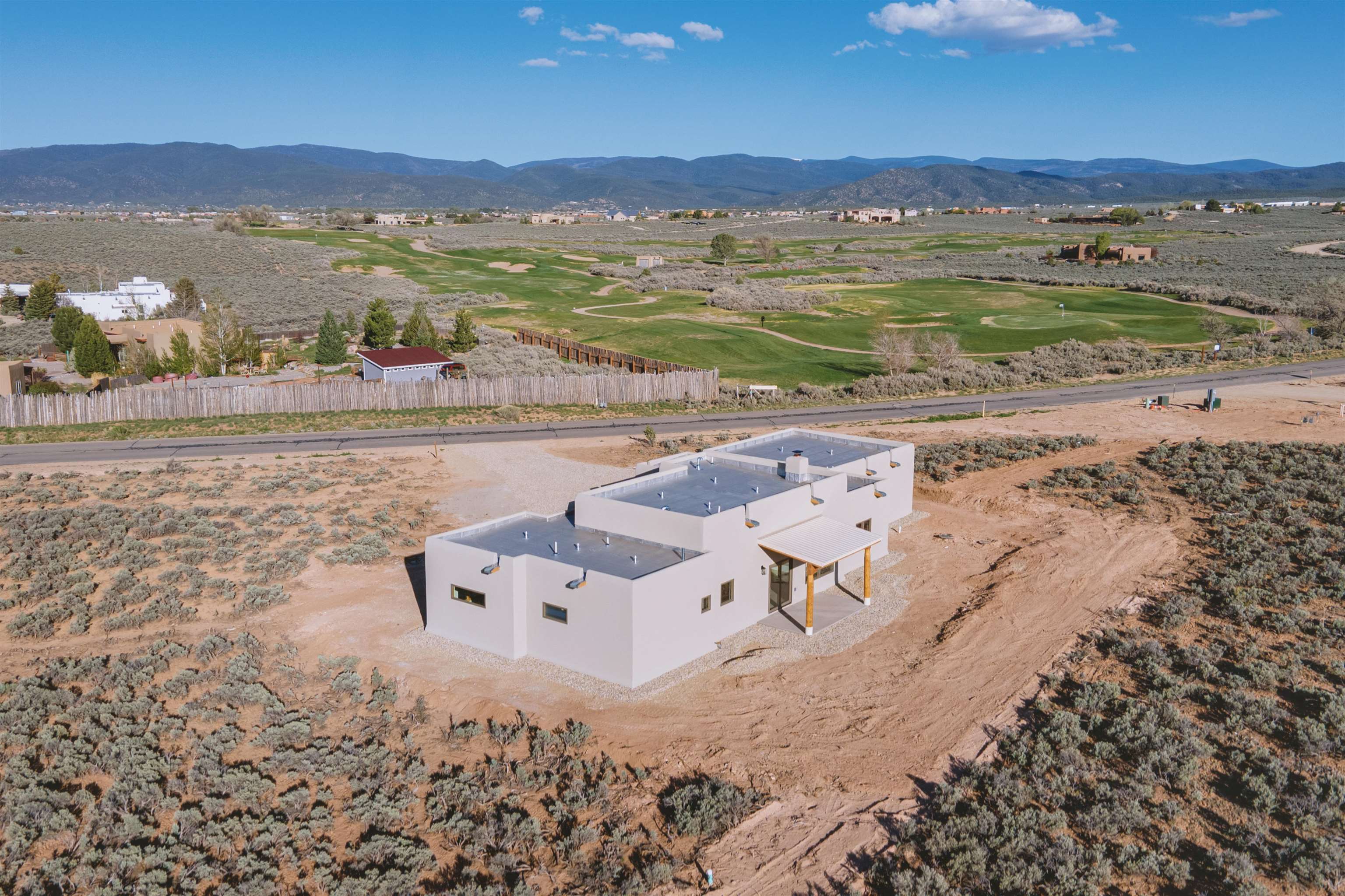Nestled in a tranquil setting just off the pavement and adjacent to the renowned Taos Country Club, this brand-new 3-bedroom, 2-bathroom home offers the perfect blend of modern luxury and Southwestern charm. With a spacious 2-car garage and expansive floor plan, this residence is designed for both comfort and style. Enjoy the benefits of a newly built home with contemporary finishes and energy-efficient design. The open kitchen boasts sleek granite countertops, complemented by stainless steel appliances and custom cabinetry. Architectural details such as vigas and a cozy fireplace in the living room enhance the home's Southwestern appeal. The primary suite features a generous walk-in shower. Located near the Taos Rift Trail, with easy access to hiking and biking trails, perfect for outdoor enthusiasts. Revel in breathtaking views of the Taos Mountains from various vantage points within the home. This property is ideal for those seeking a serene lifestyle with proximity to recreational activities and the charm of Taos living.