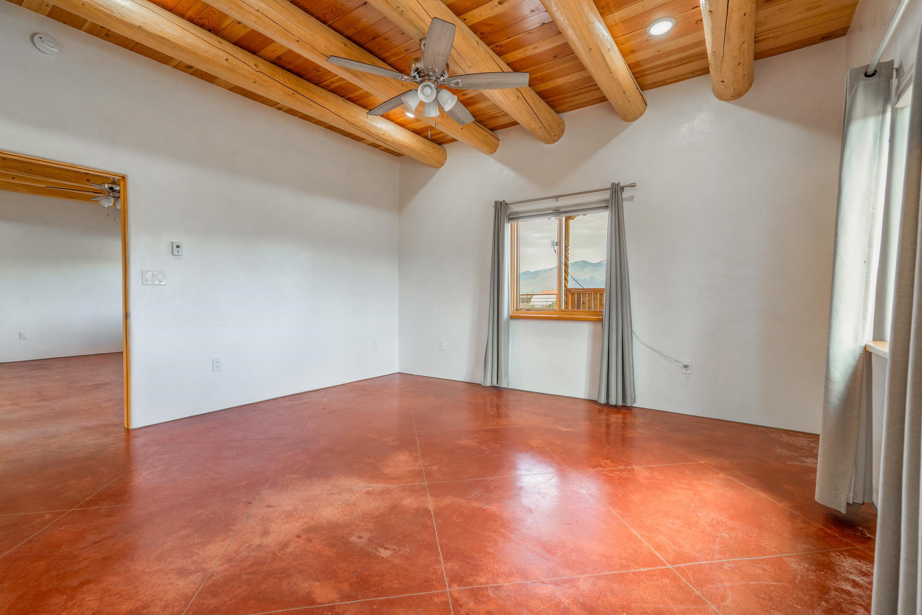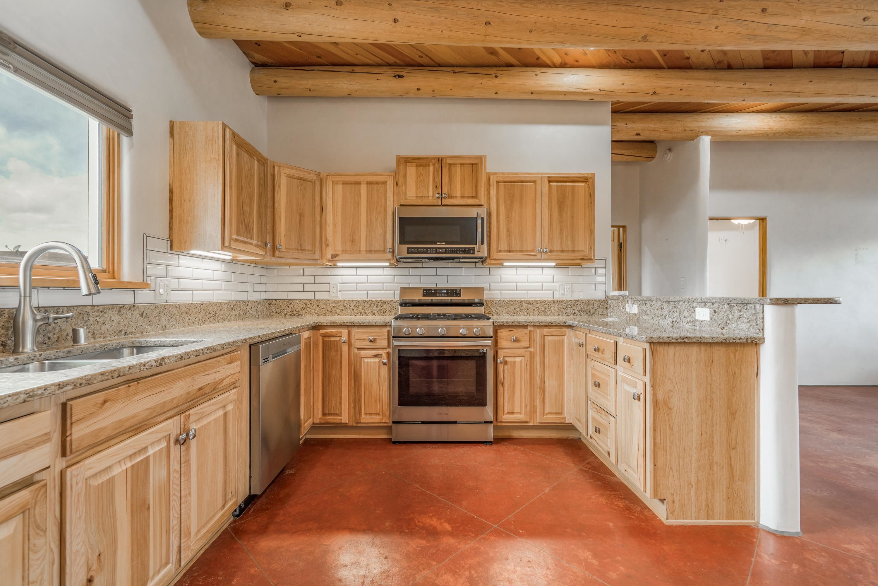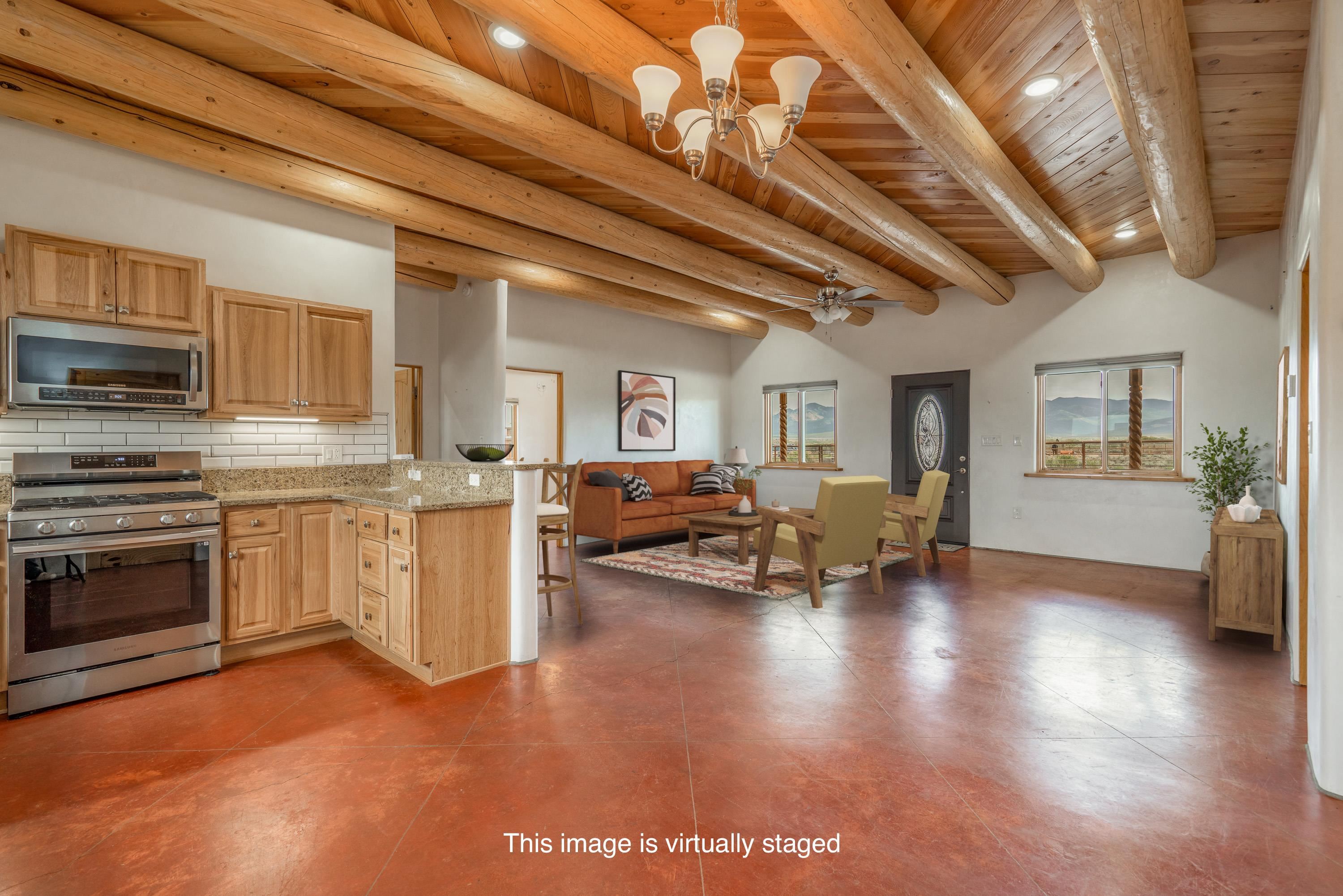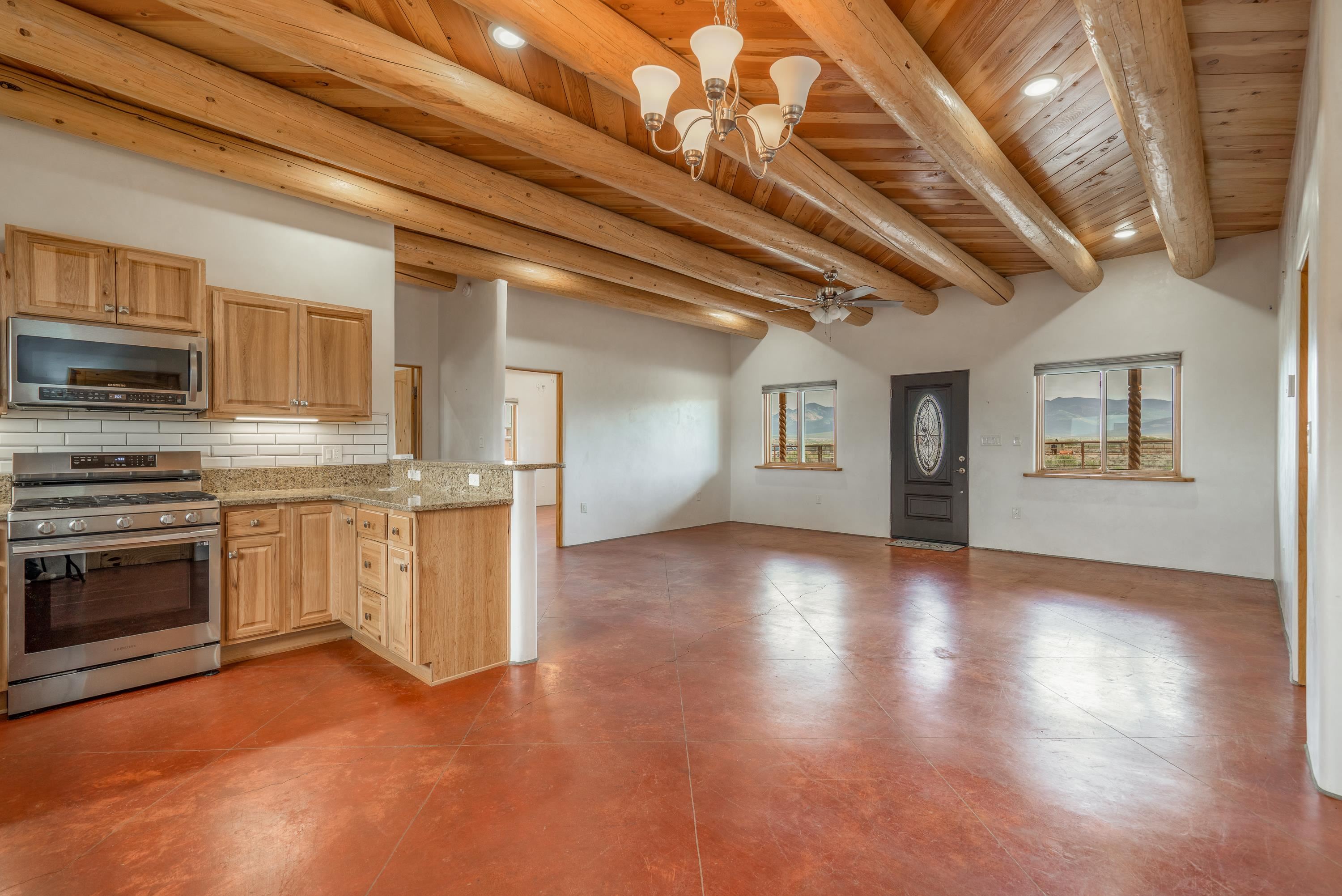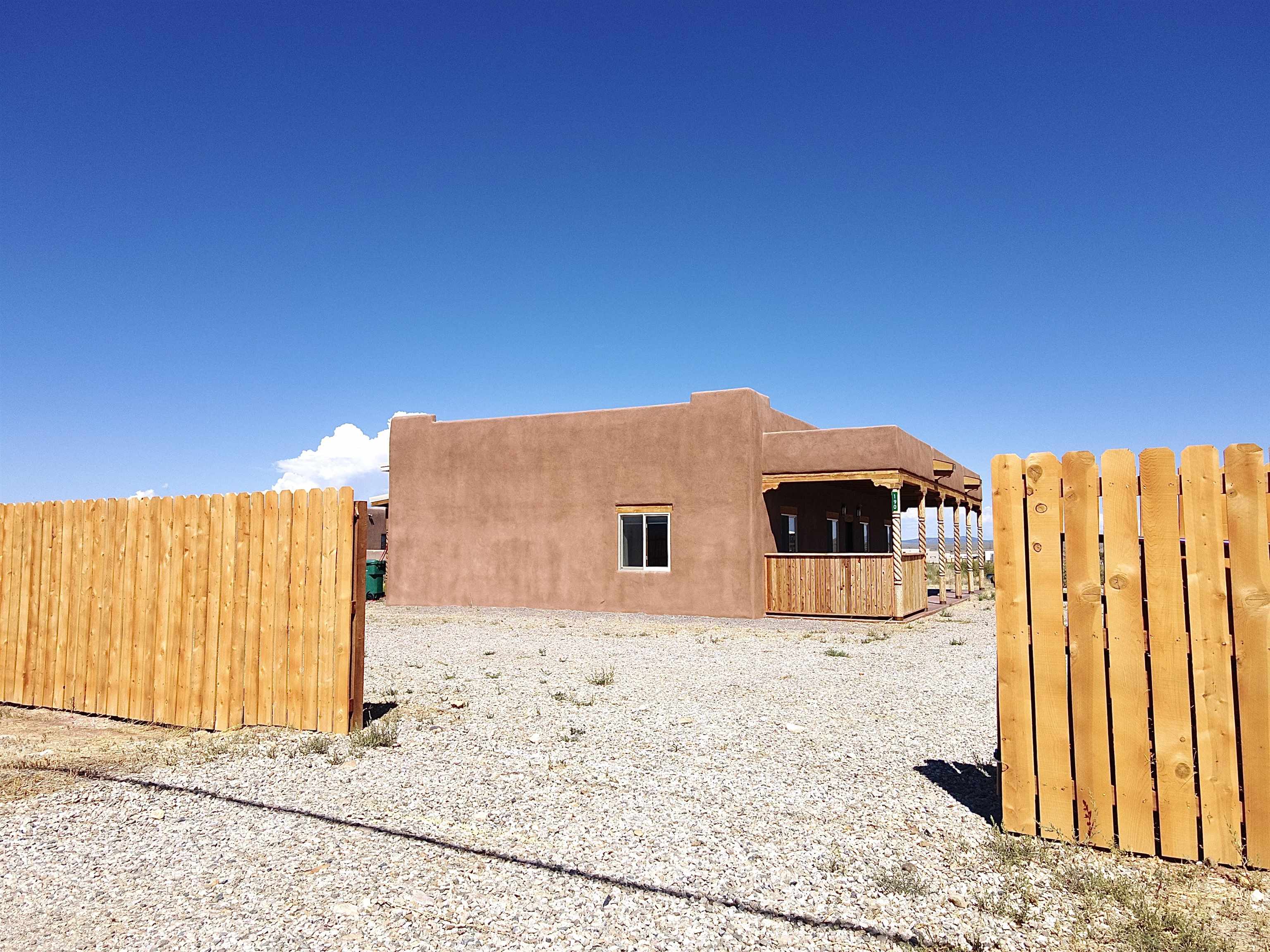 PRICE IMPROVEMENT! Newer homes with this level of finish don’t come around often. Sitting on just under an acre, this home brings real bang for the buck! - diamond plaster walls, vigas with tongue-and-groove ceilings (yes, even in the closets), granite counters, etched concrete floors, and wood-clad windows. The layout makes sense: primary suite on one side, two bedrooms on the other, and a spacious living area in between. At 1,527 sq ft, there’s room for real furniture, real people, and real-life living. The kitchen lacks nothing, with stainless appliances, granite counters, a big sink, and a picture window that frames the Picuris Mountains. The primary suite has a semi walk-in closet, double vanity, walk-in shower with glass enclosure, and built-ins. The second bath has a soaking tub, because sometimes you just need one. There’s a full-length covered front portal (of course, with mountain views, and it is BIG), plus another covered patio out back. The dedicated laundry room comes with built-in cabinetry—perfect for stashing all the random stuff that somehow ends up everywhere else in the house. Radiant in-floor heating, powered by an on-demand natural gas tankless water heater, paired with solid insulation, means you’ll have time each month for more than just working and paying the utility bills. The home is on septic, connected to a private well, and includes a water softener system. Kit Carson fiber optic internet keeps everything running fast—even when multiple kids are online sucking up all the bandwidth with their latest video gameS. In addition to fiber, Xfinity cable internet and tv are also wired to the home; more choices and redundancy for the home owner! A new fence has been installed for further privacy between the home and the access road! A concrete pad in the driveway is ready for parking, projects, or pickup basketball. The 10x12 shed with extra storage out back seals the deal. Paved access all the way—no mud, no ruts, no nonsense. Just a solid, stylish, low-maintenance home with zero surprises.