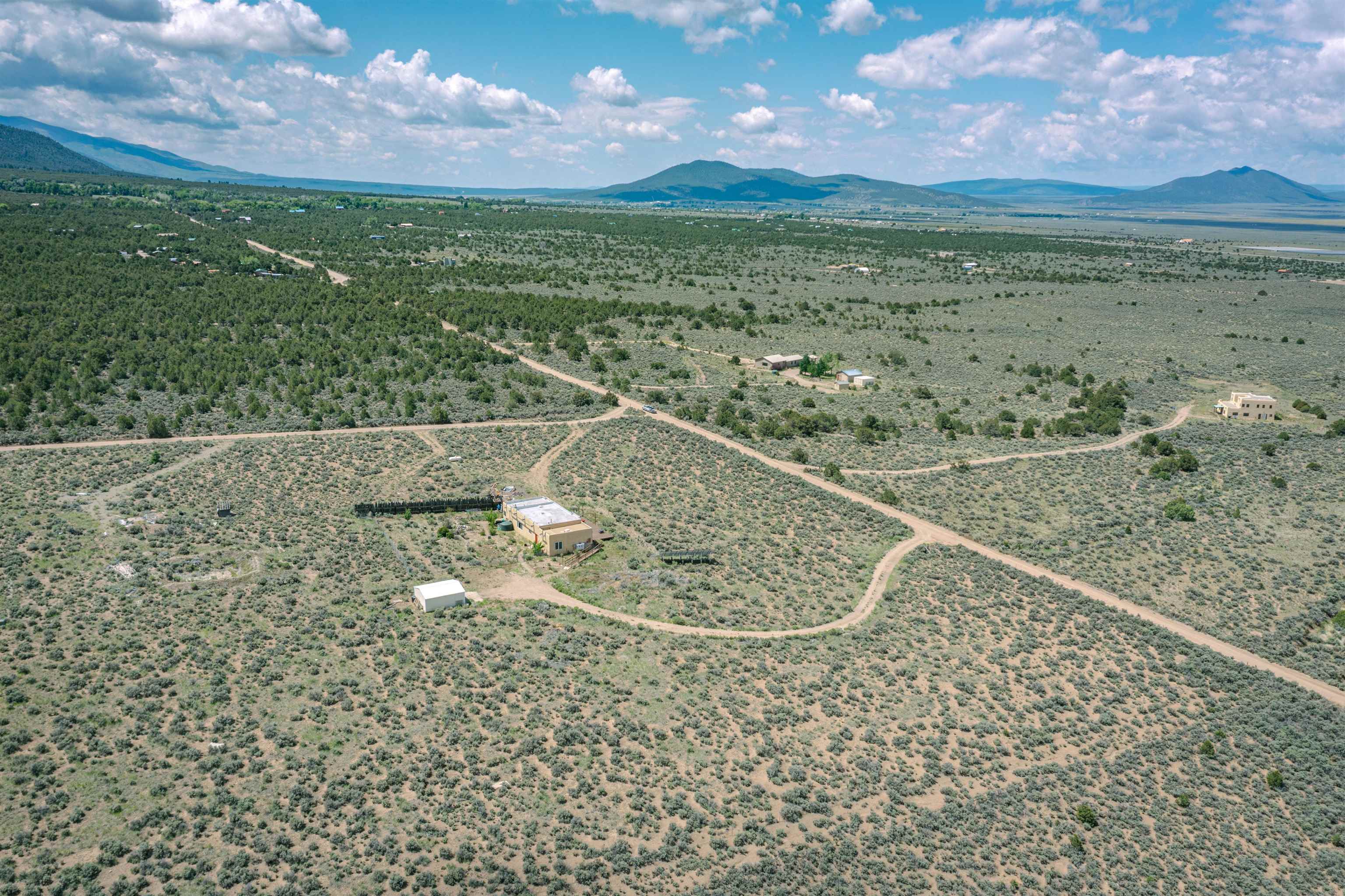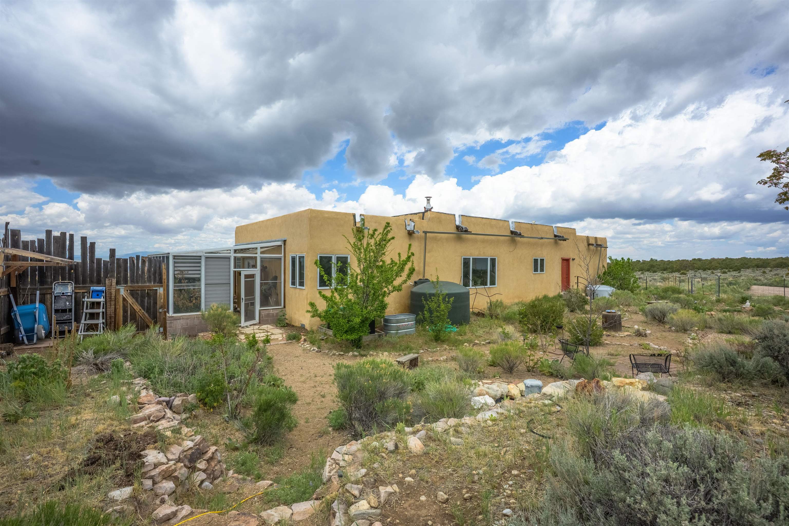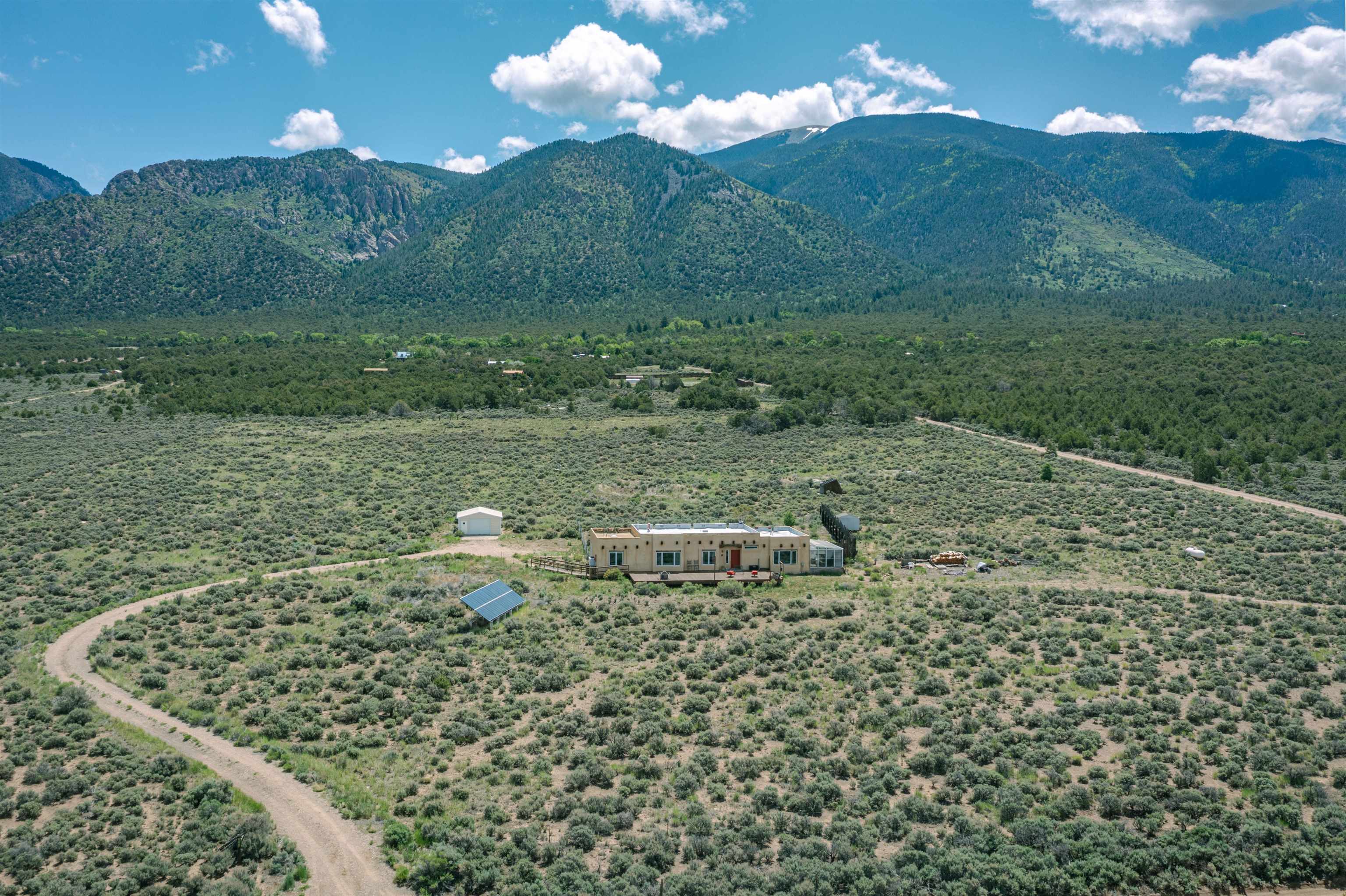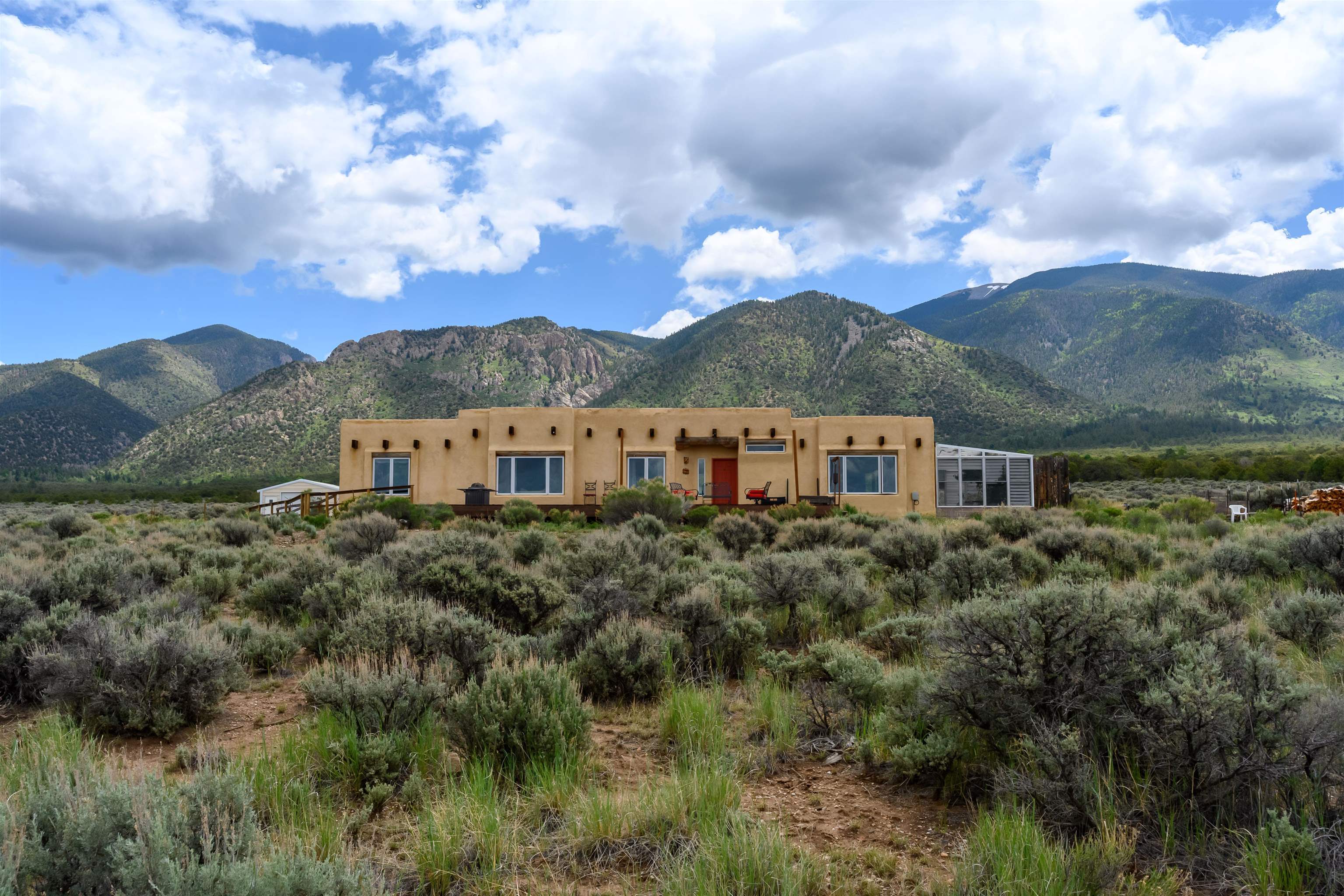 Escape to 8 acres of unparalleled solitude and serenity at the base of the stunning Latir cliffs. This unique property, located just north of Questa in the heart of the famous Taos sage, offers profound peace with breathtaking views in every direction. Greet the day with sunrise over the Latirs to the east and enjoy expansive views of Ute Mountain and San Antonio Mountain to the north. This well-maintained, single-level home is designed for comfort and sustainability. A photovoltaic solar array provides backup to your most essential conveniences, and a private well is complemented by an extensive water catchment system that nourishes fruit trees and gardens. Inside, the home is flooded with natural light, with views from every window. The fairly open living, kitchen, and dining areas offer a sense of connection while maintaining a separation of space. A welcoming indoor planter greets you at the entry, and a cozy kiva fireplace with an insert anchors the living area. The 3-bedroom, 2-bathroom layout includes a master suite with a unique greenhouse, providing passive solar heat and a beautiful wash of natural light. Step outside onto the large deck to witness spectacular sunsets over the vast Taos Mesa and Cerro de la Olla to the west. A detached garage provides ample space for vehicles and storage. Experience true tranquility in this thoughtfully designed 1996 off-site built home, where sustainable living meets the raw beauty of Northern New Mexico.