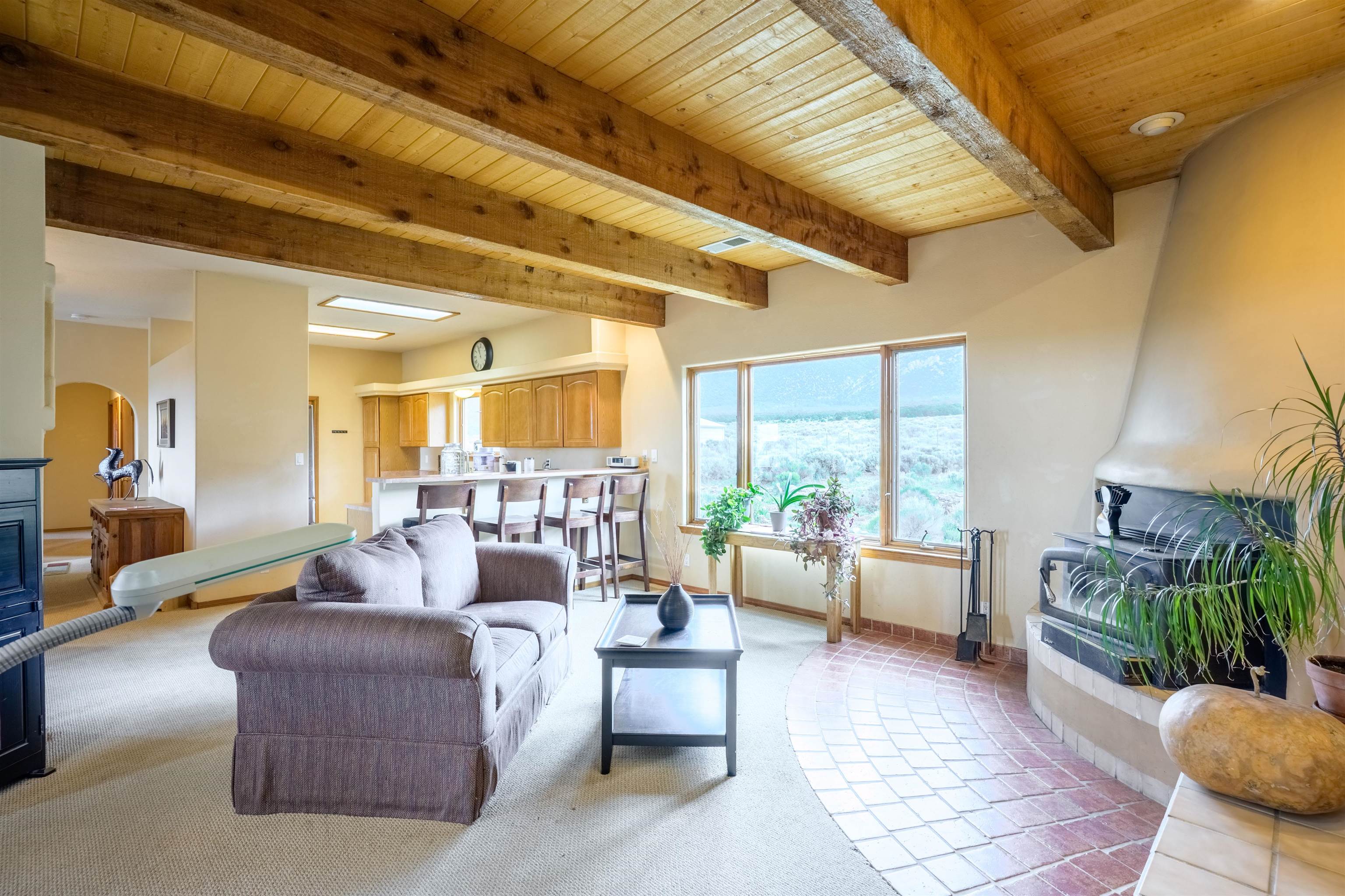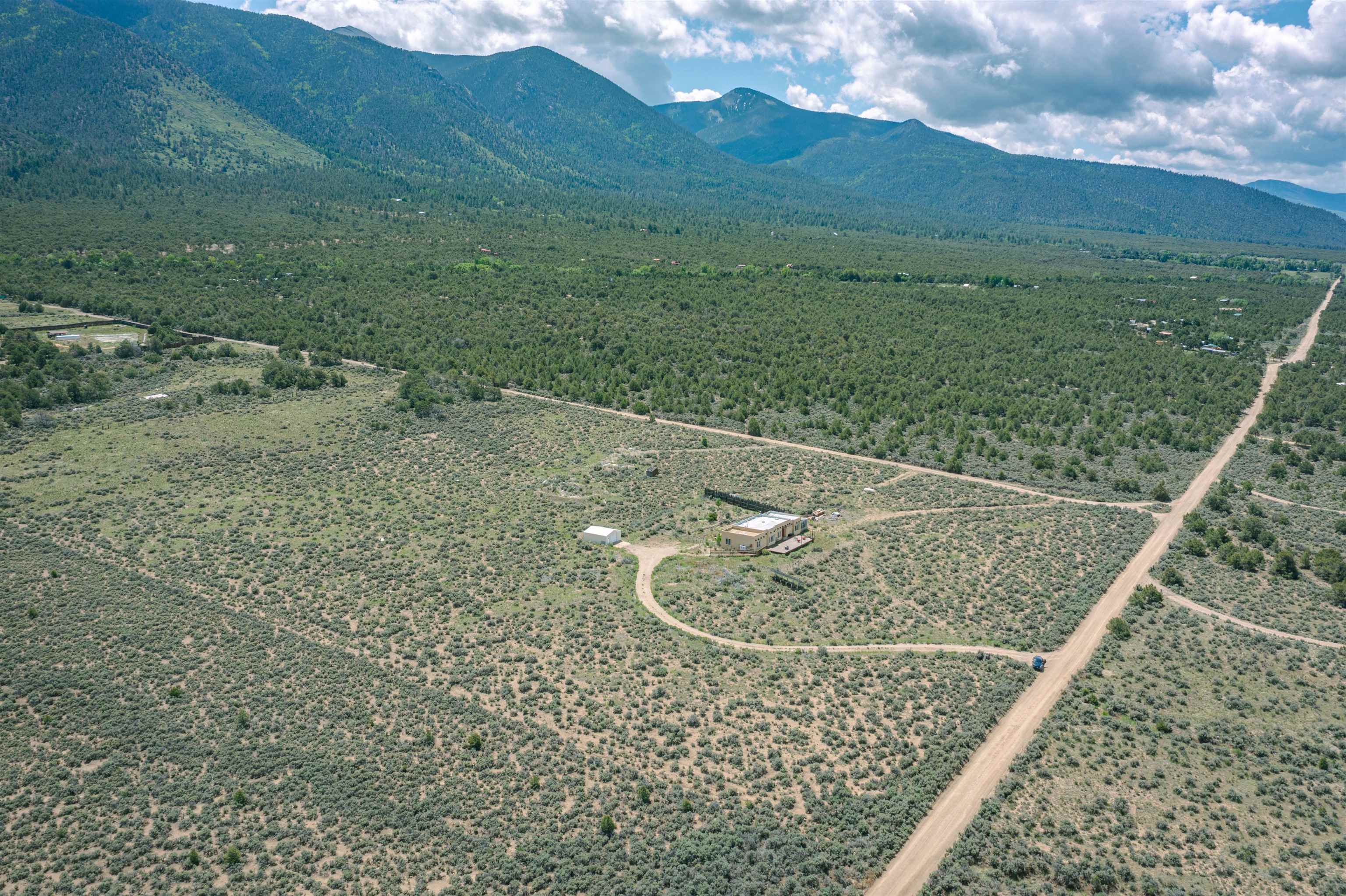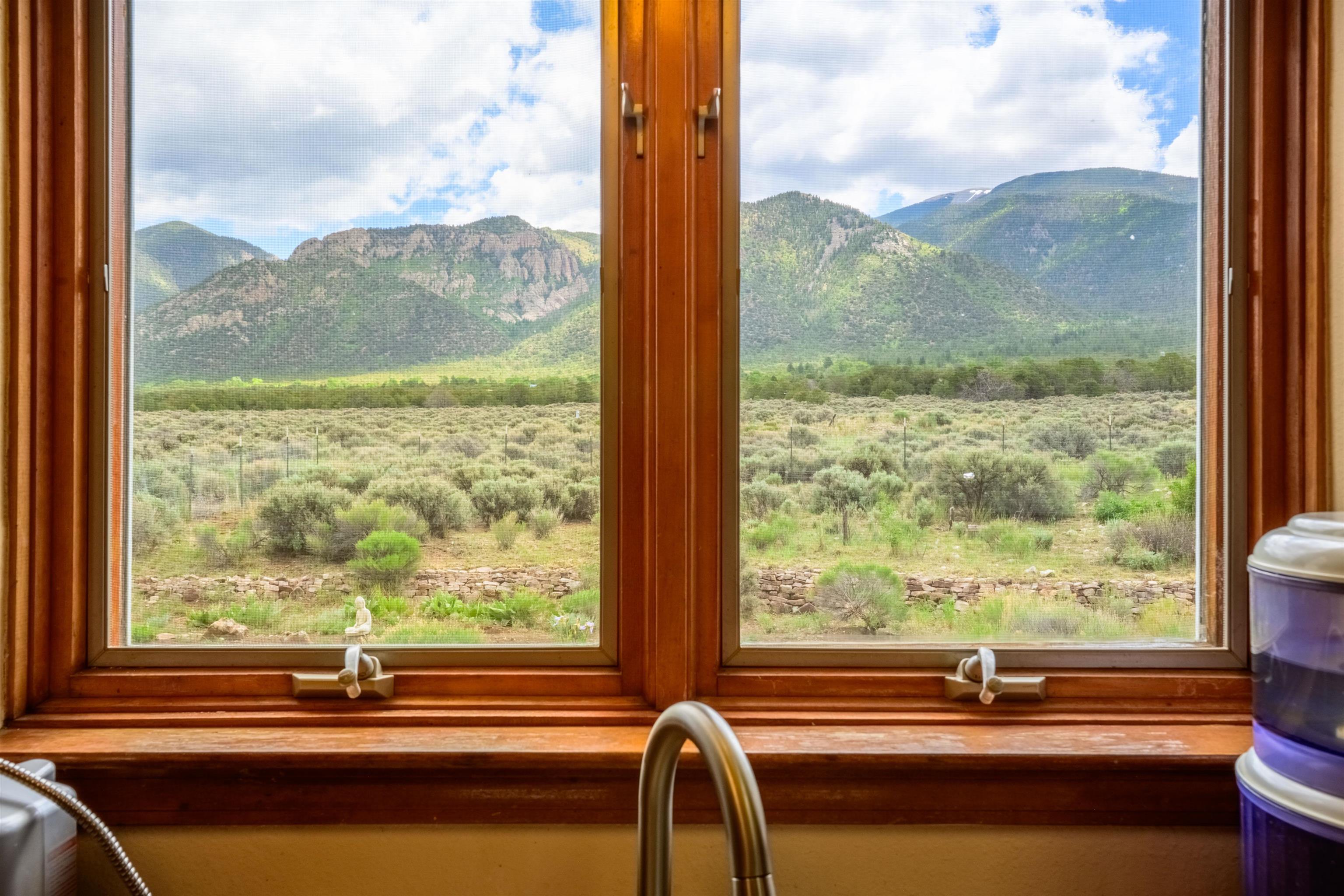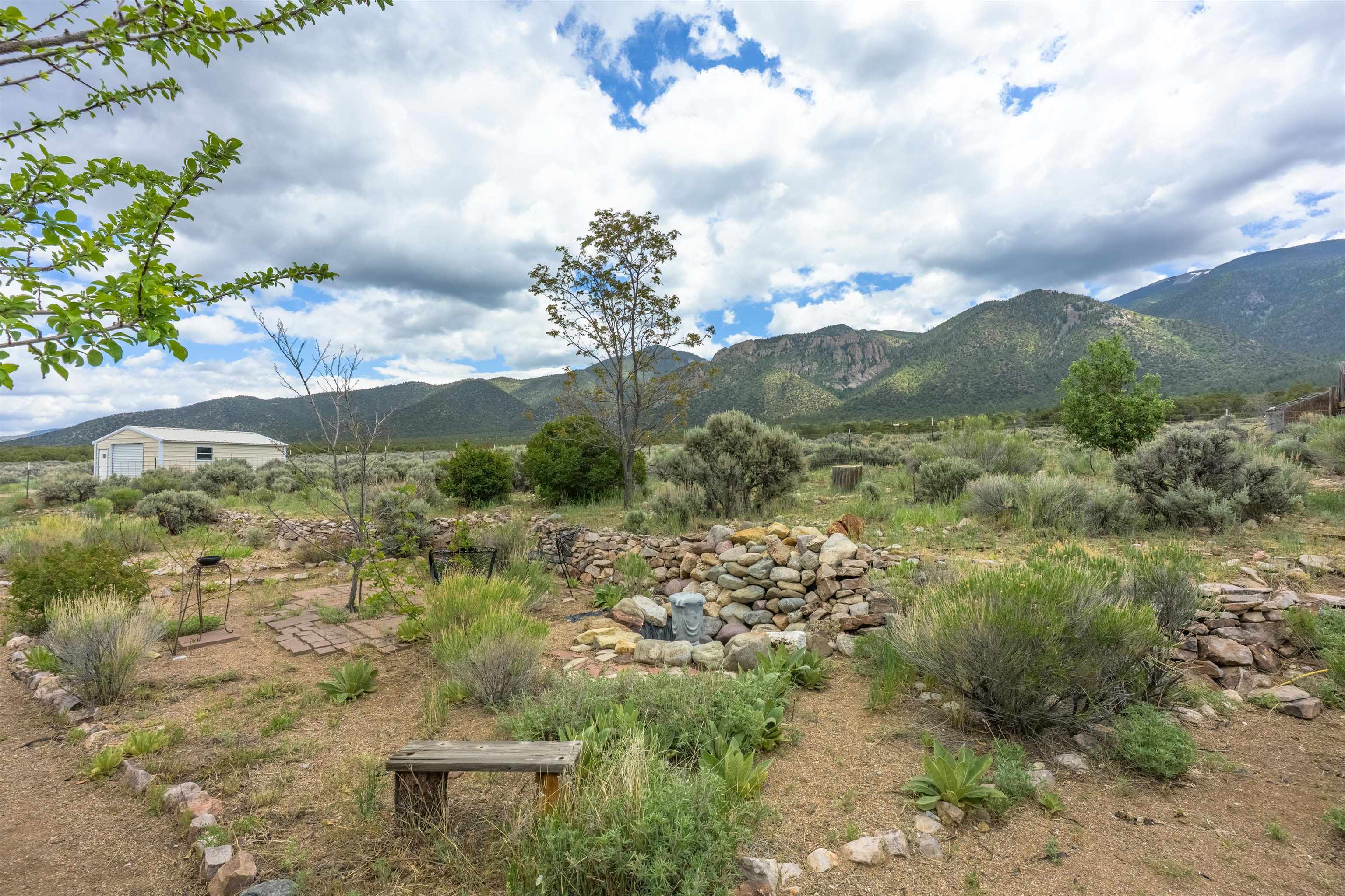 Escape to 8 acres of unparalleled solitude and serenity at the base of the stunning Latir cliffs. This unique property, located just north of Questa in the heart of the famous Taos sage, offers profound peace with breathtaking views in every direction. Greet the day with sunrise over the Latirs to the east and enjoy expansive views of Ute Mountain and San Antonio Mountain to the north. This well-maintained, single-level home is designed for comfort and sustainability. A photovoltaic solar array provides backup to your most essential conveniences, and a private well is complemented by an extensive water catchment system that nourishes fruit trees and gardens. Inside, the home is flooded with natural light, with views from every window. The fairly open living, kitchen, and dining areas offer a sense of connection while maintaining a separation of space. A welcoming indoor planter greets you at the entry, and a cozy kiva fireplace with an insert anchors the living area. The 3-bedroom, 2-bathroom layout includes a master suite with a unique greenhouse, providing passive solar heat and a beautiful wash of natural light. Step outside onto the large deck to witness spectacular sunsets over the vast Taos Mesa and Cerro de la Olla to the west. A detached garage provides ample space for vehicles and storage. Experience true tranquility in this thoughtfully designed 1996 off-site built home, where sustainable living meets the raw beauty of Northern New Mexico.
