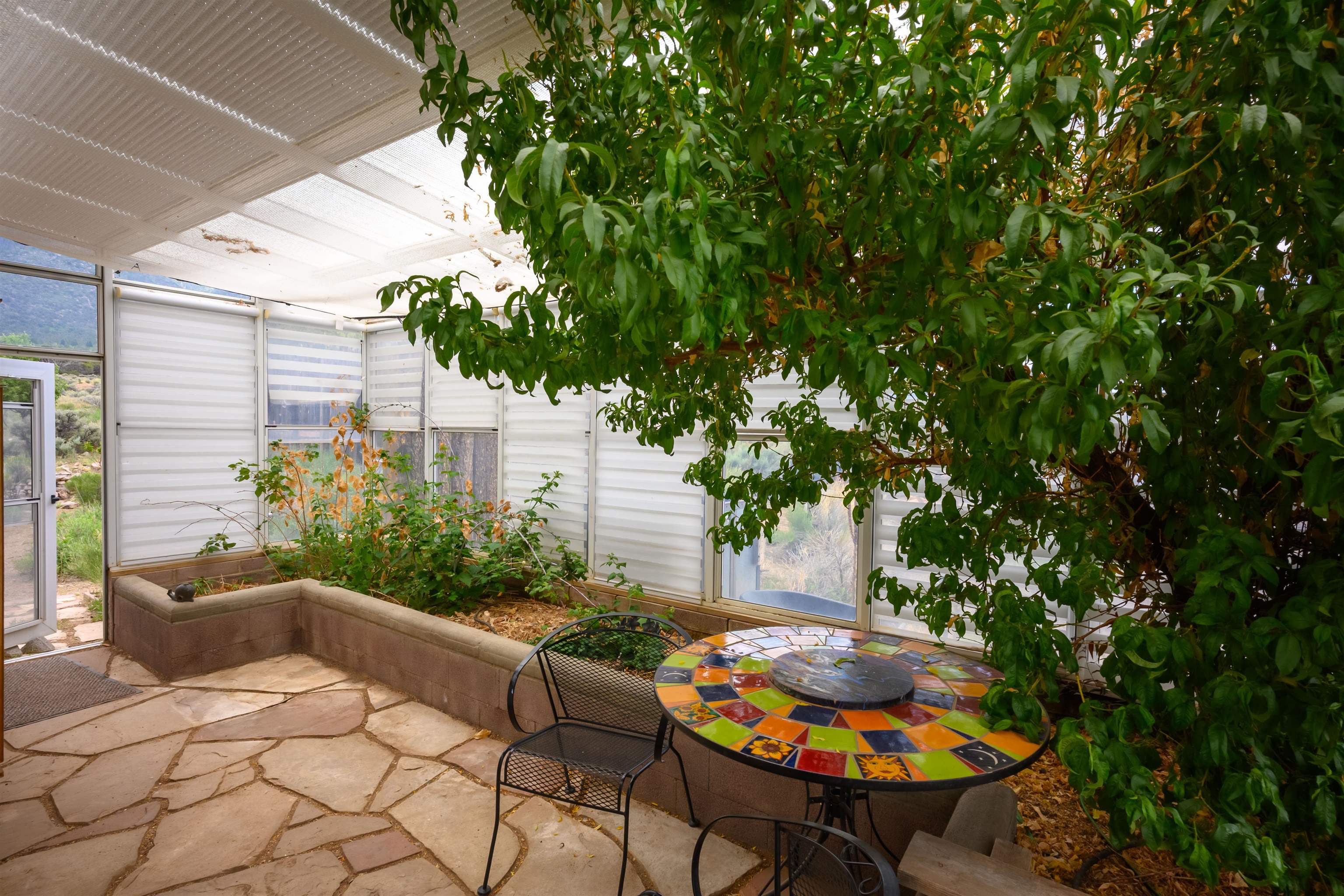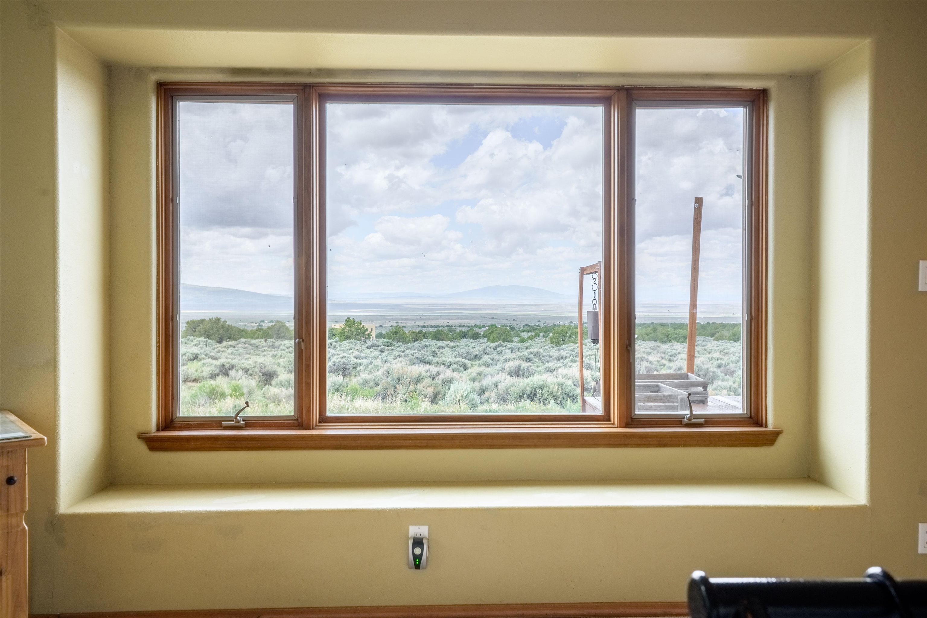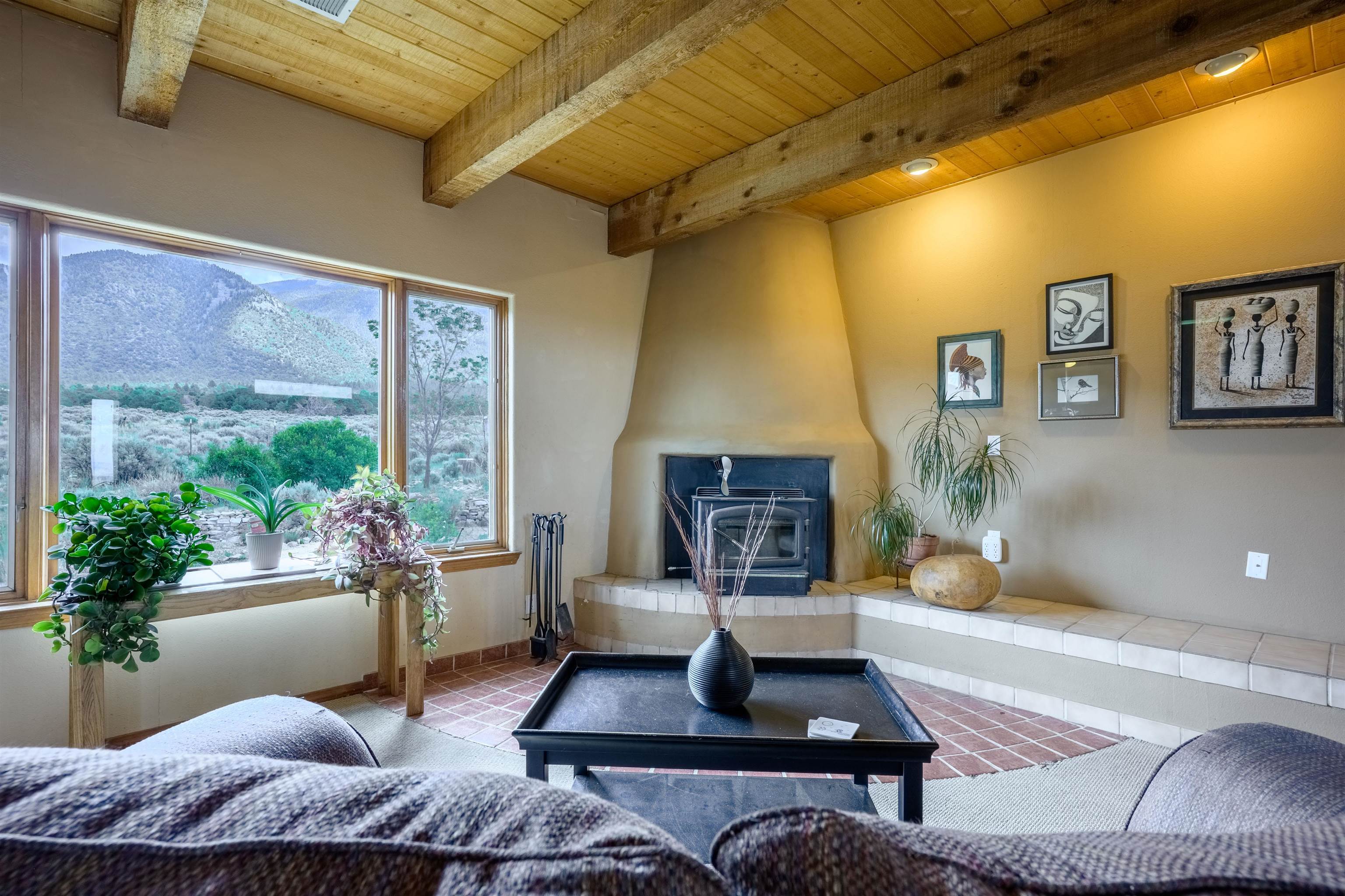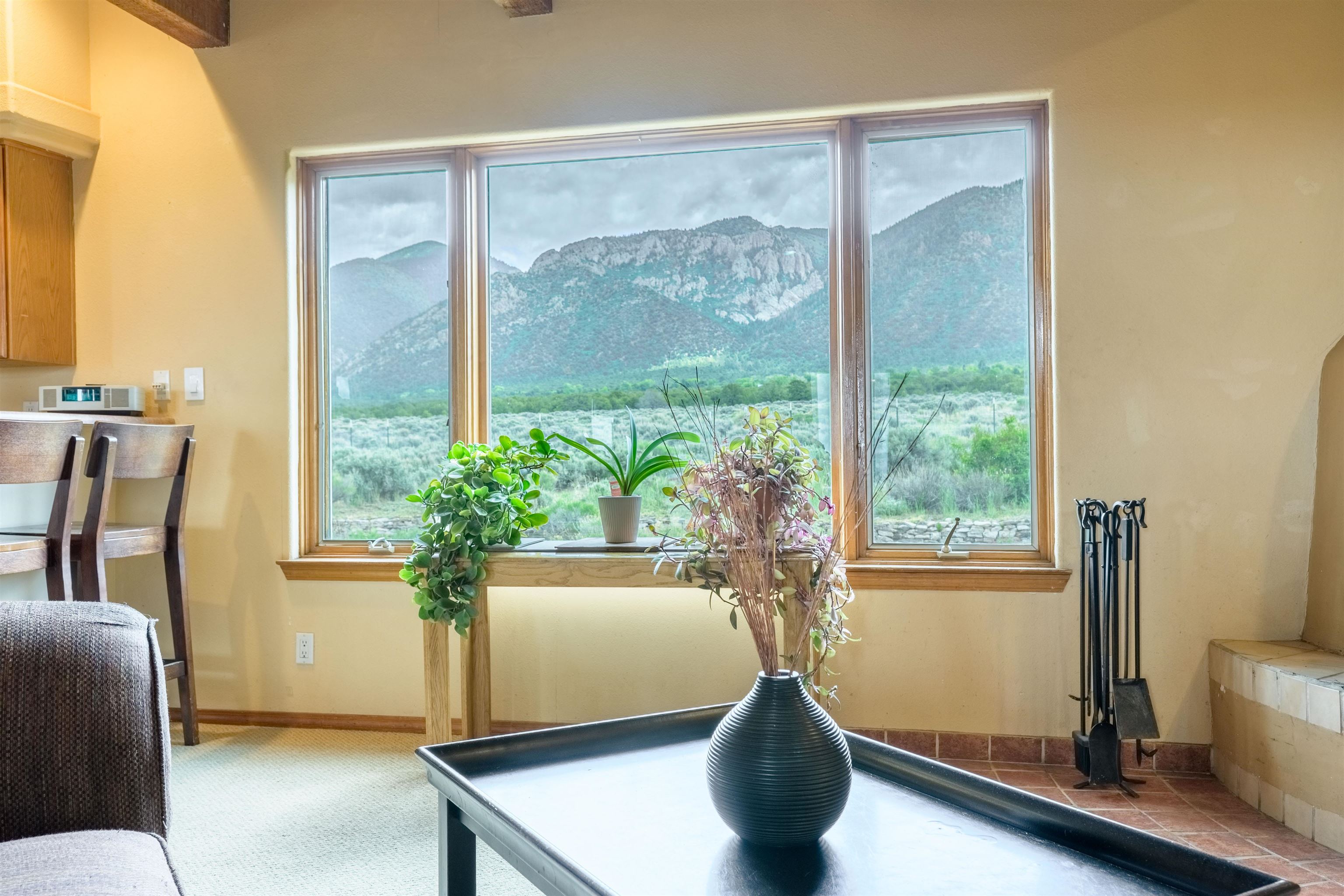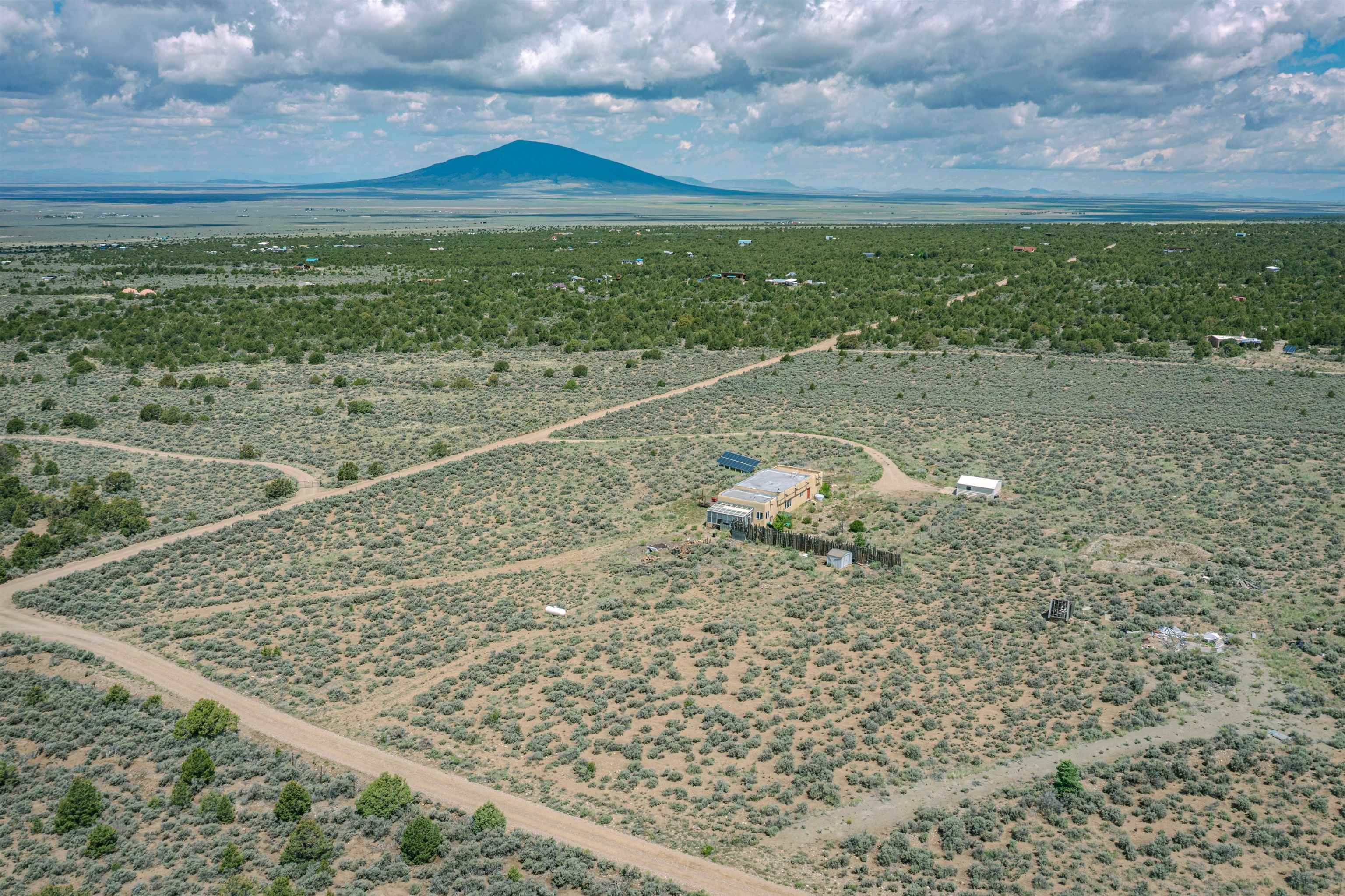Escape to 8 acres of unparalleled solitude and serenity at the base of the stunning Latir cliffs. This unique property, located just north of Questa in the heart of the famous Taos sage, offers profound peace with breathtaking views in every direction. Greet the day with sunrise over the Latirs to the east and enjoy expansive views of Ute Mountain and San Antonio Mountain to the north. This well-maintained, single-level home is designed for comfort and sustainability. A photovoltaic solar array provides backup to your most essential conveniences, and a private well is complemented by an extensive water catchment system that nourishes fruit trees and gardens. Inside, the home is flooded with natural light, with views from every window. The fairly open living, kitchen, and dining areas offer a sense of connection while maintaining a separation of space. A welcoming indoor planter greets you at the entry, and a cozy kiva fireplace with an insert anchors the living area. The 3-bedroom, 2-bathroom layout includes a master suite with a unique greenhouse, providing passive solar heat and a beautiful wash of natural light. Step outside onto the large deck to witness spectacular sunsets over the vast Taos Mesa and Cerro de la Olla to the west. A detached garage provides ample space for vehicles and storage. Experience true tranquility in this thoughtfully designed 1996 off-site built home, where sustainable living meets the raw beauty of Northern New Mexico.