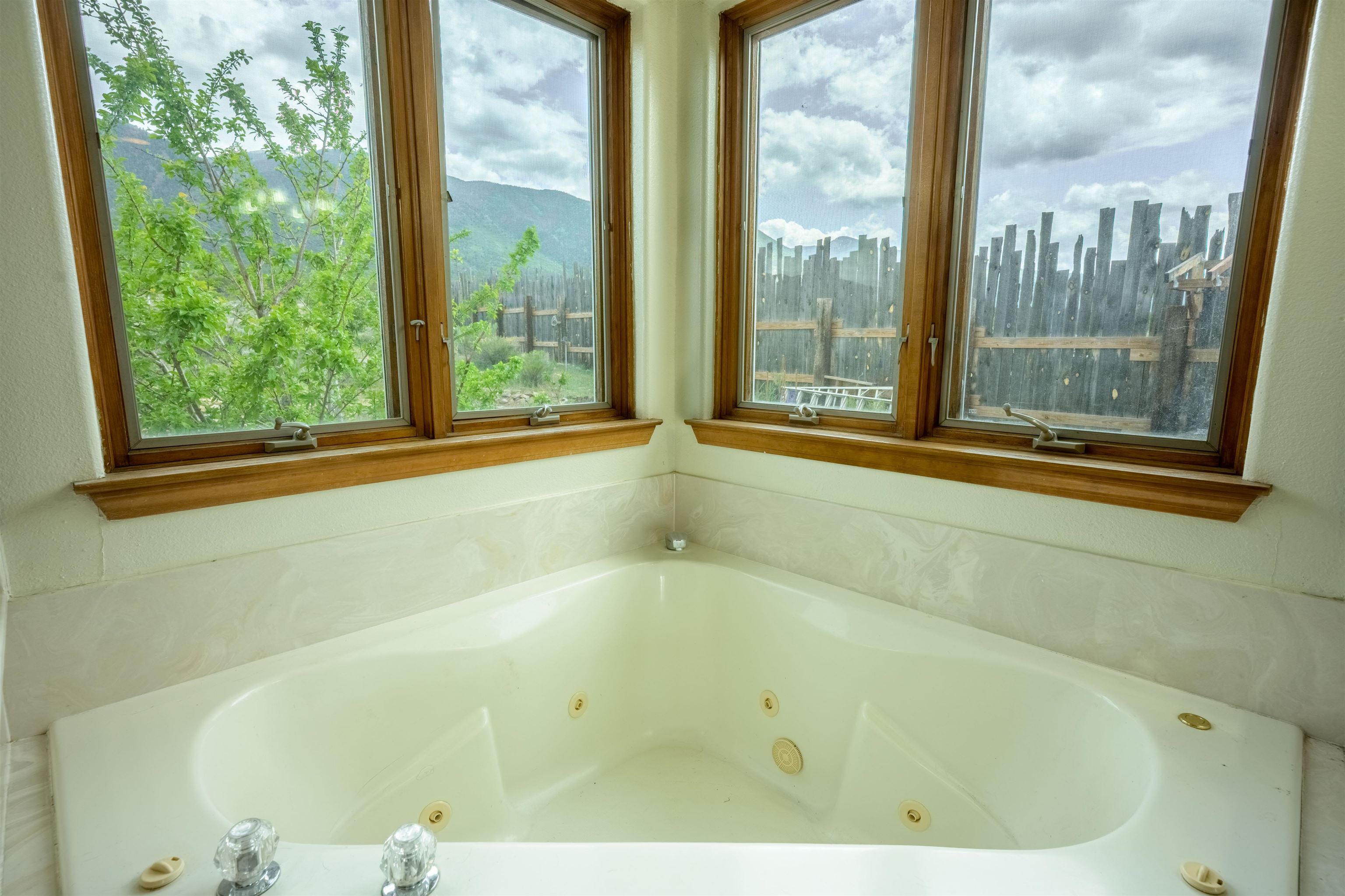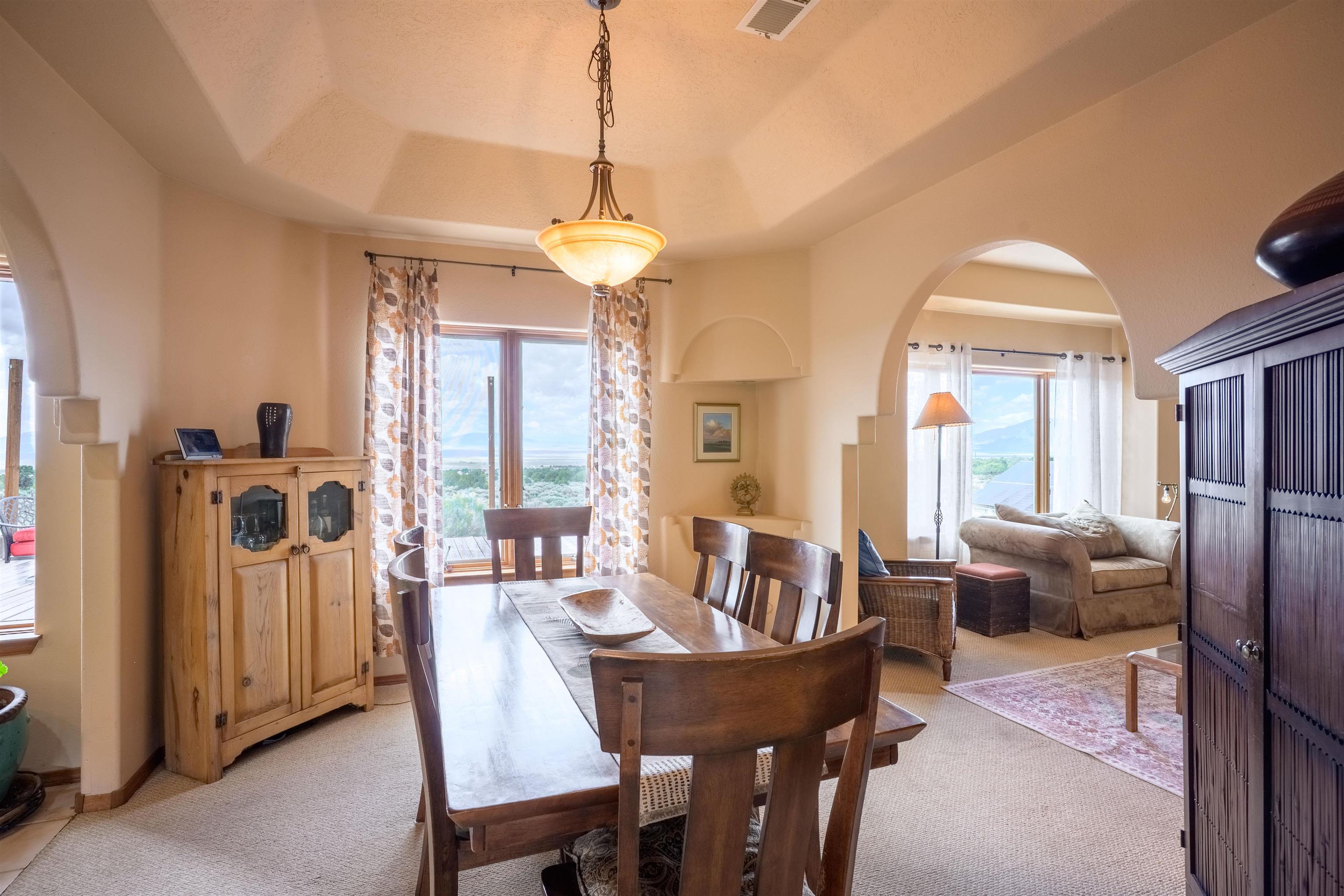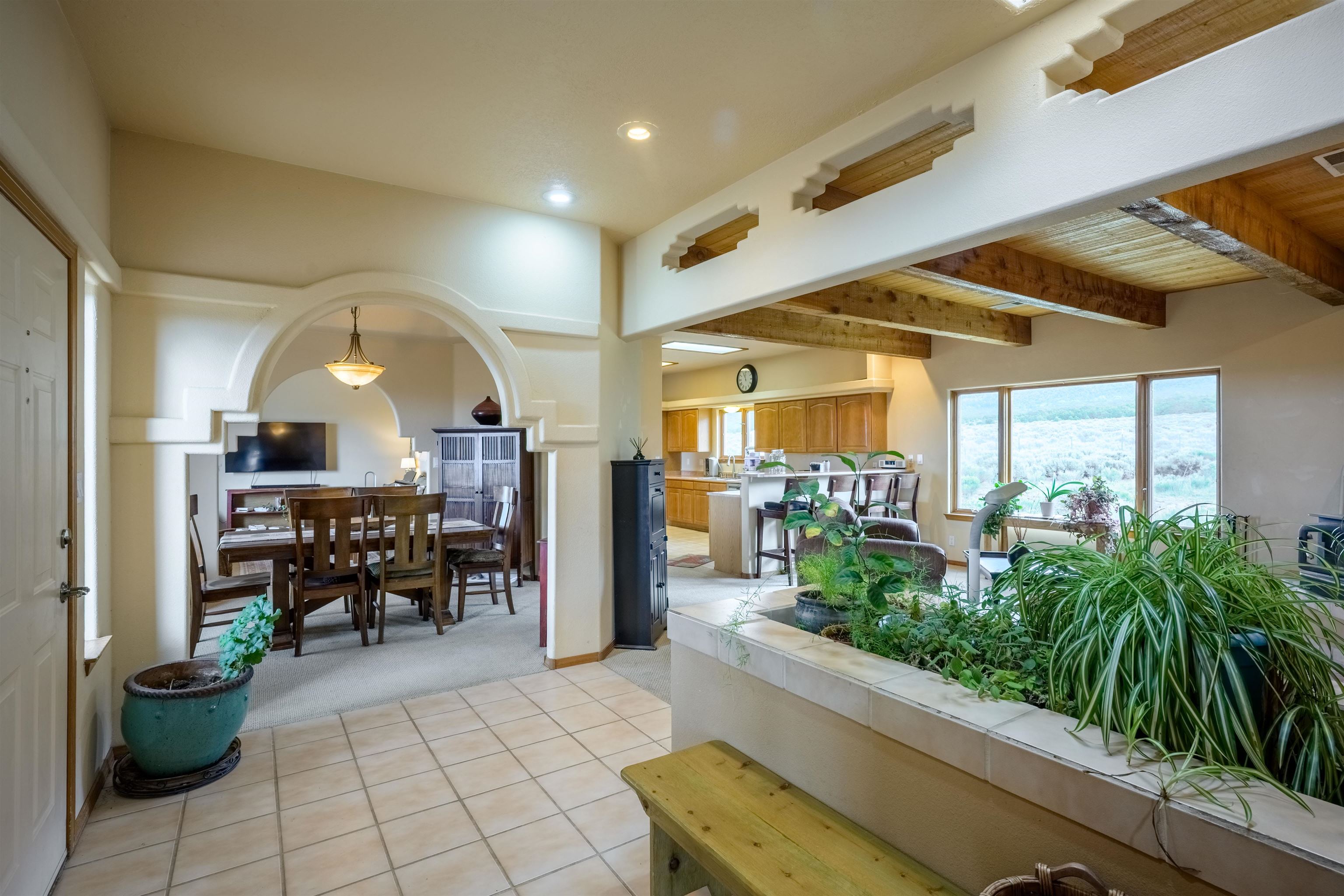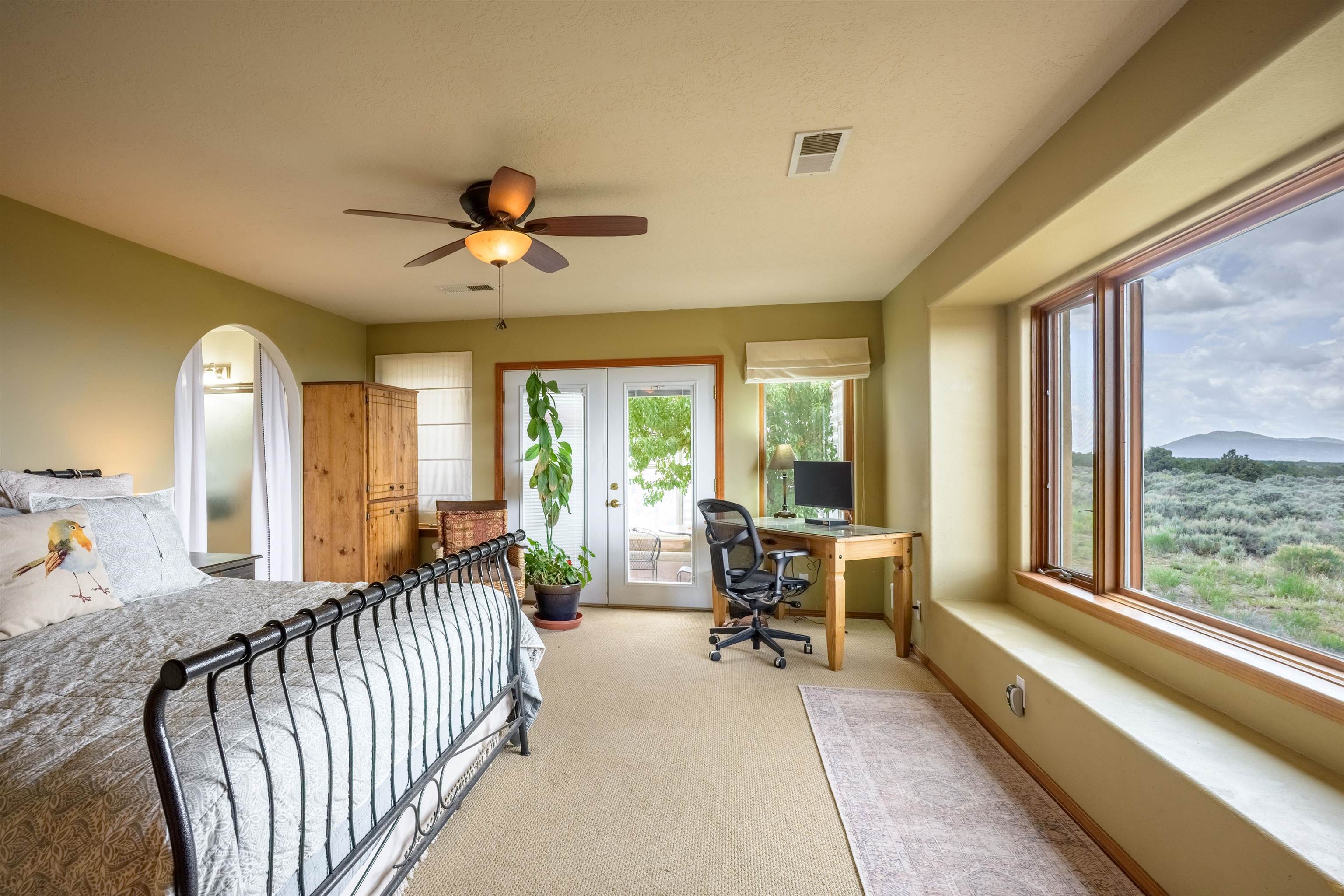Escape to 8 acres of unparalleled solitude and serenity at the base of the stunning Latir cliffs. This unique property, located just north of Questa in the heart of the famous Taos sage, offers profound peace with breathtaking views in every direction. Greet the day with sunrise over the Latirs to the east and enjoy expansive views of Ute Mountain and San Antonio Mountain to the north. This well-maintained, single-level home is designed for comfort and sustainability. A photovoltaic solar array provides backup to your most essential conveniences, and a private well is complemented by an extensive water catchment system that nourishes fruit trees and gardens. Inside, the home is flooded with natural light, with views from every window. The fairly open living, kitchen, and dining areas offer a sense of connection while maintaining a separation of space. A welcoming indoor planter greets you at the entry, and a cozy kiva fireplace with an insert anchors the living area. The 3-bedroom, 2-bathroom layout includes a master suite with a unique greenhouse, providing passive solar heat and a beautiful wash of natural light. Step outside onto the large deck to witness spectacular sunsets over the vast Taos Mesa and Cerro de la Olla to the west. A detached garage provides ample space for vehicles and storage. Experience true tranquility in this thoughtfully designed 1996 off-site built home, where sustainable living meets the raw beauty of Northern New Mexico.
