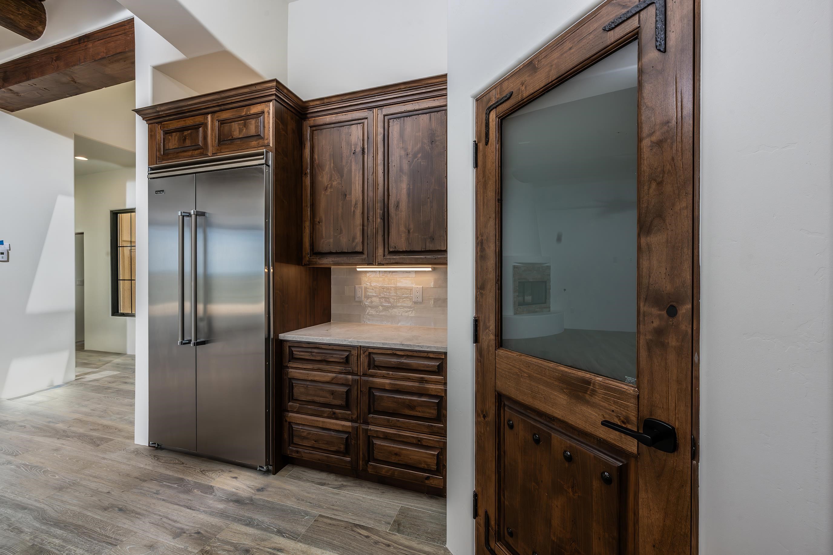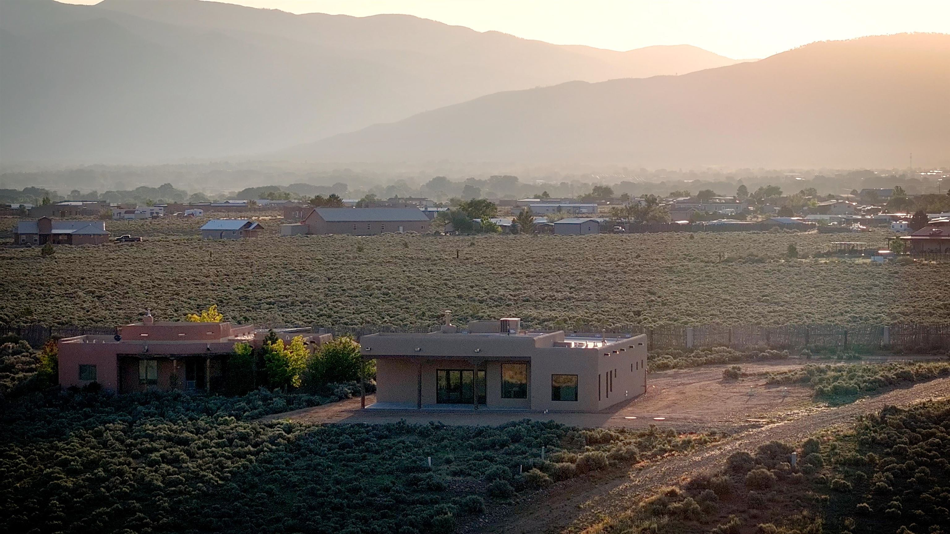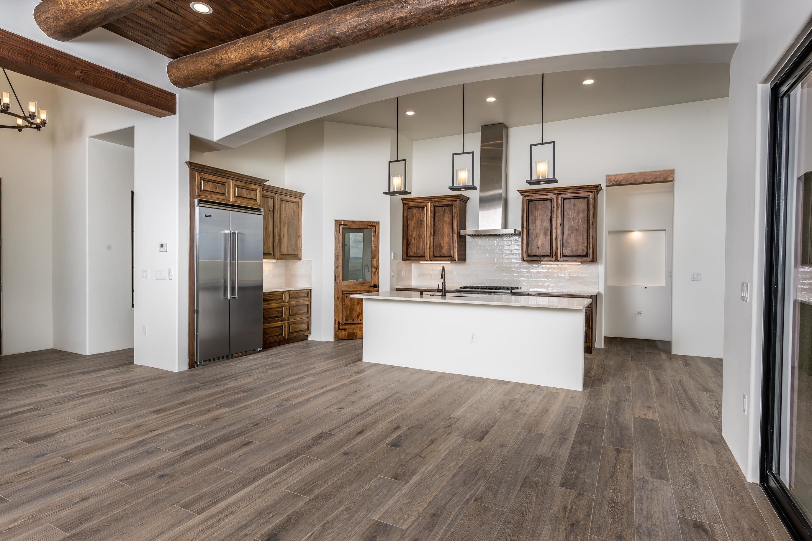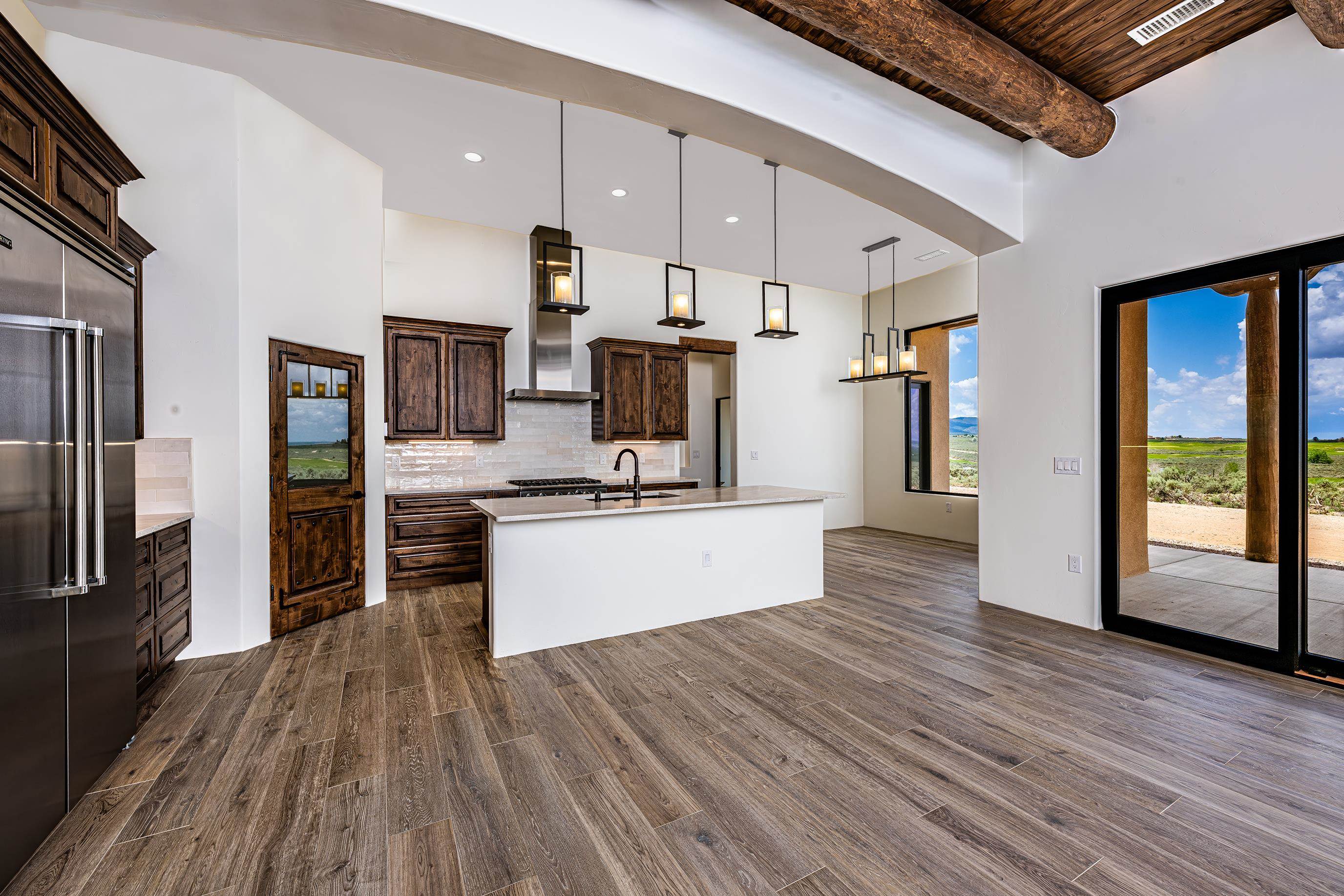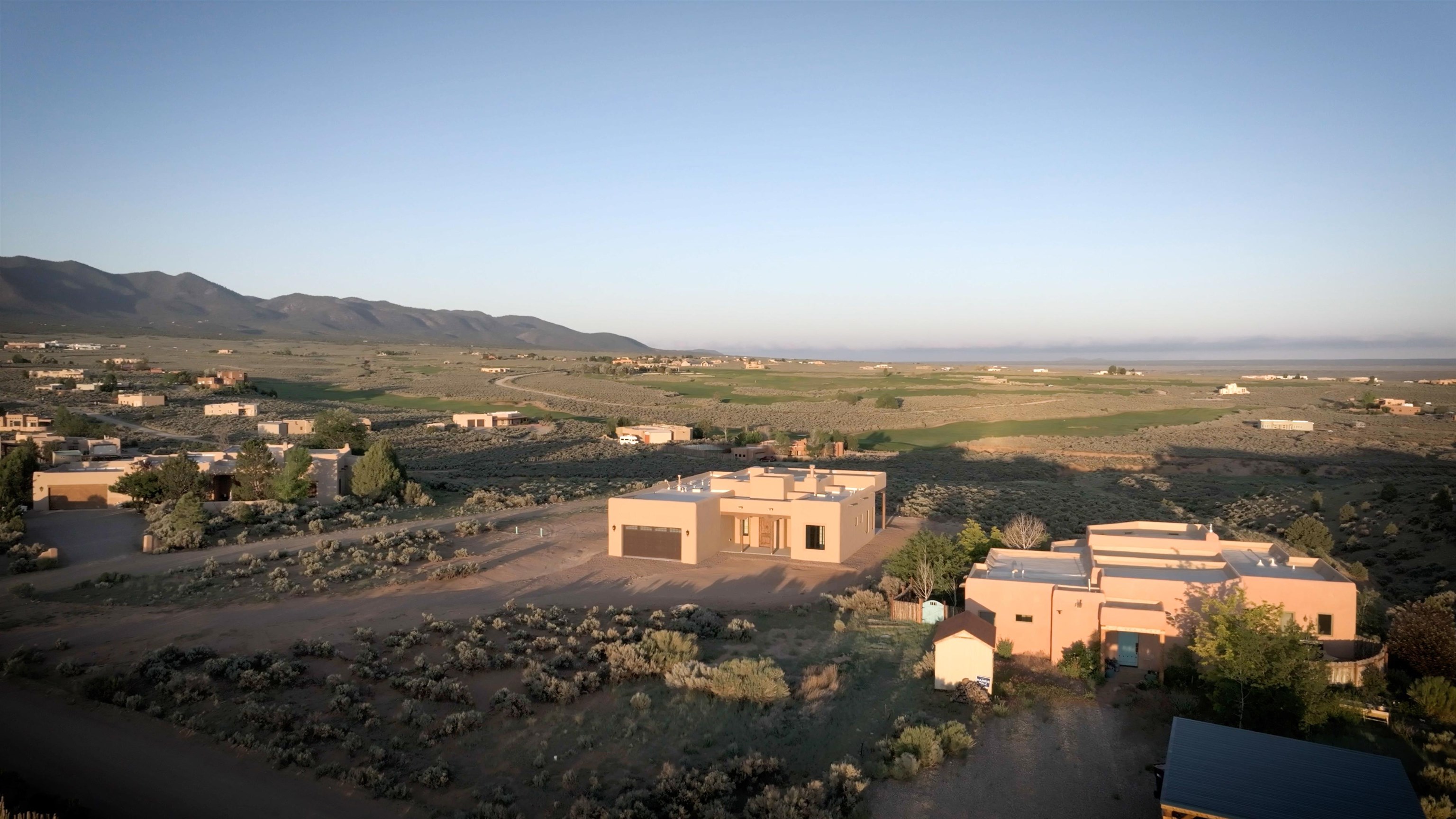 We call it Taos modern, the builder says. “It’s neither Pueblo nor strictly modern— it’s simply elegant.†It’s a seamless, stunning blend of contemporary sophistication with the enduring charm of Northern New Mexican traditional design. Upon entering through the custom front door, visitors are immediately greeted by an expansive view through large glass doors that lead to the patio. The open concept living area centers around a striking fireplace that embodies the home’s style. Hints of traditional detail with sophisticated clean lines. The room’s high ceilings and thoughtfully chosen light fixtures add drama without overpowering the space. The kitchen, a centerpiece of the home, was designed with both function and flair and includes Viking appliances plus highly desired Taj Mahal granite countertops. Because of the open concept and interconnected spaces, there’s a captivating view in nearly every direction. A neutral color palette creates a serene, timeless atmosphere throughout the home. The elegant soaking tub is the perfect spot to wind down and enjoy the views looking towards the golf course. The alluring accent tile conjures a connection to nature with its multitude of green hues and organic, handmade style, but the stacked design is decidedly modern sleek. The linear modern tiles on the floor and shower walls, create a calm, spa-like space. The countertops that embody the entire palette and sleek plumbing fixtures complete the master suite. What we call standard features; the other guys call upgrades. Because our custom homes have so many amenities, they require very few upgrades. A uniquely crafted Taos modern custom home with dramatic clerestory natural light, proportion, and scale, to accentuate the sleek elegance of Taos modern architecture.