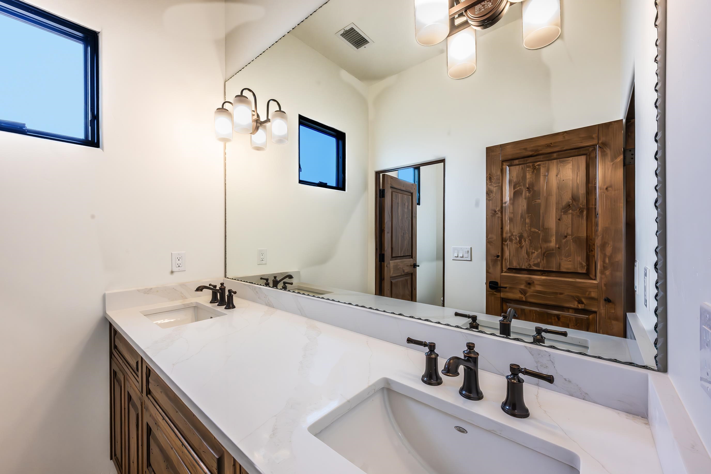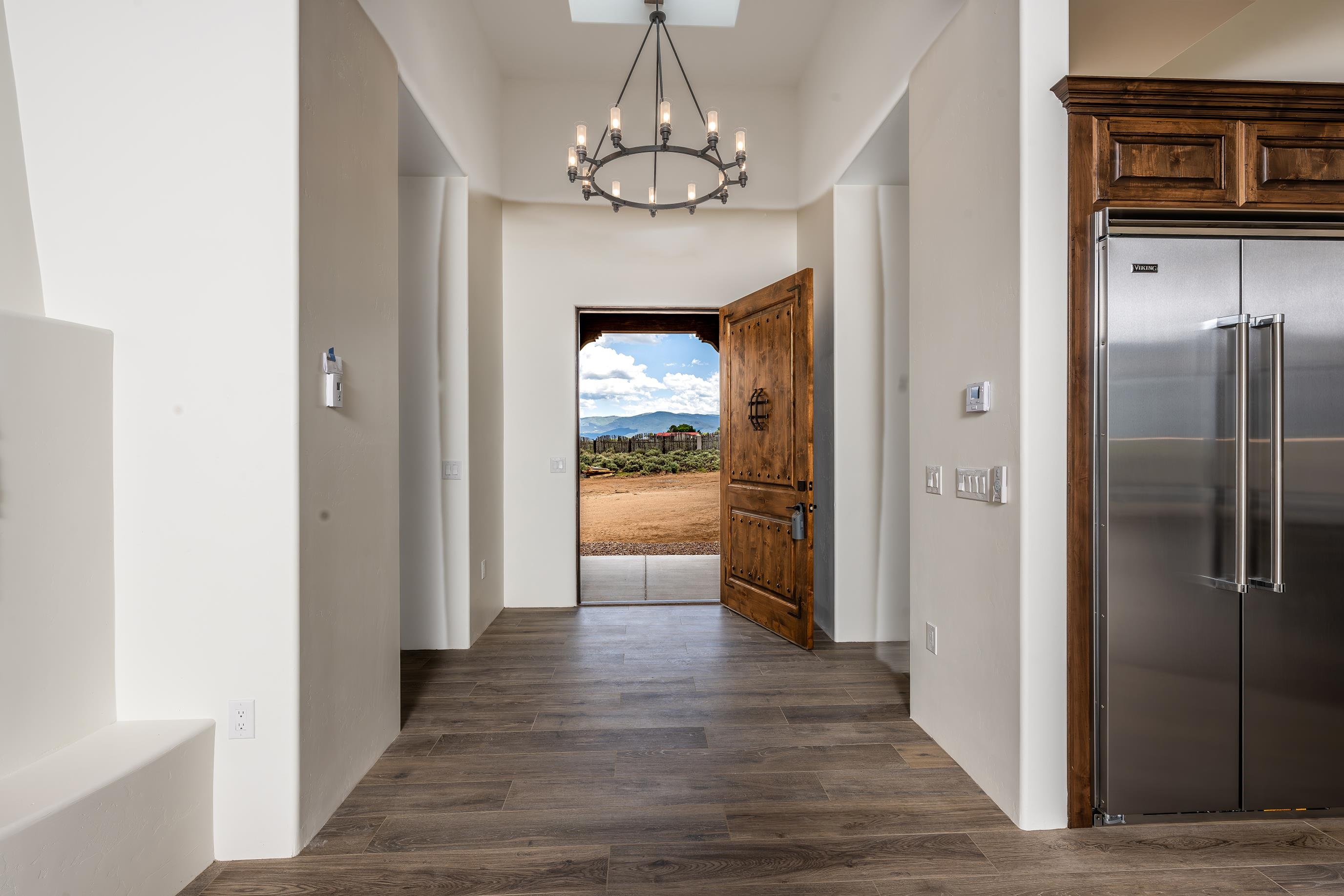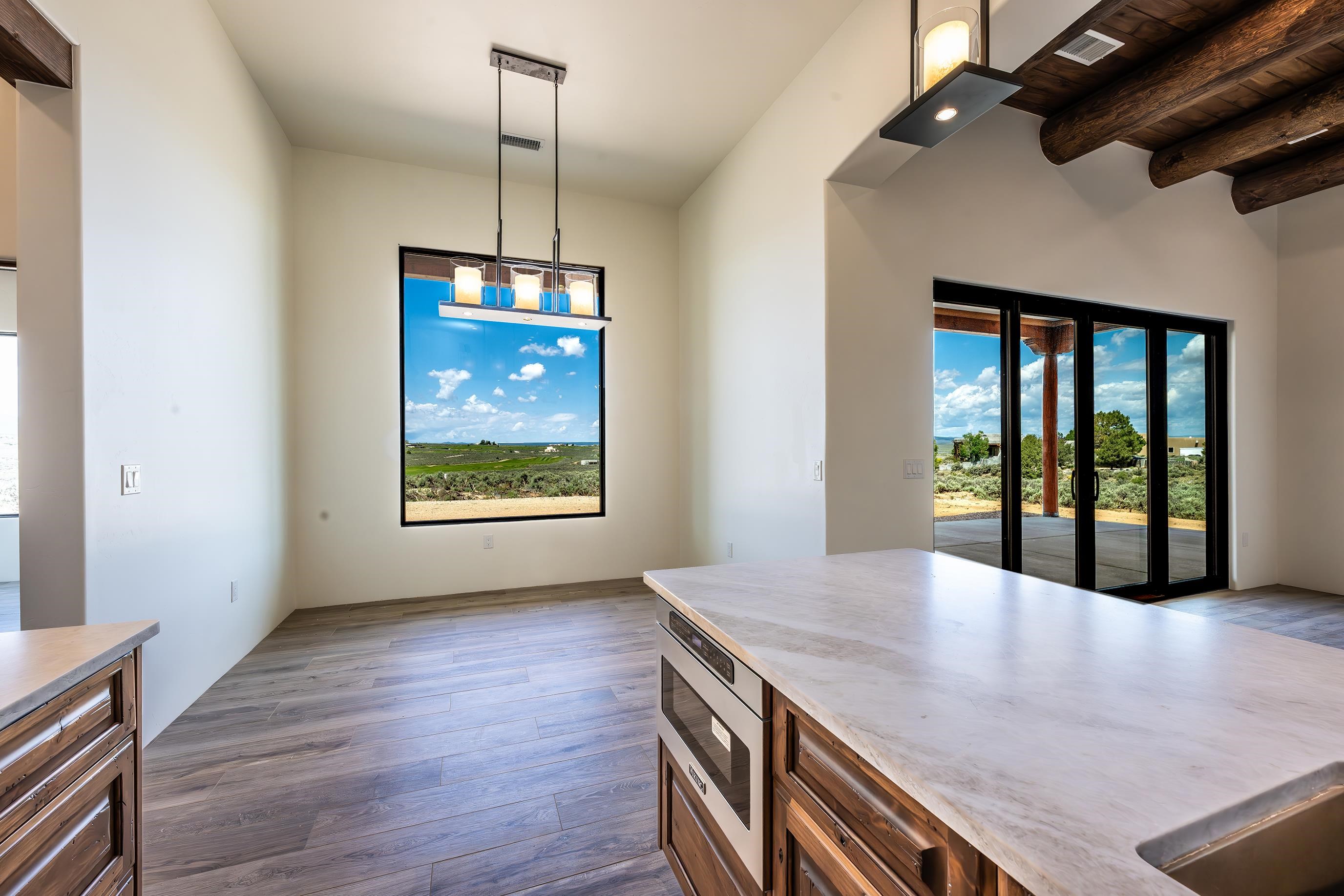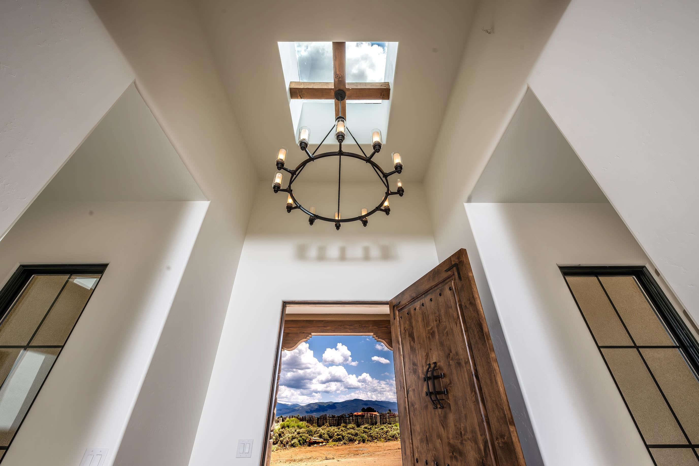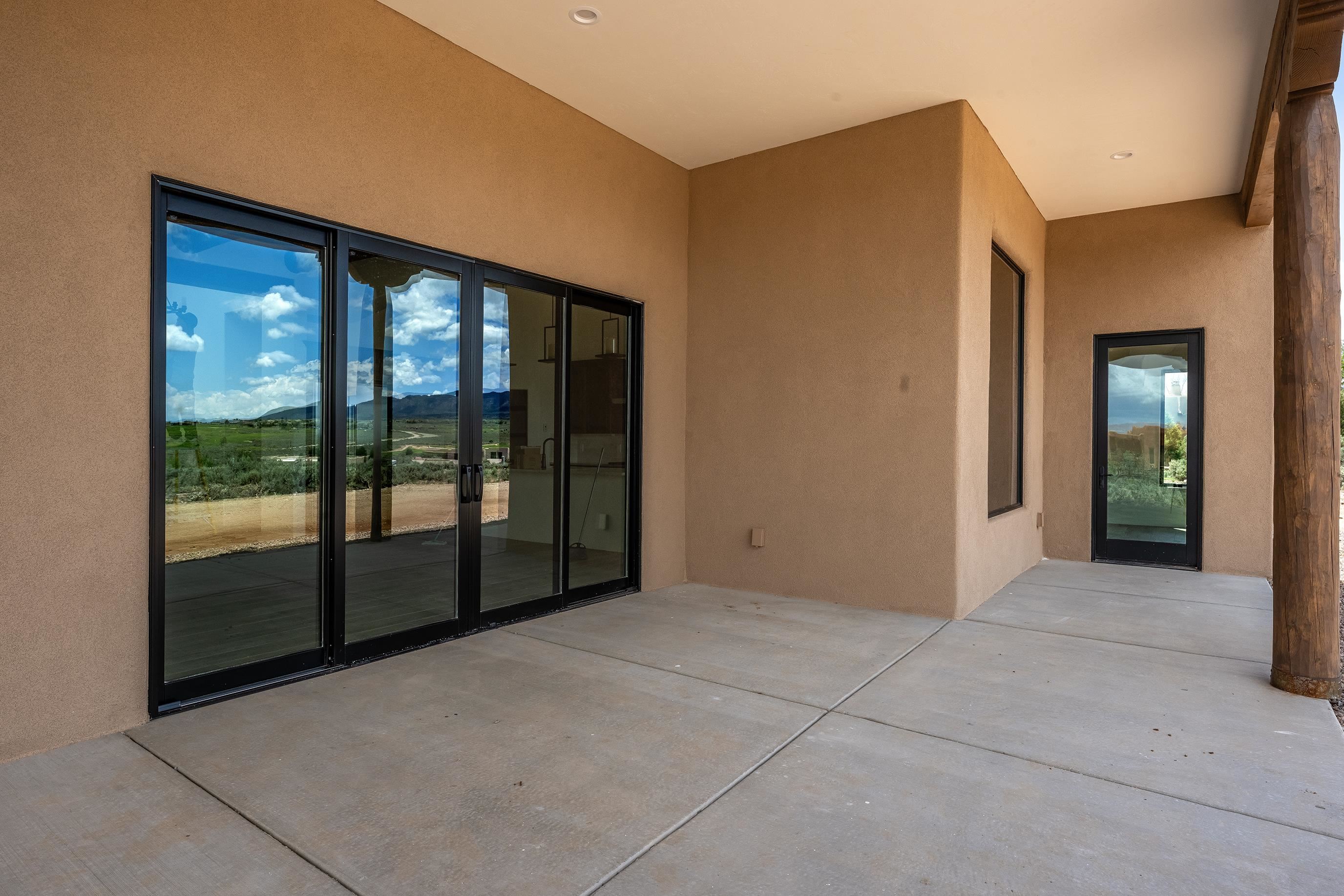 We call it Taos modern, the builder says. “It’s neither Pueblo nor strictly modern— it’s simply elegant.†It’s a seamless, stunning blend of contemporary sophistication with the enduring charm of Northern New Mexican traditional design. Upon entering through the custom front door, visitors are immediately greeted by an expansive view through large glass doors that lead to the patio. The open concept living area centers around a striking fireplace that embodies the home’s style. Hints of traditional detail with sophisticated clean lines. The room’s high ceilings and thoughtfully chosen light fixtures add drama without overpowering the space. The kitchen, a centerpiece of the home, was designed with both function and flair and includes Viking appliances plus highly desired Taj Mahal granite countertops. Because of the open concept and interconnected spaces, there’s a captivating view in nearly every direction. A neutral color palette creates a serene, timeless atmosphere throughout the home. The elegant soaking tub is the perfect spot to wind down and enjoy the views looking towards the golf course. The alluring accent tile conjures a connection to nature with its multitude of green hues and organic, handmade style, but the stacked design is decidedly modern sleek. The linear modern tiles on the floor and shower walls, create a calm, spa-like space. The countertops that embody the entire palette and sleek plumbing fixtures complete the master suite. What we call standard features; the other guys call upgrades. Because our custom homes have so many amenities, they require very few upgrades. A uniquely crafted Taos modern custom home with dramatic clerestory natural light, proportion, and scale, to accentuate the sleek elegance of Taos modern architecture.