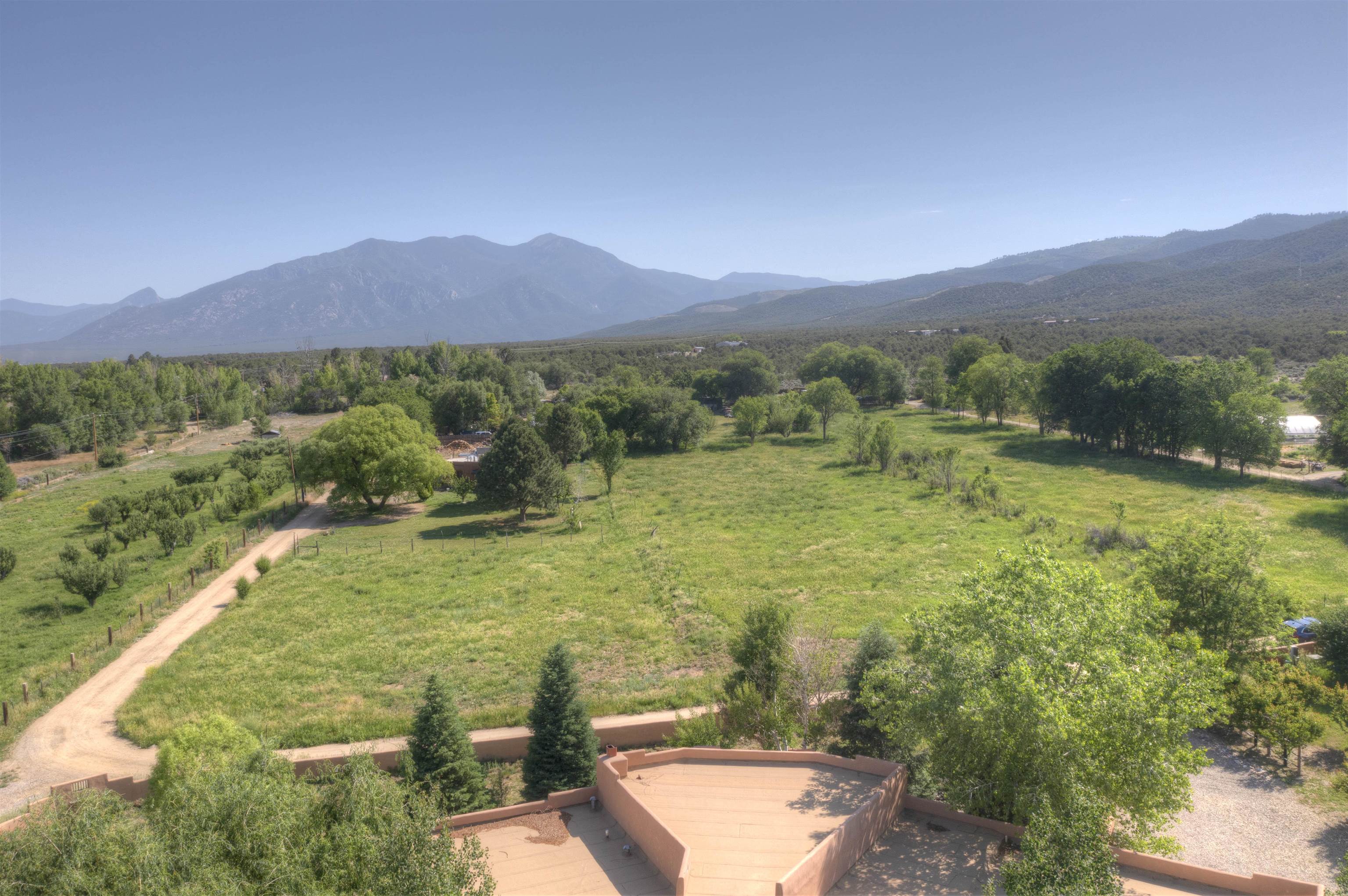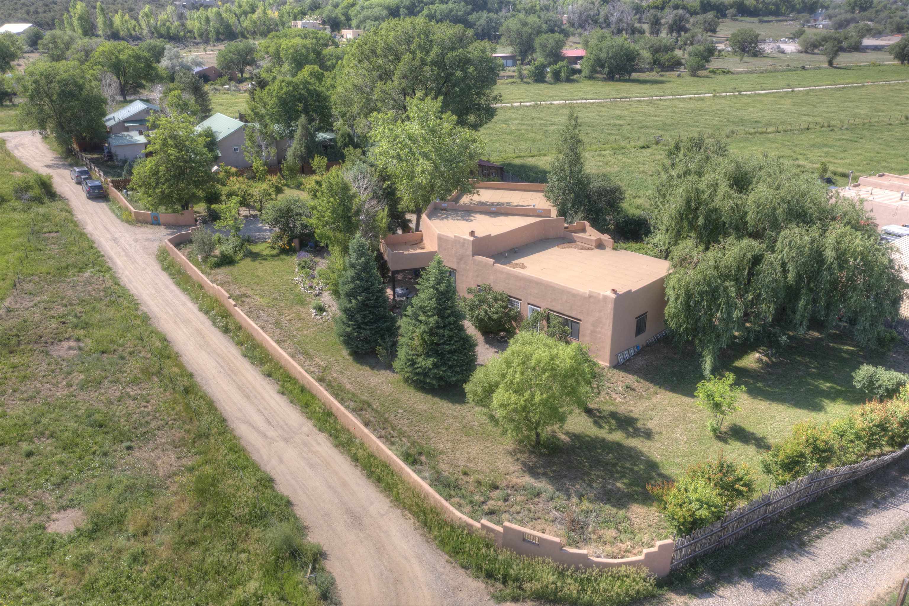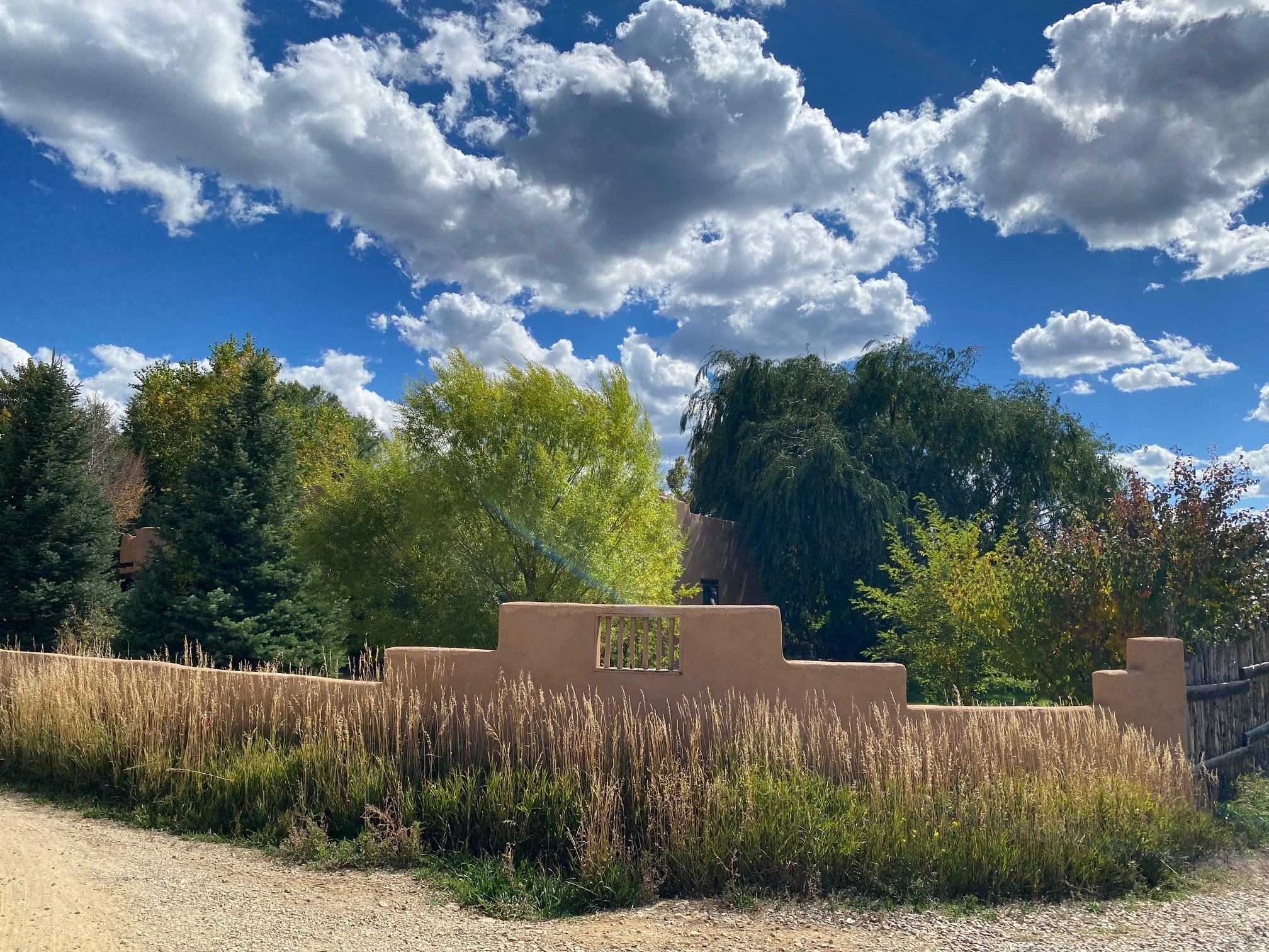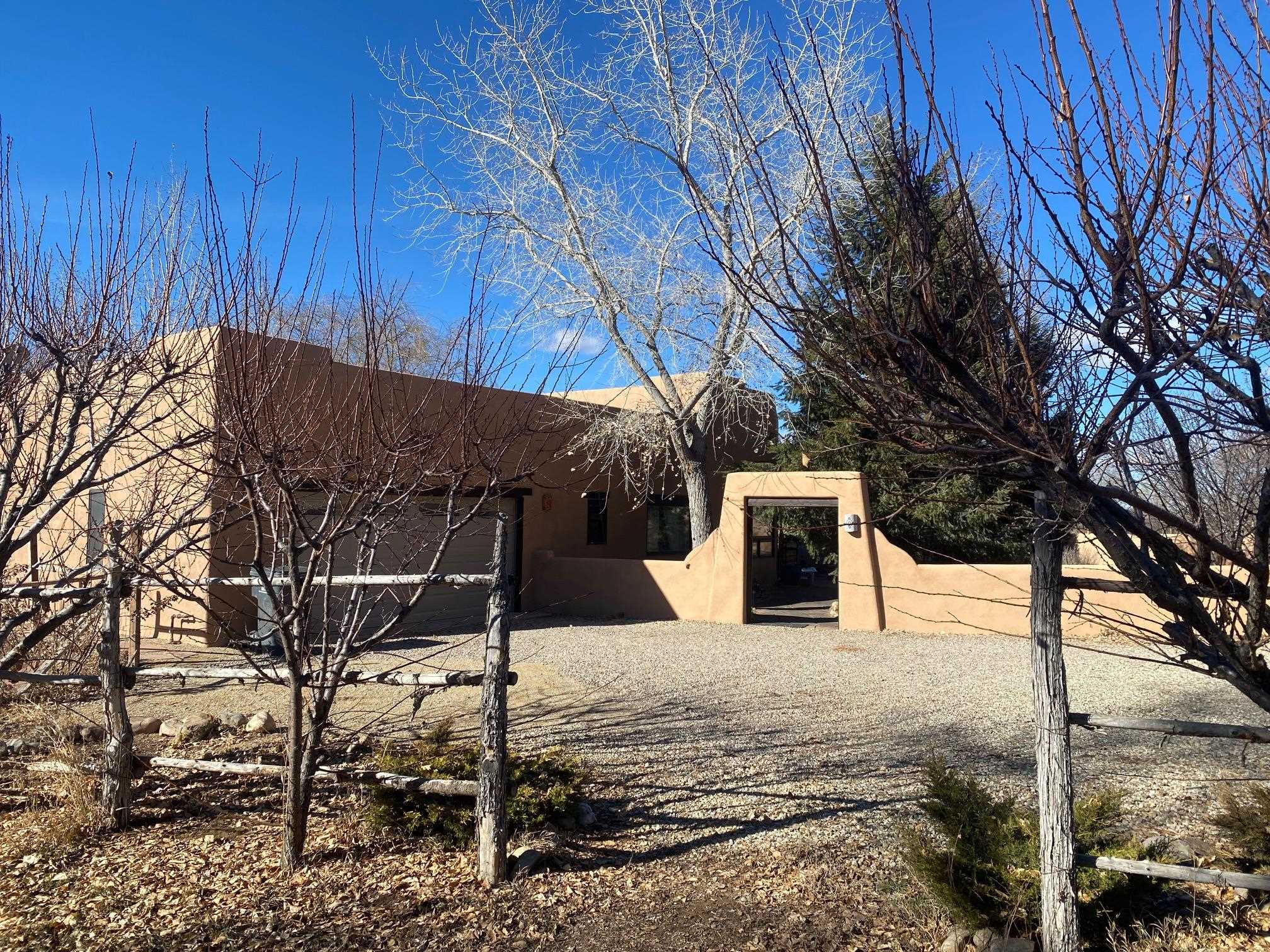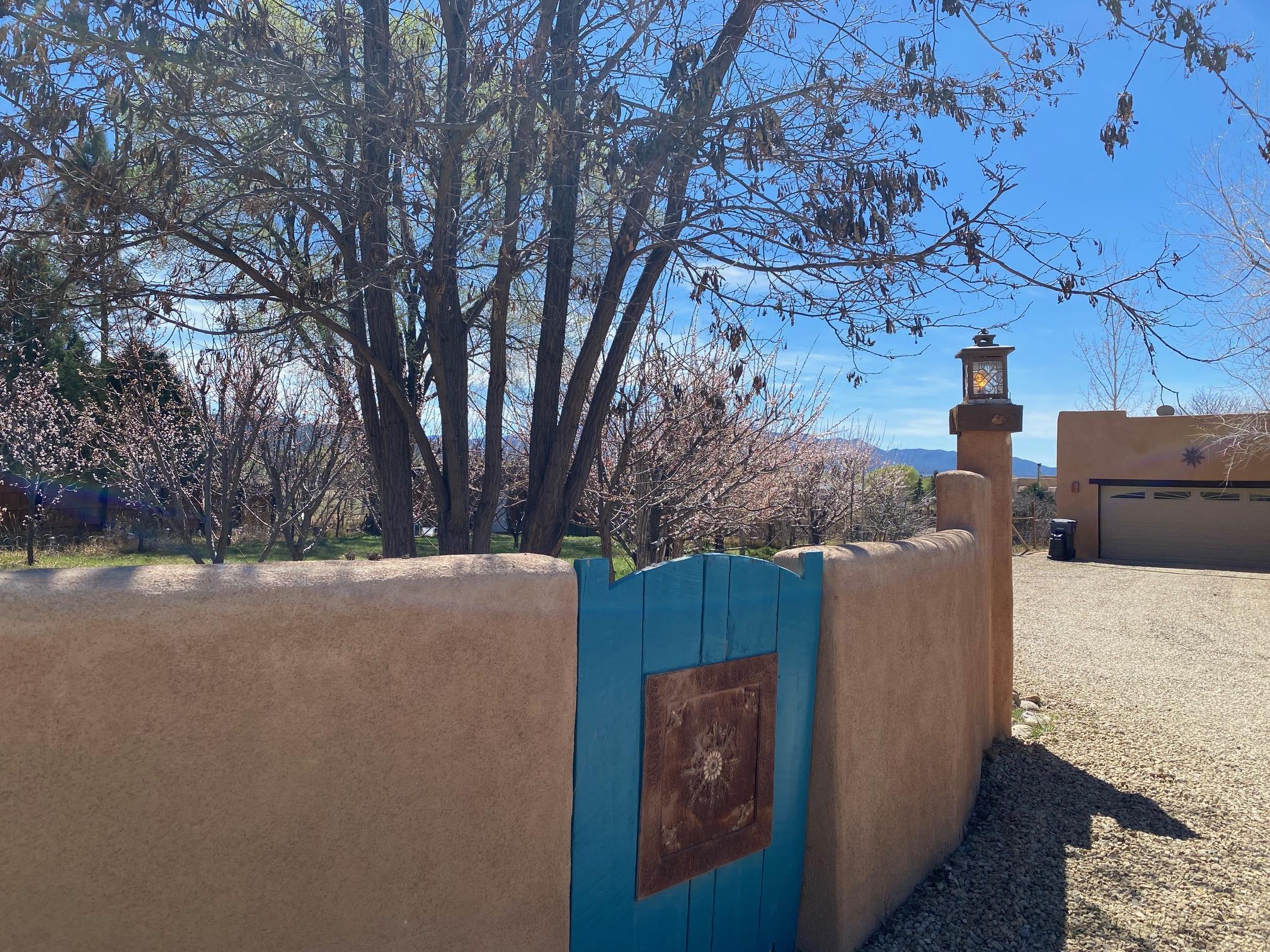 Canon Oasis! Lush gardens and a shady entry courtyard welcome you to to this immaculate home less than two miles from Taos Plaza. Saltillo tile floors and viga ceilings embrace the flavor of southwestern detailing throughout. In-floor radiant heat and ceiling fans maintain comfortable temperatures year round. With three bedrooms, 2.5 bathrooms, an office and over 2200 sq ft, of interior living space there is ample room for hosting and entertaining guests. The great room features soaring ceilings with vigas and two distinct living areas. Cuddle up in front of the southwestern style fireplace on one side or engage in conversation or a watch movie on the other. The breakfast area leads to a covered patio and gardens beyond. Archways lead to the formal dining room and kitchen. Be sure not to miss the details on the cooktop island or the view of the garden from above the kitchen sink. There's a convenient pantry tucked behind the kitchen and a powder room and laundry. Primary and guest bedrooms are located down the hall in the west wing of the residence. There is a dedicated office. Two other guest bedrooms and common bathroom lay beyond. The primary bedroom is spacious with its own southwestern style fireplace and access to the gardens. It's primary bathroom has double sinks, a separate shower and corner jetted tub to get away from it all. A walk-in closet provides an amazing amount of storage! At the rear of the heated two-car garage is an artists studio with exterior access and privacy that awaits your creativity. Valley land is fed by an acequia. More than sixty trees occupy the property --- many fruit ---- and a grand-father willow tree canopies the back yard. Extensive flagstone patios and walkways wind through rose gardens and flower beds leading to a wisteria covered sombra. There is even a fenced area for four-legged family members and a detached shed for seasonal storage and gardening tools. The neighborhood paths lead to endless Carson National Forest hiking trails. This property is one of a kind in so many ways. Truly magical and rare elegance abounds!