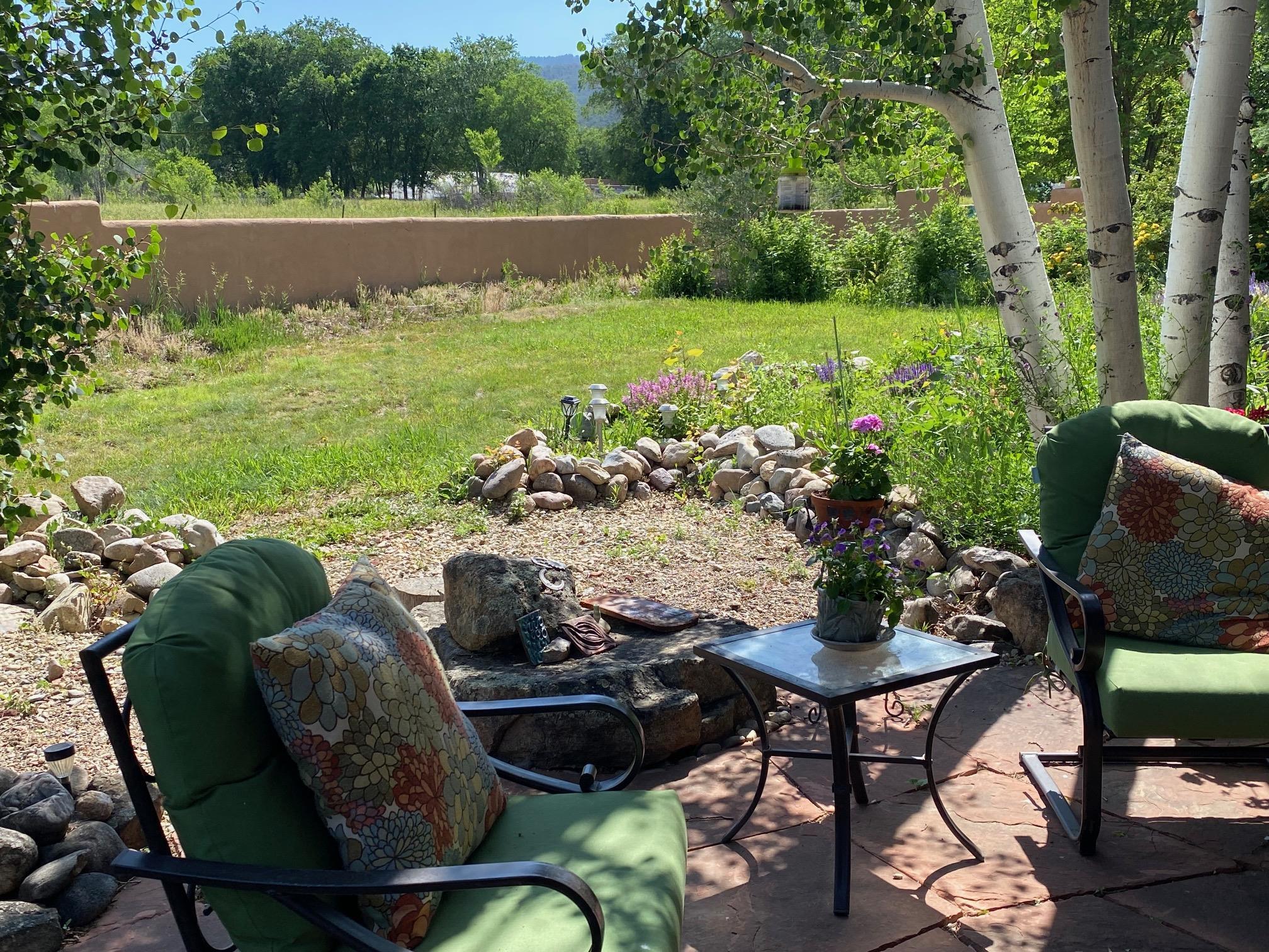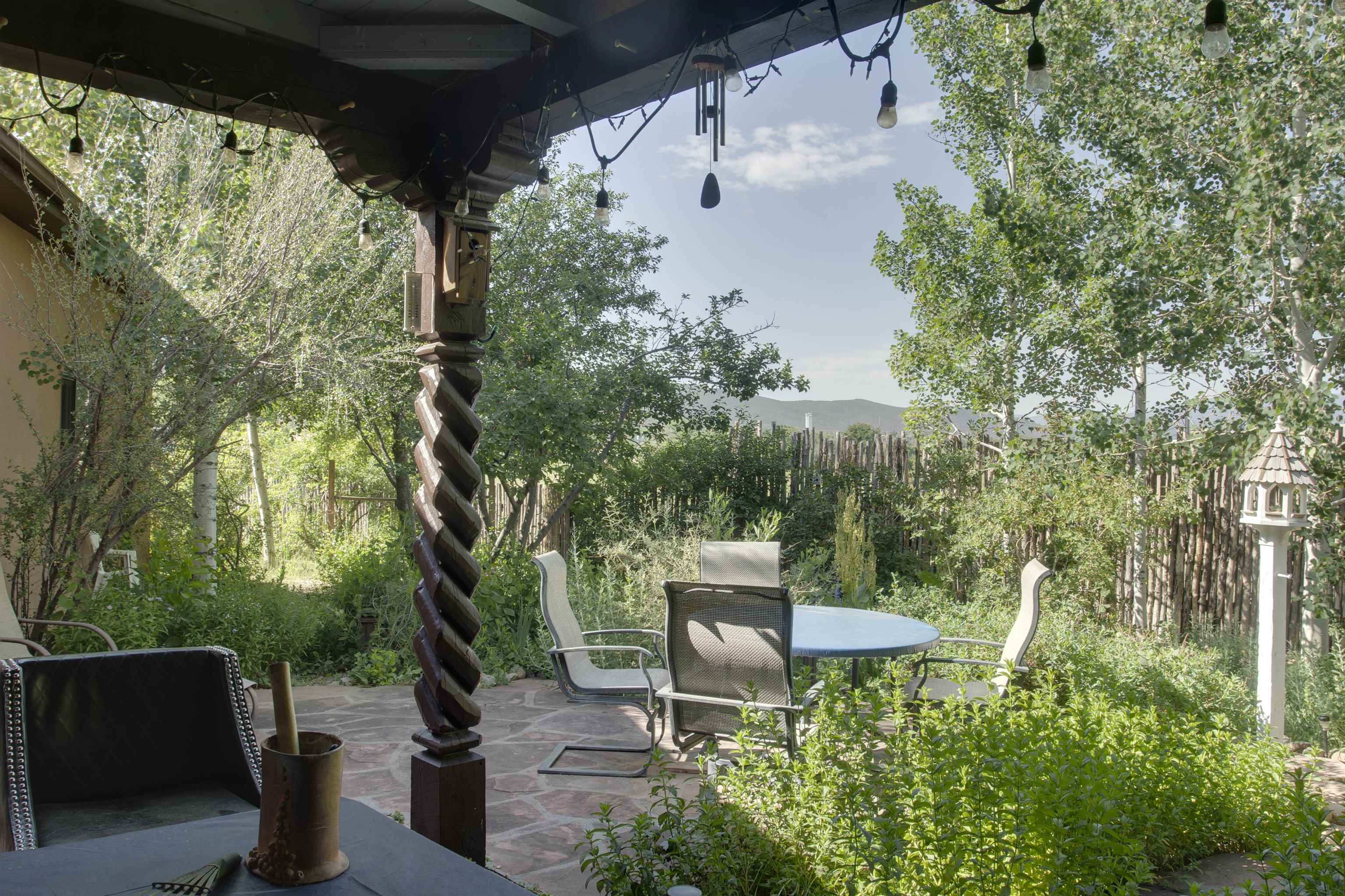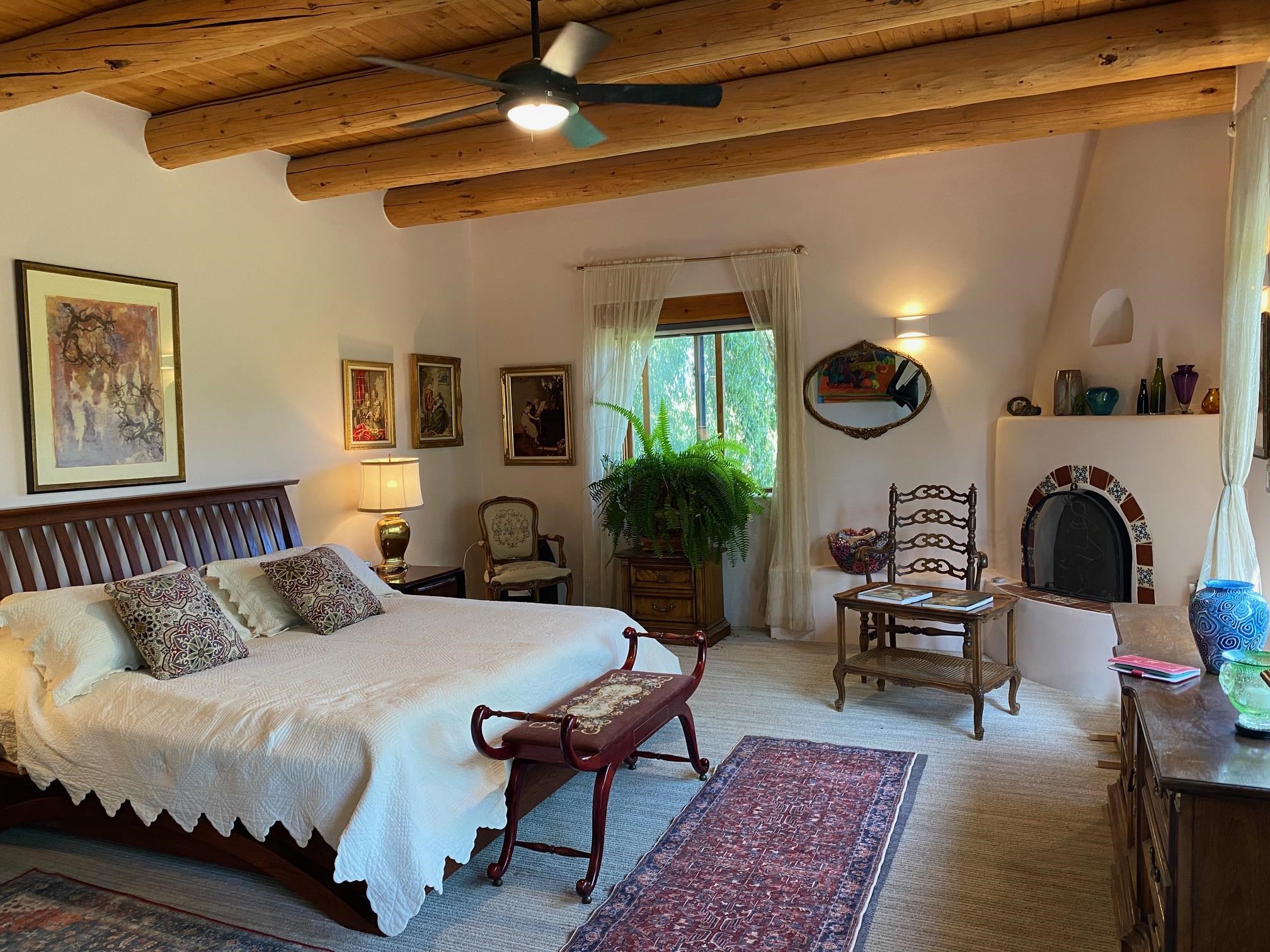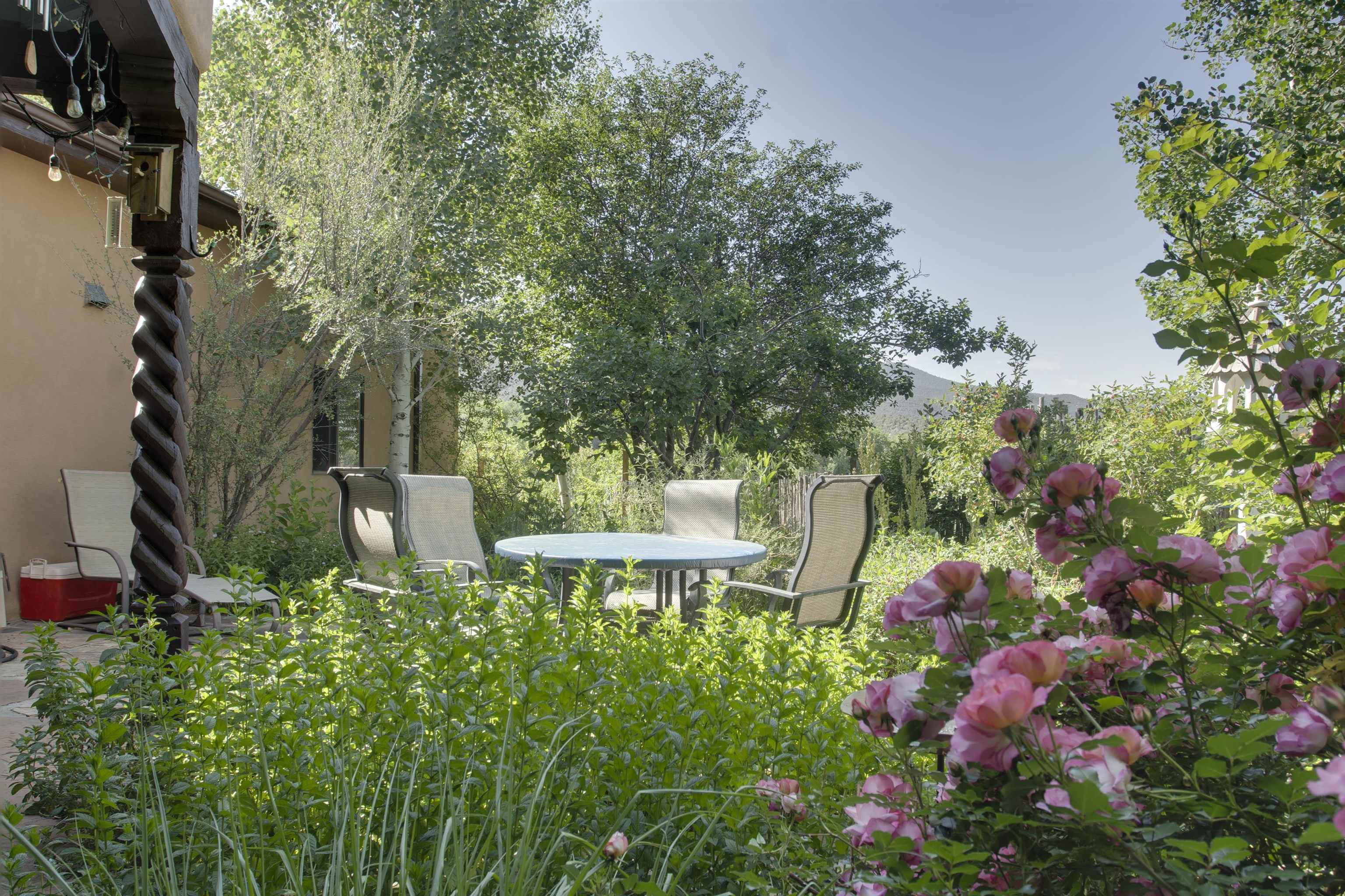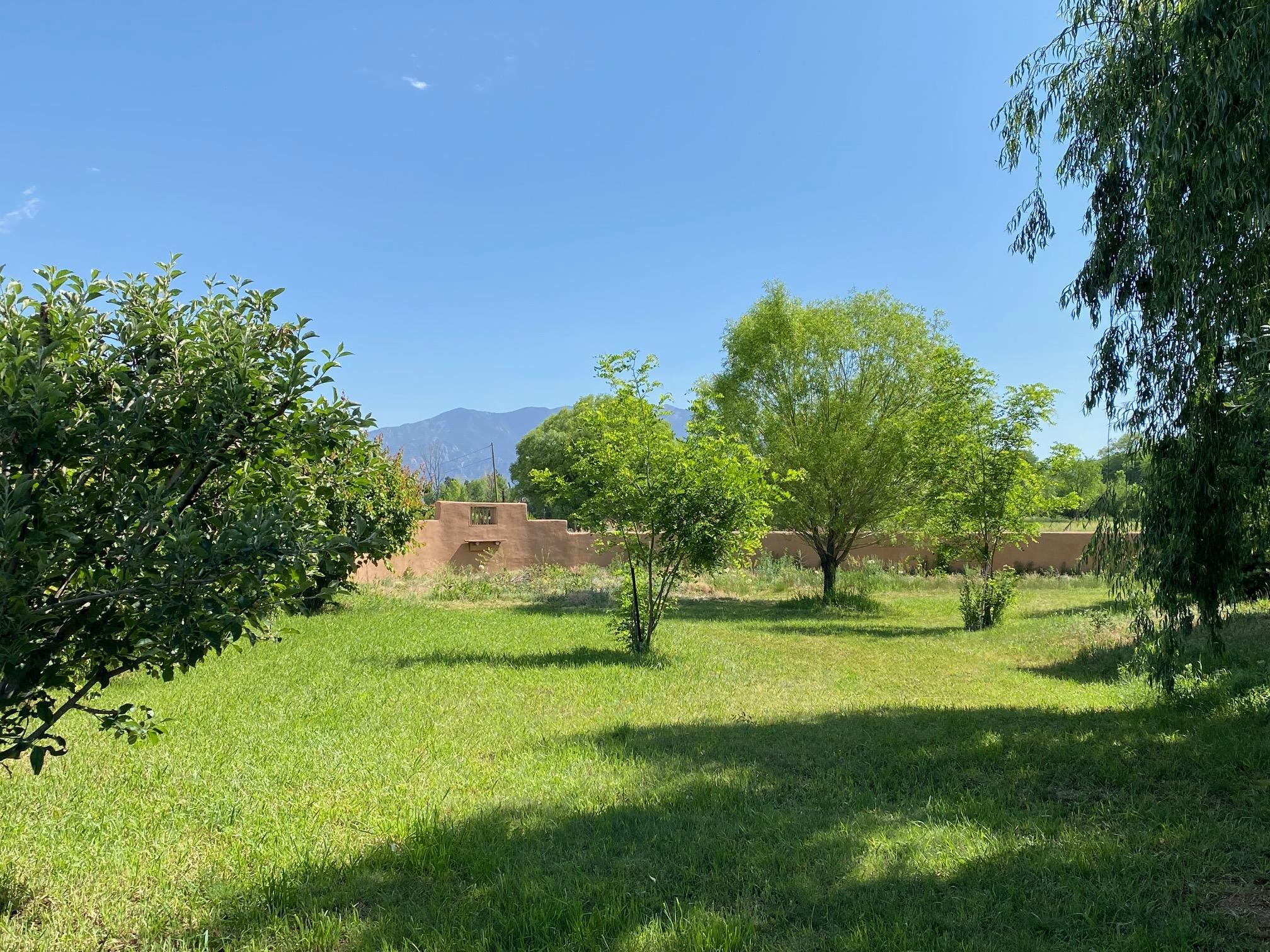 Canon Oasis! Lush gardens and a shady entry courtyard welcome you to to this immaculate home less than two miles from Taos Plaza. Saltillo tile floors and viga ceilings embrace the flavor of southwestern detailing throughout. In-floor radiant heat and ceiling fans maintain comfortable temperatures year round. With three bedrooms, 2.5 bathrooms, an office and over 2200 sq ft, of interior living space there is ample room for hosting and entertaining guests. The great room features soaring ceilings with vigas and two distinct living areas. Cuddle up in front of the southwestern style fireplace on one side or engage in conversation or a watch movie on the other. The breakfast area leads to a covered patio and gardens beyond. Archways lead to the formal dining room and kitchen. Be sure not to miss the details on the cooktop island or the view of the garden from above the kitchen sink. There's a convenient pantry tucked behind the kitchen and a powder room and laundry. Primary and guest bedrooms are located down the hall in the west wing of the residence. There is a dedicated office. Two other guest bedrooms and common bathroom lay beyond. The primary bedroom is spacious with its own southwestern style fireplace and access to the gardens. It's primary bathroom has double sinks, a separate shower and corner jetted tub to get away from it all. A walk-in closet provides an amazing amount of storage! At the rear of the heated two-car garage is an artists studio with exterior access and privacy that awaits your creativity. Valley land is fed by an acequia. More than sixty trees occupy the property --- many fruit ---- and a grand-father willow tree canopies the back yard. Extensive flagstone patios and walkways wind through rose gardens and flower beds leading to a wisteria covered sombra. There is even a fenced area for four-legged family members and a detached shed for seasonal storage and gardening tools. The neighborhood paths lead to endless Carson National Forest hiking trails. This property is one of a kind in so many ways. Truly magical and rare elegance abounds!
