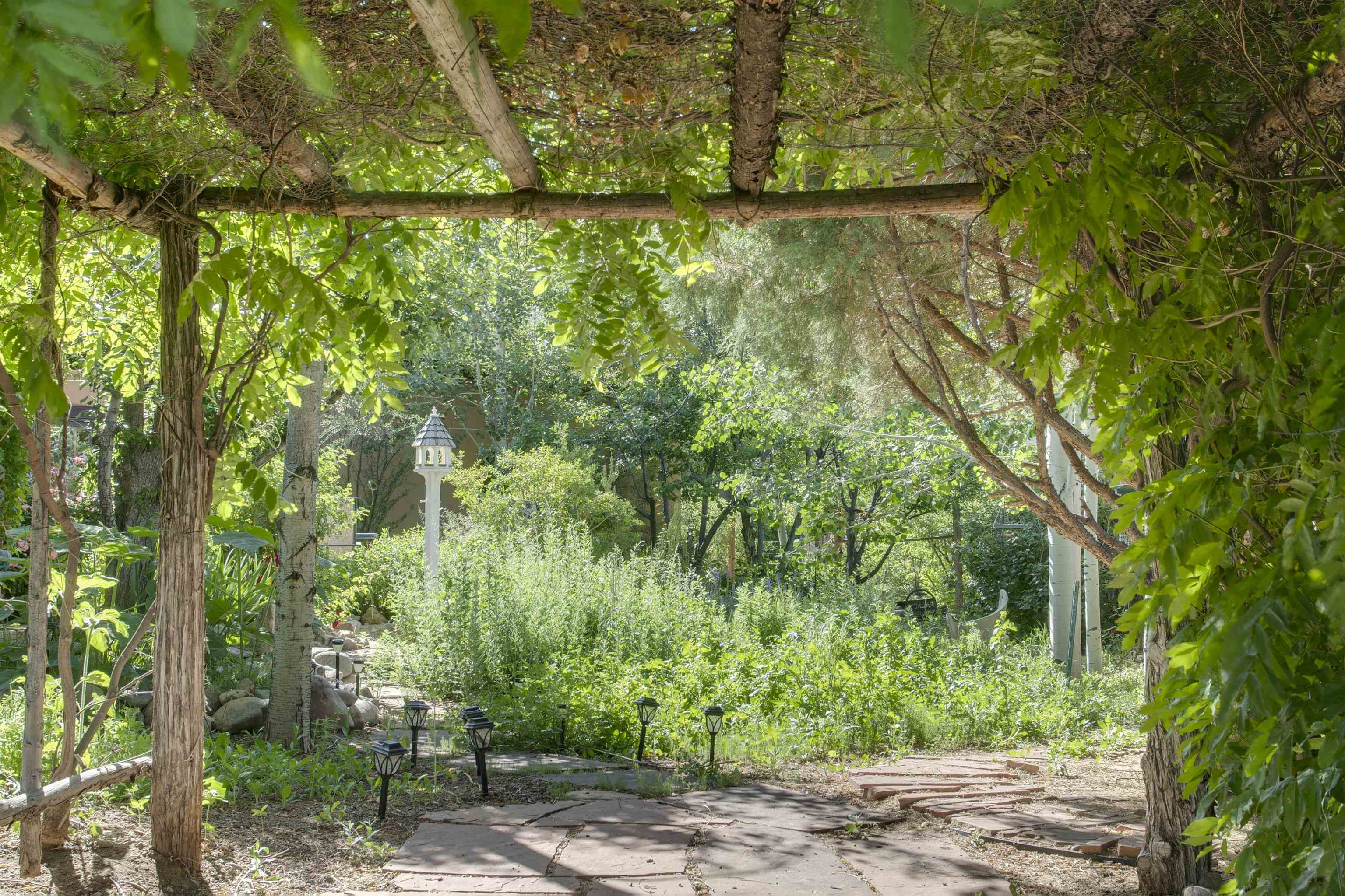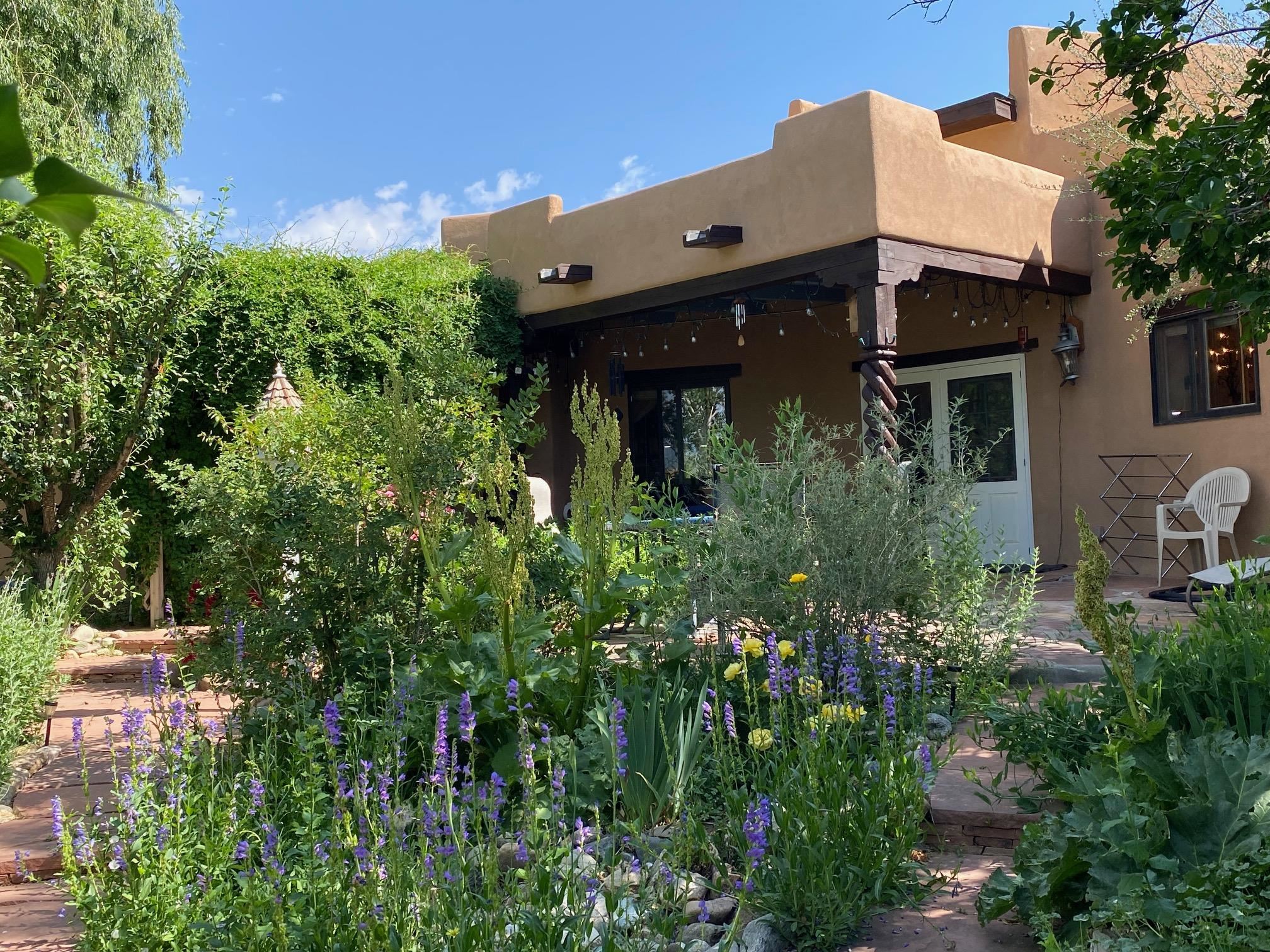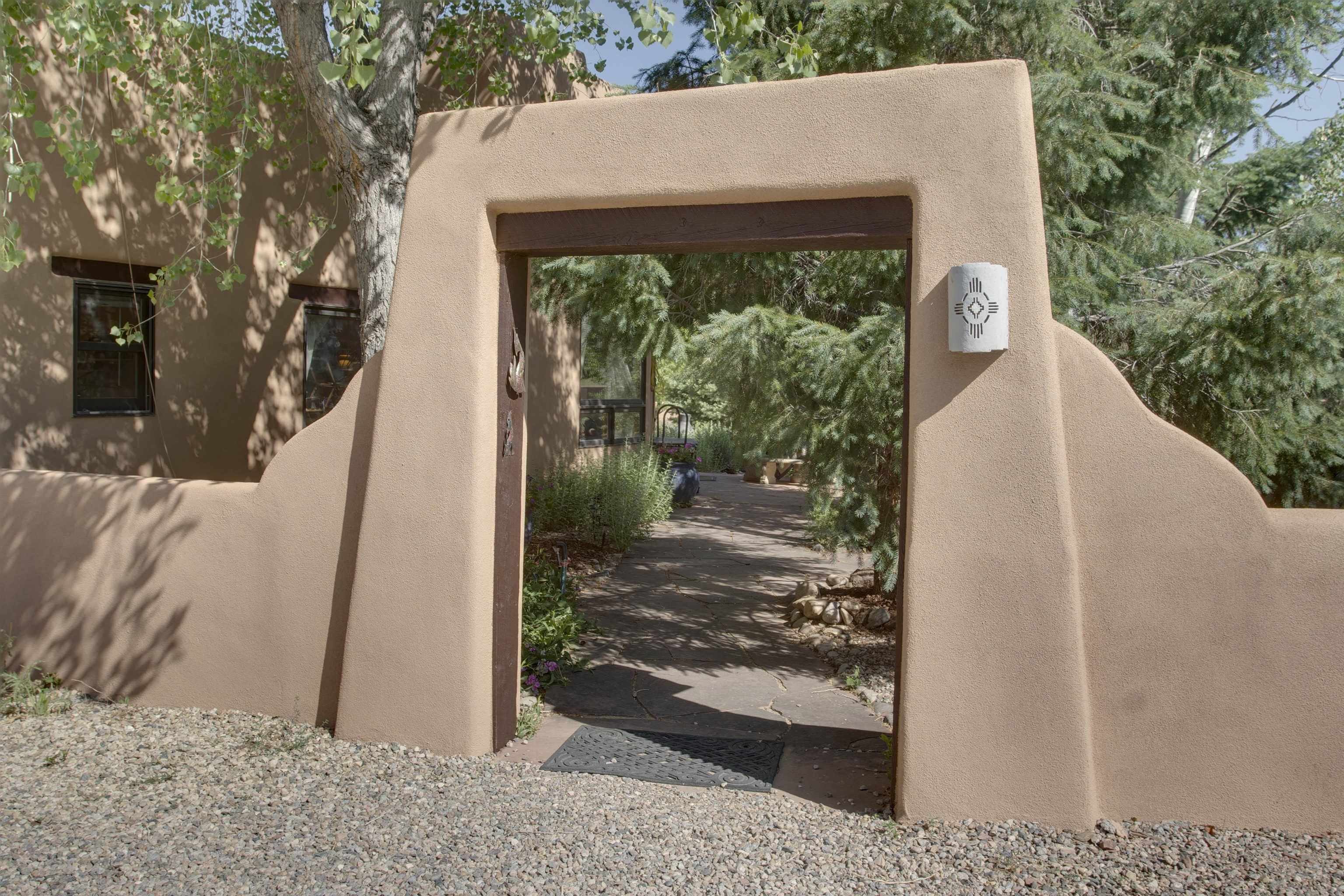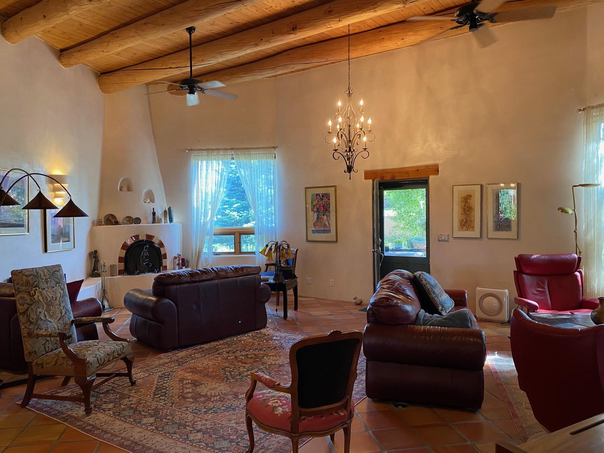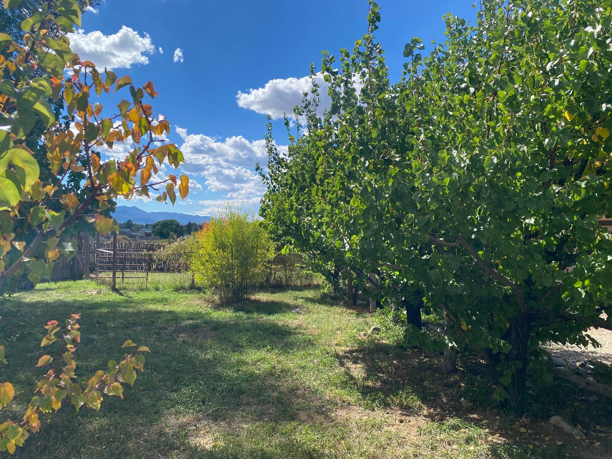 Canon Oasis! Lush gardens and a shady entry courtyard welcome you to to this immaculate home less than two miles from Taos Plaza. Saltillo tile floors and viga ceilings embrace the flavor of southwestern detailing throughout. In-floor radiant heat and ceiling fans maintain comfortable temperatures year round. With three bedrooms, 2.5 bathrooms, an office and over 2200 sq ft, of interior living space there is ample room for hosting and entertaining guests. The great room features soaring ceilings with vigas and two distinct living areas. Cuddle up in front of the southwestern style fireplace on one side or engage in conversation or a watch movie on the other. The breakfast area leads to a covered patio and gardens beyond. Archways lead to the formal dining room and kitchen. Be sure not to miss the details on the cooktop island or the view of the garden from above the kitchen sink. There's a convenient pantry tucked behind the kitchen and a powder room and laundry. Primary and guest bedrooms are located down the hall in the west wing of the residence. There is a dedicated office. Two other guest bedrooms and common bathroom lay beyond. The primary bedroom is spacious with its own southwestern style fireplace and access to the gardens. It's primary bathroom has double sinks, a separate shower and corner jetted tub to get away from it all. A walk-in closet provides an amazing amount of storage! At the rear of the heated two-car garage is an artists studio with exterior access and privacy that awaits your creativity. Valley land is fed by an acequia. More than sixty trees occupy the property --- many fruit ---- and a grand-father willow tree canopies the back yard. Extensive flagstone patios and walkways wind through rose gardens and flower beds leading to a wisteria covered sombra. There is even a fenced area for four-legged family members and a detached shed for seasonal storage and gardening tools. The neighborhood paths lead to endless Carson National Forest hiking trails. This property is one of a kind in so many ways. Truly magical and rare elegance abounds!