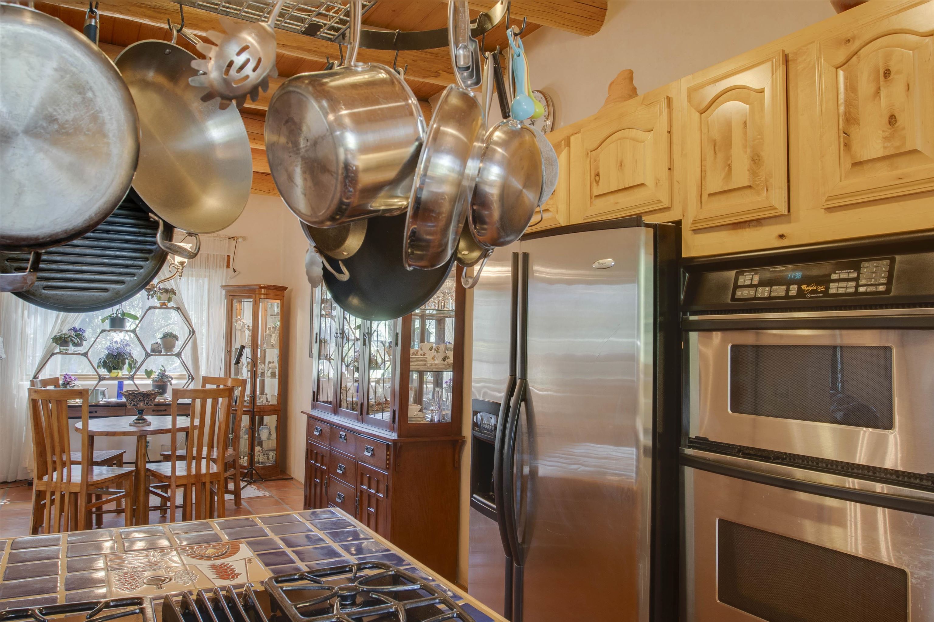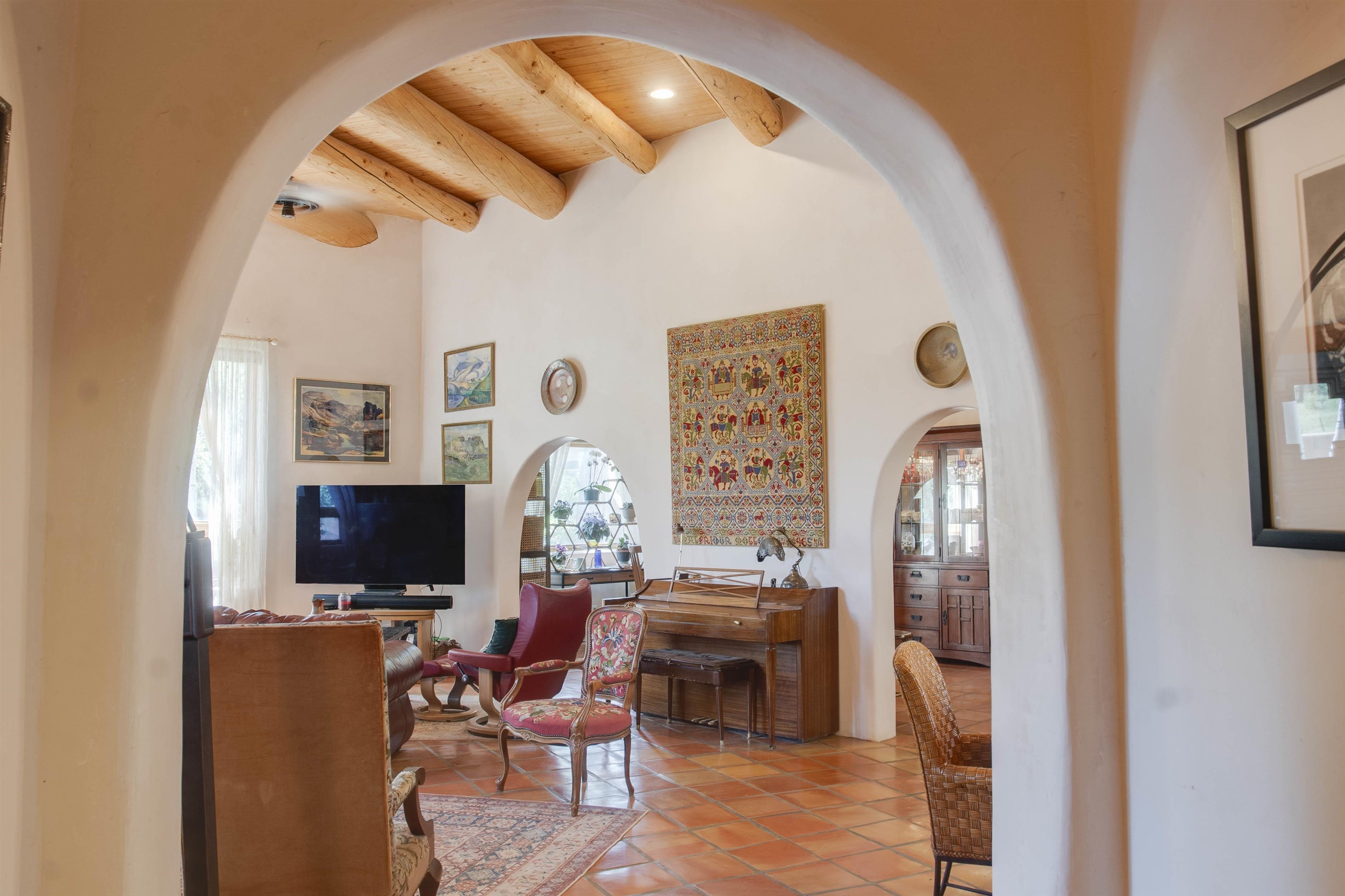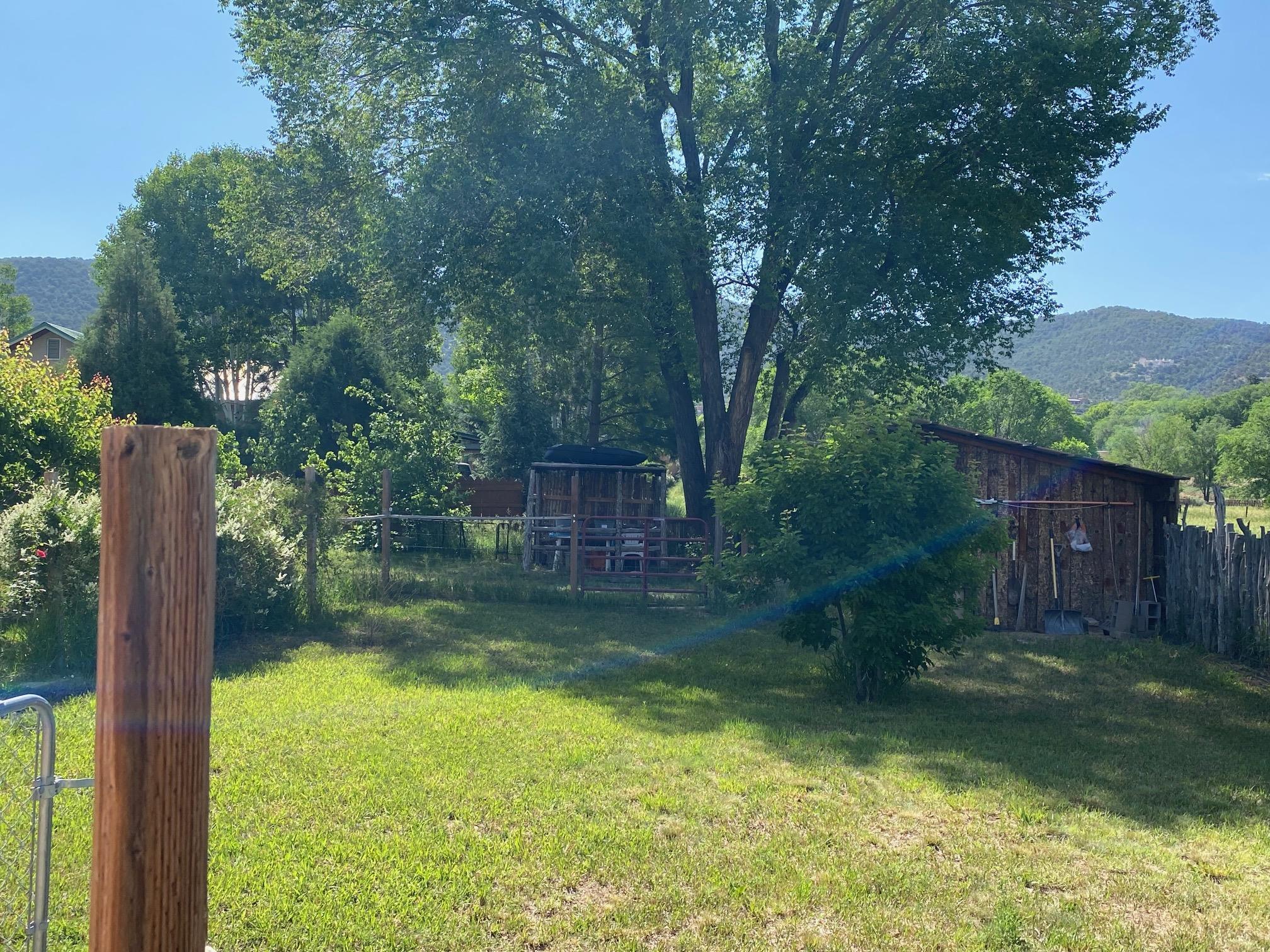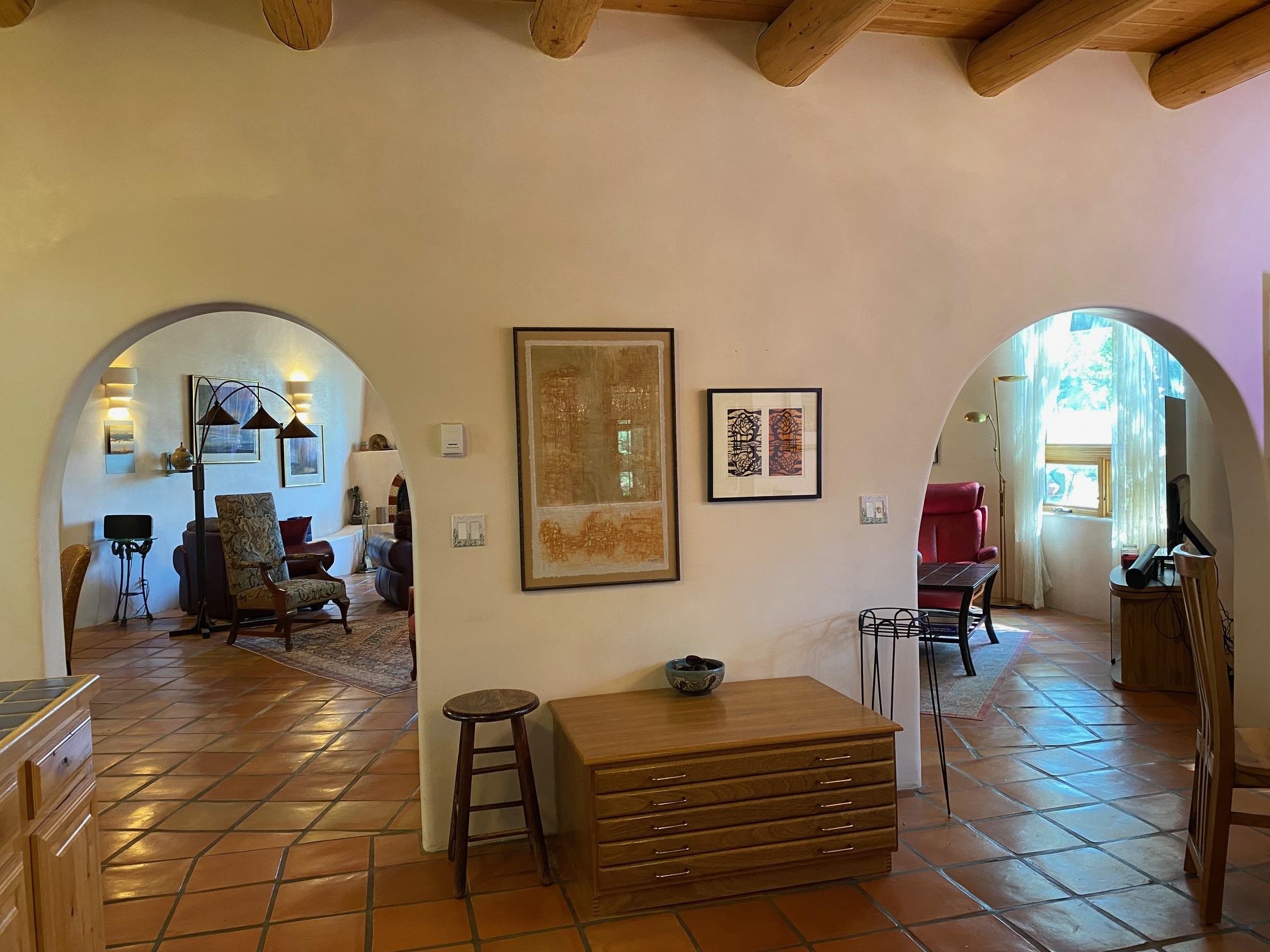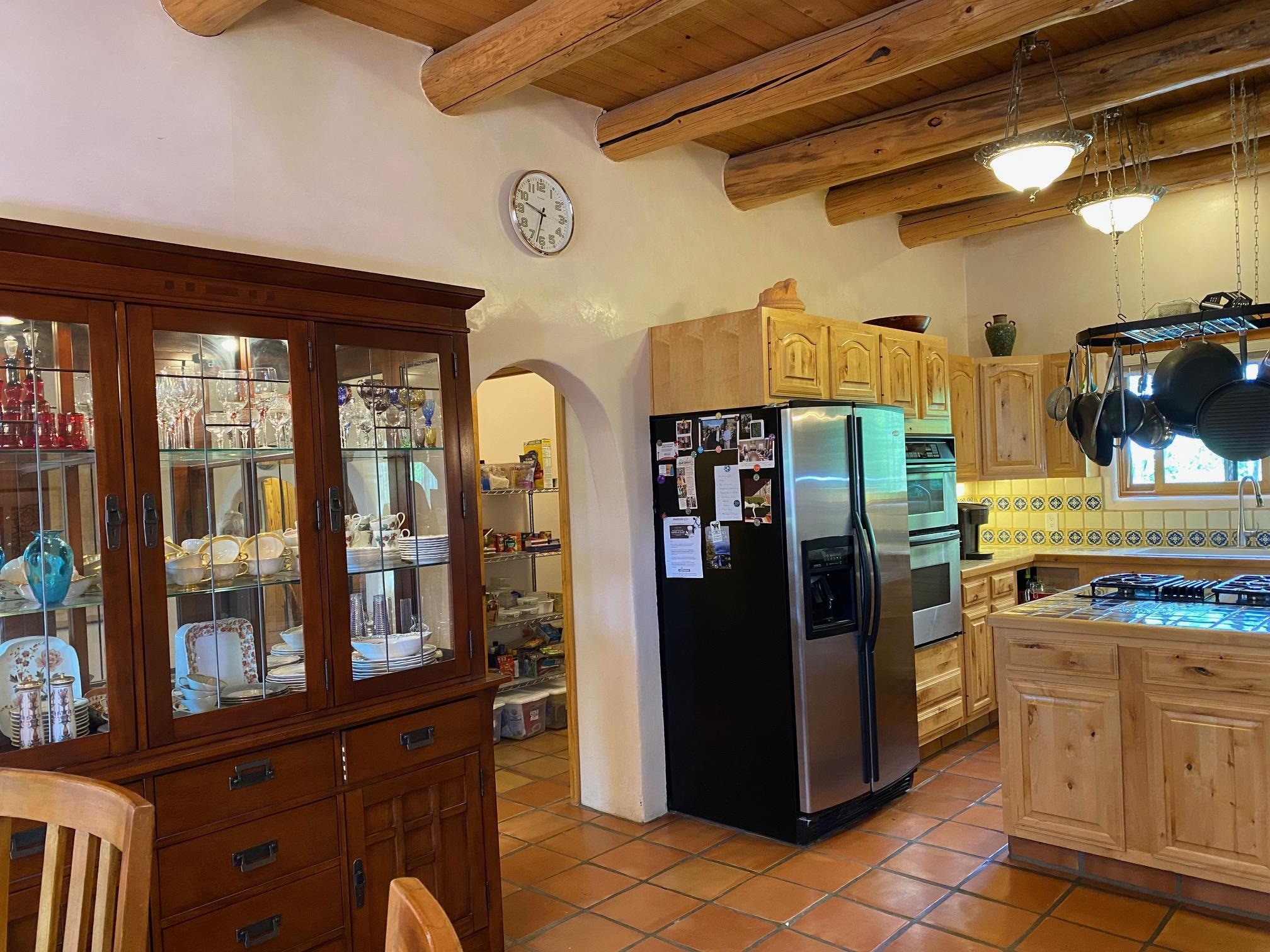 Canon Oasis! Lush gardens and a shady entry courtyard welcome you to to this immaculate home less than two miles from Taos Plaza. Saltillo tile floors and viga ceilings embrace the flavor of southwestern detailing throughout. In-floor radiant heat and ceiling fans maintain comfortable temperatures year round. With three bedrooms, 2.5 bathrooms, an office and over 2200 sq ft, of interior living space there is ample room for hosting and entertaining guests. The great room features soaring ceilings with vigas and two distinct living areas. Cuddle up in front of the southwestern style fireplace on one side or engage in conversation or a watch movie on the other. The breakfast area leads to a covered patio and gardens beyond. Archways lead to the formal dining room and kitchen. Be sure not to miss the details on the cooktop island or the view of the garden from above the kitchen sink. There's a convenient pantry tucked behind the kitchen and a powder room and laundry. Primary and guest bedrooms are located down the hall in the west wing of the residence. There is a dedicated office. Two other guest bedrooms and common bathroom lay beyond. The primary bedroom is spacious with its own southwestern style fireplace and access to the gardens. It's primary bathroom has double sinks, a separate shower and corner jetted tub to get away from it all. A walk-in closet provides an amazing amount of storage! At the rear of the heated two-car garage is an artists studio with exterior access and privacy that awaits your creativity. Valley land is fed by an acequia. More than sixty trees occupy the property --- many fruit ---- and a grand-father willow tree canopies the back yard. Extensive flagstone patios and walkways wind through rose gardens and flower beds leading to a wisteria covered sombra. There is even a fenced area for four-legged family members and a detached shed for seasonal storage and gardening tools. The neighborhood paths lead to endless Carson National Forest hiking trails. This property is one of a kind in so many ways. Truly magical and rare elegance abounds!