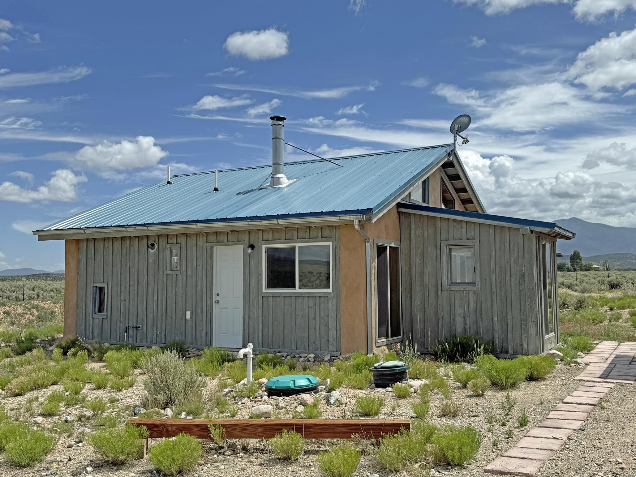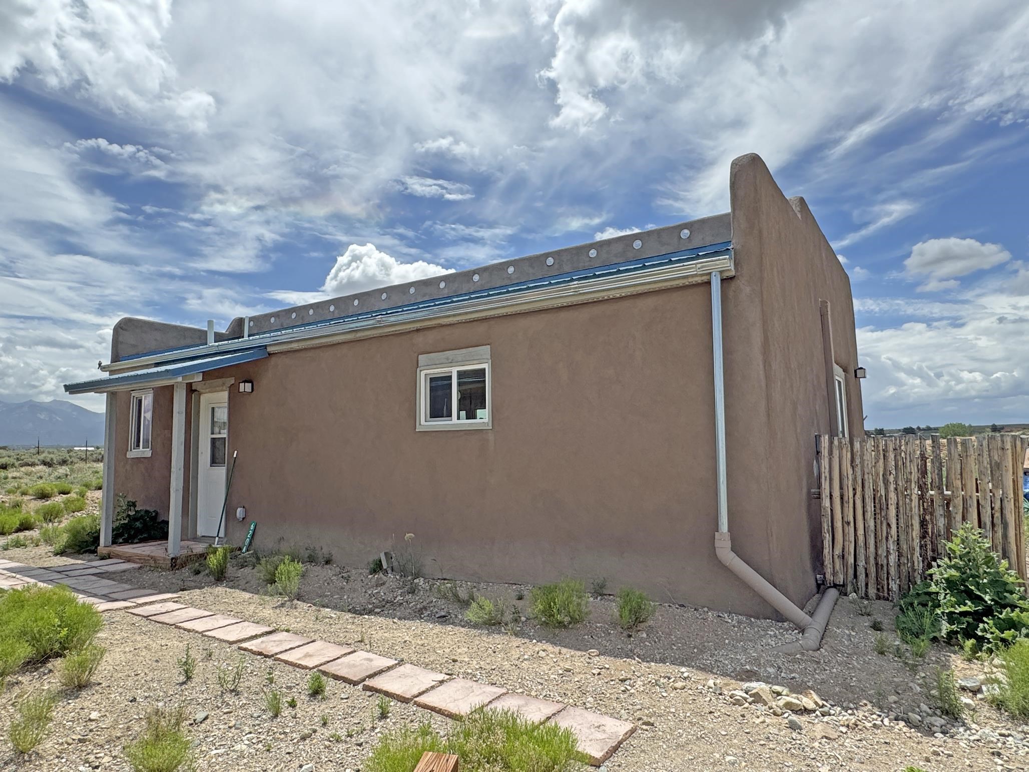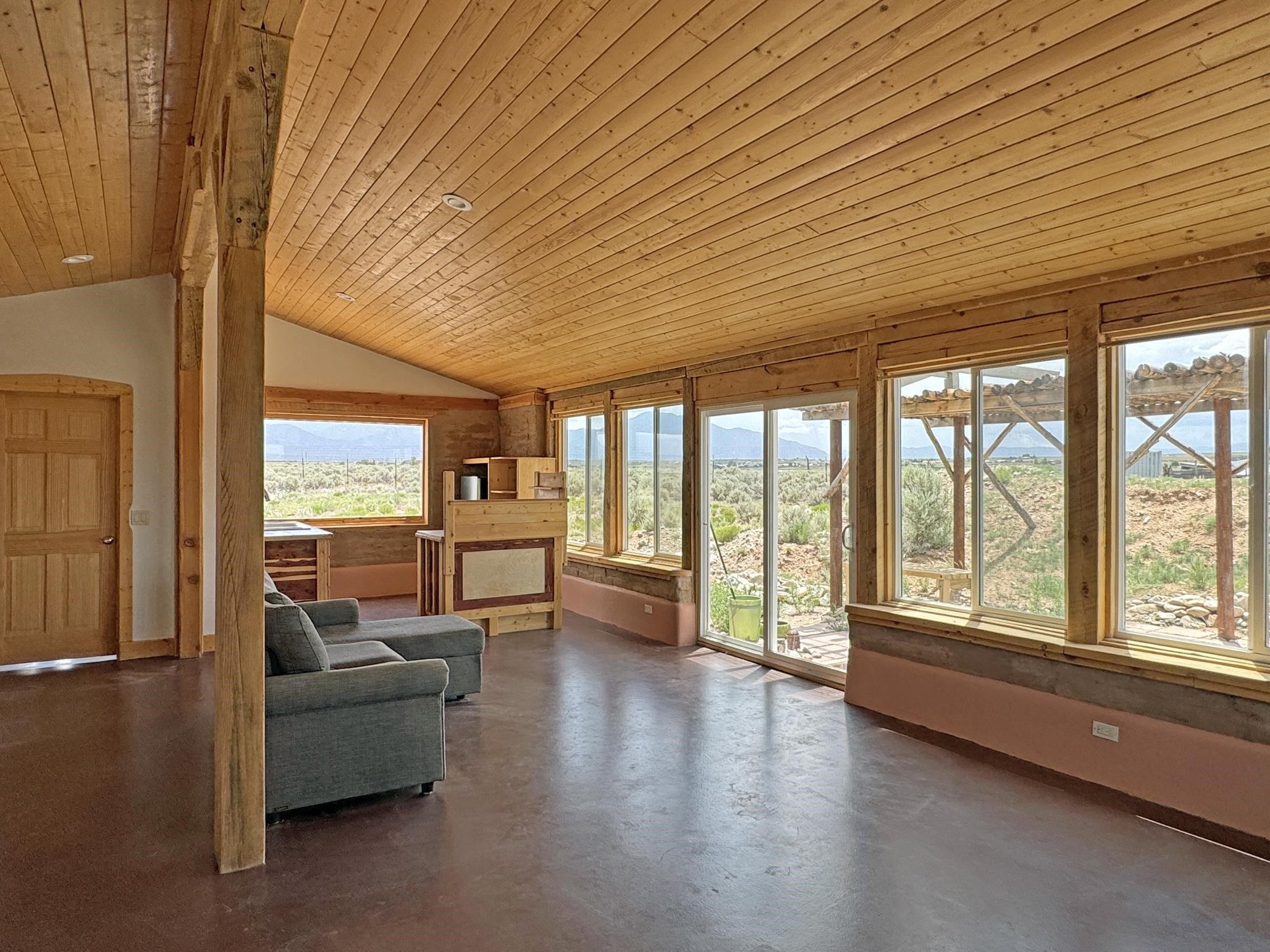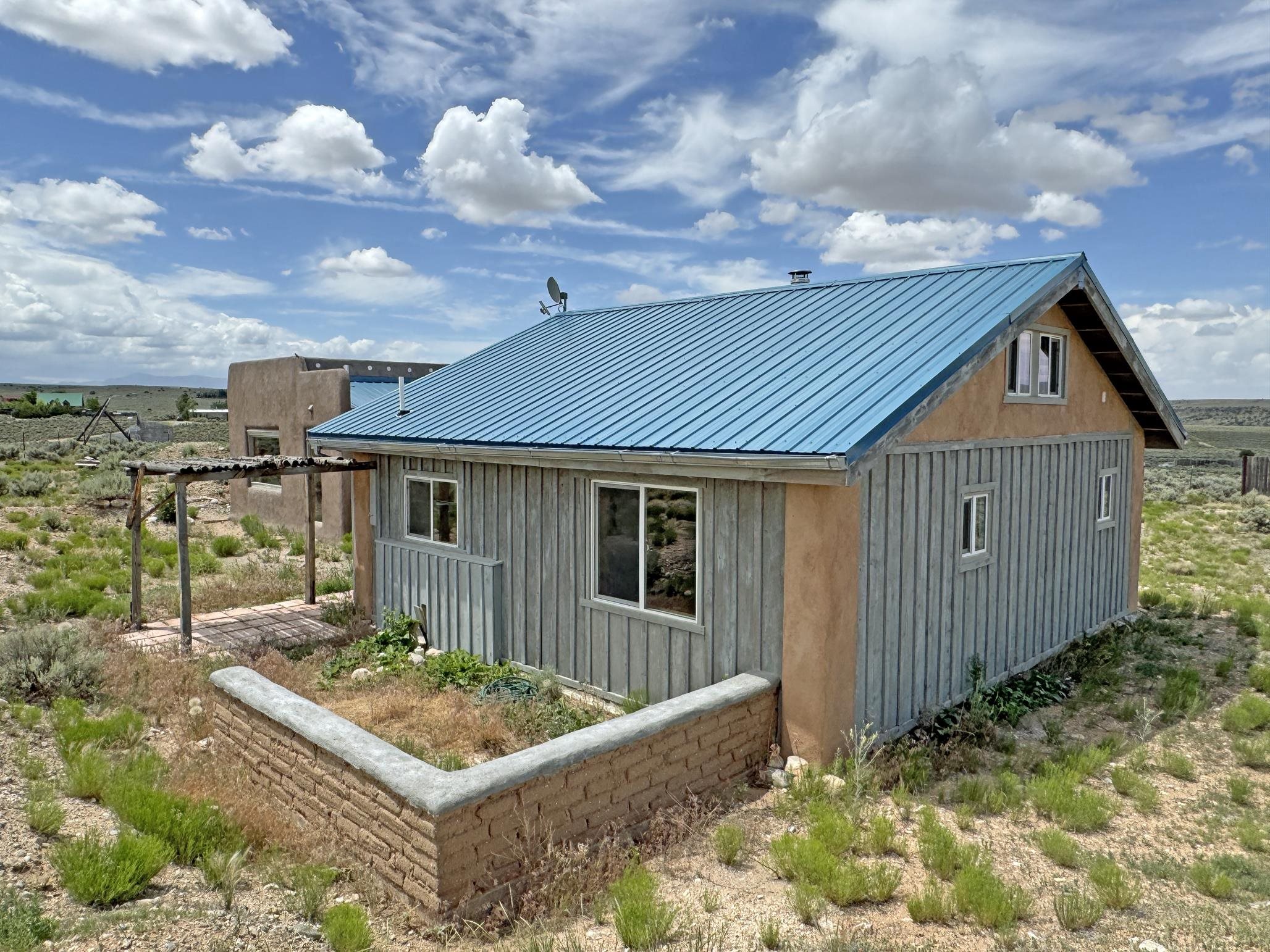 Here’s a flexible property featuring two 700 square feet casitas on 2.53 unrestricted acres! Main house constructed in 2017 has entry mud room and open living/dining/kitchen areas with lots of windows framing wrap around views of sunset, Taos Mountain and Sangre de Cristo Mountains. Painted concrete floors with in floor radiant heat. Pitched tongue and groove ceiling, ceiling fan and woodstove maintain comfortable temperatures year round. Easily accessible, finished loft with cabinets provides ample storage. Cook’s kitchen has granite tile countertops, is wired for under counter lighting, and has a propane gas range and fridge. Comfortable bedroom with T&G and beams ceiling features a spacious ensuite bathroom with cast iron tub, personal shower and ample linen storage. Mechanical/utility room includes a washer which conveys with sale and storage shelving. On the north side is a sweet exposed adobe wall courtyard containing a paver stone patio and latilla ramada, perfect for dining al fresco and star gazing. Pitched Propanel roof delivers water catchment for a 1700 gallon buried cistern in lieu of conventional well. Seller typically orders supplemental water 1-2 times a year for a cost of approximately $230 each delivery of 1700 gallons. Exterior siding is a combination of stucco and Cape Cod wood siding. Guest house is 714 square feet of flexible space built in 2023 featuring kitchenette with fridge, full bath, wood stove, exposed adobes, and vaulted T&G ceiling with beams and columns. Comfortable full bathroom with linen storage, tub and shower. This structure is heated and cooled with a heat pump mini split system. This space could serve as a studio/workshop, studio apartment rental, or additional property living space. Painted cement floors and wrap around windows with mountain views. Entertain outside with a latilla ramada over paver stone patio. Propanel metal shed roof is plumbed for cistern catchment. Landscape berms cradle both structures, adding privacy and providing a canvass for gardeners. Taosnet broadband Internet in both houses (Kit Carson fiber optic in Tune Drive); cell service on site. Located on a rise with stellar 360 degree views and easy walk to the Rio Grande Gorge and John Dunn bridge, Mamby/Stagecoach and Black Rock springs. GPS: 36.52508202679919, -05.70209218650817. Approximately one acre around the structures is fully fence with a farm gate at the entrance. Wood board fencing provides additional privacy. Circle drive and ample guest parking. Property could be subdivided into three separate parcels. Electric transformer has been installed in lower part of property for future development. All construction county permitted with C/Os in Associated Documents. Seller has left firewood, Colorado red flagstone, adobe bricks and new generator in the original box for the buyer. Approximately twenty minutes from Taos Plaza and half an hour from Taos Ski Valley. Only half a mile off the paved road. This quiet, peaceful property could be developed into three residential properties, a family compound, investment rentals, or horse property. So many options for this creative, energy efficient property built with love!