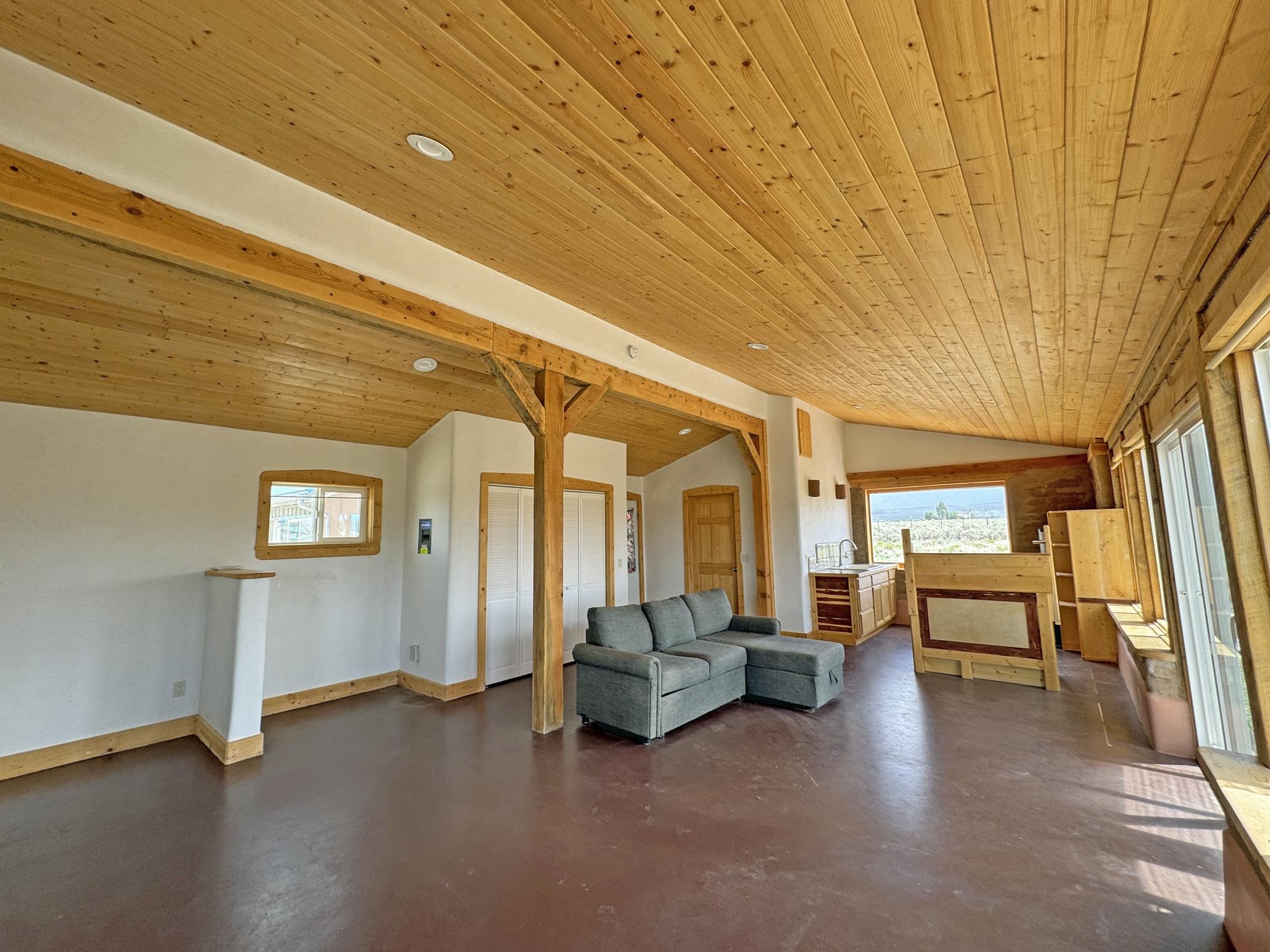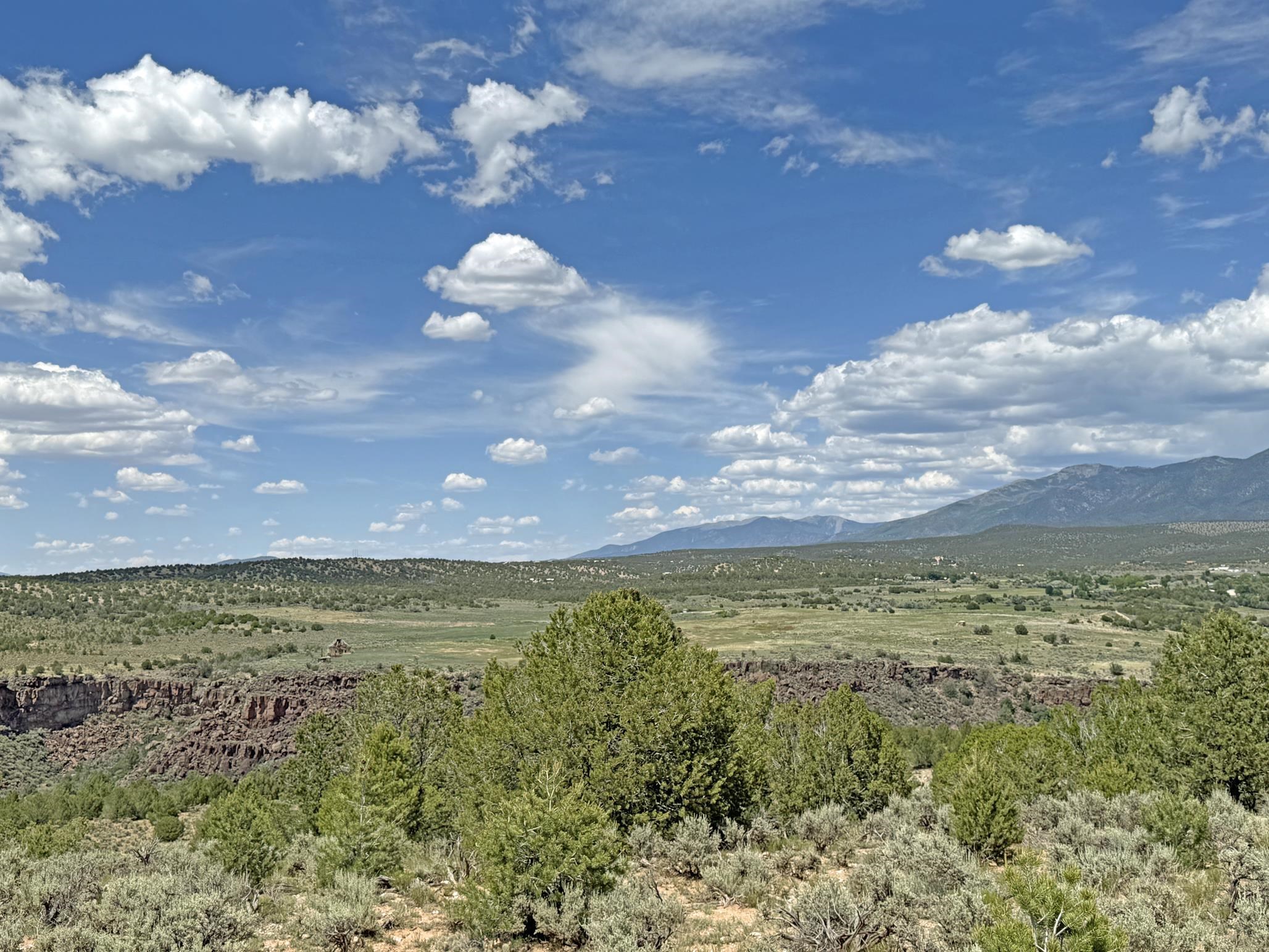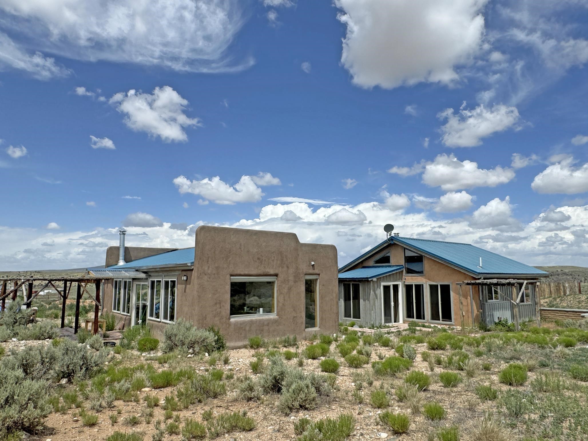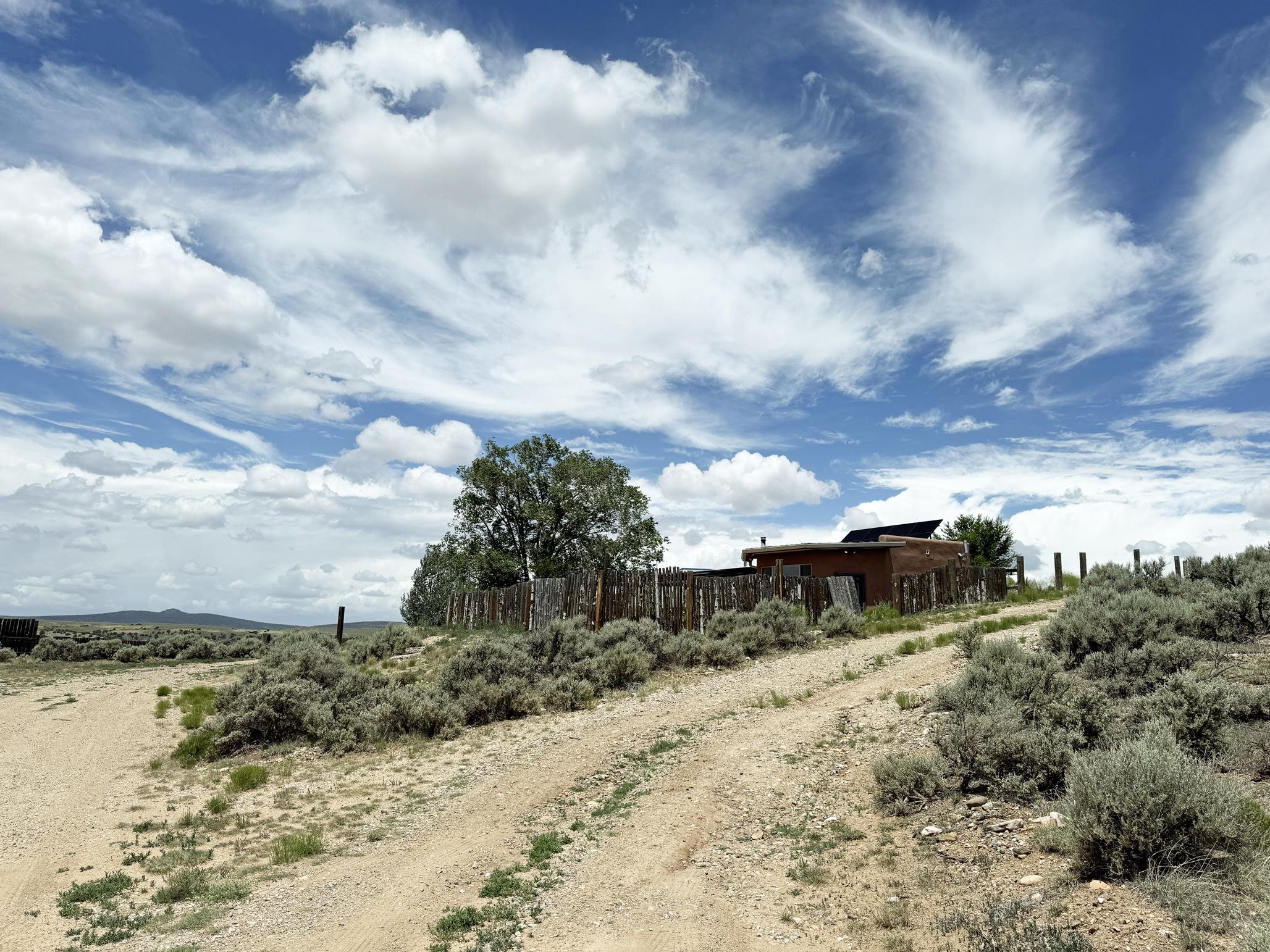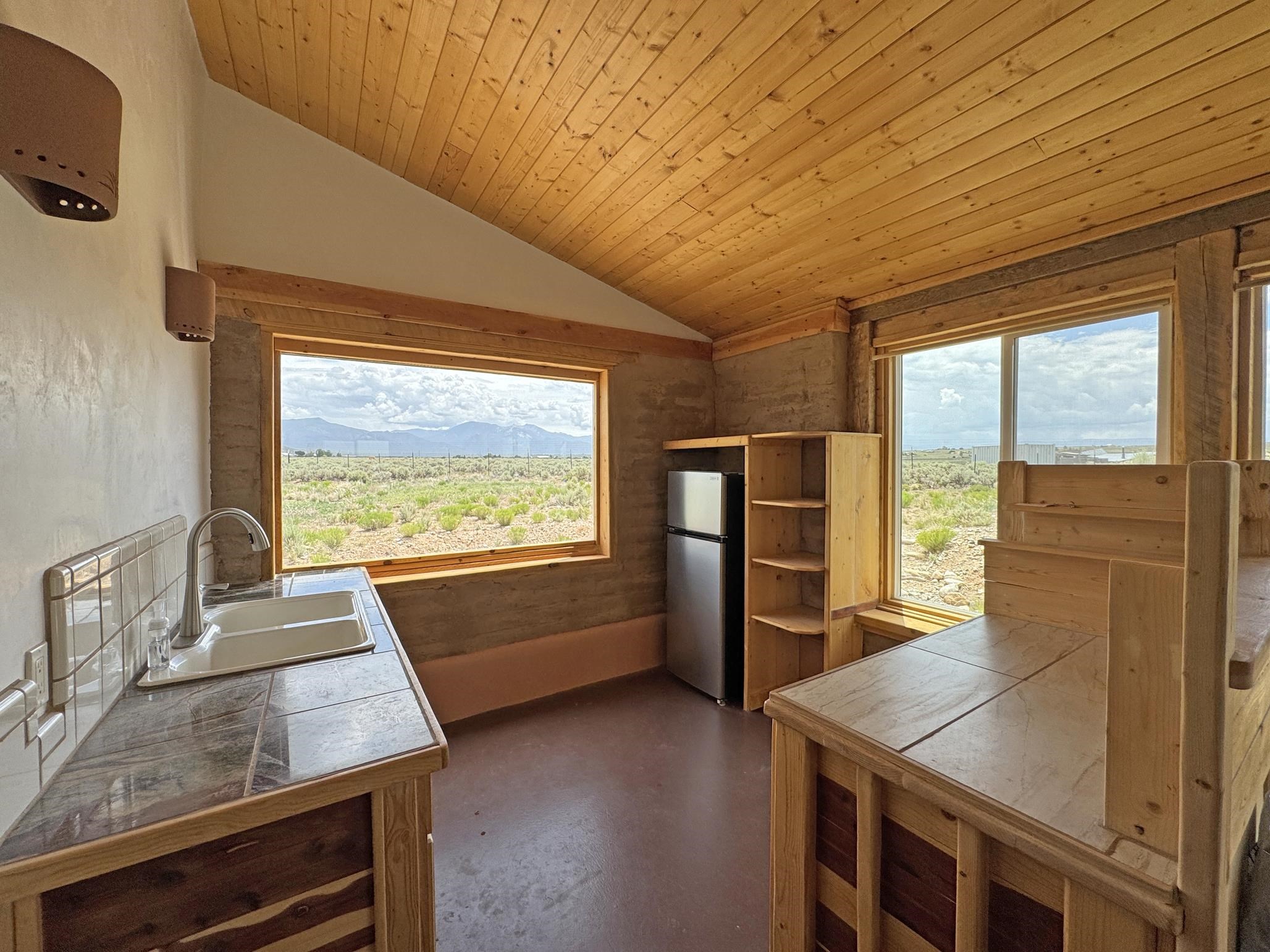 Here’s a flexible property featuring two 700 square feet casitas on 2.53 unrestricted acres! Main house constructed in 2017 has entry mud room and open living/dining/kitchen areas with lots of windows framing wrap around views of sunset, Taos Mountain and Sangre de Cristo Mountains. Painted concrete floors with in floor radiant heat. Pitched tongue and groove ceiling, ceiling fan and woodstove maintain comfortable temperatures year round. Easily accessible, finished loft with cabinets provides ample storage. Cook’s kitchen has granite tile countertops, is wired for under counter lighting, and has a propane gas range and fridge. Comfortable bedroom with T&G and beams ceiling features a spacious ensuite bathroom with cast iron tub, personal shower and ample linen storage. Mechanical/utility room includes a washer which conveys with sale and storage shelving. On the north side is a sweet exposed adobe wall courtyard containing a paver stone patio and latilla ramada, perfect for dining al fresco and star gazing. Pitched Propanel roof delivers water catchment for a 1700 gallon buried cistern in lieu of conventional well. Seller typically orders supplemental water 1-2 times a year for a cost of approximately $230 each delivery of 1700 gallons. Exterior siding is a combination of stucco and Cape Cod wood siding. Guest house is 714 square feet of flexible space built in 2023 featuring kitchenette with fridge, full bath, wood stove, exposed adobes, and vaulted T&G ceiling with beams and columns. Comfortable full bathroom with linen storage, tub and shower. This structure is heated and cooled with a heat pump mini split system. This space could serve as a studio/workshop, studio apartment rental, or additional property living space. Painted cement floors and wrap around windows with mountain views. Entertain outside with a latilla ramada over paver stone patio. Propanel metal shed roof is plumbed for cistern catchment. Landscape berms cradle both structures, adding privacy and providing a canvass for gardeners. Taosnet broadband Internet in both houses (Kit Carson fiber optic in Tune Drive); cell service on site. Located on a rise with stellar 360 degree views and easy walk to the Rio Grande Gorge and John Dunn bridge, Mamby/Stagecoach and Black Rock springs. GPS: 36.52508202679919, -05.70209218650817. Approximately one acre around the structures is fully fence with a farm gate at the entrance. Wood board fencing provides additional privacy. Circle drive and ample guest parking. Property could be subdivided into three separate parcels. Electric transformer has been installed in lower part of property for future development. All construction county permitted with C/Os in Associated Documents. Seller has left firewood, Colorado red flagstone, adobe bricks and new generator in the original box for the buyer. Approximately twenty minutes from Taos Plaza and half an hour from Taos Ski Valley. Only half a mile off the paved road. This quiet, peaceful property could be developed into three residential properties, a family compound, investment rentals, or horse property. So many options for this creative, energy efficient property built with love!