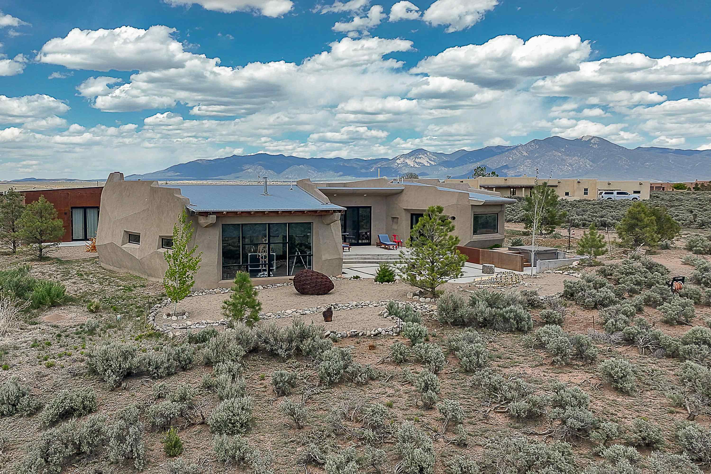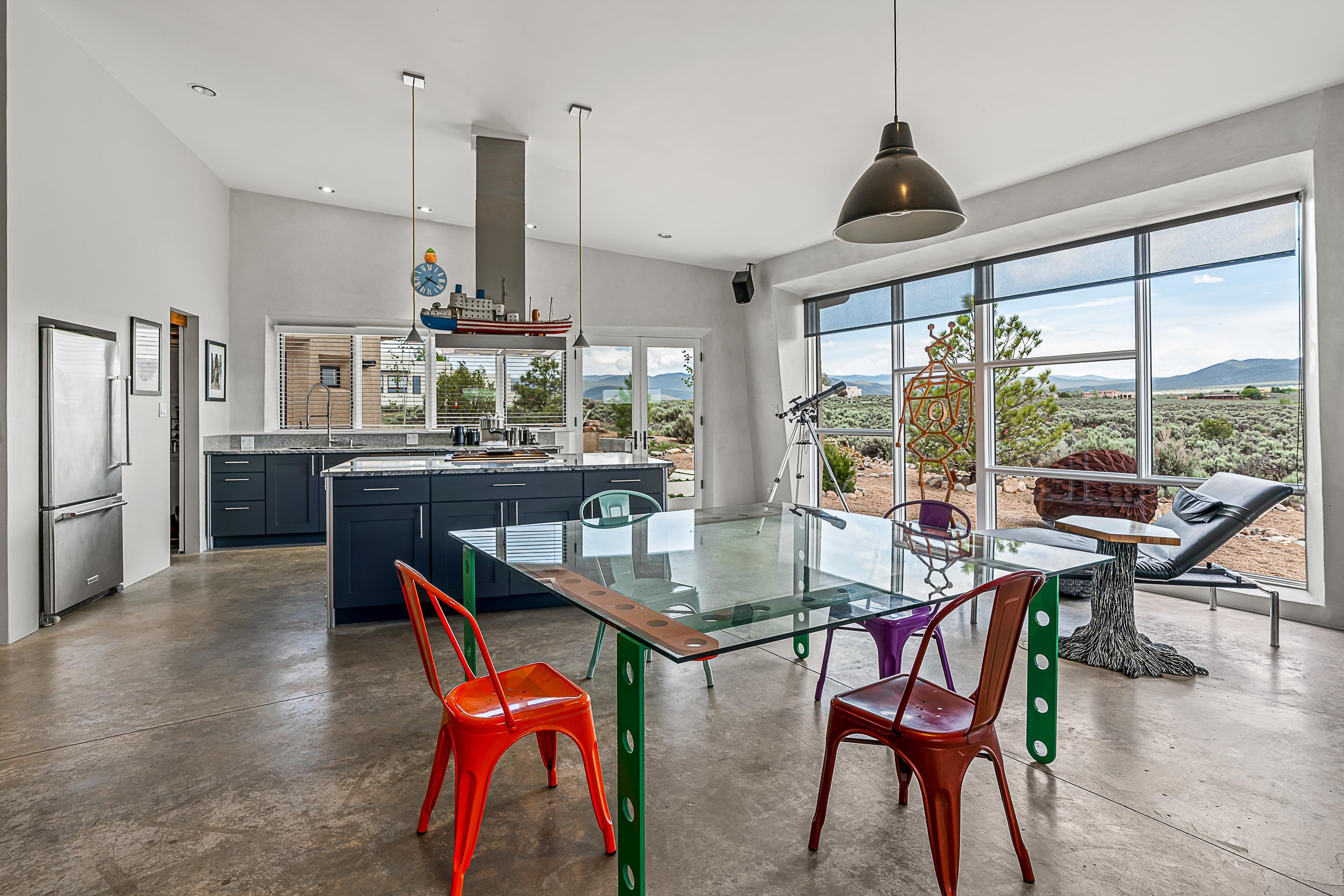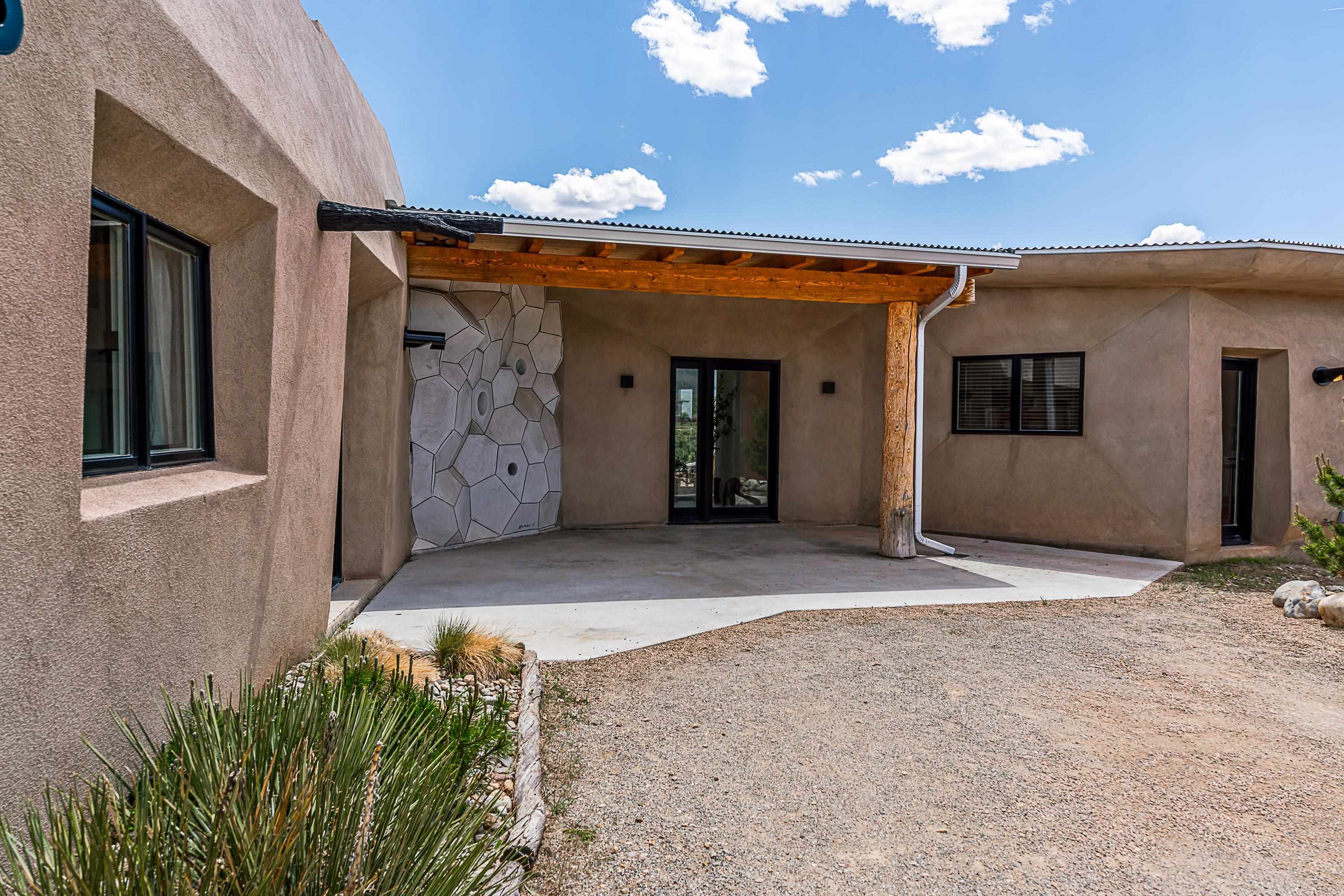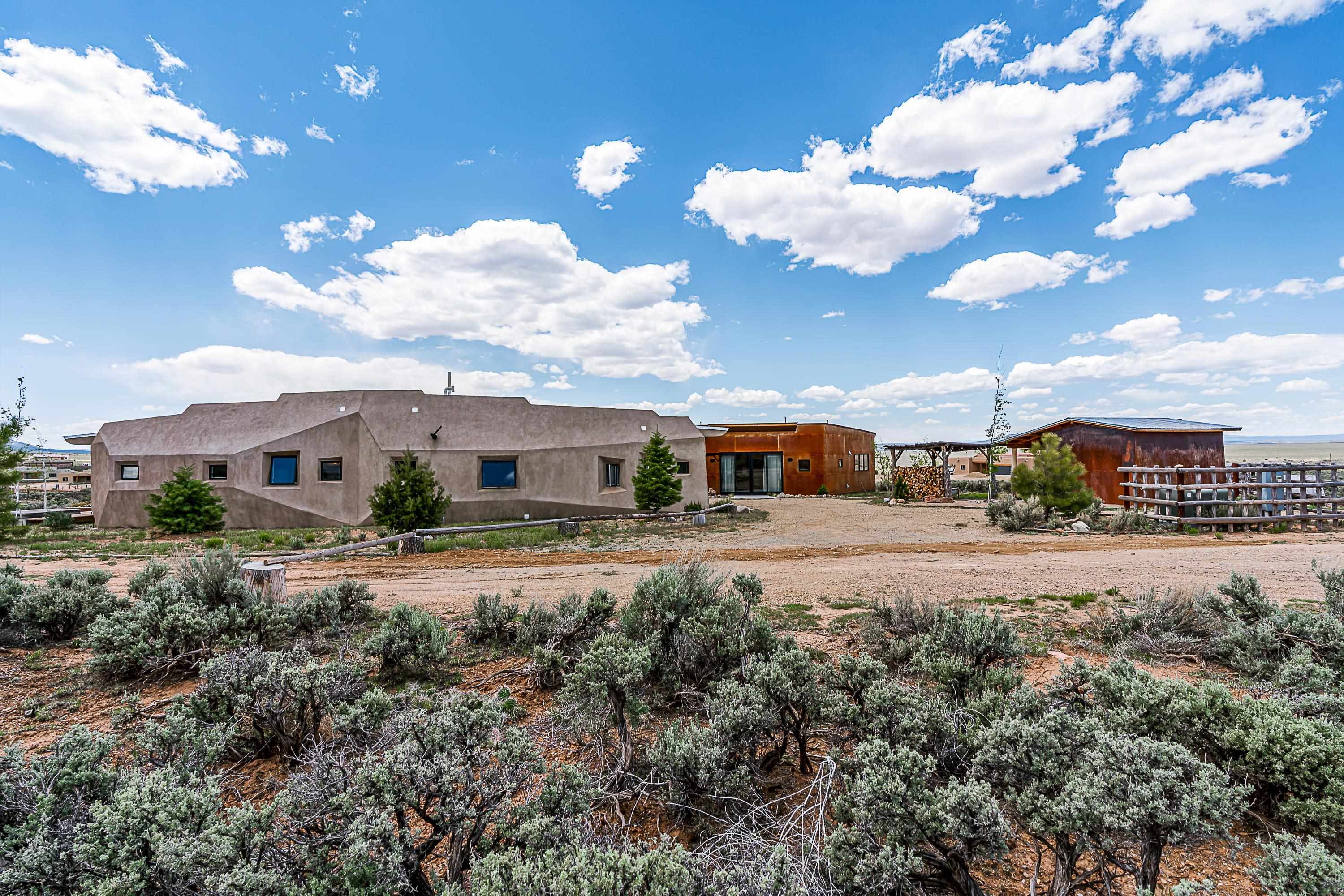 Live inside a work of art in this Artist's Dream Dwelling in Taos. Welcome to ATOMICA- a home unlike any other- where art, nature and architecture meet in perfect, unconventional harmony. Designed and built by internationally acclaimed visionary artist Allan Packer, this inspiring Taos retreat is anything but ordinary. The property consists of a house, a guesthouse, and a studio on 3 acres. Organic, offbeat and unconventional in the best possible way. Sculpted thick pumice walls and large windows incorporate and frame the stunning views into a magical, serene space imagined to inspire. The layout defies expectation- fluid and intuitive, built to honor light, shadow and the surrounding land. The main house consists of 2 suites radiating off a large great room made up of an impressive kitchen space and a cozy sunken living room anchored by a whimsical fireplace. Step right out onto the stunning back patio with a firepit, hot tub and jaw dropping views in every direction. The guesthouse is fully equipped with a kitchen and has an established history of rental income. Set atop a peaceful rise, tucked near the edge of the Rio Grande del Norte National Monument, you're just minutes from breathtaking hikes where bighorn sheep roam, epic mountain biking trails, and the quiet power of the river below. The home also overlooks the 16th hole of the Taos Country Club and golf course, blending wild nature with wide-open fairways. This is not just a home-it's a living, breathing work of art. It's a space for dreamers, makers and seekers. Whether you're an artist, writer, hardcore recreationalist or someone simply craving authenticity and soul in a sea of sameness, this home offers something rare: a chance to live in art, not just hang it on the wall. One-of-a-kind. Off the beaten path. Totally Taos. Serious inquiries only. Magic lives here.