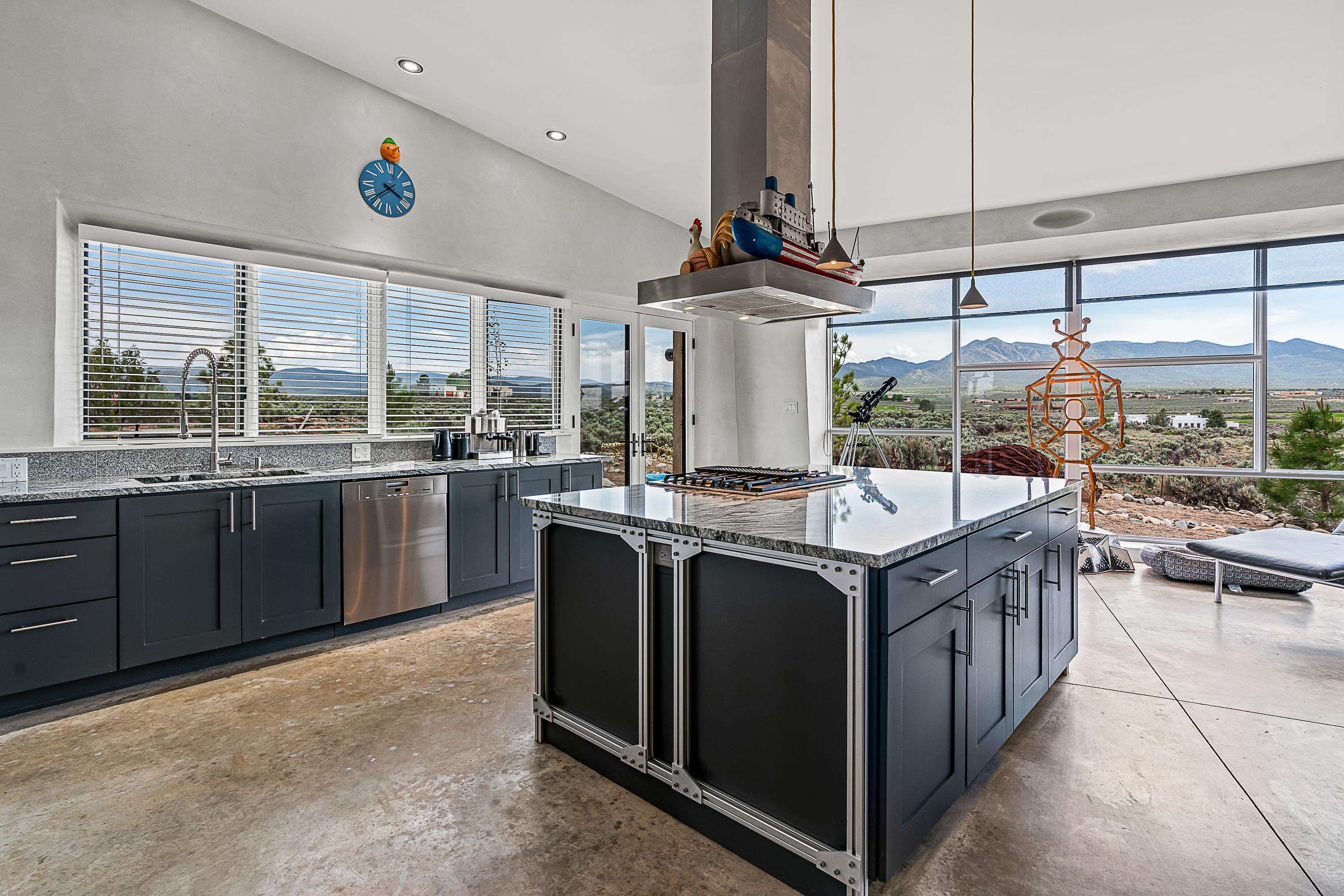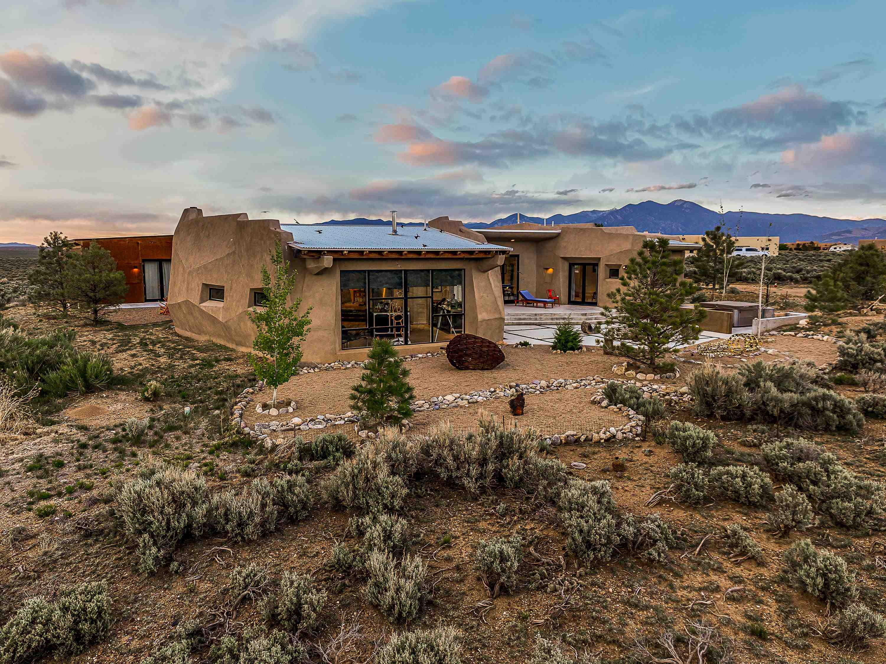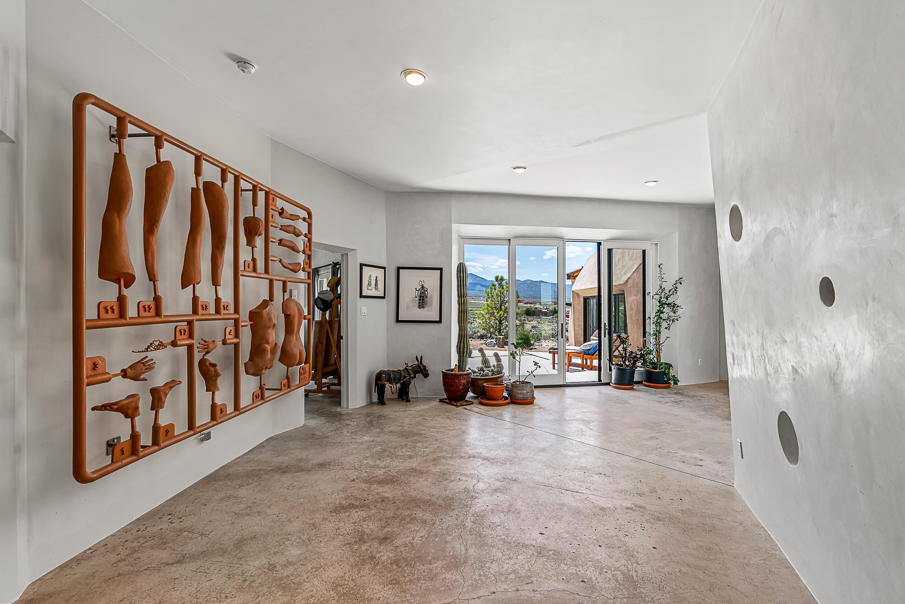 Live inside a work of art in this Artist's Dream Dwelling in Taos. Welcome to ATOMICA- a home unlike any other- where art, nature and architecture meet in perfect, unconventional harmony. Designed and built by internationally acclaimed visionary artist Allan Packer, this inspiring Taos retreat is anything but ordinary. The property consists of a house, a guesthouse, and a studio on 3 acres. Organic, offbeat and unconventional in the best possible way. Sculpted thick pumice walls and large windows incorporate and frame the stunning views into a magical, serene space imagined to inspire. The layout defies expectation- fluid and intuitive, built to honor light, shadow and the surrounding land. The main house consists of 2 suites radiating off a large great room made up of an impressive kitchen space and a cozy sunken living room anchored by a whimsical fireplace. Step right out onto the stunning back patio with a firepit, hot tub and jaw dropping views in every direction. The guesthouse is fully equipped with a kitchen and has an established history of rental income. Set atop a peaceful rise, tucked near the edge of the Rio Grande del Norte National Monument, you're just minutes from breathtaking hikes where bighorn sheep roam, epic mountain biking trails, and the quiet power of the river below. The home also overlooks the 16th hole of the Taos Country Club and golf course, blending wild nature with wide-open fairways. This is not just a home-it's a living, breathing work of art. It's a space for dreamers, makers and seekers. Whether you're an artist, writer, hardcore recreationalist or someone simply craving authenticity and soul in a sea of sameness, this home offers something rare: a chance to live in art, not just hang it on the wall. One-of-a-kind. Off the beaten path. Totally Taos. Serious inquiries only. Magic lives here.