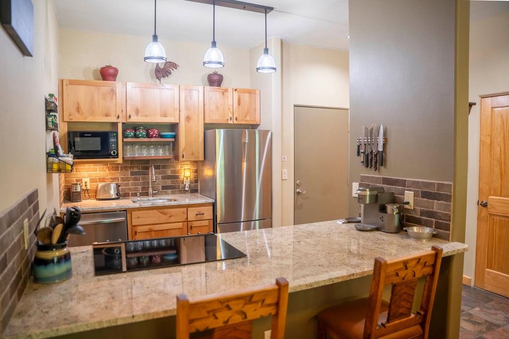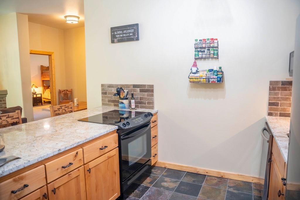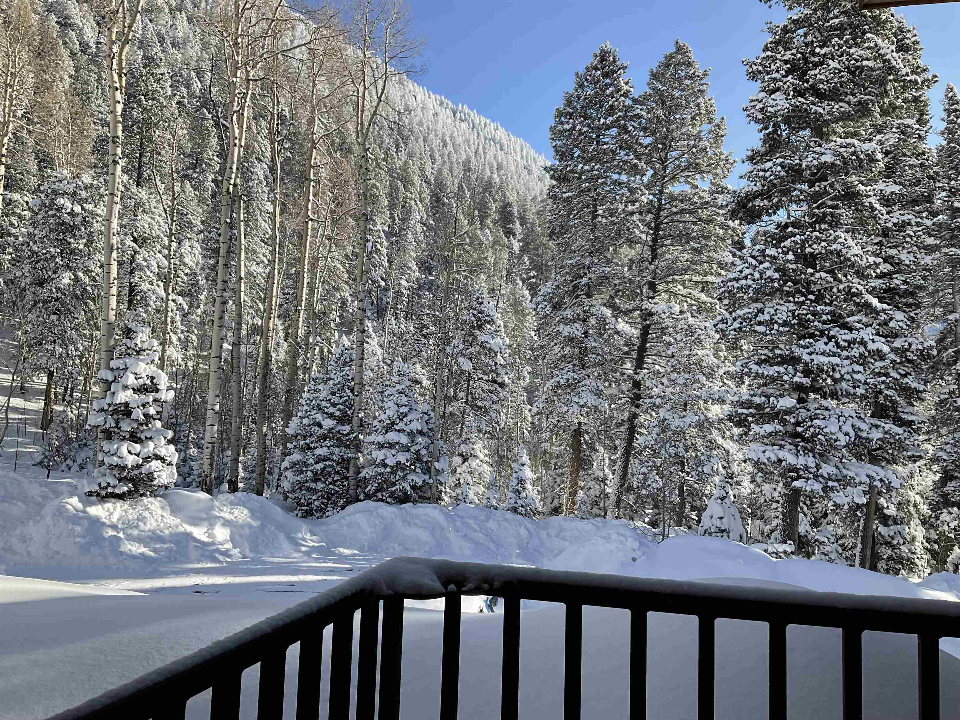 A Condo for All Seasons - Turnkey Living in Taos Ski Valley. Whether you're looking for a mountain getaway, a year-round residence, or an investment opportunity, this light-filled condo has it all. Just minutes from the base area of world-renowned Taos Ski Valley, this 2 bedroom, 1 bathroom unit offers 897 square feet of efficient, well-designed living space fully furnished and move-in ready. Stay warm and cozy in the winter with a natural gas fireplace in the living room and enjoy the convenience of your own covered parking space, a rare and valuable feature in the valley. Located in the charming Amizette area of the Village of Taos Ski Valley, this condo offers more than just a great location, it comes with access to a suite of amenities including a community exercise room, game room, laundry facilities, and a ski locker. Monthly COA dues cover water, sewer, gas, satellite TV, Wi-Fi, exterior maintenance, and snow removal making it easy to enjoy mountain living without the hassle. This spacious condo recently updated, features access by elevator, radiant in-floor heating, a gas fireplace, new kitchen appliances, and an east-facing balcony just off the living room with mountain views ideal for soaking in the morning sun and breathing in the mountain air. This unit also includes elevator access and its own covered parking. Monthly COA dues are $577.40 and include nearly all utilities except electricity. Outdoor enthusiasts will appreciate the easy access to hiking and biking trails, including the scenic Gavilan Canyon Trail and river, located right next door. This property’s location offers exceptional proximity to skiing, outdoor recreation, and year-round enjoyment of the mountains.