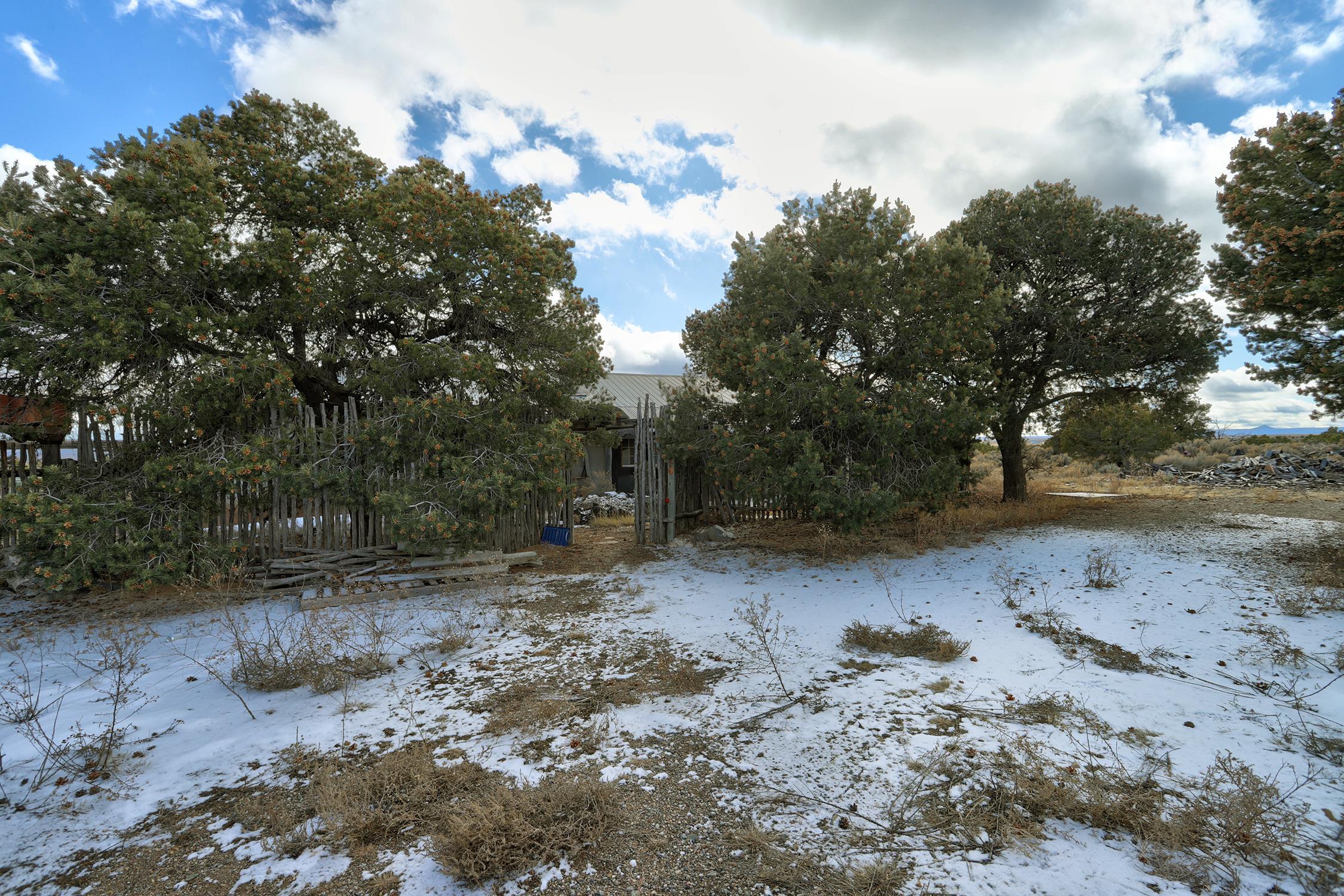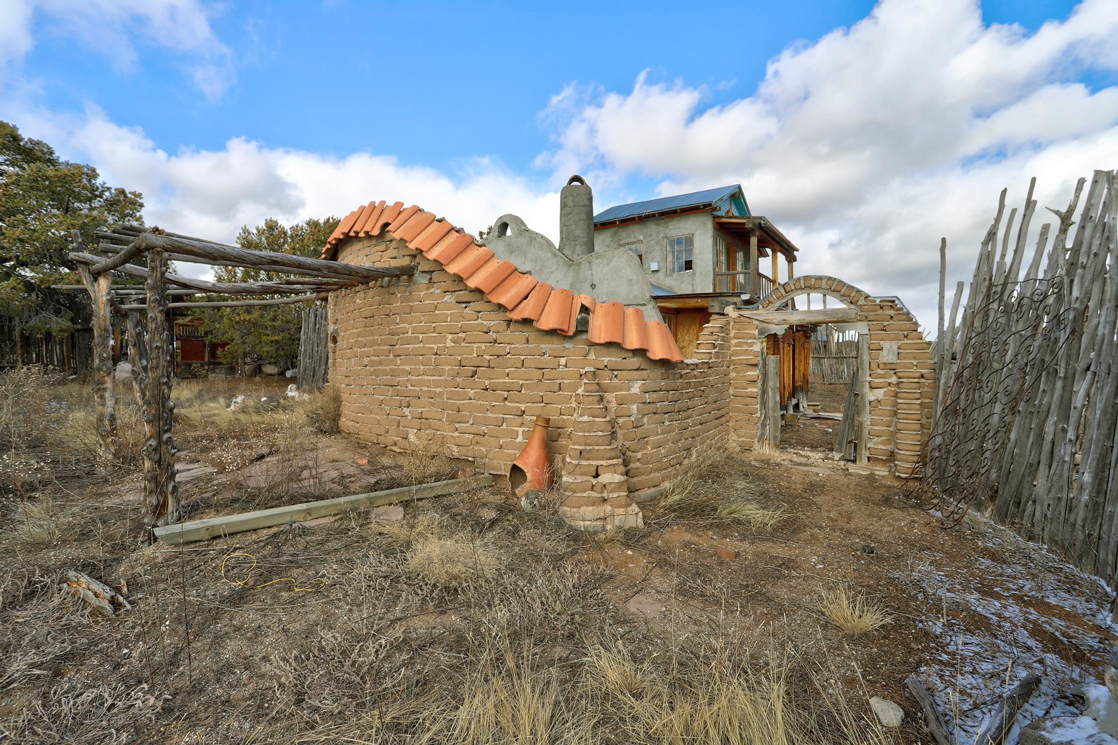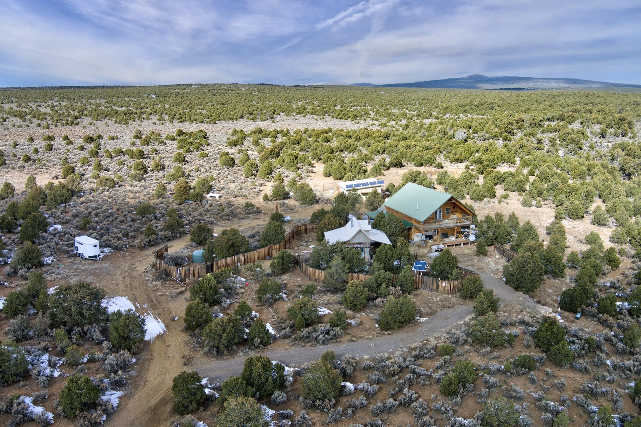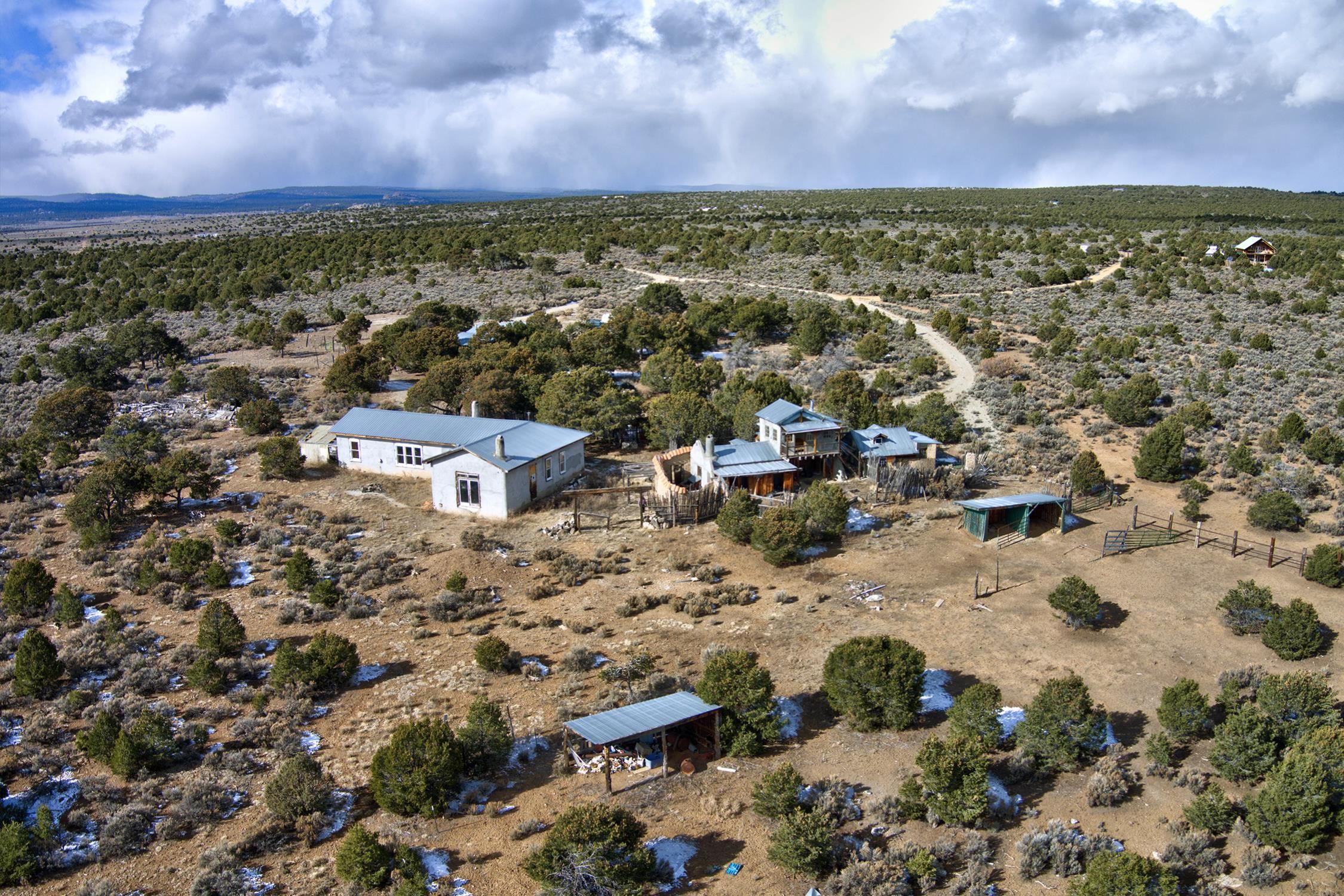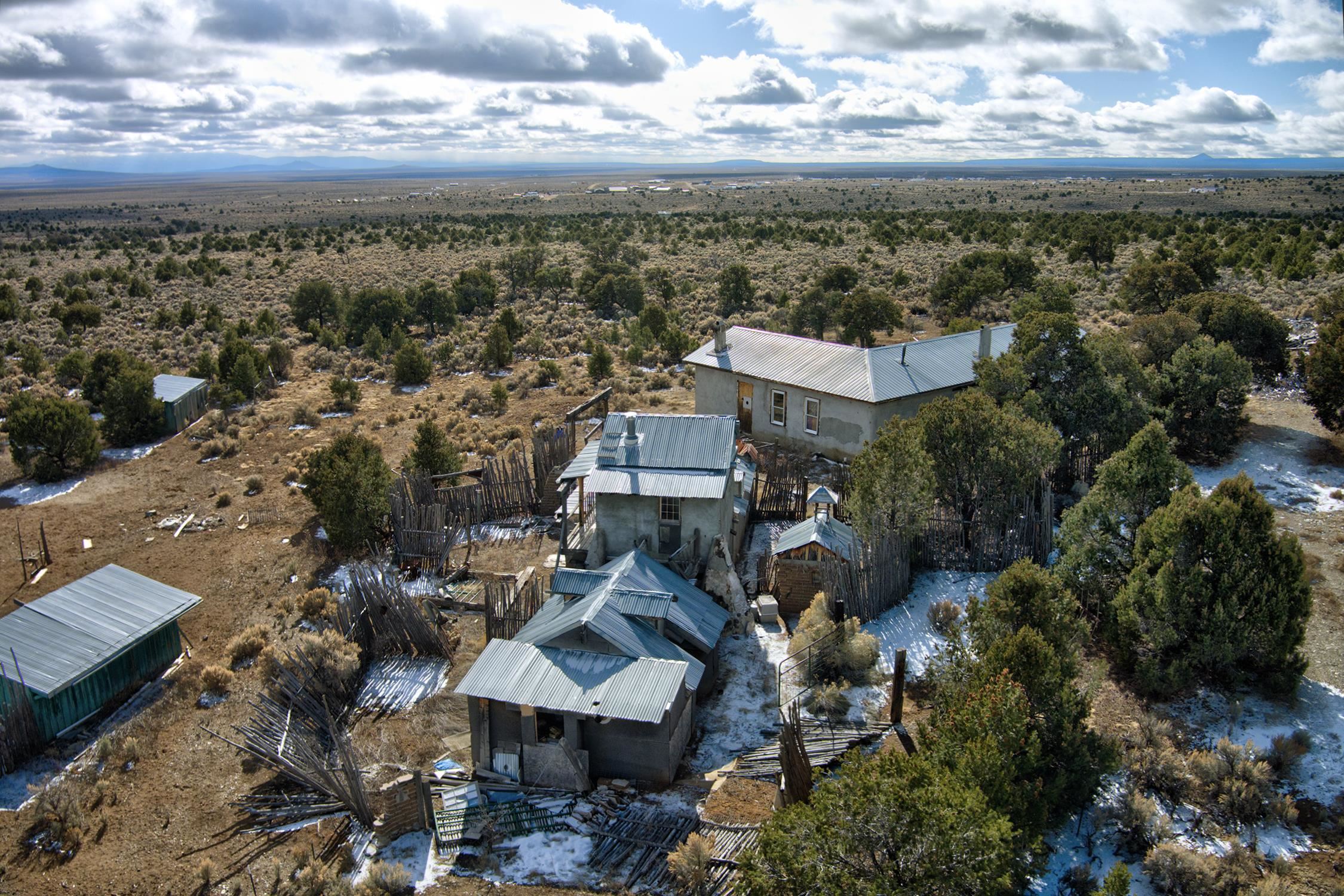 Welcome to Flying F Ranch, a rare 288.59-acre property where Southwestern charm meets sustainable living. With unobstructed views stretching 35 miles, this one-of-a-kind ranch is a rugged sanctuary awaiting your creative vision. Two primary residences provide plenty of space for everyone. Enjoy unmatched views from the second-floor primary suite and spacious covered balcony of the 2-bedroom, 1.5 bath chalet. The classic adobe home features a sunken living room 2 Carmen Velarde fireplaces, a wood stove, and a galley kitchen with custom tile countertops and backsplash and brick flooring. Outbuildings include a 2-room cabin, your own turn of the century adobe chapel, two hay barns, a workshop, garage and more. Plenty of space to roam, raise, or ride. We'll provide the bones and bling, you bring your imagination. Whether you're seeking a retreat, a working ranch, or an inspiring canvas for your dreams, Flying F Ranch is an offering unlike any other. A place of wild, panoramic freedom, where sunrises and starlit skies become daily rituals.