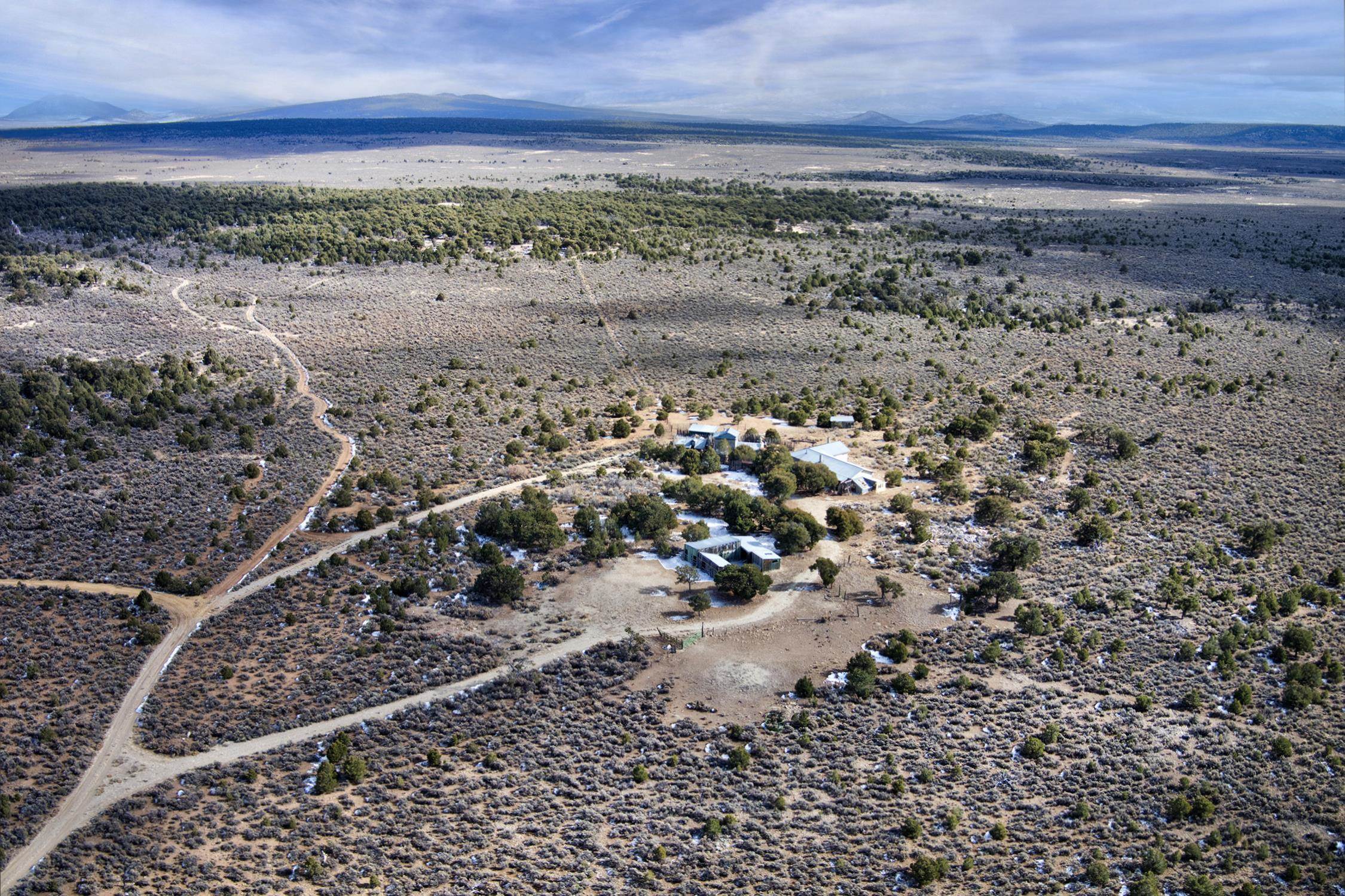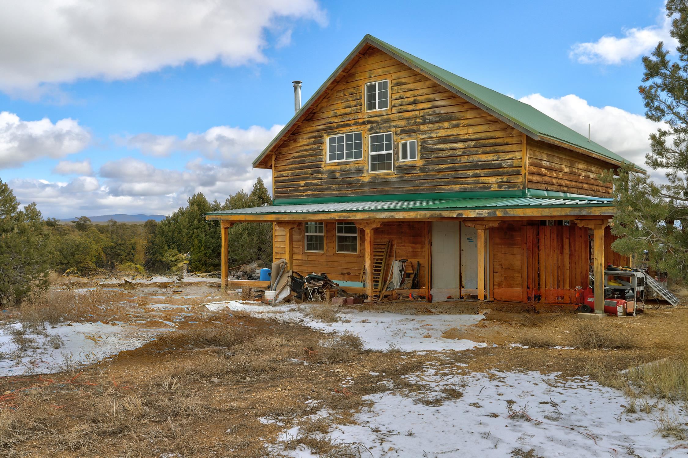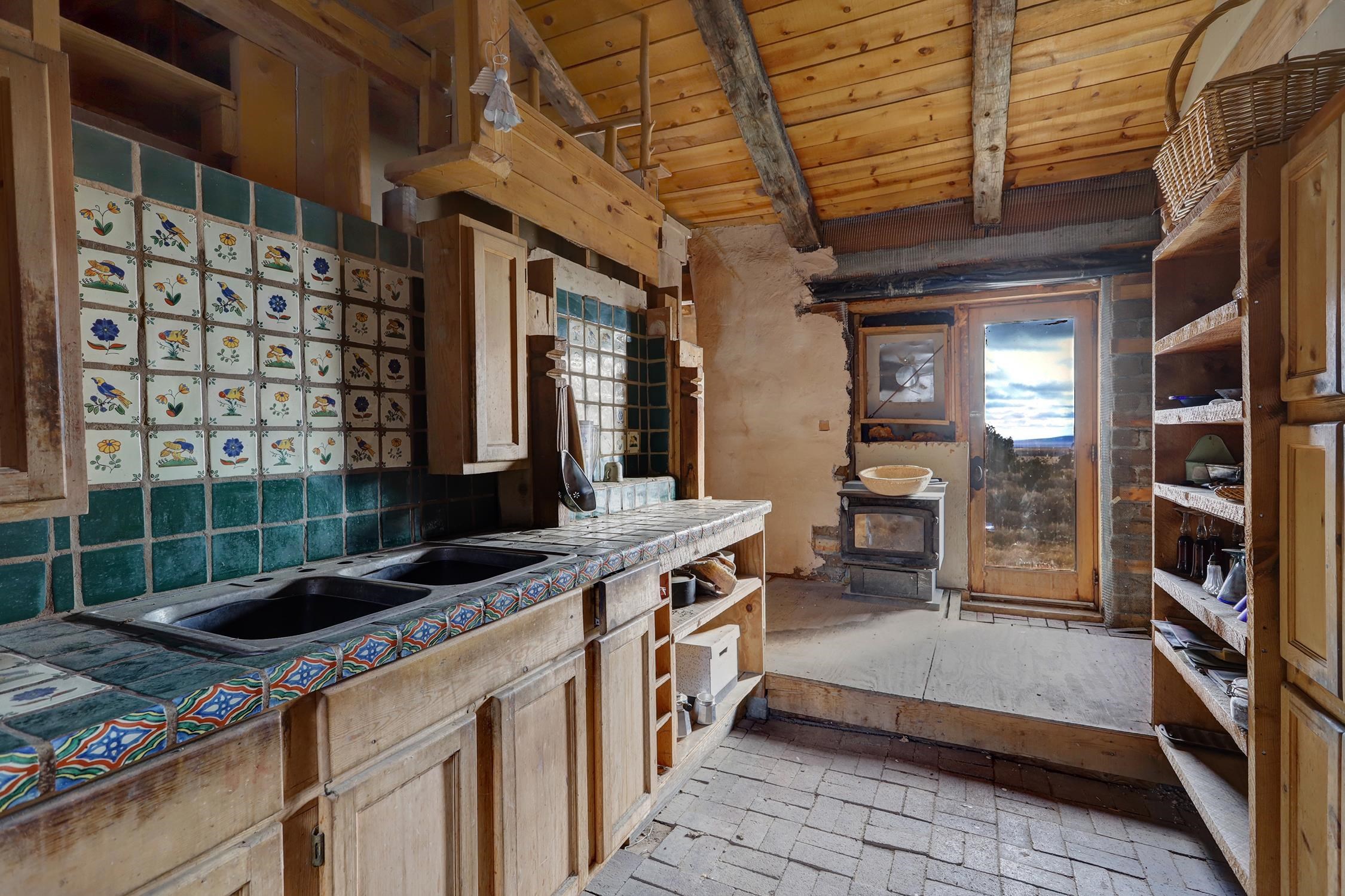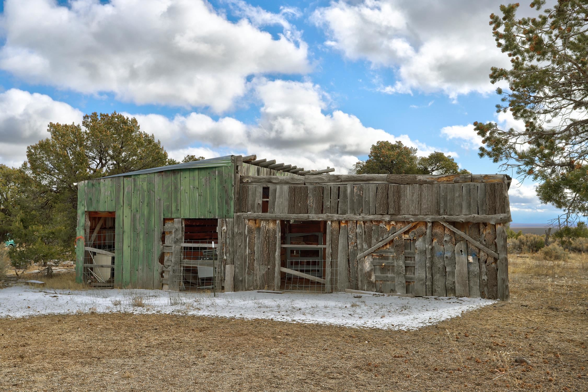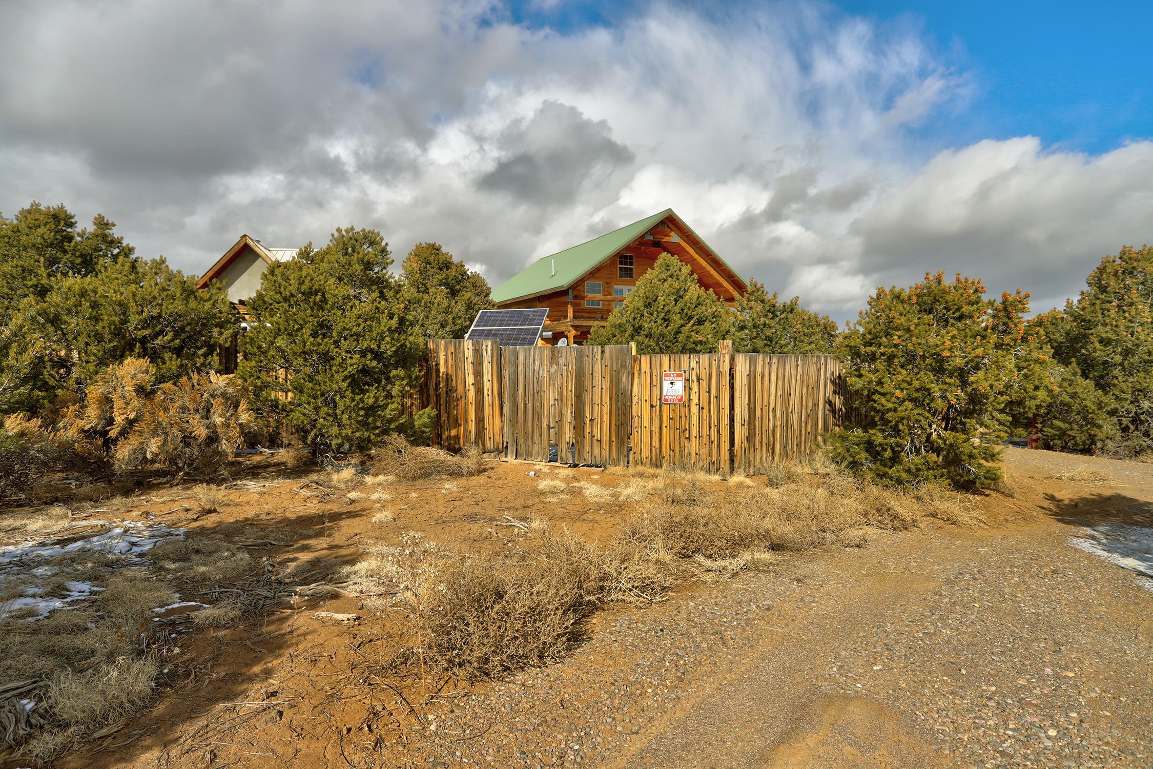 Welcome to Flying F Ranch, a rare 288.59-acre property where Southwestern charm meets sustainable living. With unobstructed views stretching 35 miles, this one-of-a-kind ranch is a rugged sanctuary awaiting your creative vision. Two primary residences provide plenty of space for everyone. Enjoy unmatched views from the second-floor primary suite and spacious covered balcony of the 2-bedroom, 1.5 bath chalet. The classic adobe home features a sunken living room 2 Carmen Velarde fireplaces, a wood stove, and a galley kitchen with custom tile countertops and backsplash and brick flooring. Outbuildings include a 2-room cabin, your own turn of the century adobe chapel, two hay barns, a workshop, garage and more. Plenty of space to roam, raise, or ride. We'll provide the bones and bling, you bring your imagination. Whether you're seeking a retreat, a working ranch, or an inspiring canvas for your dreams, Flying F Ranch is an offering unlike any other. A place of wild, panoramic freedom, where sunrises and starlit skies become daily rituals.
