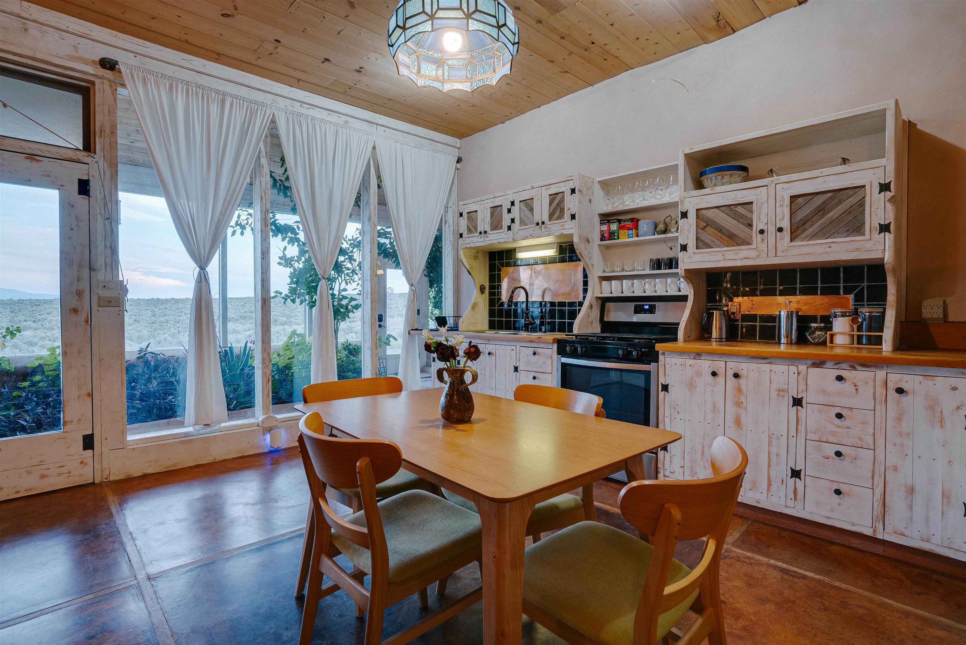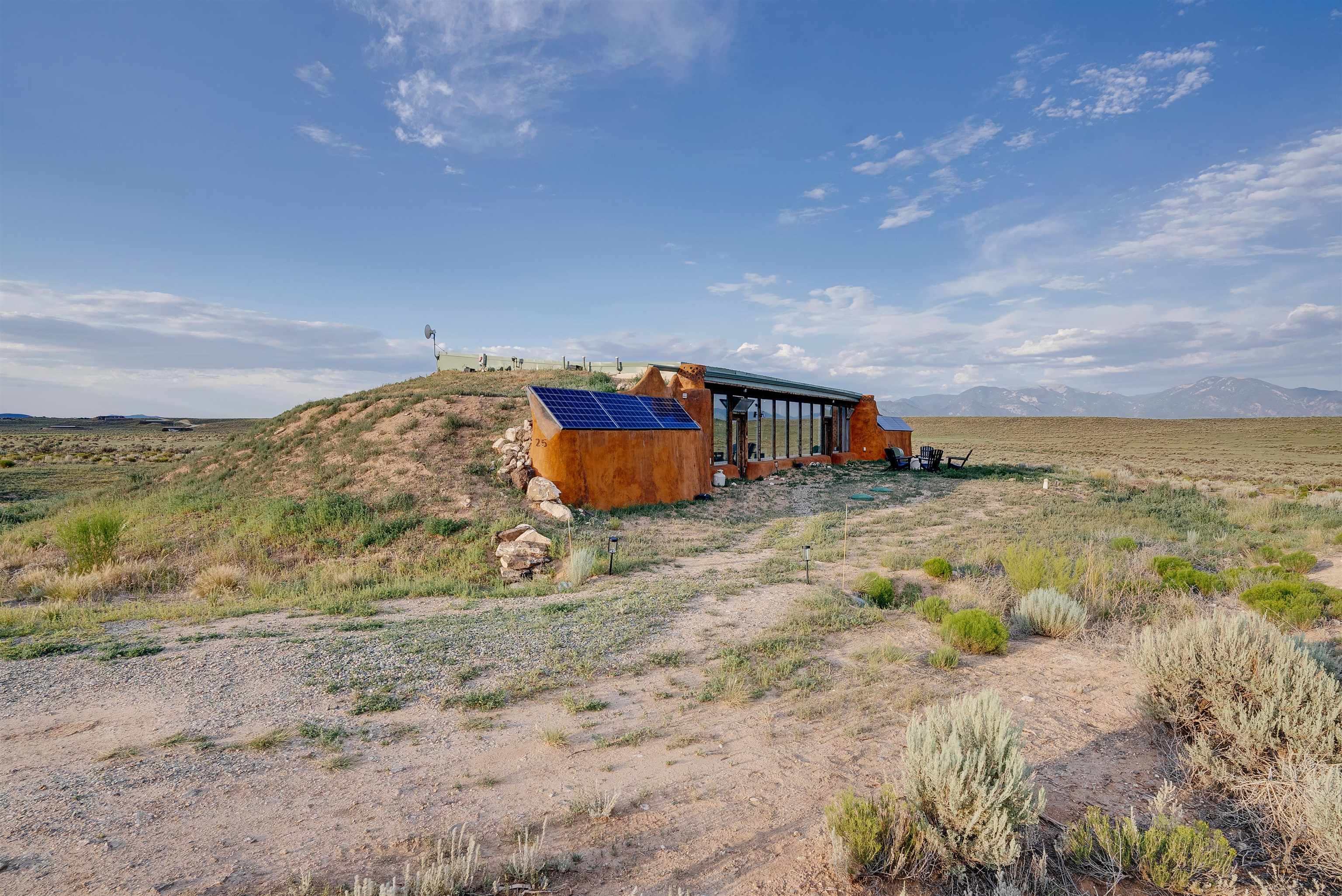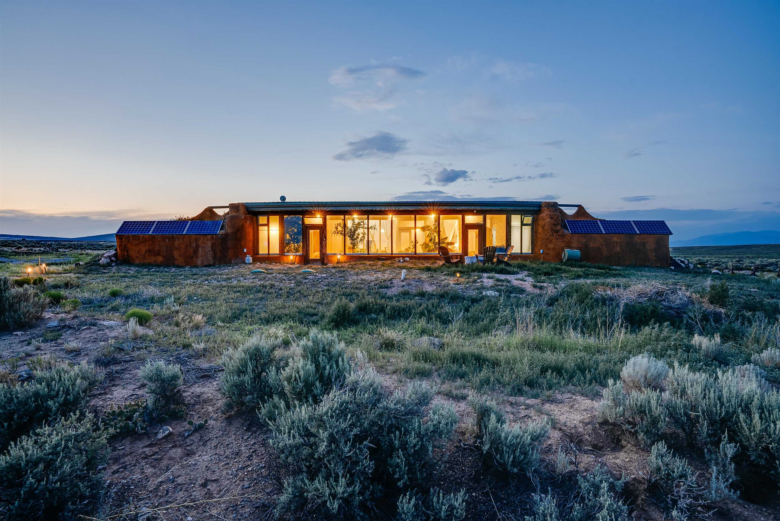 MODERN COMFORT MEETS SUSTAINABLE LIVING iN THIS STUNNING EARTHSHIP HOME Experience the best of off-grid living in this beautifully designed and meticulously maintained 5-year-old Earthship, located in the heart of the renowned Greater World Community. This 2-bedroom, 1-bathroom home features a thoughtful split-bath layout and blends sustainable architecture with modern comfort. The open-concept living/kitchen/dining area and two bedrooms are accented by tongue-and-groove ceilings and floor-to-ceiling windows that flood the space with natural light and frame panoramic views of the high desert mesa and majestic distant mountains. Step outside to your private fire pit and soak in the expansive night skies—where, on clear nights, the Milky Way feels almost within reach. Set back from the main road, this home offers privacy and serenity, yet remains conveniently located just 5 minutes from the Taos airport, 20 minutes from downtown Taos, and 30 minutes from world-class skiing in Taos Ski Valley. Whether you’re looking for a full-time residence, a sustainable getaway, or a proven short-term rental investment, this Earth-friendly retreat offers a unique opportunity to live in harmony with nature—without sacrificing the modern amenities of conventional homes.