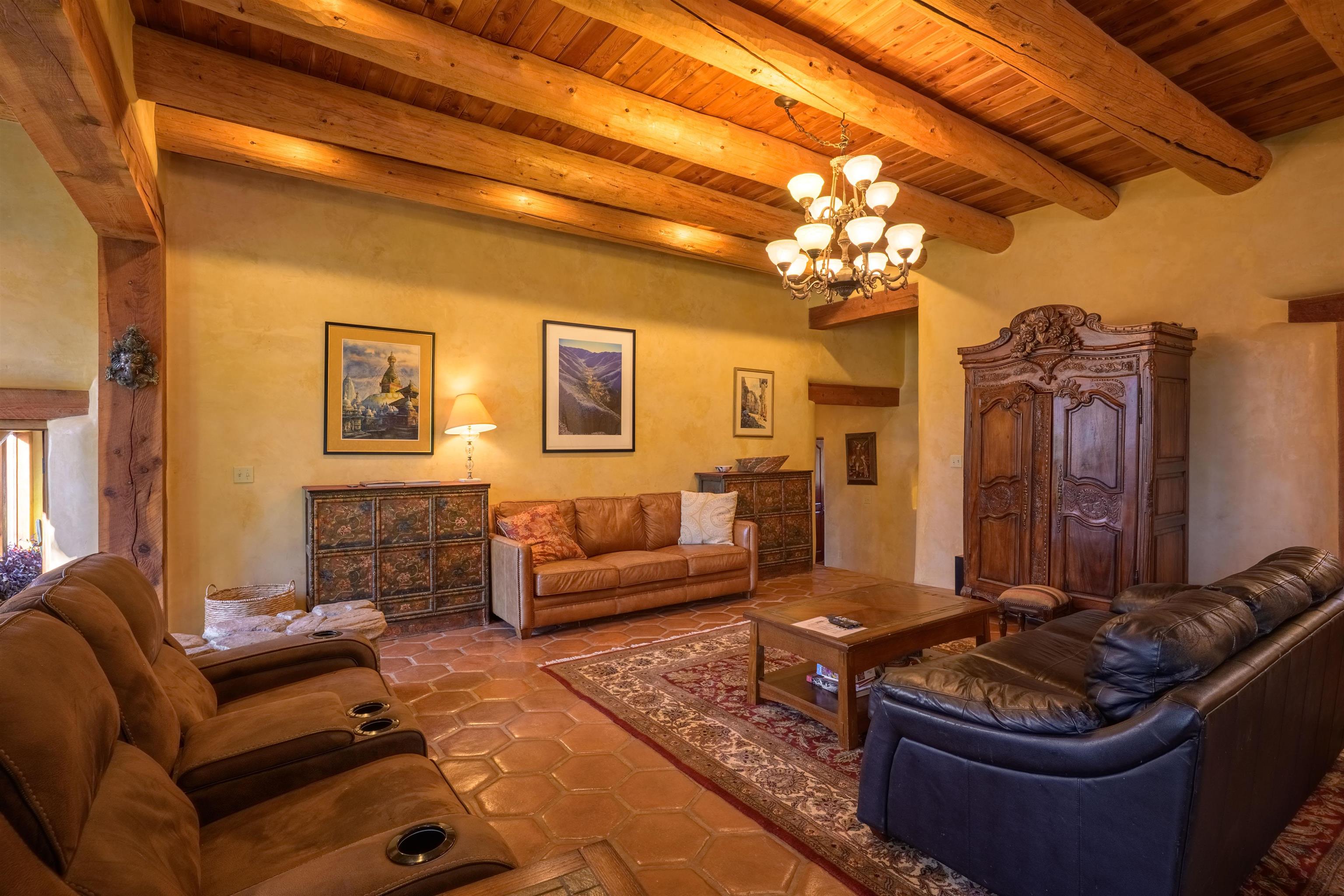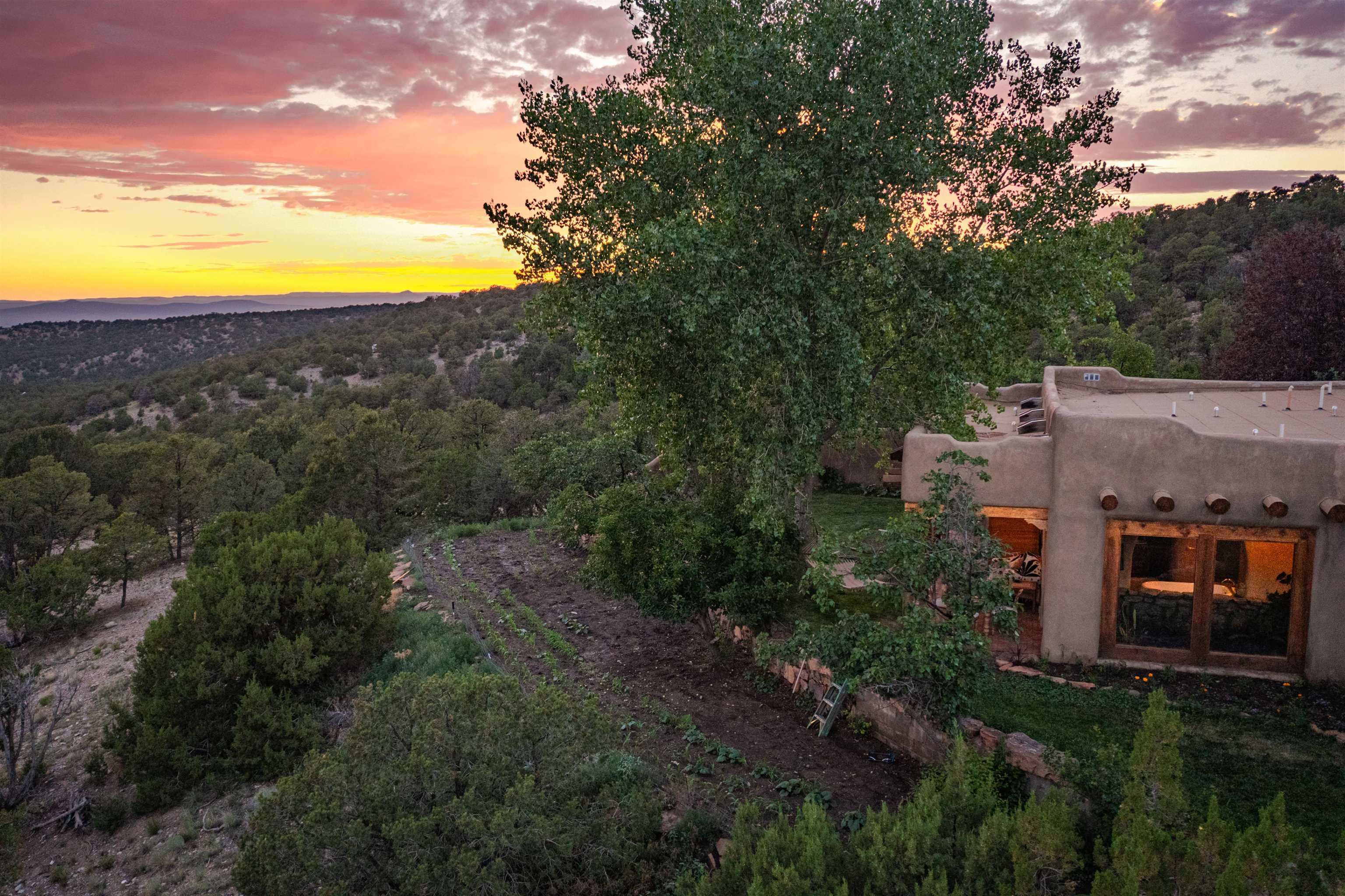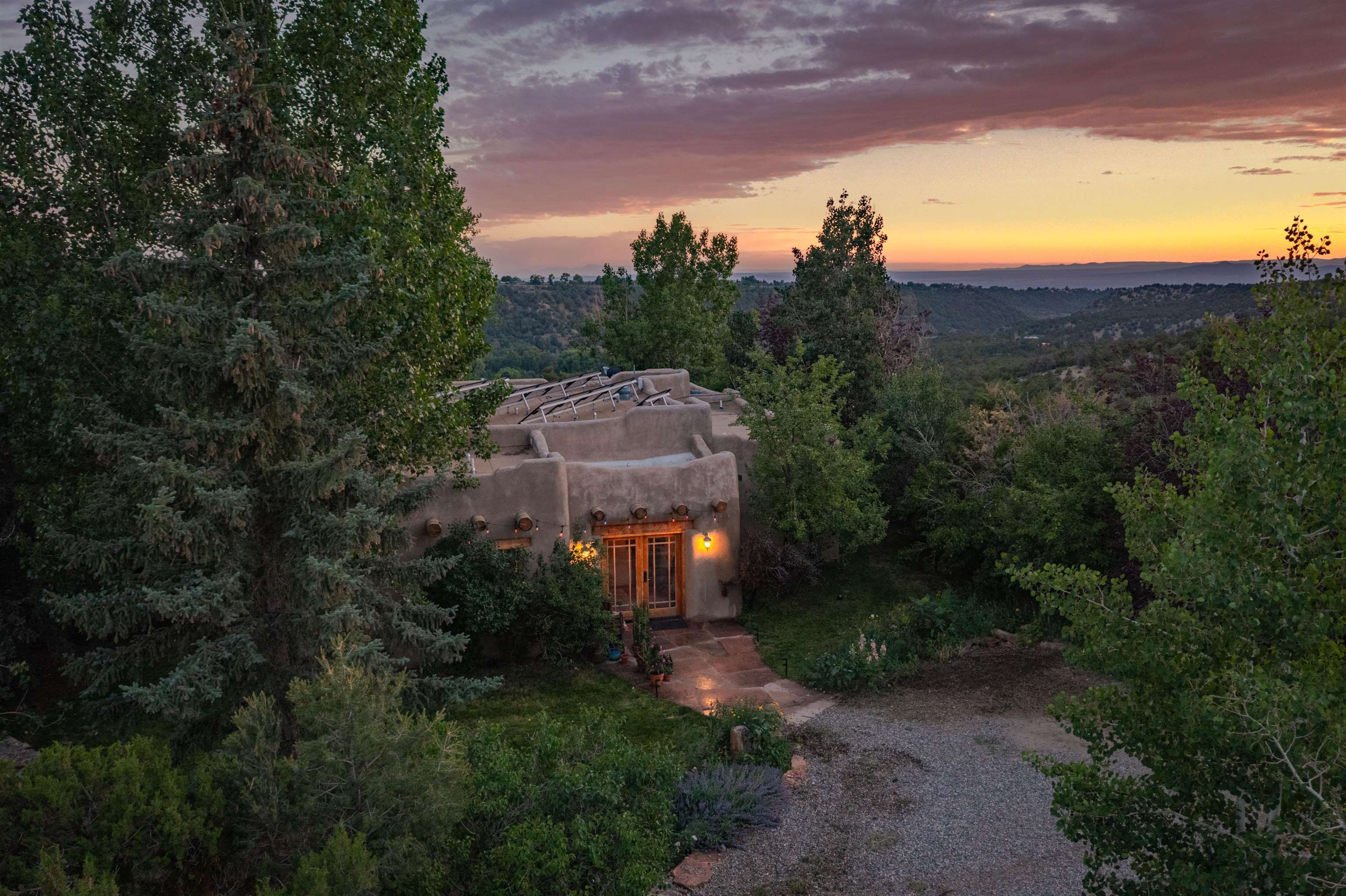 Luxurious & Sustainable High Desert Castle on the Valdez Hillside ~ Welcome to Winsor Castle, 3,300 sqft of pure magnificence pleasantly situated near Taos Ski Valley, just a short distance to Central Taos, with some of the most remarkable views in New Mexico. This exquisite and overbuilt residence inspired by the Mabel Dodge Luhan House is set on over one acre of lush piñon & juniper forest. To put it bluntly, the entire residence was overbuilt by the current and only owner, to his personal taste. Upon stepping into the solar passive residence powered by a net-metered solar system, you will encounter endless meticulousness amongst several hand-crafted and traditional custom features. High ceilings with impressive 10x10 Douglas fir vigas and tongue-and-groove accents that create an open, airy, and well lit atmosphere, complemented by recessed lighting. Special 6-sided Mexican Saltillo tile floors above radiant heated floors throughout the home, and travertine tile archways evoke a special Southwest feeling. Extending from the kitchen and living room into the primary bedroom you will encounter perhaps the home's most notable feature; a spectacular tropical greenhouse with 16' ceilings, surrounded by hand harvested quartzite grey stone walls. The primary ensuite is a true sanctuary, offering mountain views directly from the soaking tub through the banana trees in the greenhouse. With 4 spacious bedrooms, 2 bathrooms, and generous living areas, this residence offers a unique blend of comfort and eco-consciousness. Emser travertine tile and white marble floors grace the primary bathroom with a steam shower. At the heart of the home is a chef's kitchen with a Viking gas range, featuring stunning 2" teak and marble countertops, a New Orleans brick backsplash and a Tuscany-inspired mosaic behind the flame. As for the impressive R-Value of the home, these 16'' poured pumice-crete walls and double-studded interior walls, ensure complete climate control, along with no sound interruptions room-to-room. Furthermore, the 4'ft thick roof, insulated with blown cellulose bales, significantly enhances energy efficiency, and incredibly low utility bills. Outside, the property is an oasis. Terraced organic vegetable and flower gardens, and a variety of fruit and shade trees like apple and apricot, seasonal perennials such as echinacea, daisies, and sunflowers, all of which create a vibrant landscape, perfectly maintained by an 8-zone Rainbird irrigation system. Classic brick and flagstone portals around the home offer unbelievable views of the Valdez Valley, El Salto cliffs & majestic Taos Mountain, and especially so from the infrared or sauna during evening soaks in the hot tub overlooking these majestic vistas. Beyond the home's many special features, the location and convenience is equally impressive as it provides easy access to outdoor adventures, including hiking, biking, and trout fishing in the Arroyo Hondo River. The quaint village of Arroyo Seco is a mere 3 miles away, and offers delightful restaurants, shops, and entertainment. This luxurious, overbuilt, and truly special residence offers a unique and sustainable lifestyle amidst the unparalleled beauty of Northern New Mexico.