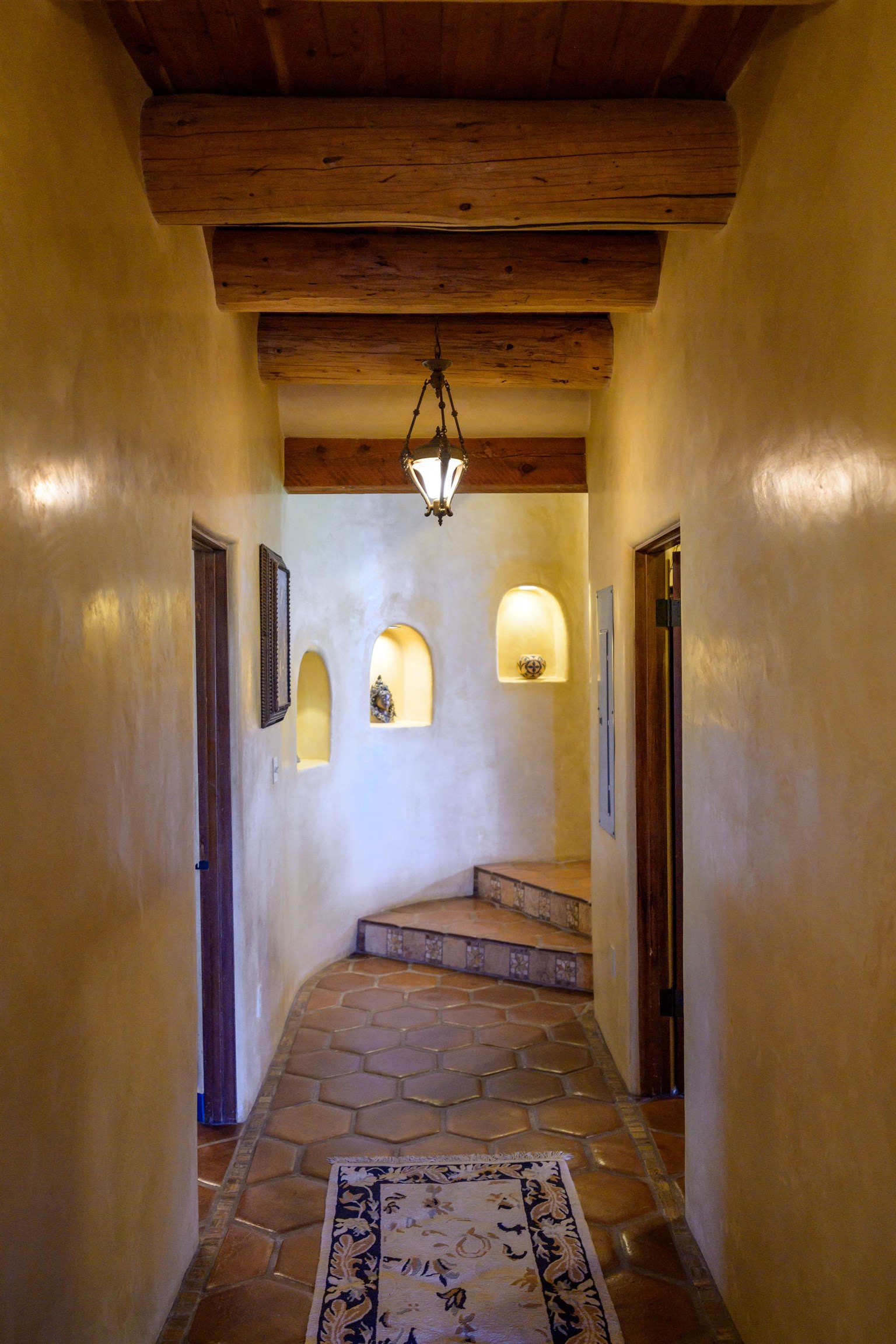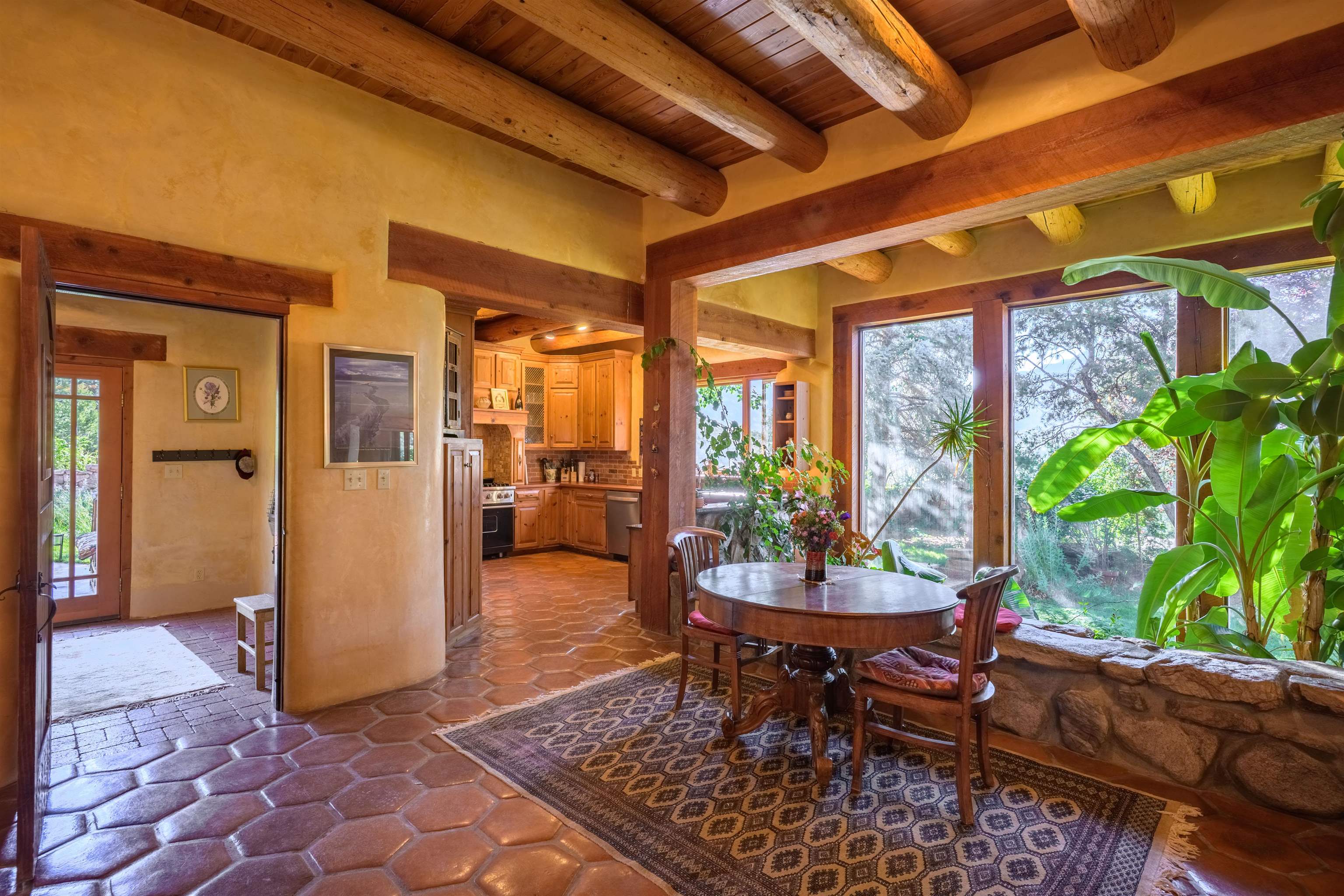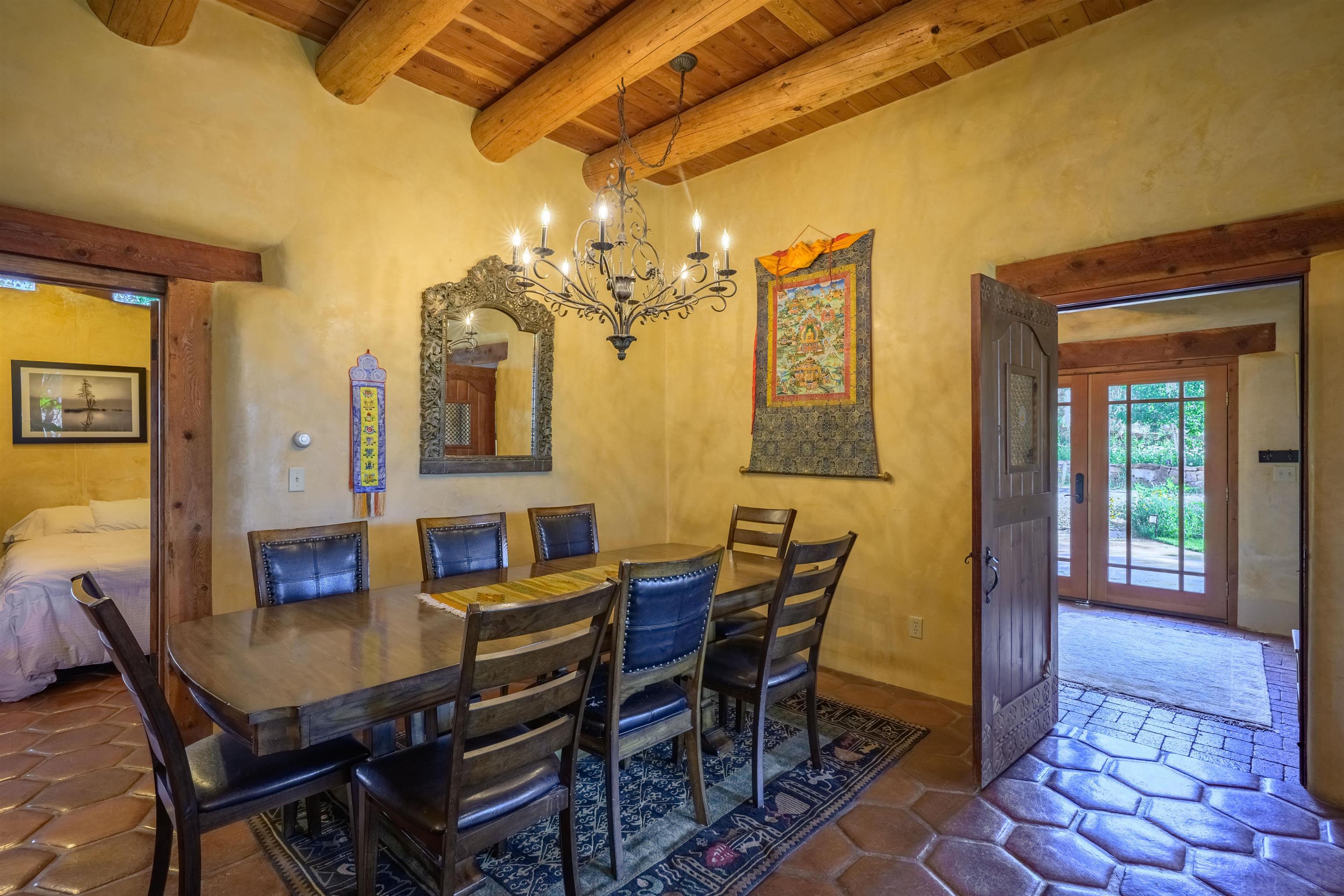 Luxurious & Sustainable High Desert Castle on the Valdez Hillside ~ Welcome to Winsor Castle, 3,300 sqft of pure magnificence pleasantly situated near Taos Ski Valley, just a short distance to Central Taos, with some of the most remarkable views in New Mexico. This exquisite and overbuilt residence inspired by the Mabel Dodge Luhan House is set on over one acre of lush piñon & juniper forest. To put it bluntly, the entire residence was overbuilt by the current and only owner, to his personal taste. Upon stepping into the solar passive residence powered by a net-metered solar system, you will encounter endless meticulousness amongst several hand-crafted and traditional custom features. High ceilings with impressive 10x10 Douglas fir vigas and tongue-and-groove accents that create an open, airy, and well lit atmosphere, complemented by recessed lighting. Special 6-sided Mexican Saltillo tile floors above radiant heated floors throughout the home, and travertine tile archways evoke a special Southwest feeling. Extending from the kitchen and living room into the primary bedroom you will encounter perhaps the home's most notable feature; a spectacular tropical greenhouse with 16' ceilings, surrounded by hand harvested quartzite grey stone walls. The primary ensuite is a true sanctuary, offering mountain views directly from the soaking tub through the banana trees in the greenhouse. With 4 spacious bedrooms, 2 bathrooms, and generous living areas, this residence offers a unique blend of comfort and eco-consciousness. Emser travertine tile and white marble floors grace the primary bathroom with a steam shower. At the heart of the home is a chef's kitchen with a Viking gas range, featuring stunning 2" teak and marble countertops, a New Orleans brick backsplash and a Tuscany-inspired mosaic behind the flame. As for the impressive R-Value of the home, these 16'' poured pumice-crete walls and double-studded interior walls, ensure complete climate control, along with no sound interruptions room-to-room. Furthermore, the 4'ft thick roof, insulated with blown cellulose bales, significantly enhances energy efficiency, and incredibly low utility bills. Outside, the property is an oasis. Terraced organic vegetable and flower gardens, and a variety of fruit and shade trees like apple and apricot, seasonal perennials such as echinacea, daisies, and sunflowers, all of which create a vibrant landscape, perfectly maintained by an 8-zone Rainbird irrigation system. Classic brick and flagstone portals around the home offer unbelievable views of the Valdez Valley, El Salto cliffs & majestic Taos Mountain, and especially so from the infrared or sauna during evening soaks in the hot tub overlooking these majestic vistas. Beyond the home's many special features, the location and convenience is equally impressive as it provides easy access to outdoor adventures, including hiking, biking, and trout fishing in the Arroyo Hondo River. The quaint village of Arroyo Seco is a mere 3 miles away, and offers delightful restaurants, shops, and entertainment. This luxurious, overbuilt, and truly special residence offers a unique and sustainable lifestyle amidst the unparalleled beauty of Northern New Mexico.