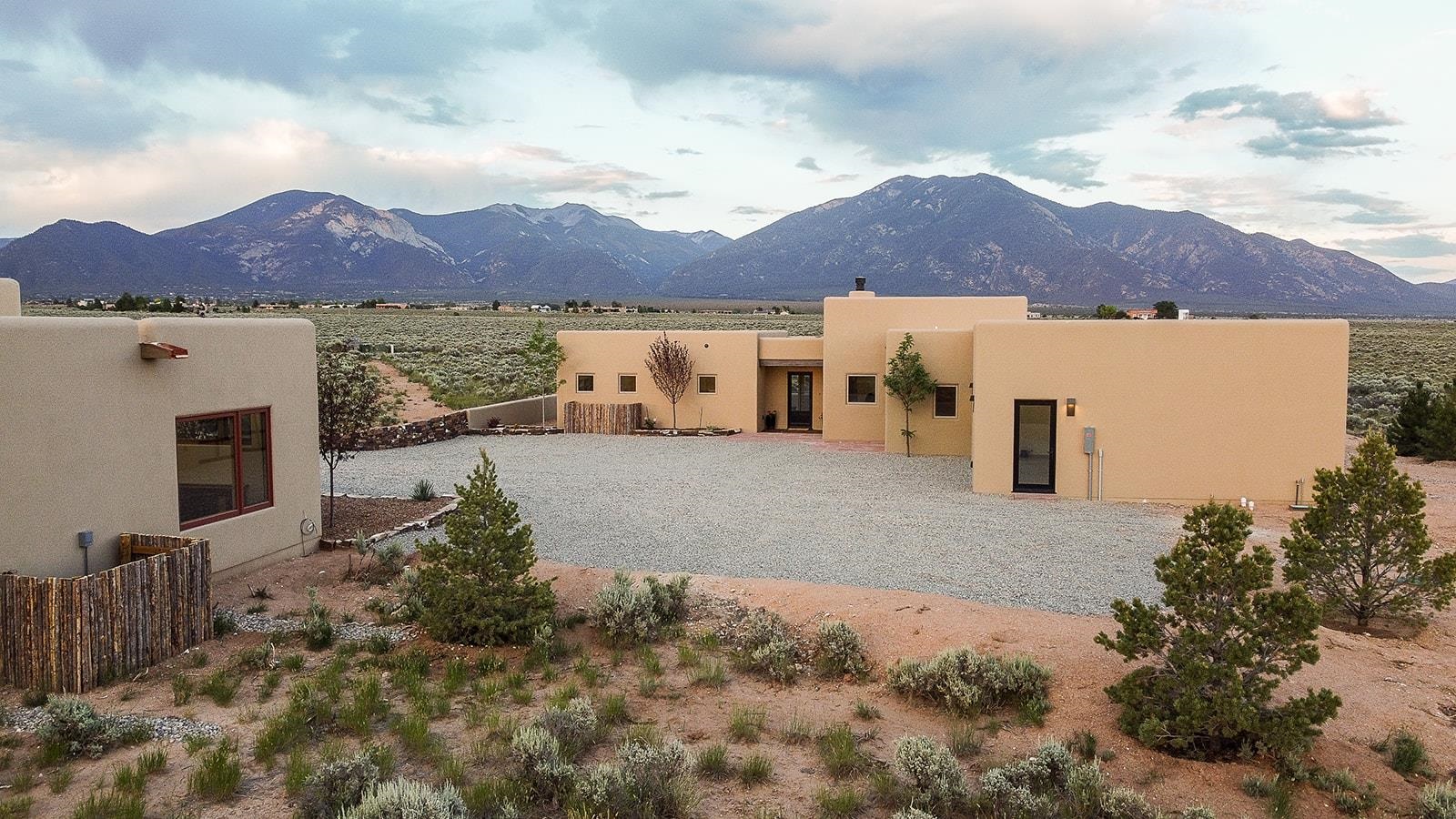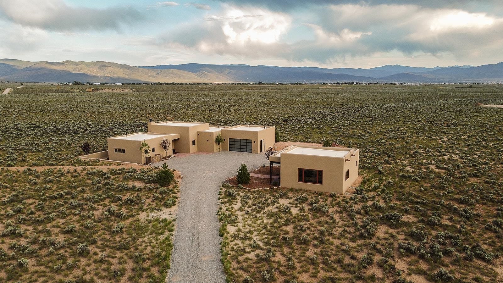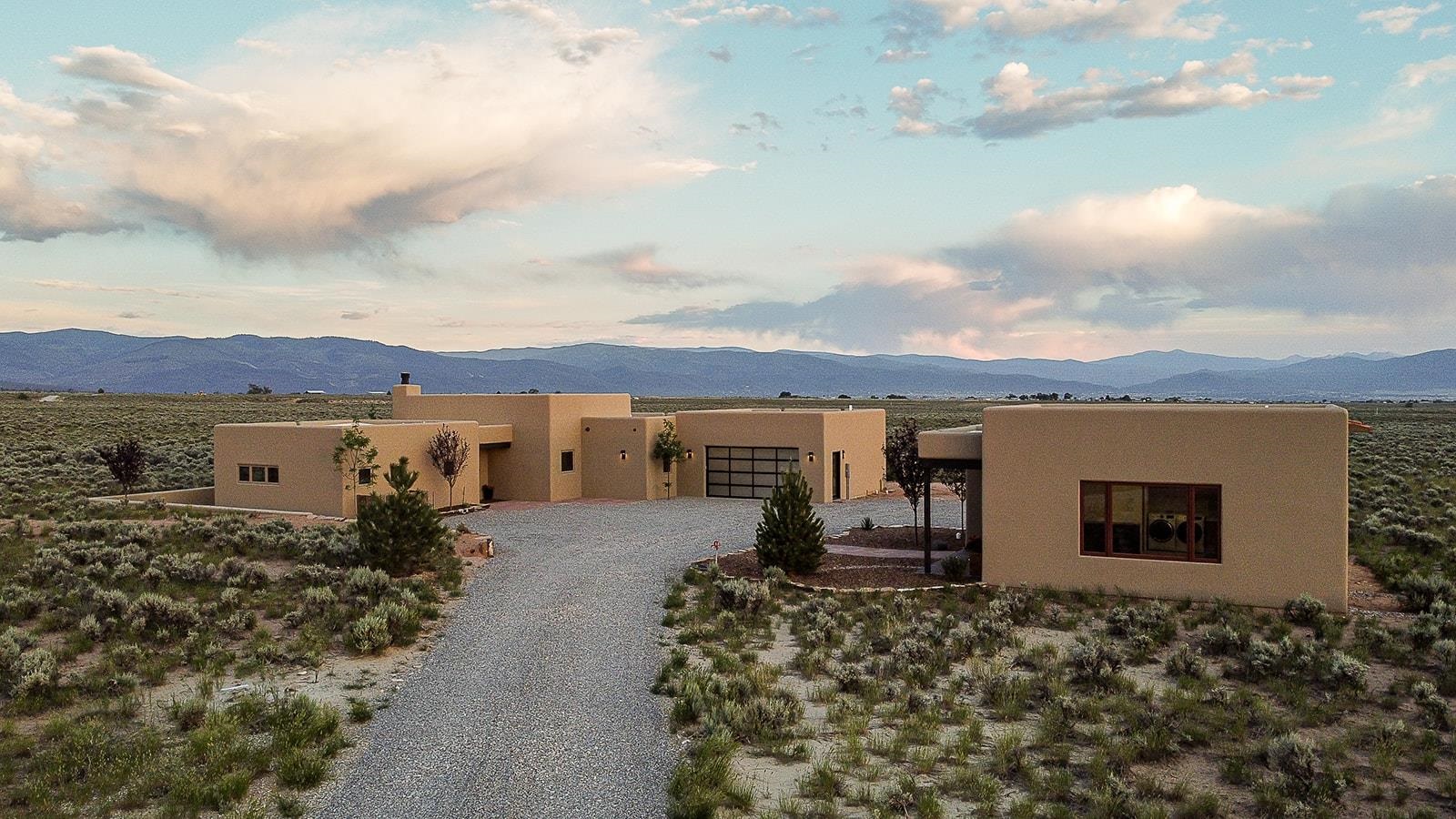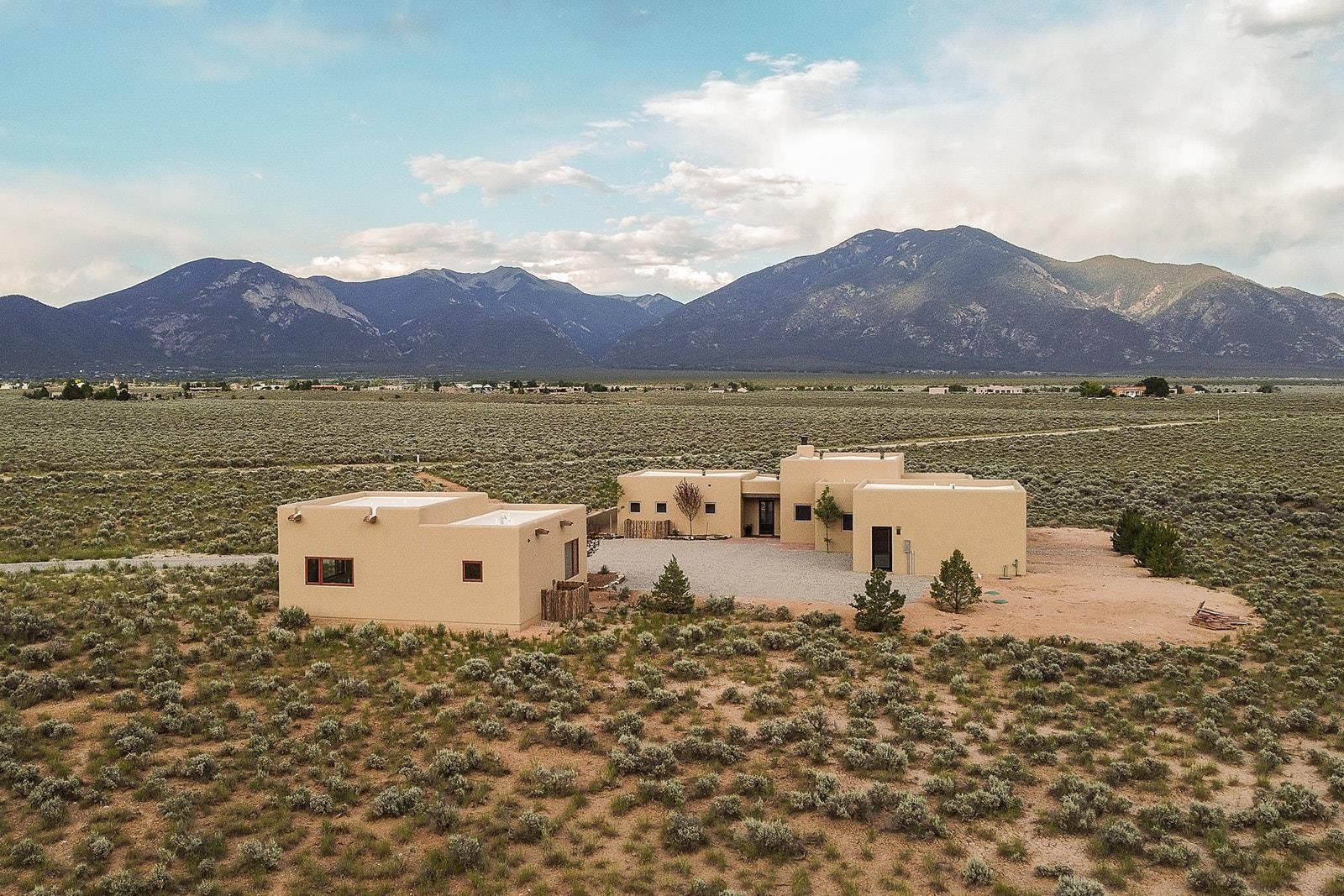 Another masterpiece from Edelman Enterprises! Where bold design meets wide-open skies, this stunning new build offers the perfect balance of modern architecture and natural harmony. Set on 15 acres between Taos and Taos Ski Valley, this southwestern contemporary home is a celebration of light, space, and views- endless views. Clean lines, organic materials, and large expanses of glass bring the outdoors in, framing panoramic vistas of the Sangre de Cristo Mountains, the RÃo Grande Gorge, and high desert mesas. Inside, the open-concept living space features soaring ceilings, sleek finishes, and artisan touches that nod to local traditions— , wood beam accents, stone countertops, portals for relaxing. Step directly from the living and dining areas onto a covered portal—a shaded outdoor living space perfectly positioned to take in the sunrises and shifting light of the mountains to the east. The primary bedroom suite has a walk in closet and breath taking views of Taos Mountain. There is a bonus room, currently set up as an office, adjacent to the primary. The guest bed and en suite bath are on the other side of the living room, next to the laundry room. Although calling it a laundry room doesn't seem fair. It's a generous gorgeous space with custom built-in cabinetry, loads of storage, a wine fridge and more beautiful tile work. Off of the laundry, there is direct access to a deluxe, oversized heated two-car garage providing ample space for vehicles, gear, and storage, blending seamlessly with the home’s bold, modern lines. Just beyond the main house, a fully independent guesthouse with its own kitchen and living area invites comfort, privacy, and flexibility—perfect for hosting friends, housing extended family, or creating a separate studio or rental opportunity. Whether you're savoring the sunrise from the patio, watching the storms roll over the mesas, or stargazing under desert skies, this property is a haven for those who crave both space and style. A rare blend of contemporary design and high-desert soul. Every room is oriented to capture the ever-changing drama of the landscape, from sunrise over the peaks to sunsets that set the sky on fire. Step outside to generous patios designed for quiet mornings, starry nights, and everything in between. This is more than a home—it’s a retreat, a canvas, a vision brought to life in one of New Mexico’s most inspiring locations. Whether you’re looking for a primary residence, a luxury getaway, or a private creative haven, this property delivers space, serenity, and style in equal measure.