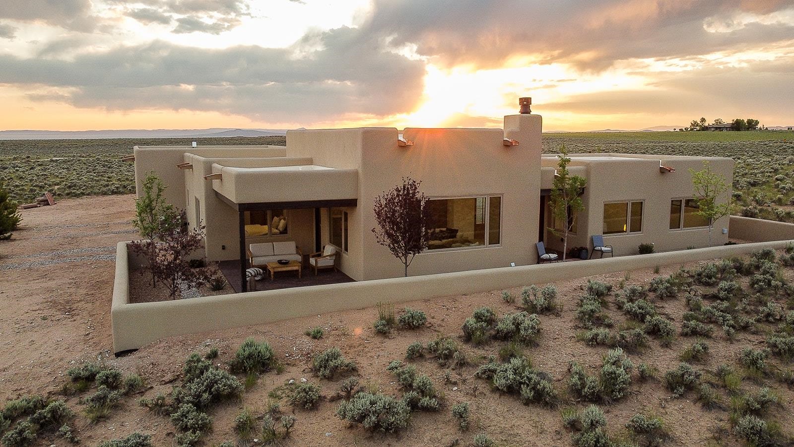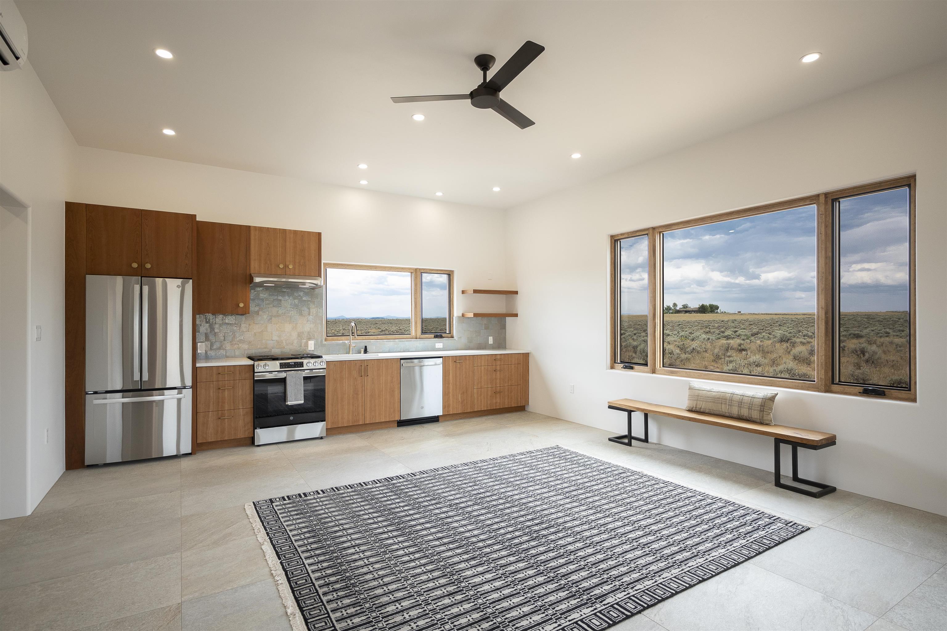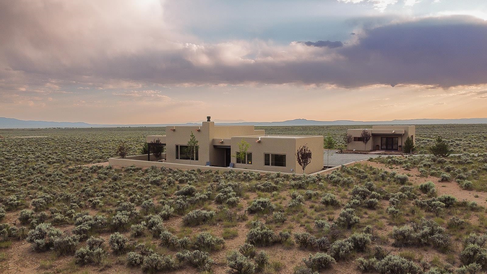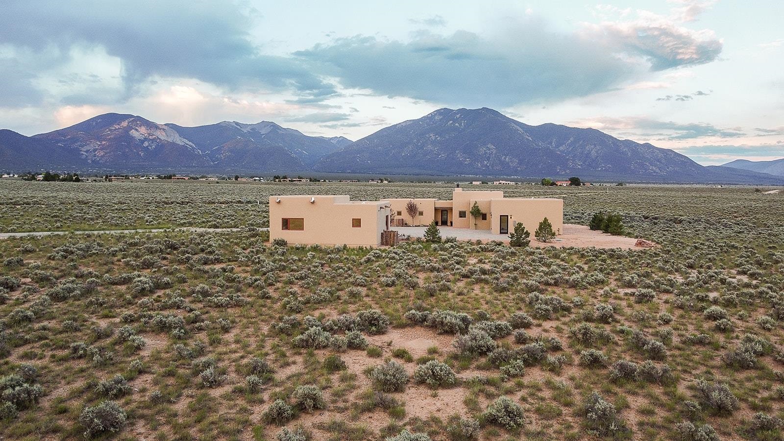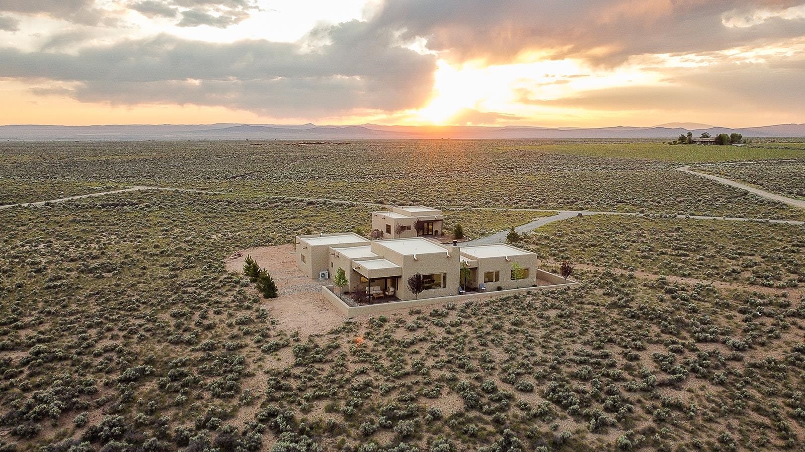 Another masterpiece from Edelman Enterprises! Where bold design meets wide-open skies, this stunning new build offers the perfect balance of modern architecture and natural harmony. Set on 15 acres between Taos and Taos Ski Valley, this southwestern contemporary home is a celebration of light, space, and views- endless views. Clean lines, organic materials, and large expanses of glass bring the outdoors in, framing panoramic vistas of the Sangre de Cristo Mountains, the RÃo Grande Gorge, and high desert mesas. Inside, the open-concept living space features soaring ceilings, sleek finishes, and artisan touches that nod to local traditions— , wood beam accents, stone countertops, portals for relaxing. Step directly from the living and dining areas onto a covered portal—a shaded outdoor living space perfectly positioned to take in the sunrises and shifting light of the mountains to the east. The primary bedroom suite has a walk in closet and breath taking views of Taos Mountain. There is a bonus room, currently set up as an office, adjacent to the primary. The guest bed and en suite bath are on the other side of the living room, next to the laundry room. Although calling it a laundry room doesn't seem fair. It's a generous gorgeous space with custom built-in cabinetry, loads of storage, a wine fridge and more beautiful tile work. Off of the laundry, there is direct access to a deluxe, oversized heated two-car garage providing ample space for vehicles, gear, and storage, blending seamlessly with the home’s bold, modern lines. Just beyond the main house, a fully independent guesthouse with its own kitchen and living area invites comfort, privacy, and flexibility—perfect for hosting friends, housing extended family, or creating a separate studio or rental opportunity. Whether you're savoring the sunrise from the patio, watching the storms roll over the mesas, or stargazing under desert skies, this property is a haven for those who crave both space and style. A rare blend of contemporary design and high-desert soul. Every room is oriented to capture the ever-changing drama of the landscape, from sunrise over the peaks to sunsets that set the sky on fire. Step outside to generous patios designed for quiet mornings, starry nights, and everything in between. This is more than a home—it’s a retreat, a canvas, a vision brought to life in one of New Mexico’s most inspiring locations. Whether you’re looking for a primary residence, a luxury getaway, or a private creative haven, this property delivers space, serenity, and style in equal measure.