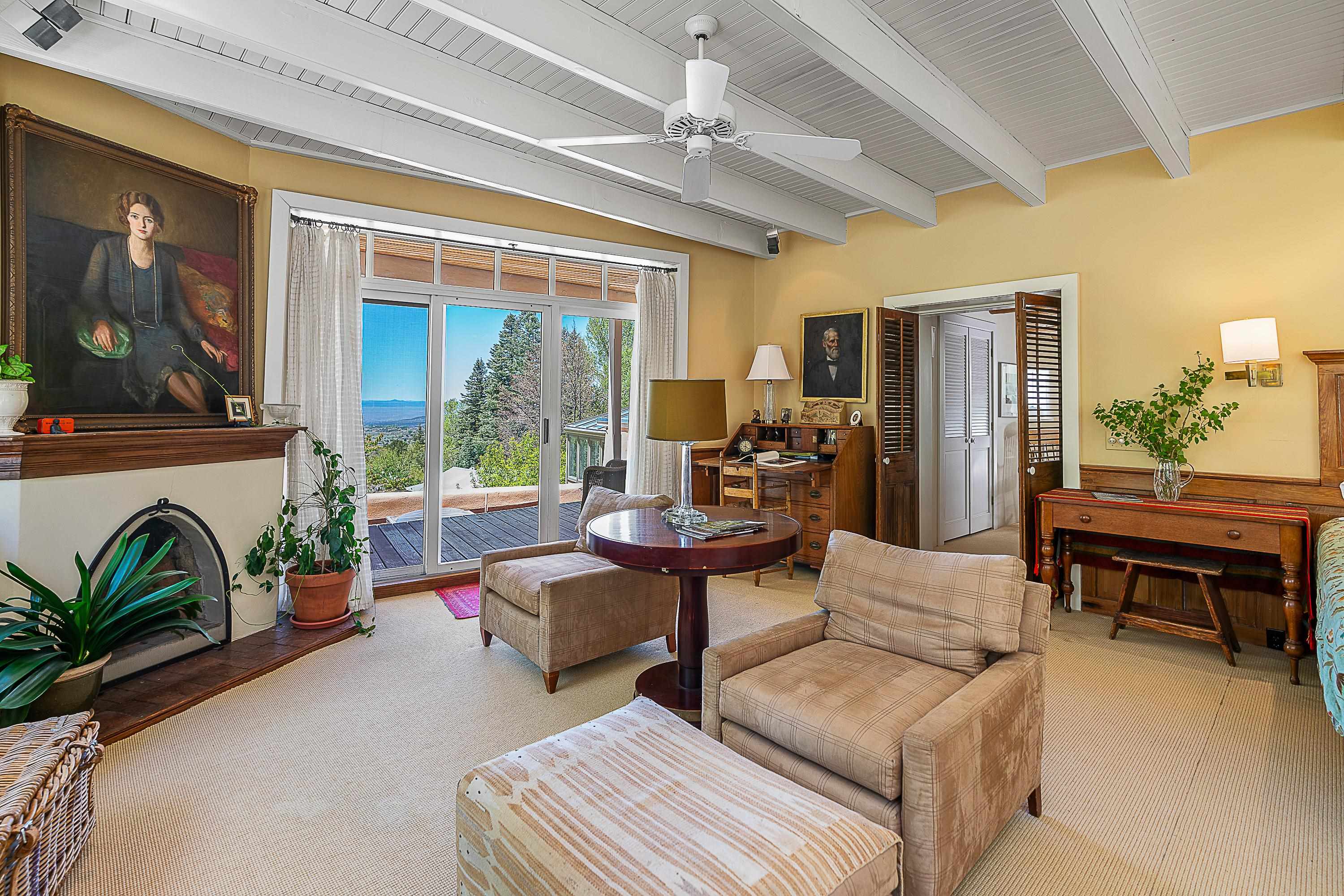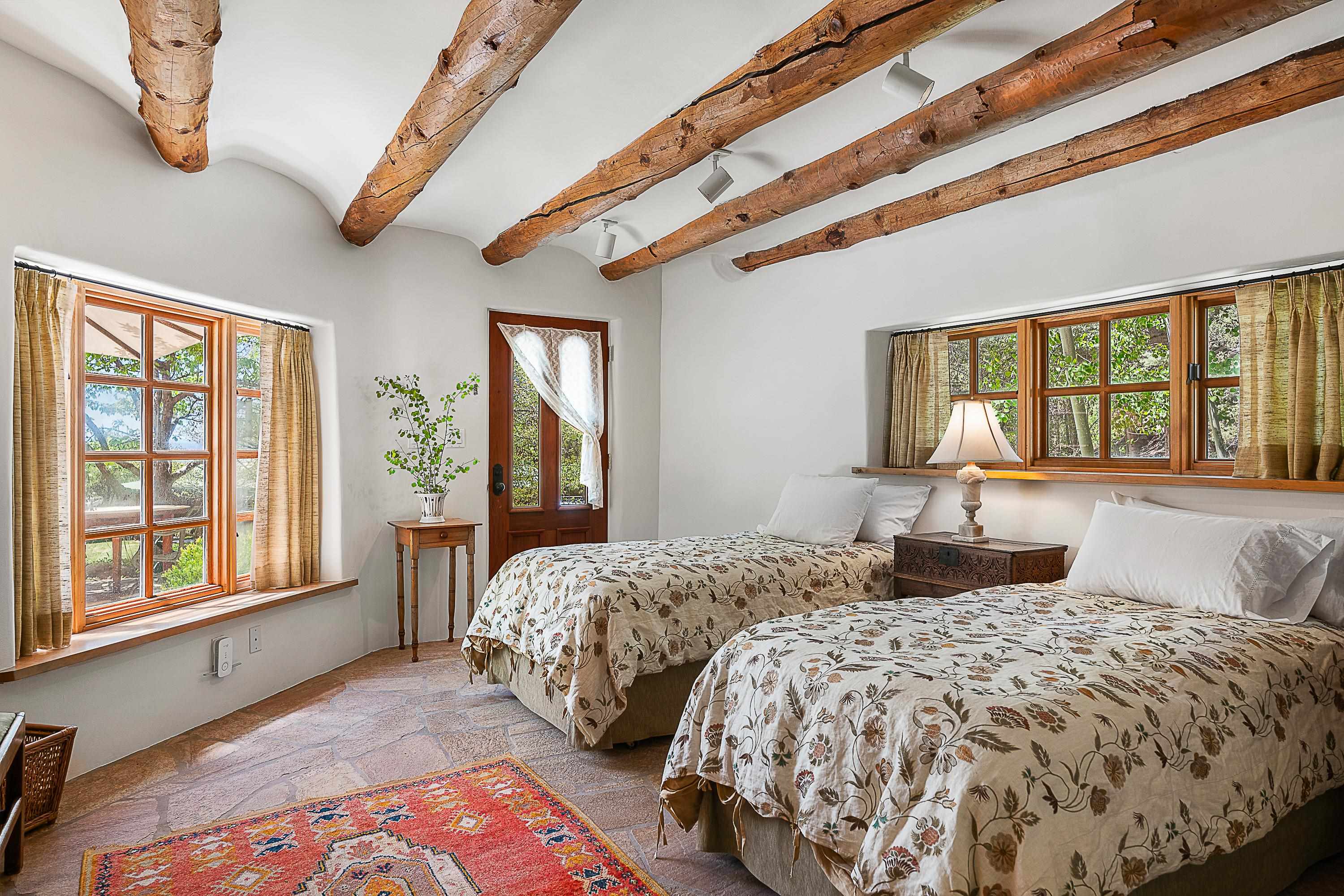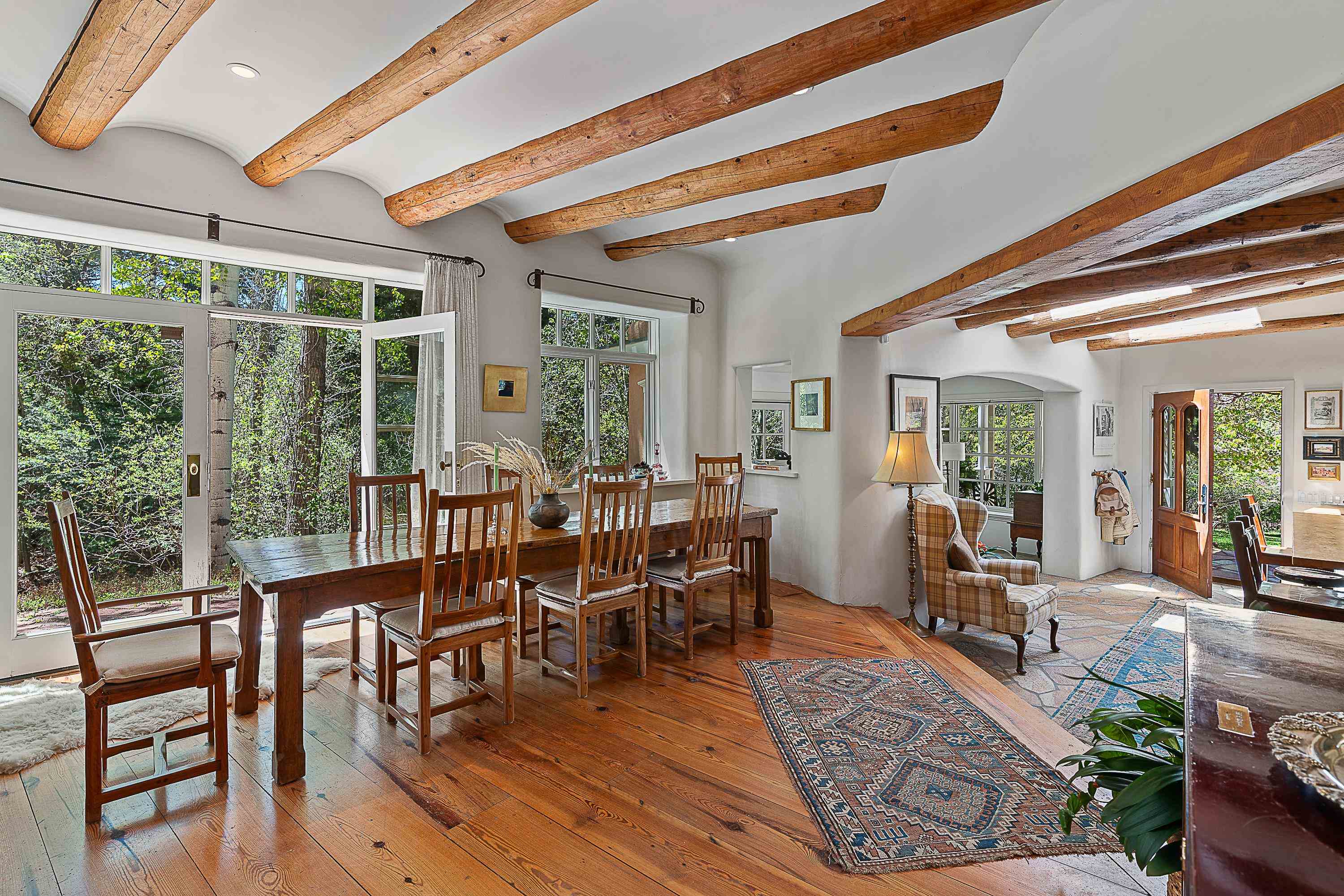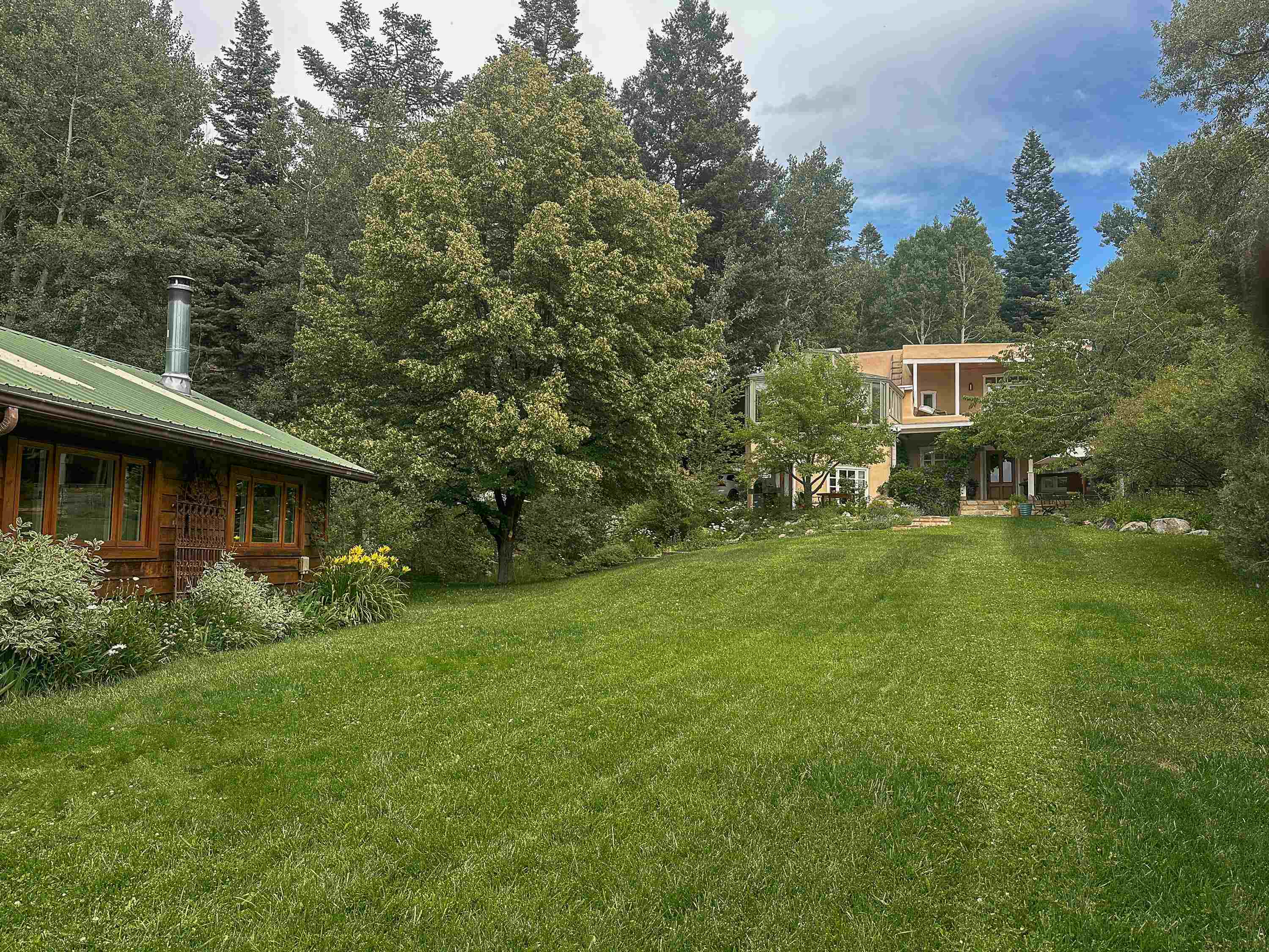 Comfortably tucked beneath the towering El Salto Mountain, sits this special 5.25 acre estate alongside the Arroyo Seco stream. This green oasis is defined by water, tall trees, birdsong and woodland gardens, by clear light, forever views and cool, starry nights. From its origins in the early 1970's, generously expanded over several decades, the home is built in harmony with the land. Each level flows naturally from the last, echoing the cascading waters just outside, with terraces, nooks, and rooms unfolding like the curves of the Creek itself. Both informal and refined, the house feels completely welcoming and comfortable. Gorgeous Idaho quartzite flagstone moves seamlessly from the broad front portal draped with Wisteria into the kitchen. The principal living space has a dreamy kitchen with a fantastic 1954 red enamel Chambers stove, a wonderful creek-side sitting area, a living room with wide plank reclaimed heart pine floors, a dry-stack stone fireplace, a library nook, a dining area, and three sets of French doors leading out onto a wrap-around patio that follows the banks of the winding creek. Salvaged and repurposed cypress shutters from New Orleans became beautiful wainscot paneling and doors. The home is anchored by a spectacular second story glass sunroom, made and installed by Pennsylvania Mennonite and Amish craftsmen from Renaissance Conservatories. The magical room with a warm quartzite floor is bathed in natural light that invites the outdoors in- perfect for morning coffee, quiet reflection, reading, writing, or entertaining under the stars. From here, a short rise of stairs leads to a landing off of which radiate two large, private suites. The western facing suite has a cozy sitting area with a large fireplace and a patio overlooking the stream and endless views to the Rio Grande Gorge and beyond. The corresponding suite is bathed in beautiful natural light from the large windows, vaulted ceilings and skylights. It feels like a cozy nest tucked into the treed canopy surrounding it. The third bedroom suite is can be accessed from the main living level or via a private door from the gardens. A delightful guesthouse with a complete kitchen sits at the base of a grassy lawn. Under the same roof, yet with it's own entrances from the lawn or garage is an additional light-filled room currently used as a home gym/office, and has a half bathroom. Versatile spaces amongst a verdant landscape. The stream brings the music of water to your daily rhythms. In the evening a cool breeze comes down the creek, and with it the gift of sleeping under a light blanket...windows wide open, stream trickling along. Natural springs feed native plants and perennials that bloom spring and summer. Golden Aspens shimmer and quake in the fall. Over 60 varieties of flowering trees, shrubs and perennials make for a true botanical delight. This is northern New Mexico at its most magical. Simply stroll out the door to hike and bike. No bike racks and drives to a trailhead necessary. Contiguous with quiet Taos Pueblo lands. Hiking trails lead to the El Salto waterfall and Carson National Forest. It's an easy 12 mile/20 minute drive to Taos Ski Valley. The location is secluded, yet sneaky-convenient. Meticulously maintained by one Owner for over 50 years, this is the first opportunity for another lucky soul to call this Home. This one-of-a-kind mountain sanctuary blends privacy, luxury and natural beauty in a way that simply can't be replicated. It is a truly special spot- Private Luxury at the Edge of Wild.