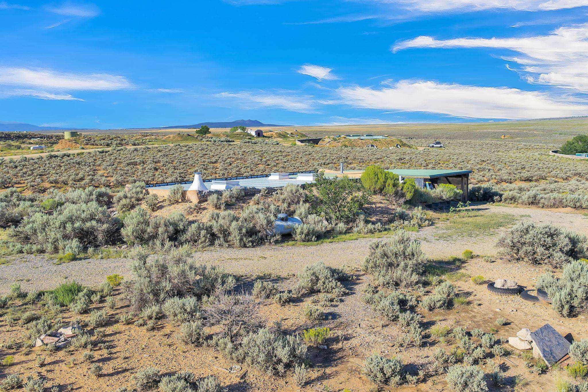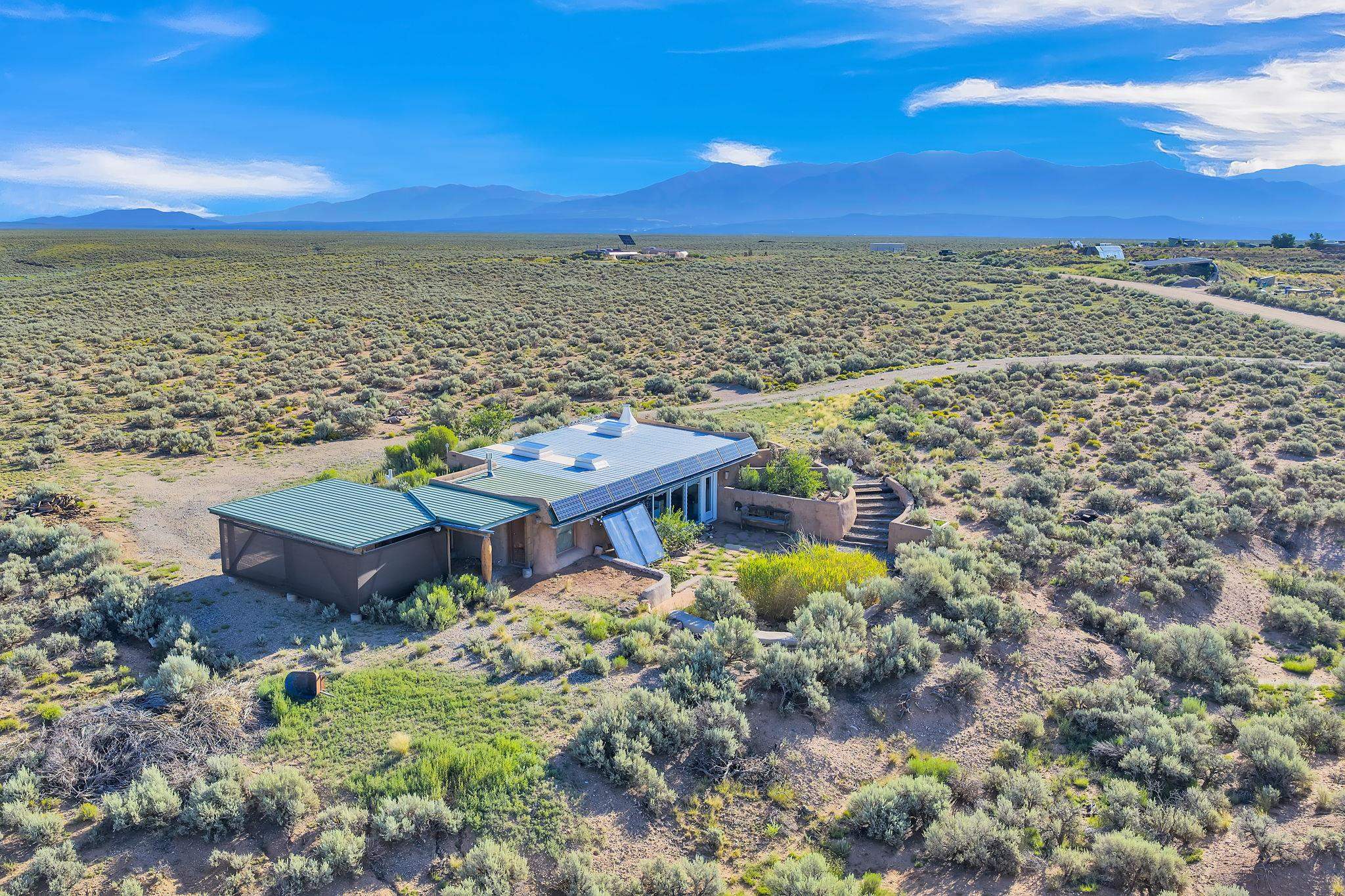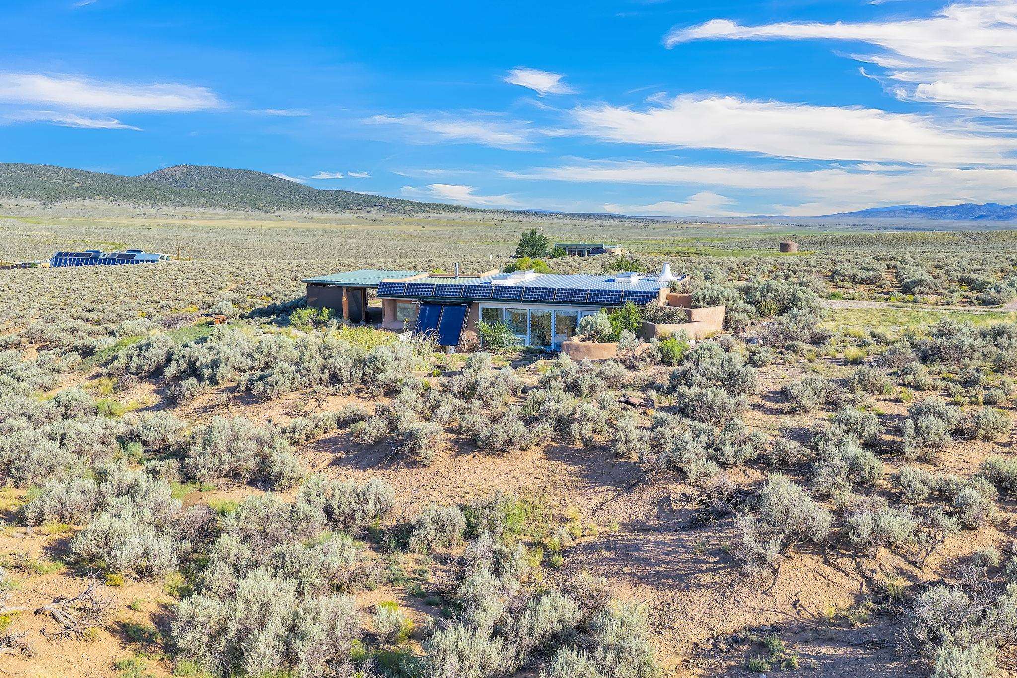 A Special opportunity to Own an Architectural Wonder in Majestic Taos ~ Welcome to 18 North Lemuria, a sustainable Earthship set on a generous 2.64 acre parcel with some of the very best 360° views in Northern New Mexico. This captivating off-grid property located within the Earthship Biotecture community offers a unique opportunity to live a sustainable lifestyle in the Land of Enchantments' high-desert. The home itself is a 726 square-foot studio which features and indoor atrium with planters for growing your own food and tropical trees, large floor to ceiling windows that bring in plenty of passive solar heat, a bright custom tile mosaic, and plenty of thoughtful shelving and storage for total organization. The home's high-end energy system, powered by solar panels, and a sophisticated water catchment system ensure you'll never pay a utility bill again. Step outside to a beautiful courtyard and take in sweeping, panoramic mountain views just beyond the blooming wild desert flowers. A covered carport beside an outdoor storage room is convenient as can be, and the perfect space for a small workshop. This self-sufficient sanctuary is perfectly situated for outdoor enthusiasts across the board, with the majestic Rio Grande river nearby and world-class skiing and snowboarding at Taos Ski Valley just a short drive away. In warmer months, the mountains transform into a playground for hikers, bikers, and explorers of all types. Some photos have been virtually staged to spark creativity for designing the space. 18 North Lemuria is the perfect place to embrace a life of complete independence, artistic harmony, and true sustainability.