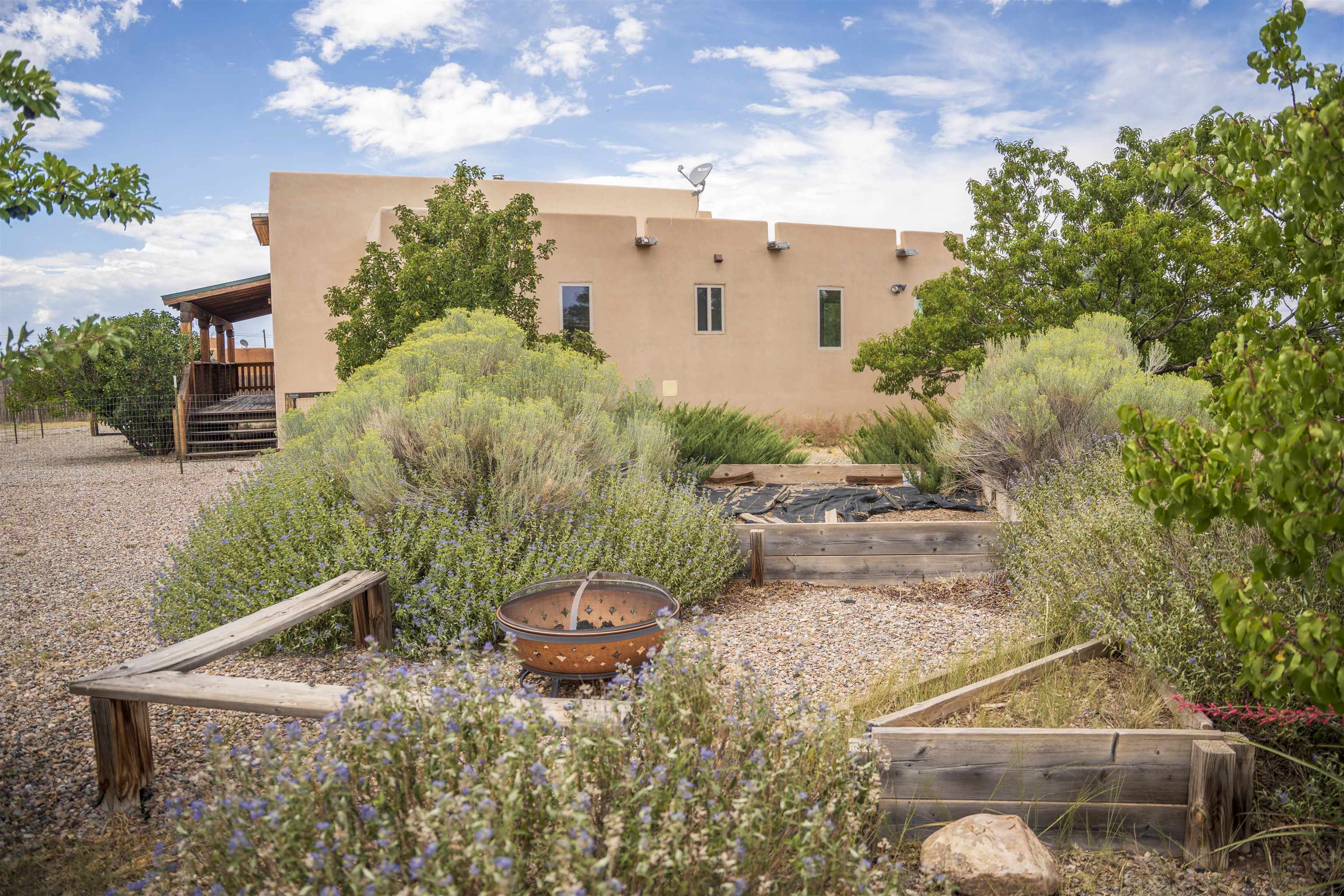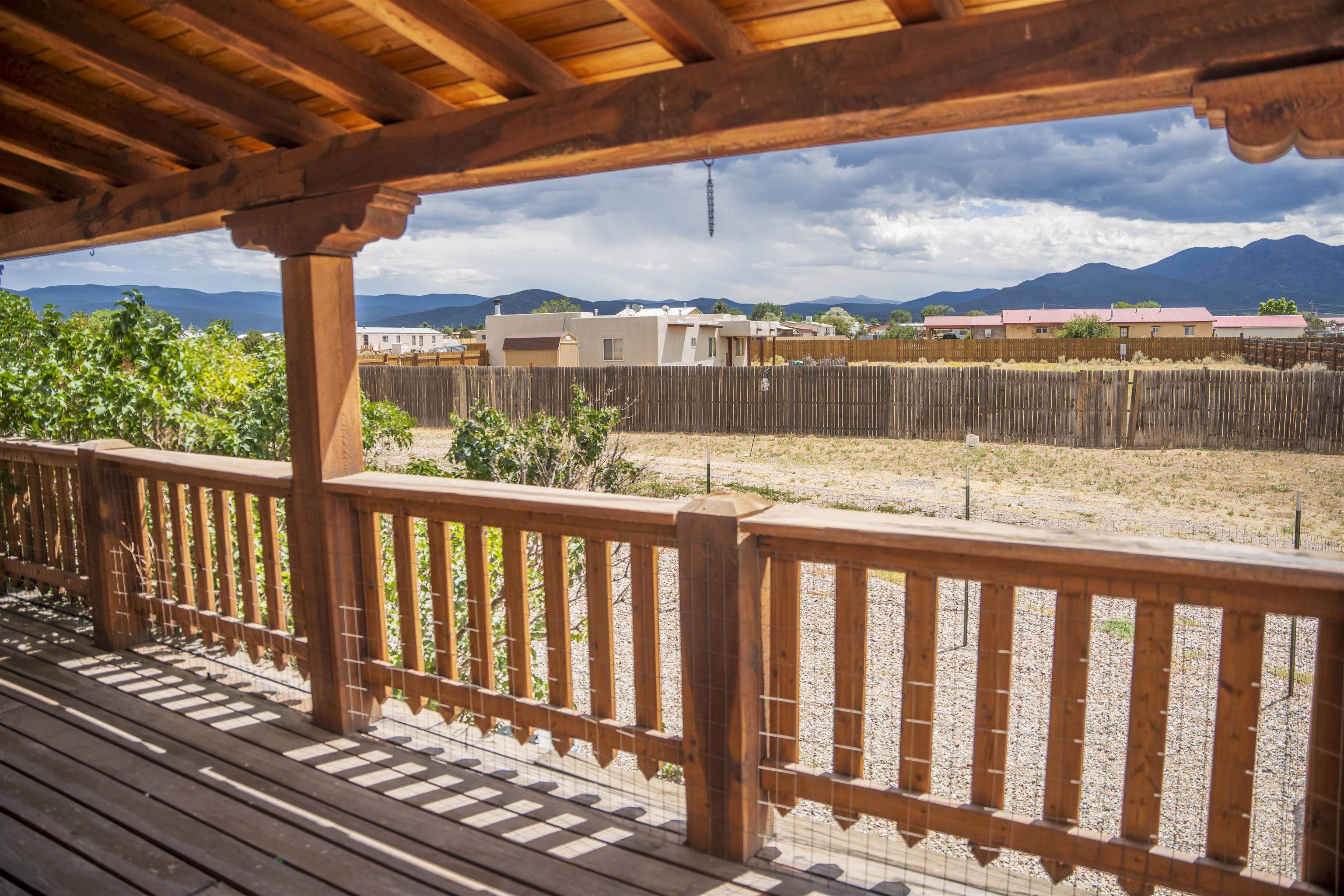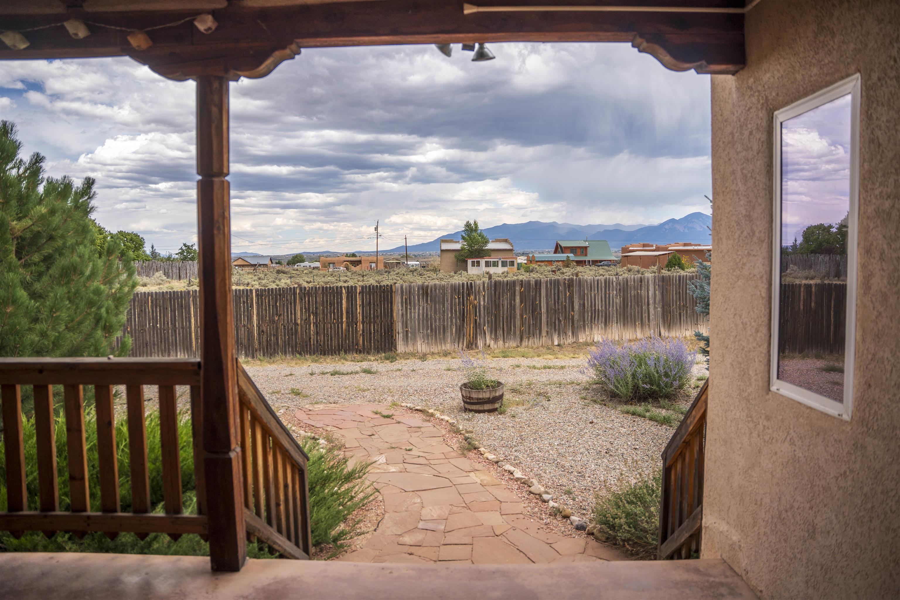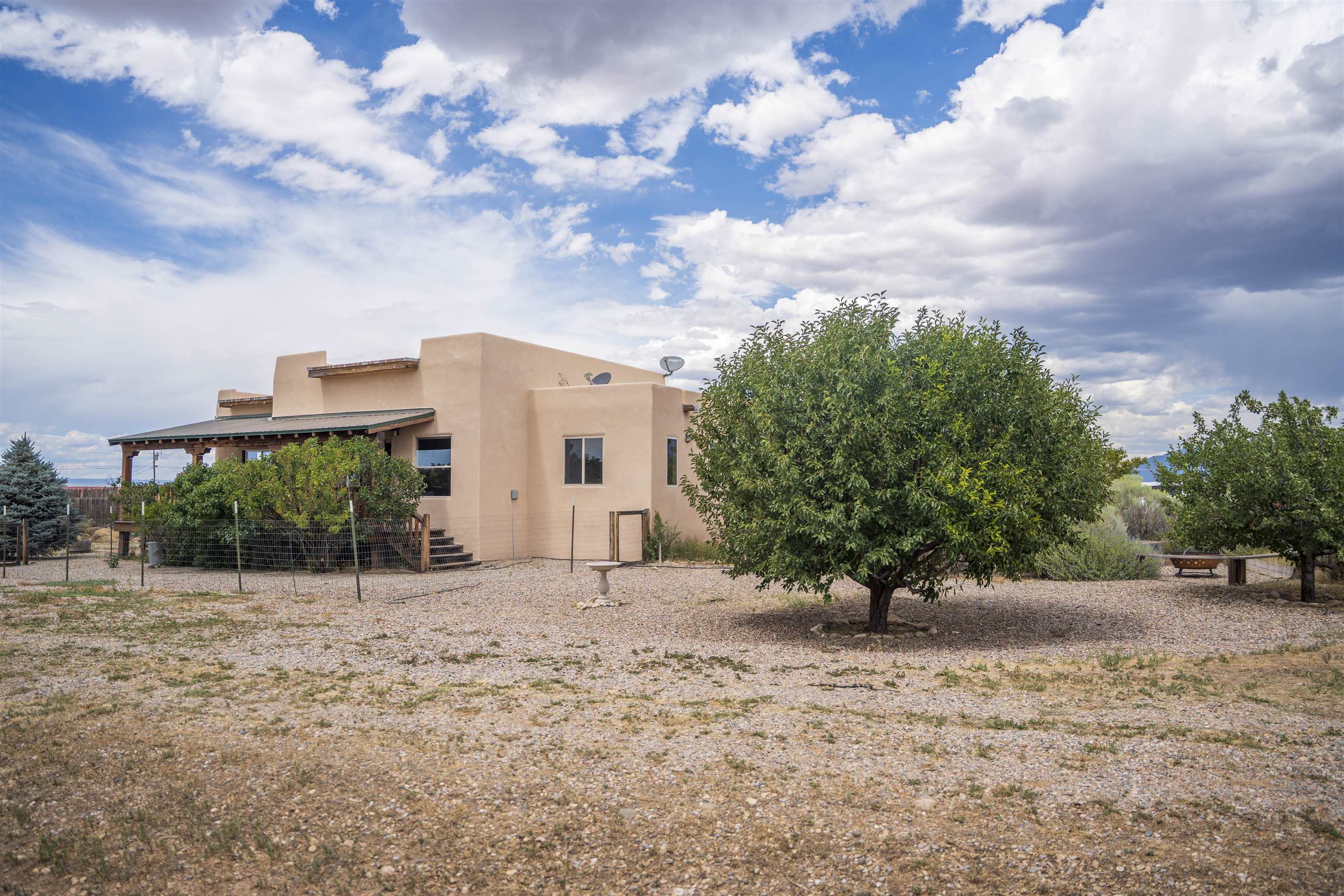 Whether you’re looking for a peaceful family haven, a work-from-home escape, or a Southwest-inspired retreat, this property delivers space, privacy, and timeless style just minutes from the heart of Taos. Pueblo Style home tucked away in a cul-de-sac just 15 minutes south of Taos Plaza. A circular drive and landscaping, this fully fenced property is thoughtfully designed with a separate dog run, raised garden beds, vibrant perennials, and fruit trees—cherry, apricot, plum, pear, and peach—perfect for green thumbs and nature lovers alike. Mature lilacs line the back portal, offering beauty and privacy year-round. Built in 2007, this 1,650 square foot 3 bedroom, 2 full bath home highlights the artistry of the Southwest: soaring 12' viga ceilings with tongue-and-groove finishes, Saltillo tile floors, hand-troweled diamond plaster walls, and carved spiral columns with corbels and rich wooden beams that exude warmth and character. The bright, open-concept great room is made for gathering, with a porcelain wood stove adding cozy ambiance. The spacious cook’s kitchen features abundant storage, a generous prep island with bar seating, stainless steel appliances. Step outside into the expansive covered portal, where you will discover a private oasis surrounded by breathtaking mountain vistas. Enjoy the tranquility of the landscape and views as you sip your morning coffee. The primary bedroom retreat is a true haven, offering a peaceful sanctuary to unwind and recharge. The ensuite bathroom provides both functionality and style. Two additional bedrooms provide ample space for family members, guests, or can be transformed into a home office or hobby room to suit your needs. The second bathroom, tastefully designed, offers convenience and comfort for all occupants. The allure of this property extends beyond the interior. Additional Highlights: In-floor radiant heating passive solar design for efficient year-round comfort, new water heater (2024) and roof recoating (2023). Well share with water softener system. Utility room with washer and dryer. High-speed CenturyLink internet. Separate mechanical room. No restrictive covenants—offering flexibility for your creative vision. Call and schedule a showing today!