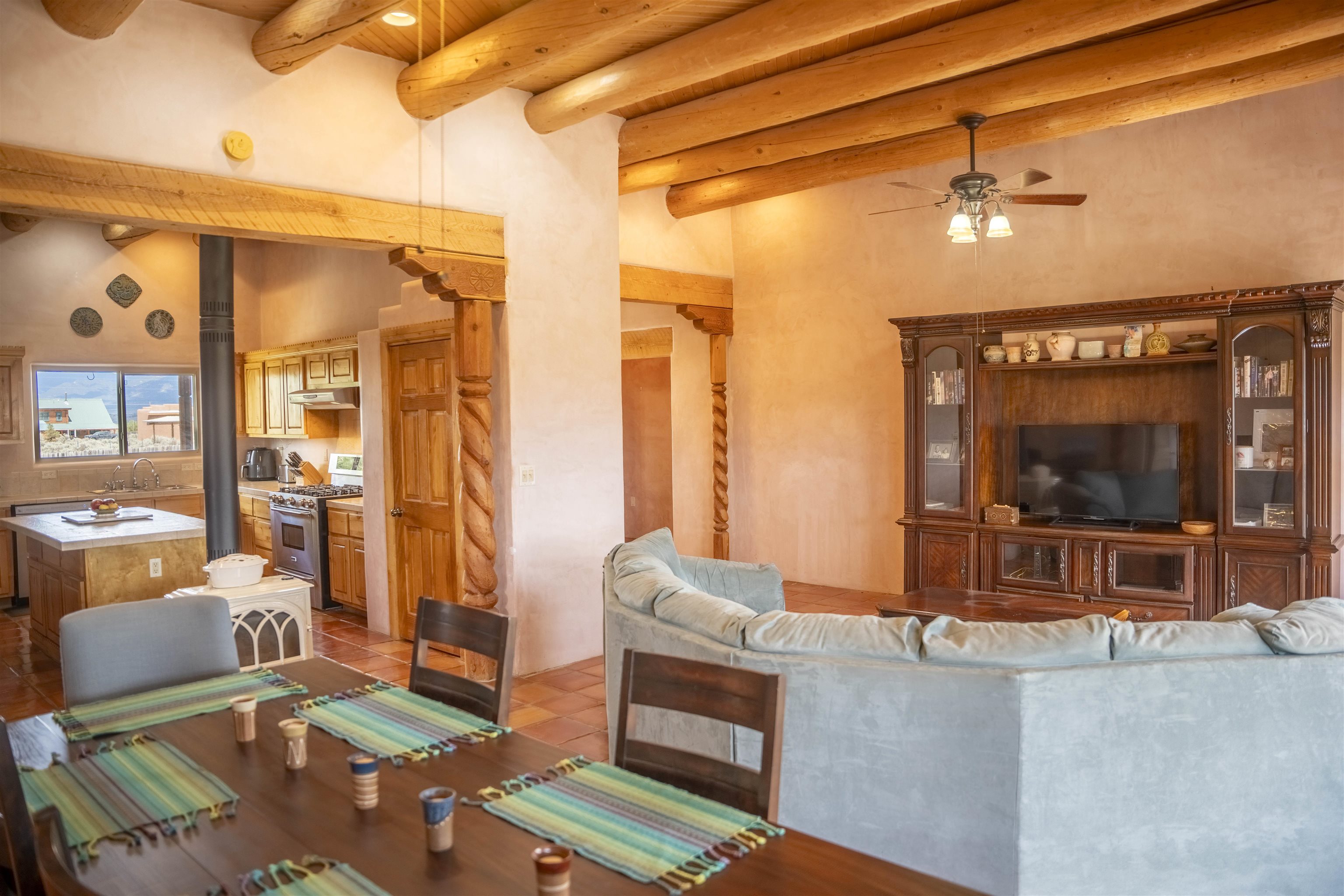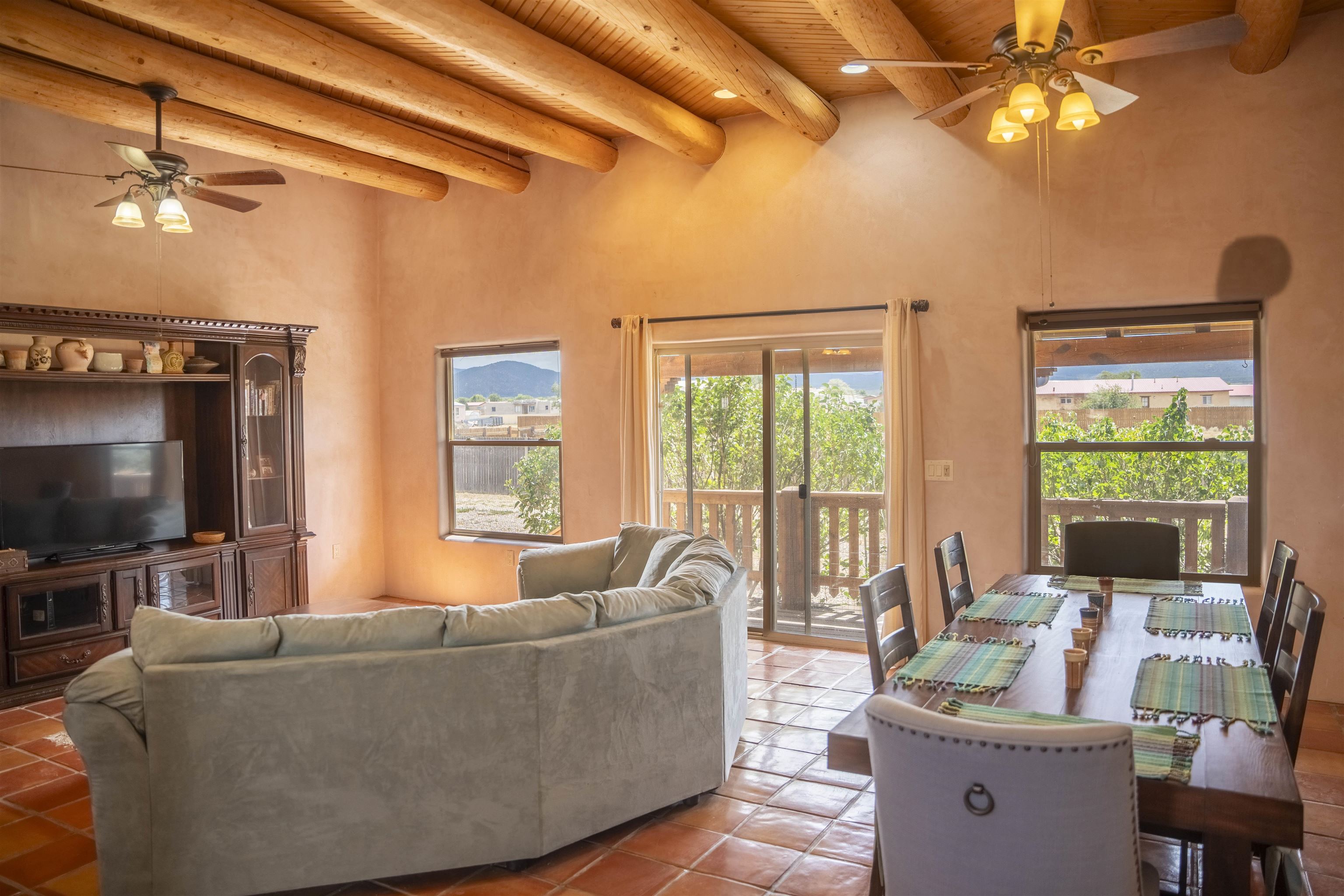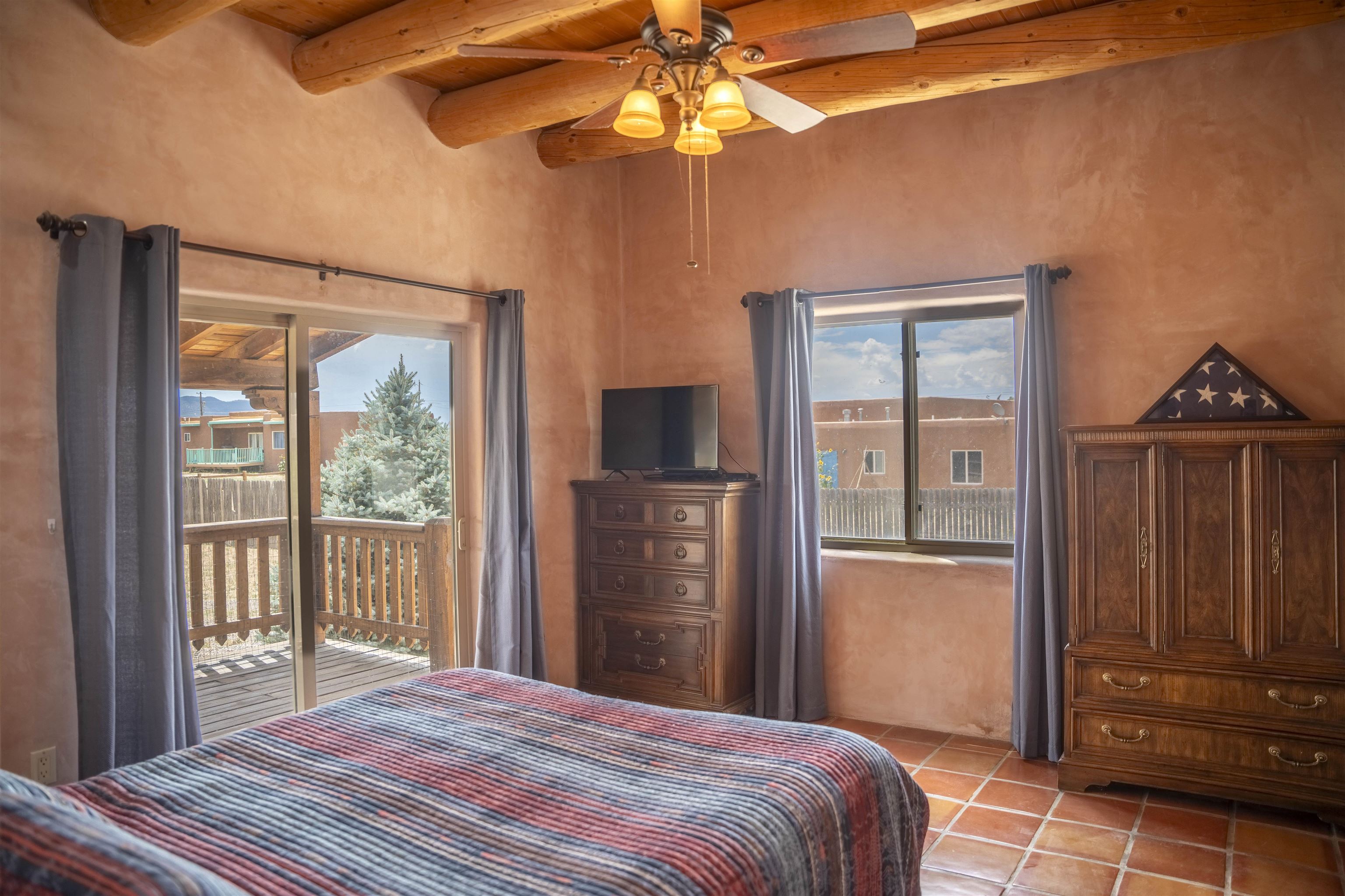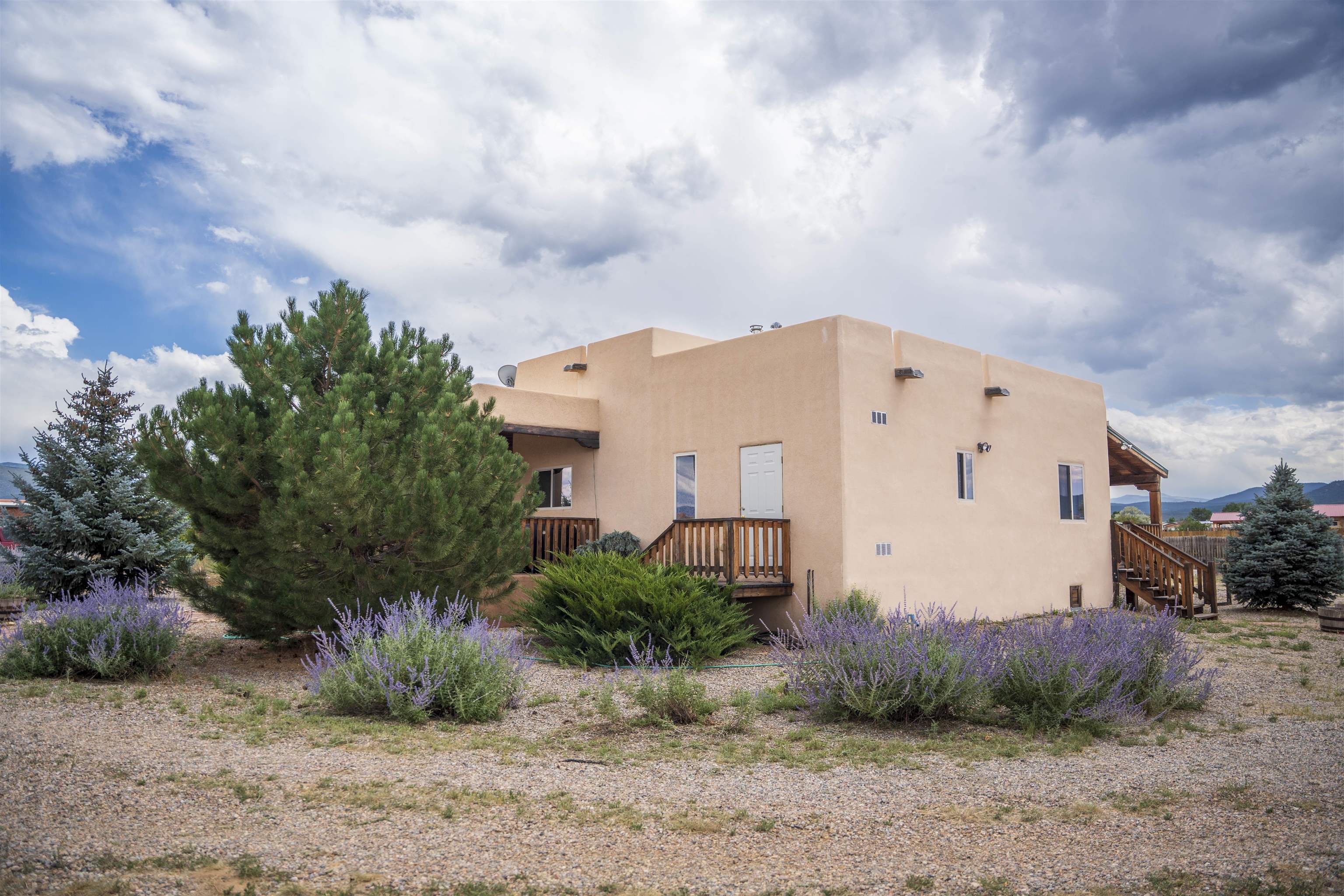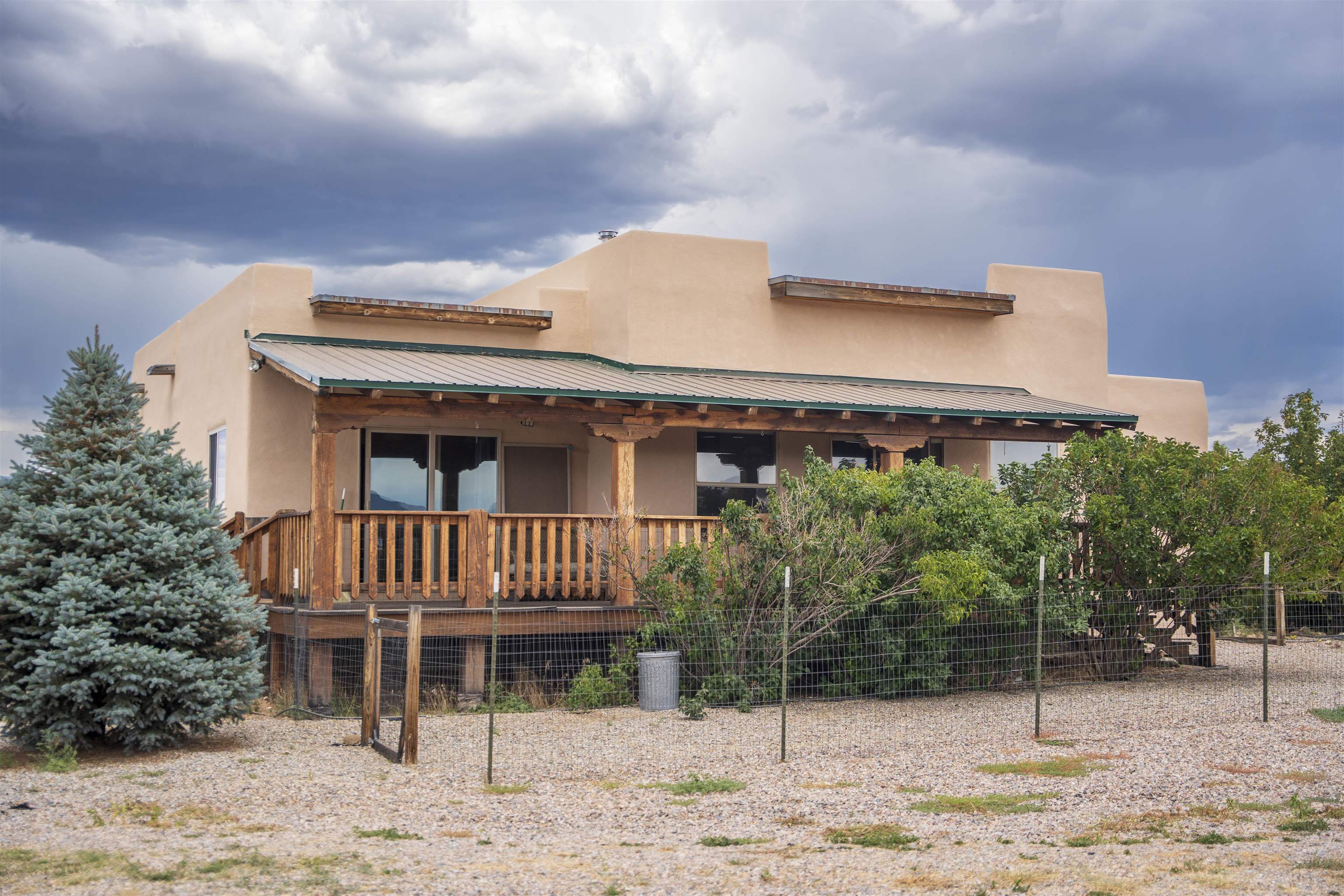 Whether you’re looking for a peaceful family haven, a work-from-home escape, or a Southwest-inspired retreat, this property delivers space, privacy, and timeless style just minutes from the heart of Taos. Pueblo Style home tucked away in a cul-de-sac just 15 minutes south of Taos Plaza. A circular drive and landscaping, this fully fenced property is thoughtfully designed with a separate dog run, raised garden beds, vibrant perennials, and fruit trees—cherry, apricot, plum, pear, and peach—perfect for green thumbs and nature lovers alike. Mature lilacs line the back portal, offering beauty and privacy year-round. Built in 2007, this 1,650 square foot 3 bedroom, 2 full bath home highlights the artistry of the Southwest: soaring 12' viga ceilings with tongue-and-groove finishes, Saltillo tile floors, hand-troweled diamond plaster walls, and carved spiral columns with corbels and rich wooden beams that exude warmth and character. The bright, open-concept great room is made for gathering, with a porcelain wood stove adding cozy ambiance. The spacious cook’s kitchen features abundant storage, a generous prep island with bar seating, stainless steel appliances. Step outside into the expansive covered portal, where you will discover a private oasis surrounded by breathtaking mountain vistas. Enjoy the tranquility of the landscape and views as you sip your morning coffee. The primary bedroom retreat is a true haven, offering a peaceful sanctuary to unwind and recharge. The ensuite bathroom provides both functionality and style. Two additional bedrooms provide ample space for family members, guests, or can be transformed into a home office or hobby room to suit your needs. The second bathroom, tastefully designed, offers convenience and comfort for all occupants. The allure of this property extends beyond the interior. Additional Highlights: In-floor radiant heating passive solar design for efficient year-round comfort, new water heater (2024) and roof recoating (2023). Well share with water softener system. Utility room with washer and dryer. High-speed CenturyLink internet. Separate mechanical room. No restrictive covenants—offering flexibility for your creative vision. Call and schedule a showing today!