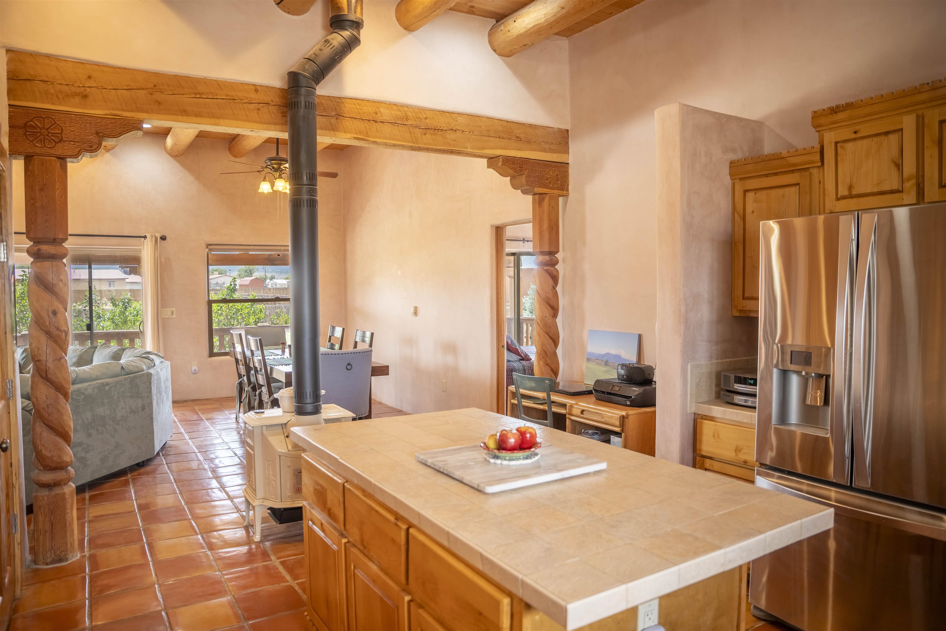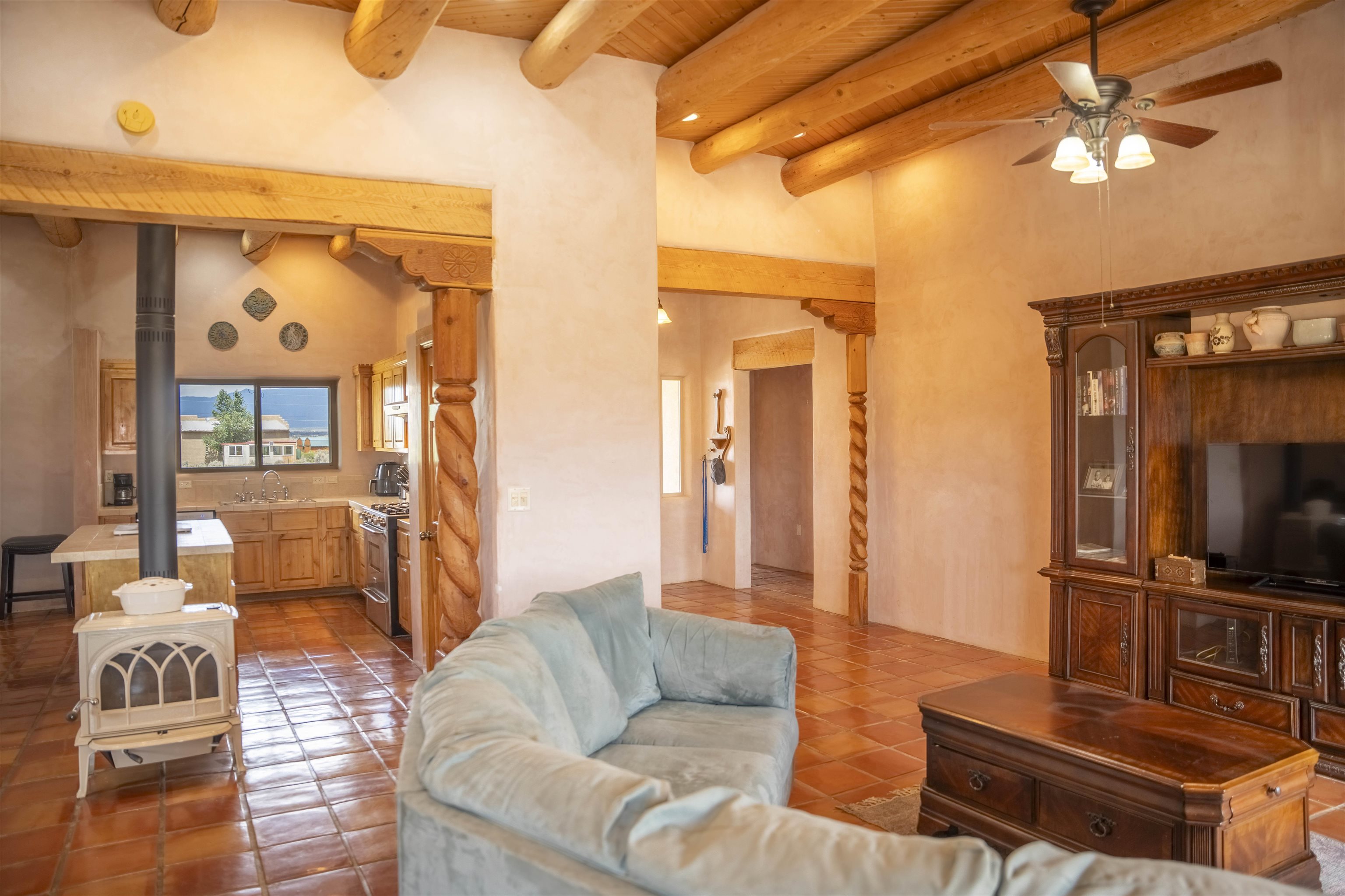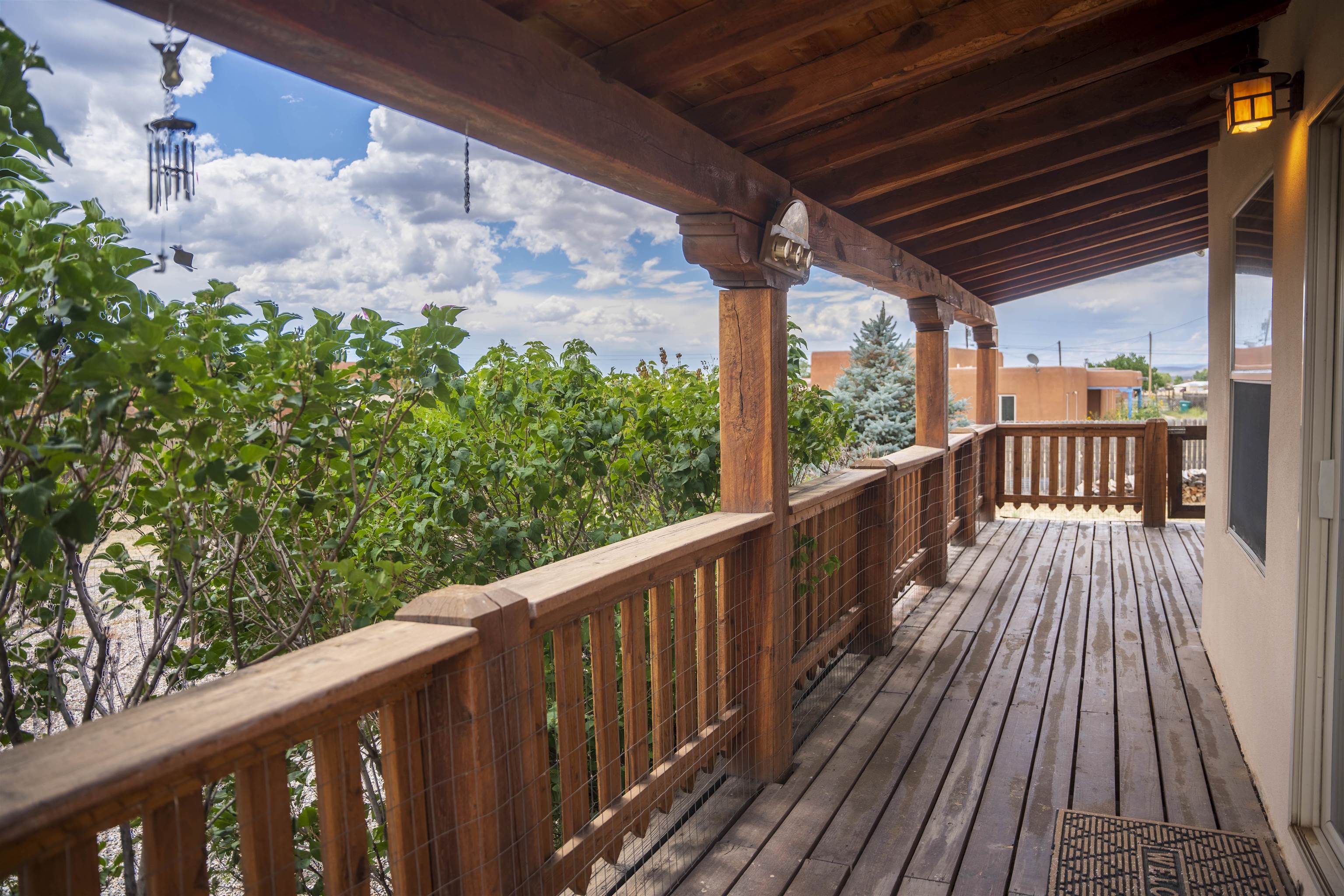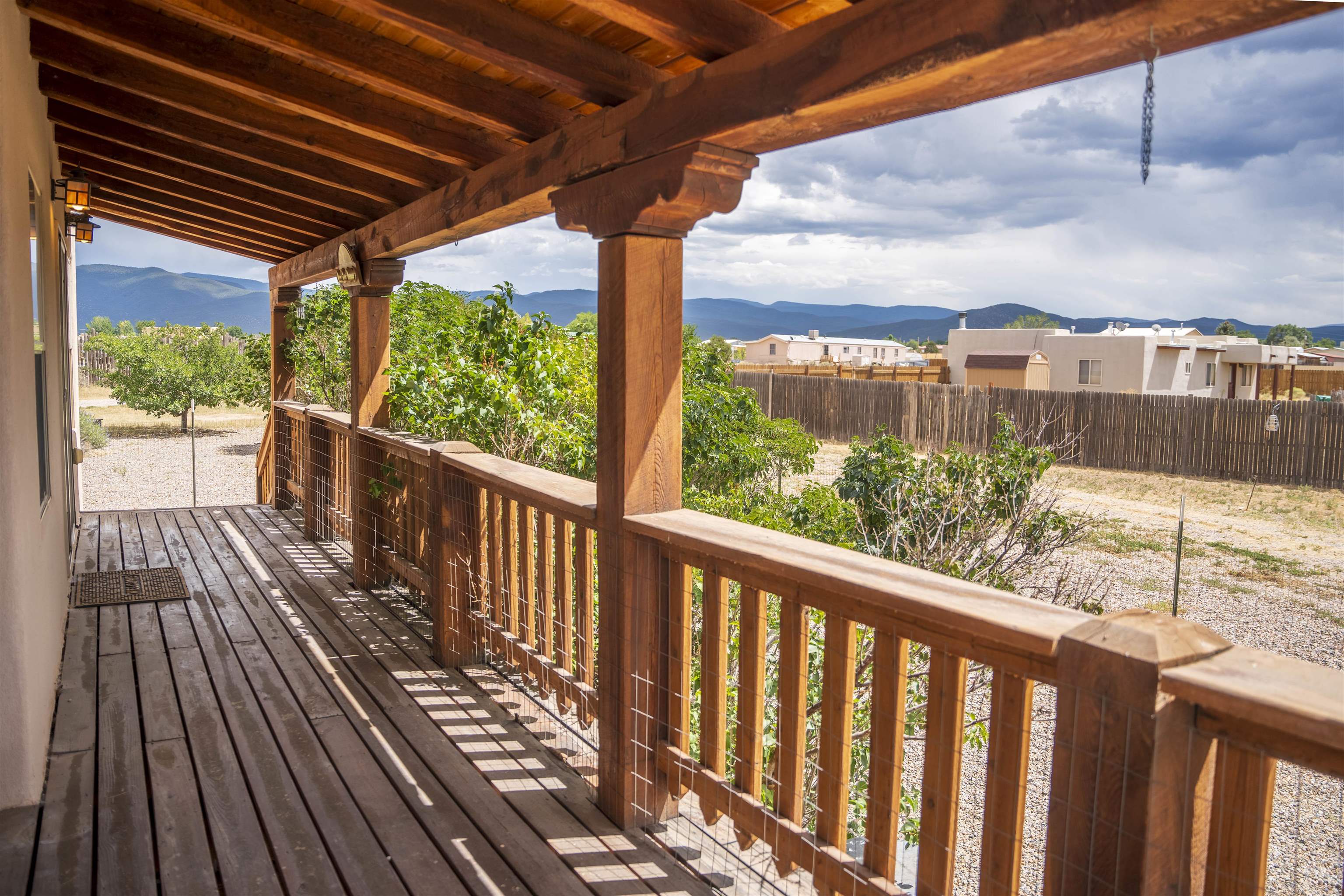 Whether you’re looking for a peaceful family haven, a work-from-home escape, or a Southwest-inspired retreat, this property delivers space, privacy, and timeless style just minutes from the heart of Taos. Pueblo Style home tucked away in a cul-de-sac just 15 minutes south of Taos Plaza. A circular drive and landscaping, this fully fenced property is thoughtfully designed with a separate dog run, raised garden beds, vibrant perennials, and fruit trees—cherry, apricot, plum, pear, and peach—perfect for green thumbs and nature lovers alike. Mature lilacs line the back portal, offering beauty and privacy year-round. Built in 2007, this 1,650 square foot 3 bedroom, 2 full bath home highlights the artistry of the Southwest: soaring 12' viga ceilings with tongue-and-groove finishes, Saltillo tile floors, hand-troweled diamond plaster walls, and carved spiral columns with corbels and rich wooden beams that exude warmth and character. The bright, open-concept great room is made for gathering, with a porcelain wood stove adding cozy ambiance. The spacious cook’s kitchen features abundant storage, a generous prep island with bar seating, stainless steel appliances. Step outside into the expansive covered portal, where you will discover a private oasis surrounded by breathtaking mountain vistas. Enjoy the tranquility of the landscape and views as you sip your morning coffee. The primary bedroom retreat is a true haven, offering a peaceful sanctuary to unwind and recharge. The ensuite bathroom provides both functionality and style. Two additional bedrooms provide ample space for family members, guests, or can be transformed into a home office or hobby room to suit your needs. The second bathroom, tastefully designed, offers convenience and comfort for all occupants. The allure of this property extends beyond the interior. Additional Highlights: In-floor radiant heating passive solar design for efficient year-round comfort, new water heater (2024) and roof recoating (2023). Well share with water softener system. Utility room with washer and dryer. High-speed CenturyLink internet. Separate mechanical room. No restrictive covenants—offering flexibility for your creative vision. Call and schedule a showing today!