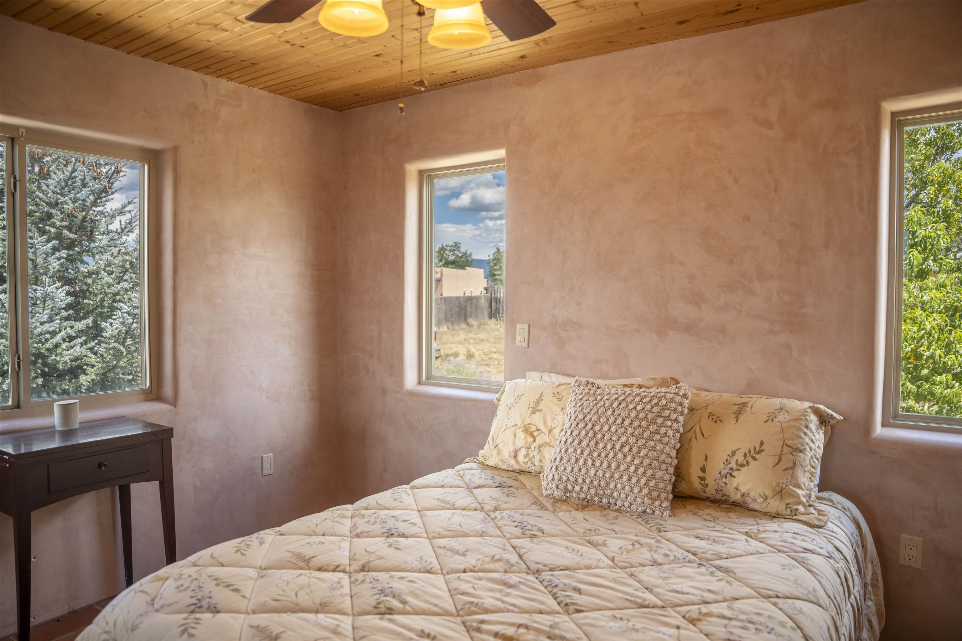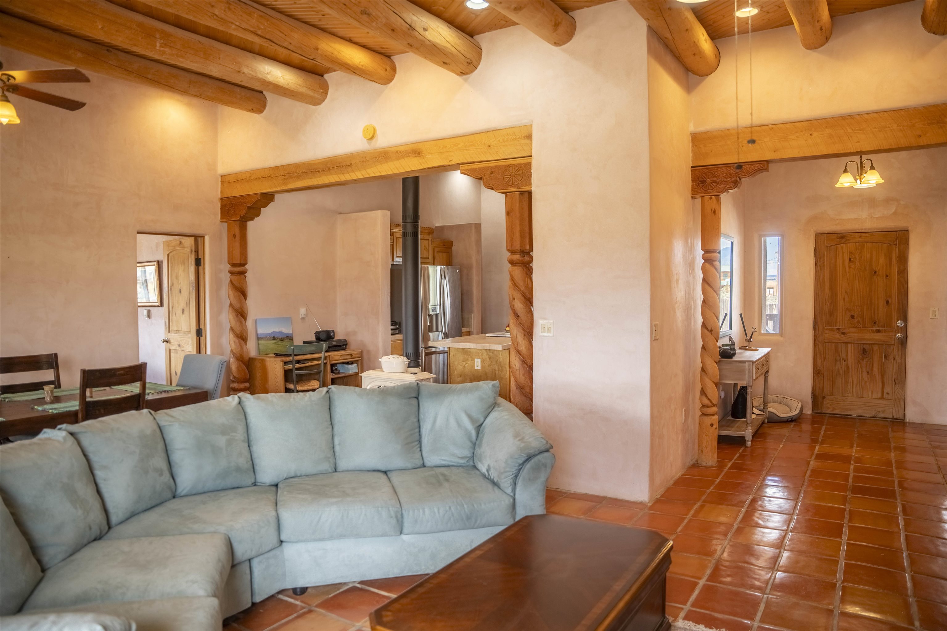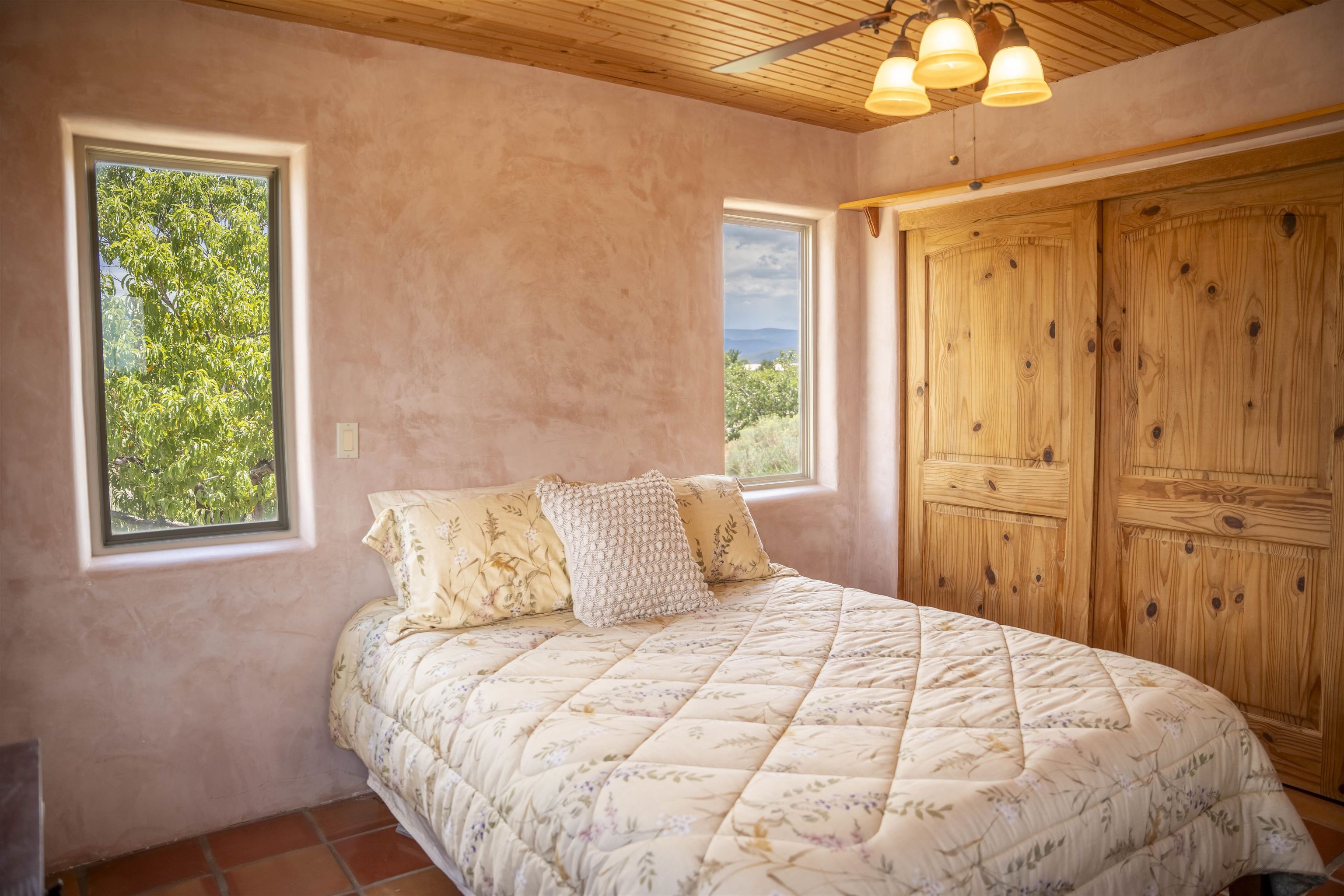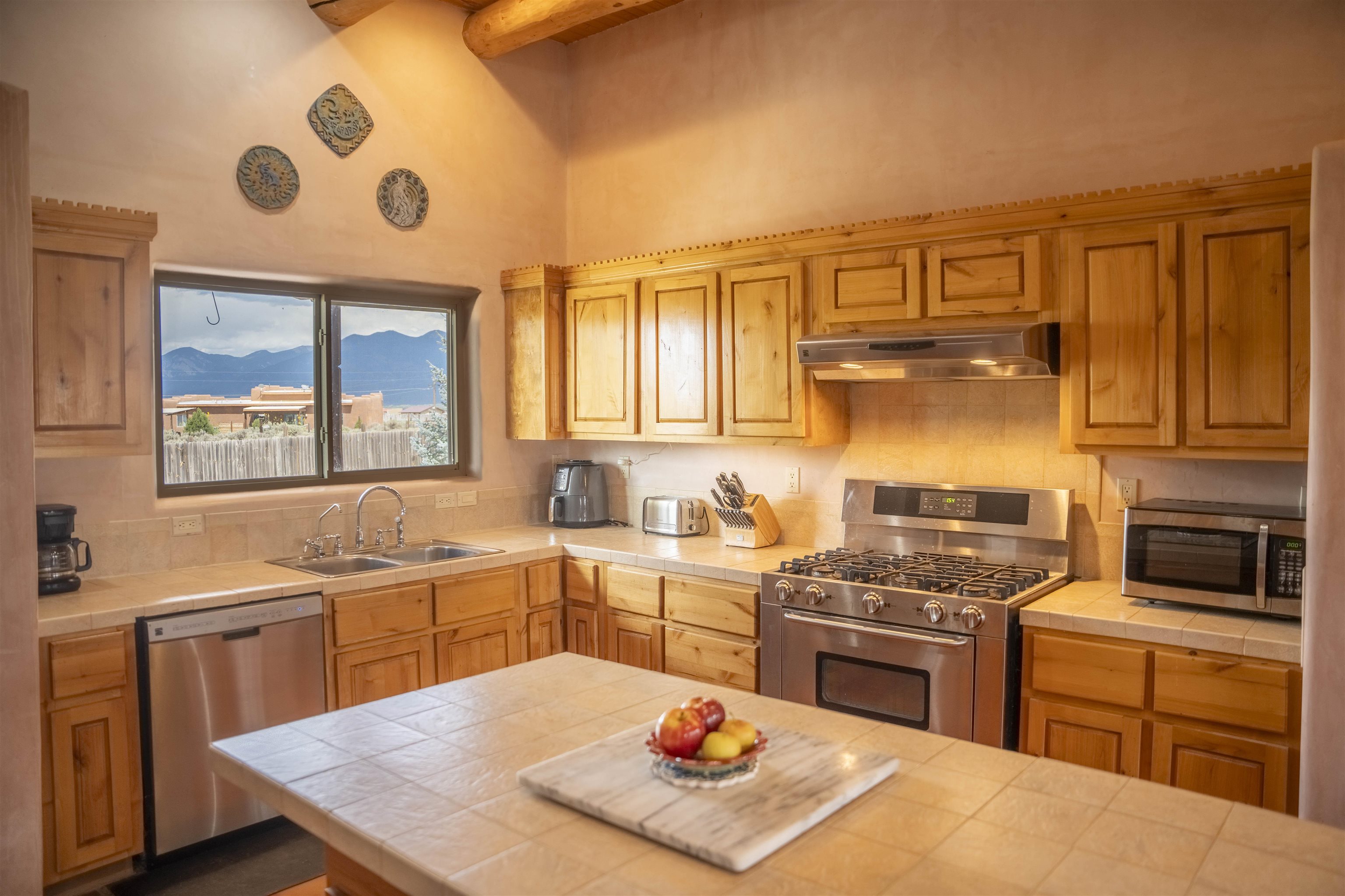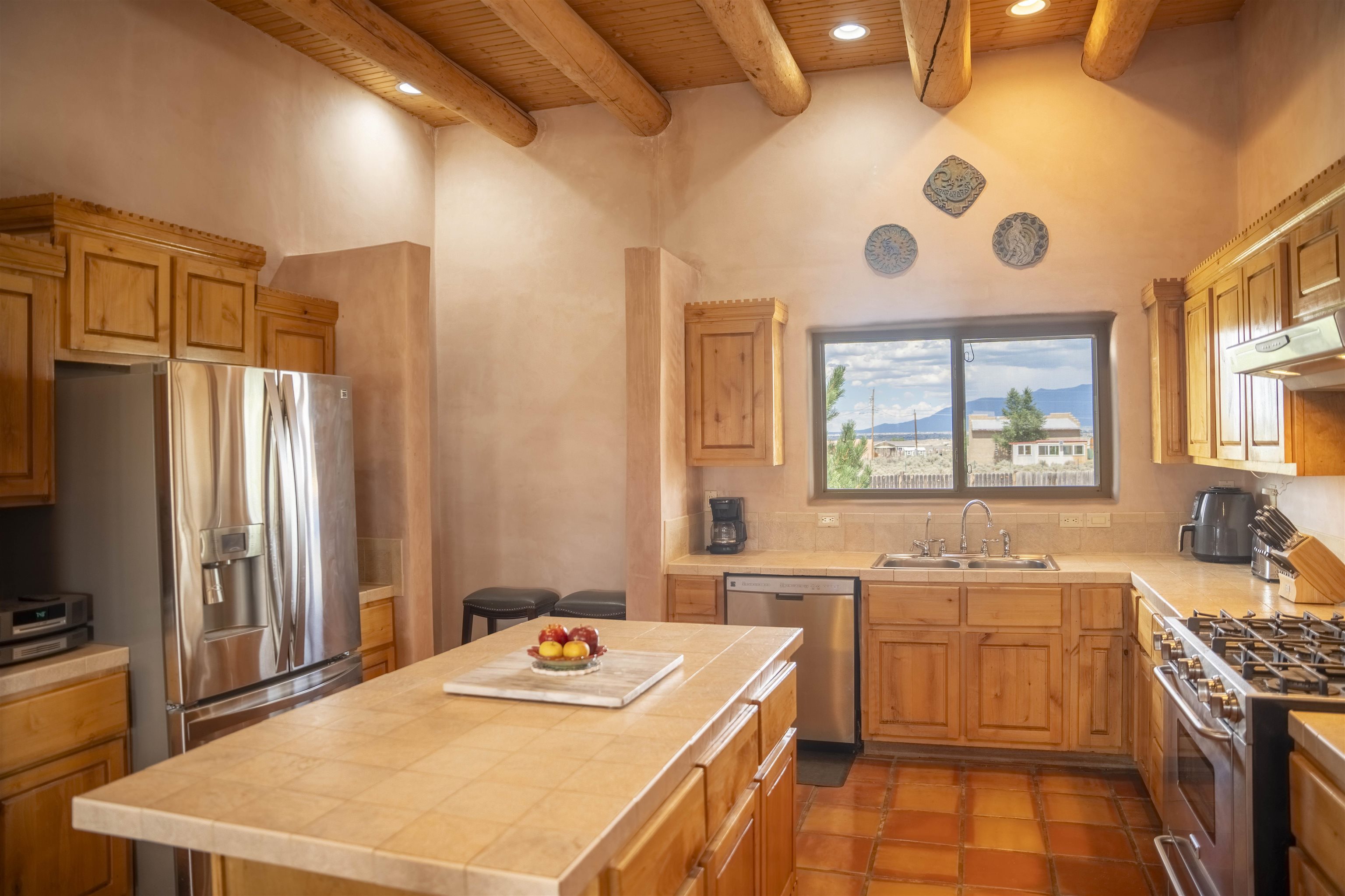 Whether you’re looking for a peaceful family haven, a work-from-home escape, or a Southwest-inspired retreat, this property delivers space, privacy, and timeless style just minutes from the heart of Taos. Pueblo Style home tucked away in a cul-de-sac just 15 minutes south of Taos Plaza. A circular drive and landscaping, this fully fenced property is thoughtfully designed with a separate dog run, raised garden beds, vibrant perennials, and fruit trees—cherry, apricot, plum, pear, and peach—perfect for green thumbs and nature lovers alike. Mature lilacs line the back portal, offering beauty and privacy year-round. Built in 2007, this 1,650 square foot 3 bedroom, 2 full bath home highlights the artistry of the Southwest: soaring 12' viga ceilings with tongue-and-groove finishes, Saltillo tile floors, hand-troweled diamond plaster walls, and carved spiral columns with corbels and rich wooden beams that exude warmth and character. The bright, open-concept great room is made for gathering, with a porcelain wood stove adding cozy ambiance. The spacious cook’s kitchen features abundant storage, a generous prep island with bar seating, stainless steel appliances. Step outside into the expansive covered portal, where you will discover a private oasis surrounded by breathtaking mountain vistas. Enjoy the tranquility of the landscape and views as you sip your morning coffee. The primary bedroom retreat is a true haven, offering a peaceful sanctuary to unwind and recharge. The ensuite bathroom provides both functionality and style. Two additional bedrooms provide ample space for family members, guests, or can be transformed into a home office or hobby room to suit your needs. The second bathroom, tastefully designed, offers convenience and comfort for all occupants. The allure of this property extends beyond the interior. Additional Highlights: In-floor radiant heating passive solar design for efficient year-round comfort, new water heater (2024) and roof recoating (2023). Well share with water softener system. Utility room with washer and dryer. High-speed CenturyLink internet. Separate mechanical room. No restrictive covenants—offering flexibility for your creative vision. Call and schedule a showing today!