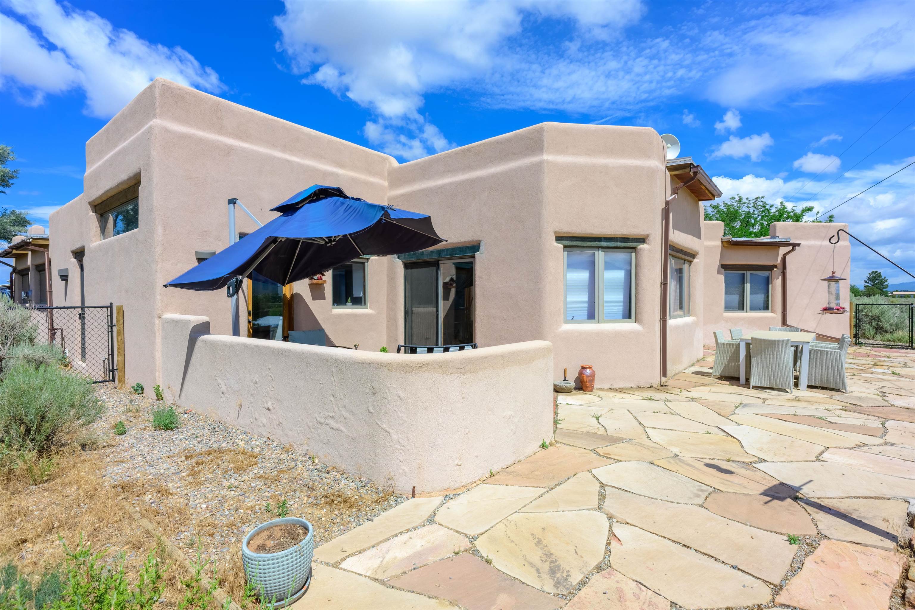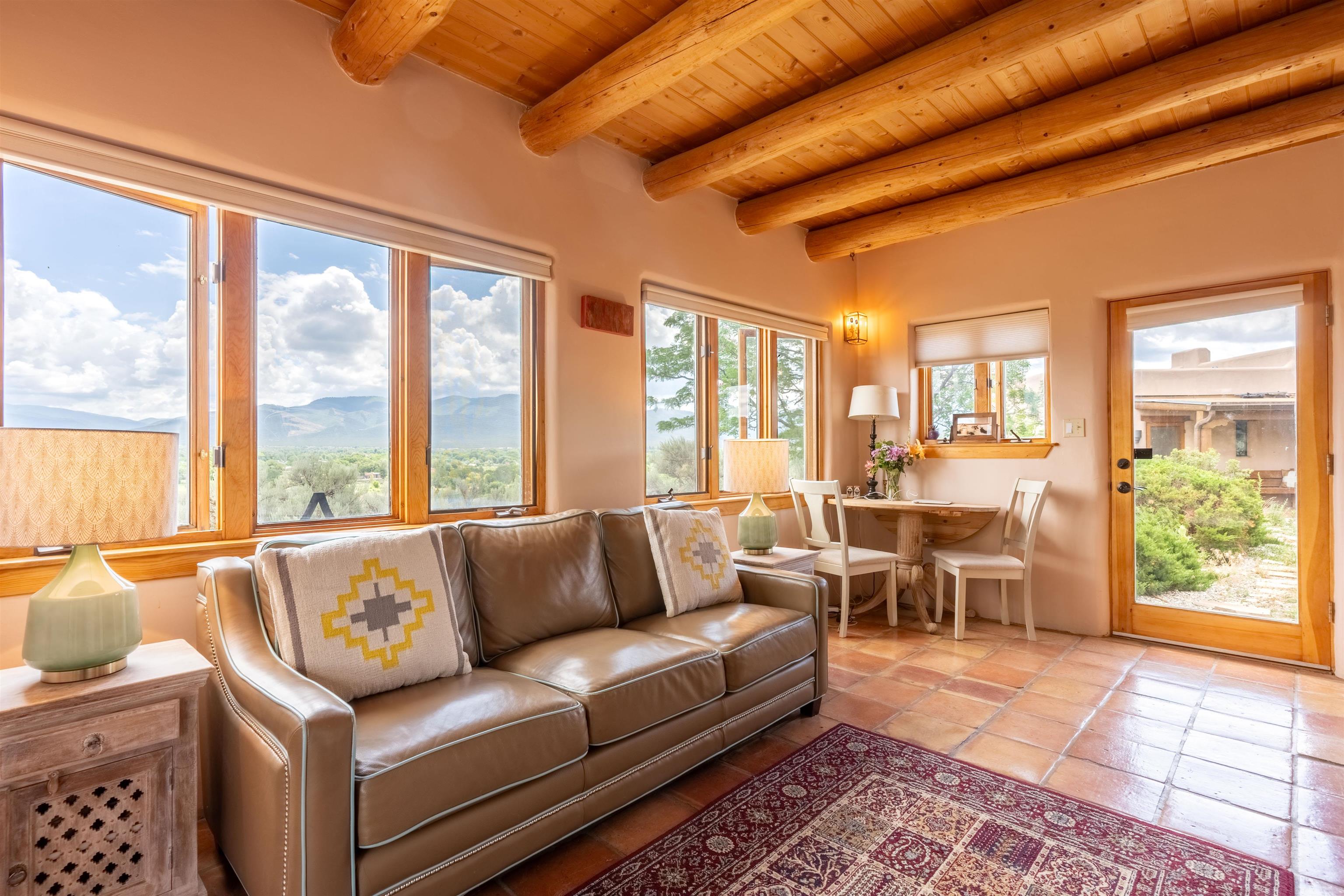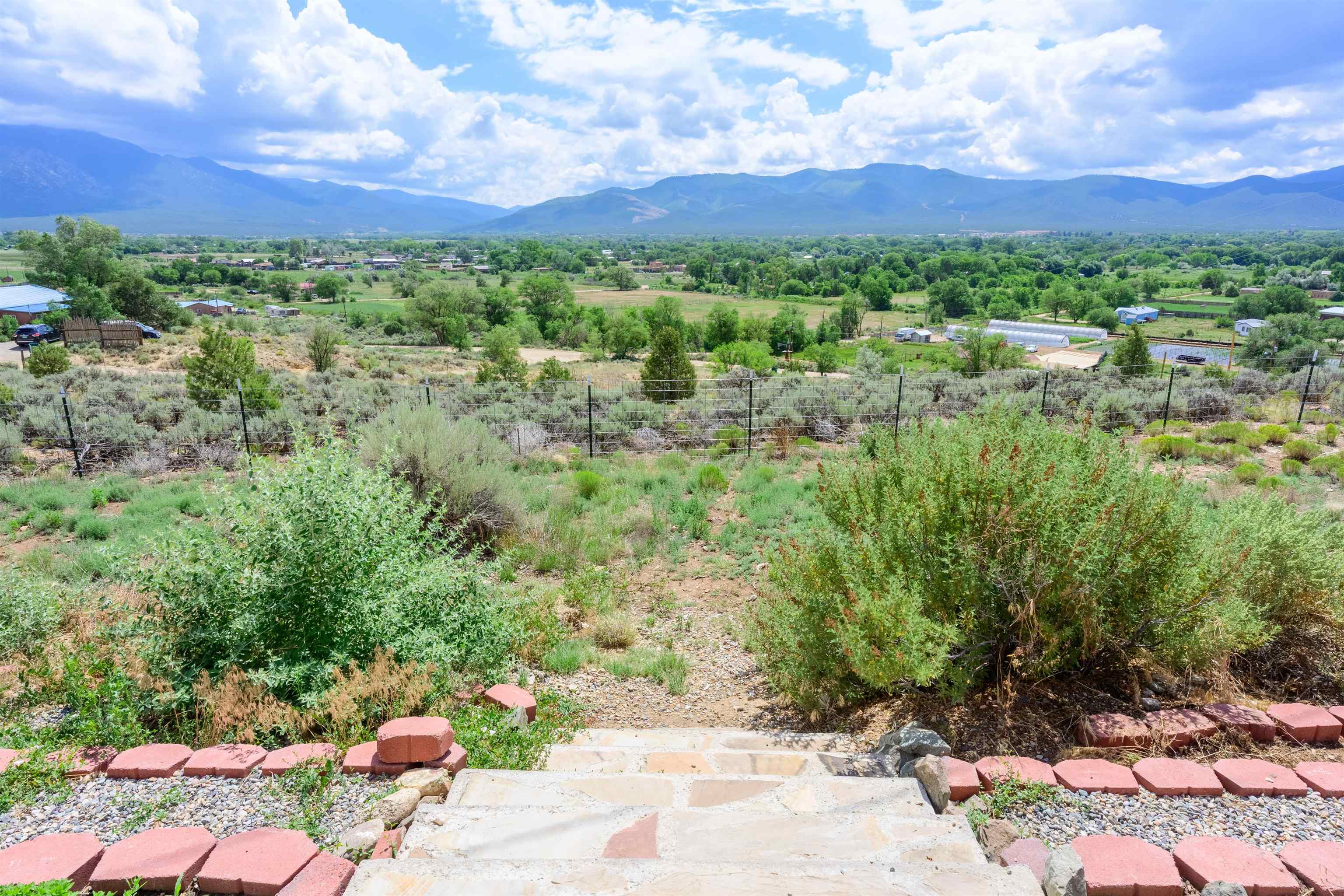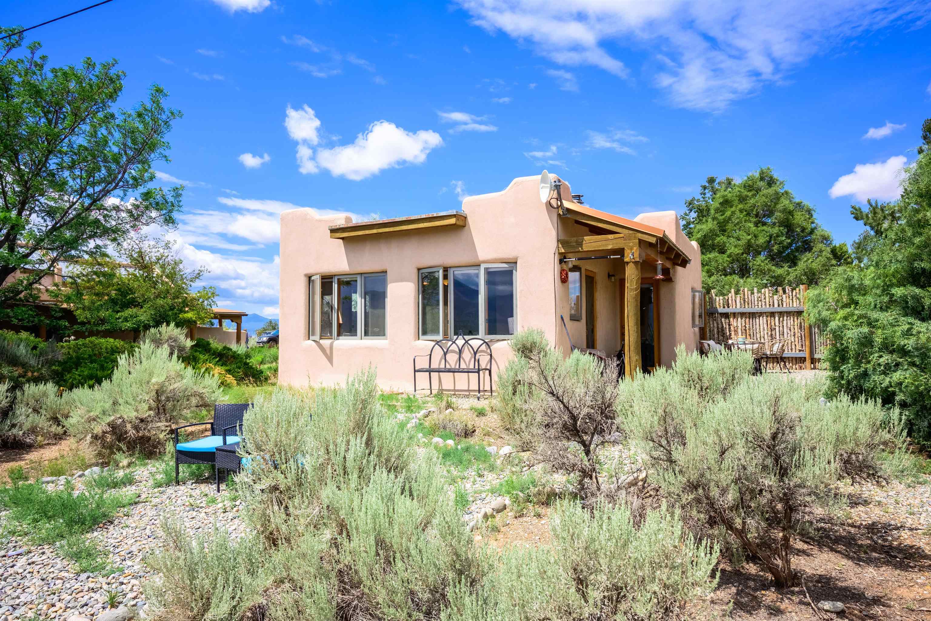 Imagine owning a house and guesthouse overlooking Taos Valley with big mountain views on 1.95 acres. This glorious home is private, yet close to town and Taos Ski Valley. From the house you can see El Salto, Pueblo Peak, and even Truchas Peak. The orientation of the house and guesthouse allow you to enjoy both sunrises and sunsets. The home was designed to take advantage of solar gain with large clerestories in two bedrooms, trombe walls on the guesthouse, metal clad wood windows, saltillo tiles ,and hardwood floors. The home is both energy efficient and welcoming. The main house has three bedrooms and two baths. The kitchen opens onto a large patio with lots of space for outdoor dining and seating. Tiered garden beds are ready to plant and there is a fenced area for your furry friends. A large covered portal welcomes visitors into the front of the home and provides shaded seating overlooking a nice lawn with trees. The guesthouse entrance is down a path from the portal area. It is nicely appointed and has quite a bit of storage with living and dining areas combined and an efficient kitchen. A full sized bathroom makes this a very livable unit. In addition the guesthouse has its own private patio area. Views and space, light and bright, sweetly located and ready to move in, this property has so much to offer.