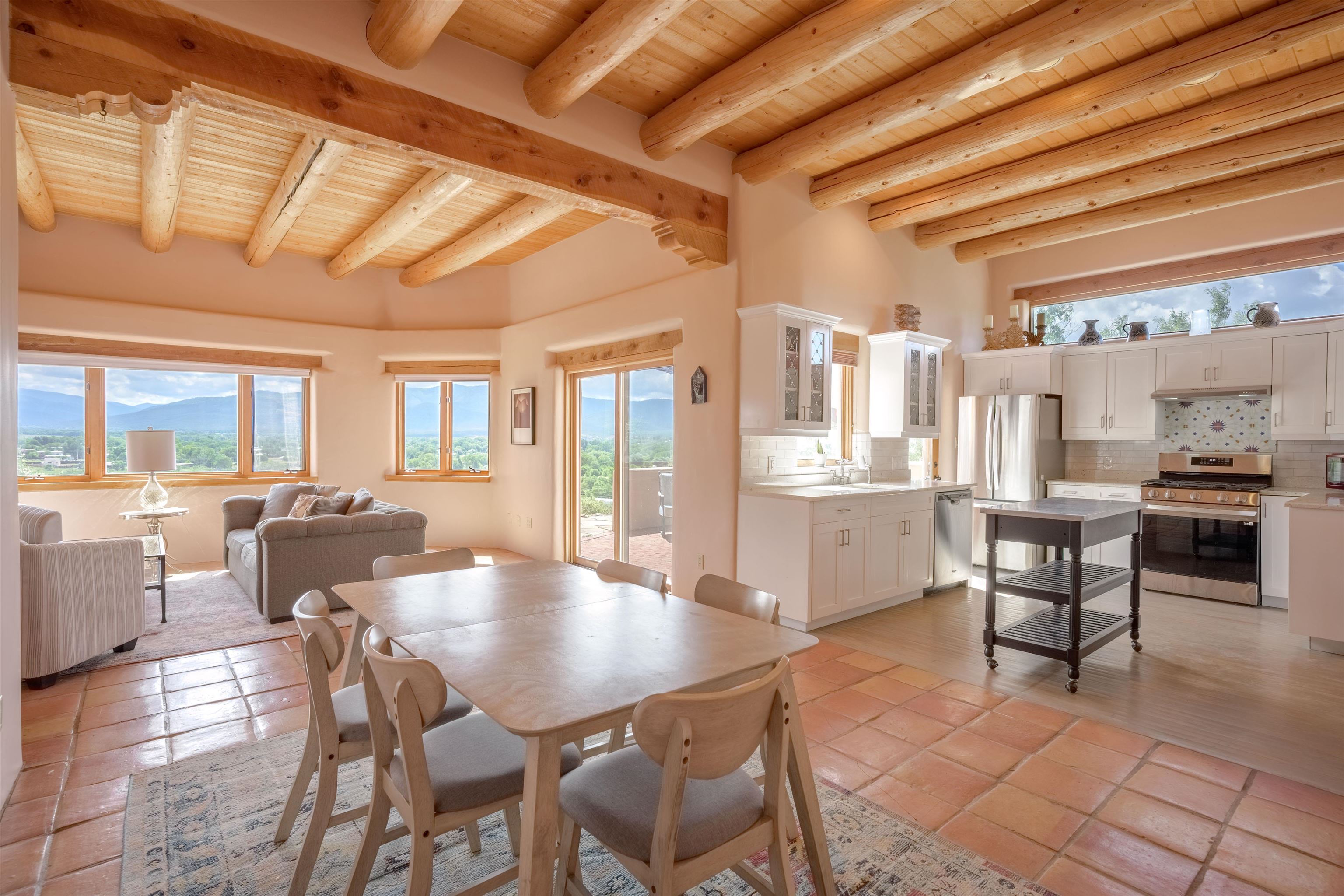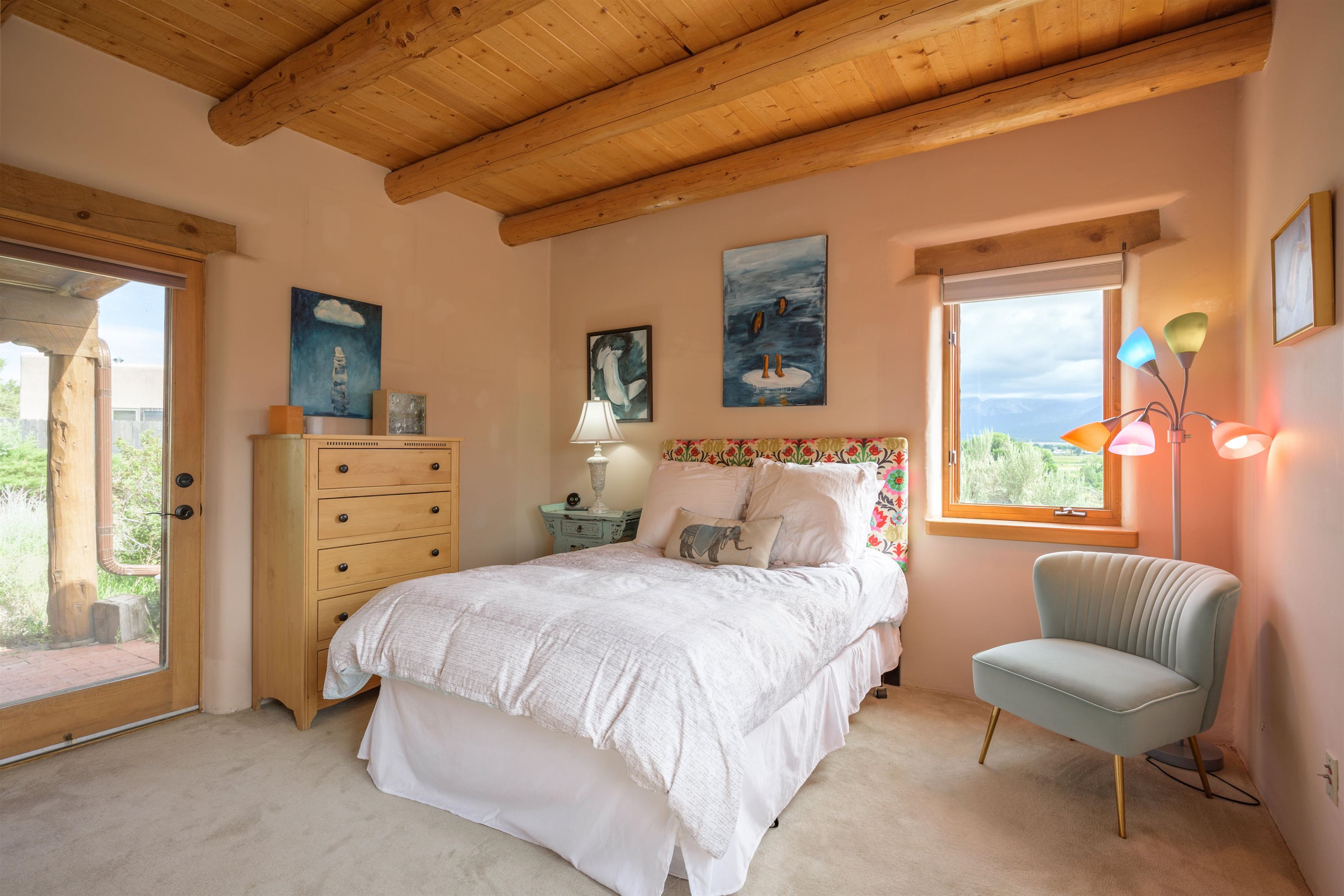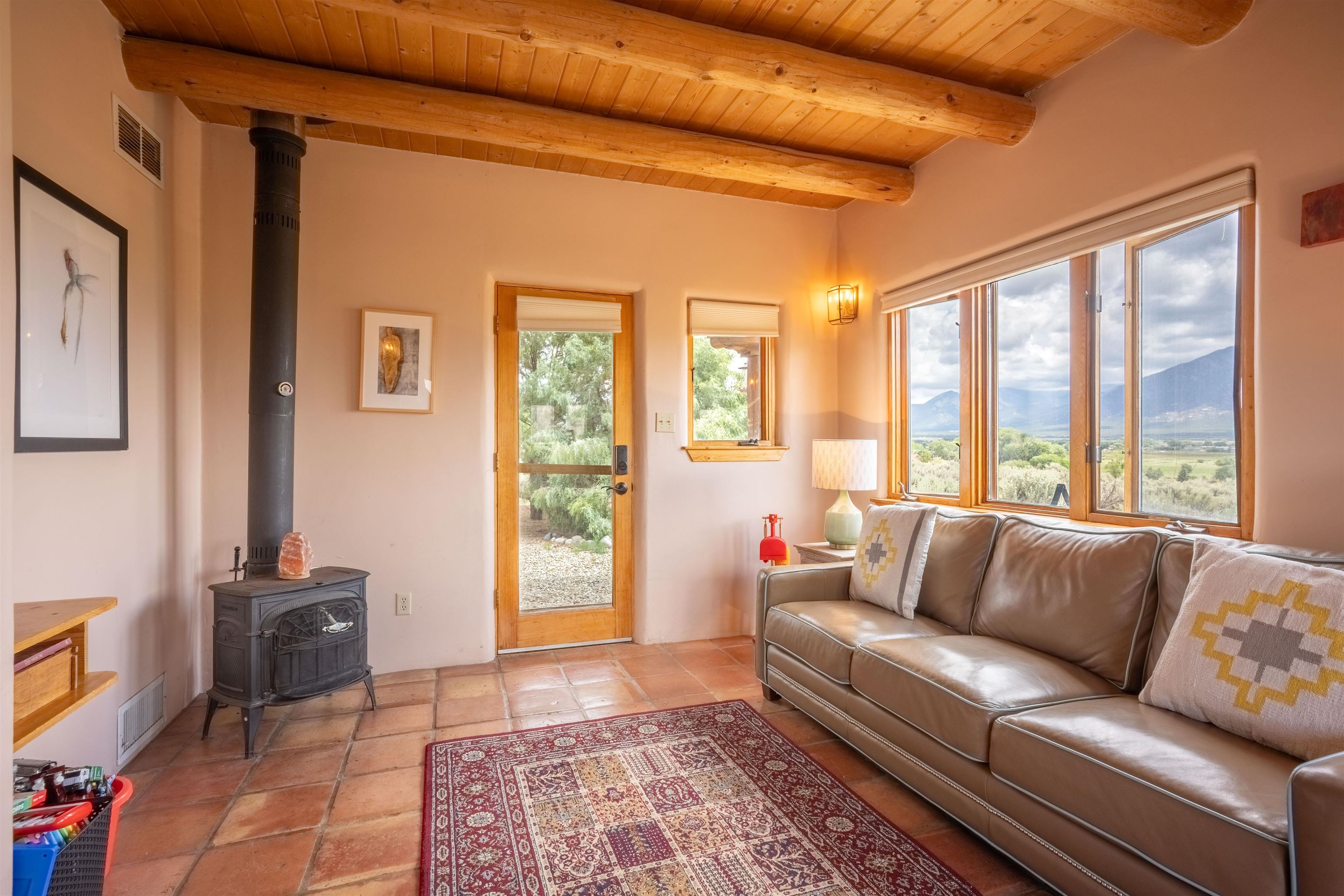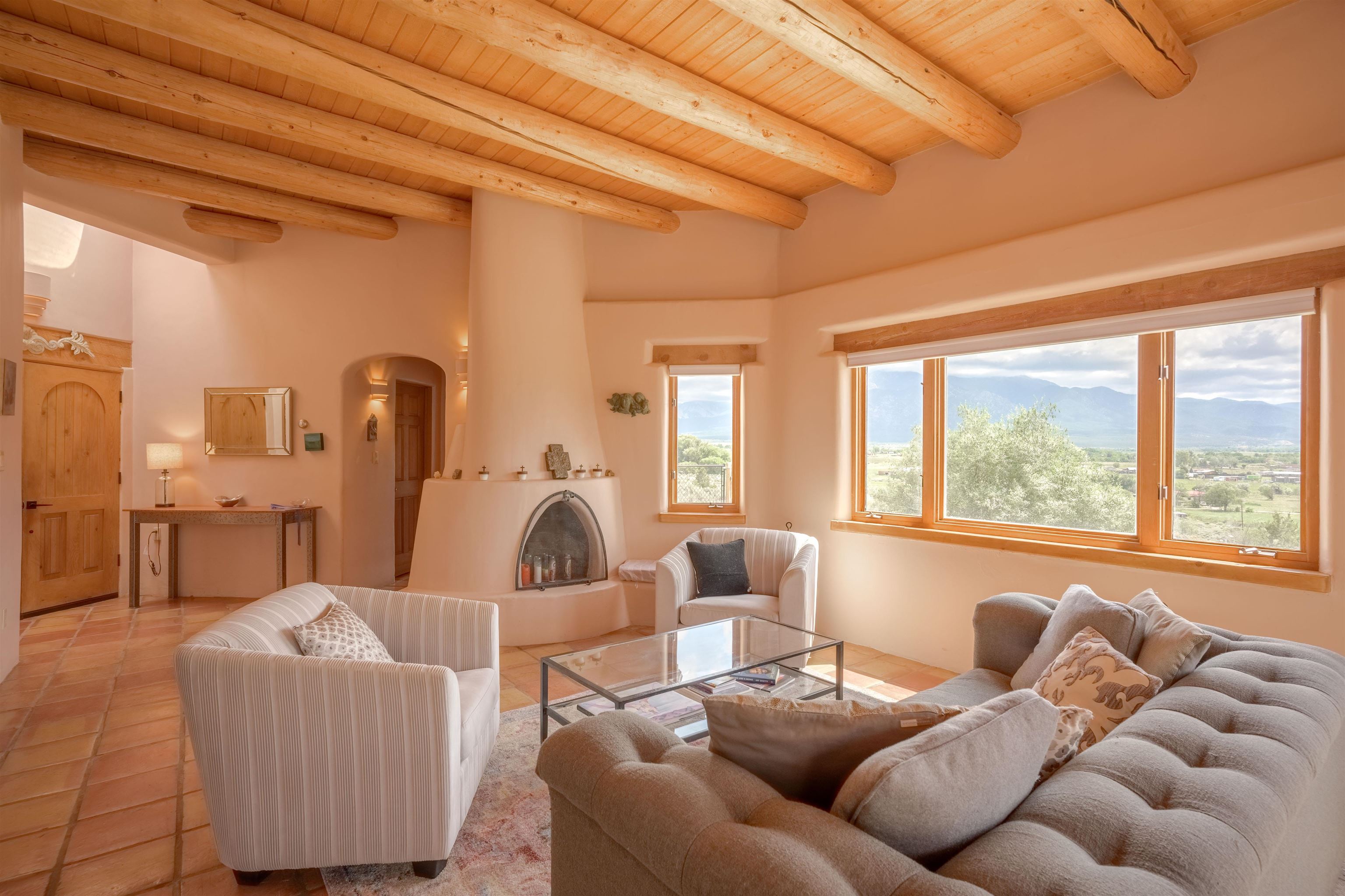 Imagine owning a house and guesthouse overlooking Taos Valley with big mountain views on 1.95 acres. This glorious home is private, yet close to town and Taos Ski Valley. From the house you can see El Salto, Pueblo Peak, and even Truchas Peak. The orientation of the house and guesthouse allow you to enjoy both sunrises and sunsets. The home was designed to take advantage of solar gain with large clerestories in two bedrooms, trombe walls on the guesthouse, metal clad wood windows, saltillo tiles ,and hardwood floors. The home is both energy efficient and welcoming. The main house has three bedrooms and two baths. The kitchen opens onto a large patio with lots of space for outdoor dining and seating. Tiered garden beds are ready to plant and there is a fenced area for your furry friends. A large covered portal welcomes visitors into the front of the home and provides shaded seating overlooking a nice lawn with trees. The guesthouse entrance is down a path from the portal area. It is nicely appointed and has quite a bit of storage with living and dining areas combined and an efficient kitchen. A full sized bathroom makes this a very livable unit. In addition the guesthouse has its own private patio area. Views and space, light and bright, sweetly located and ready to move in, this property has so much to offer.