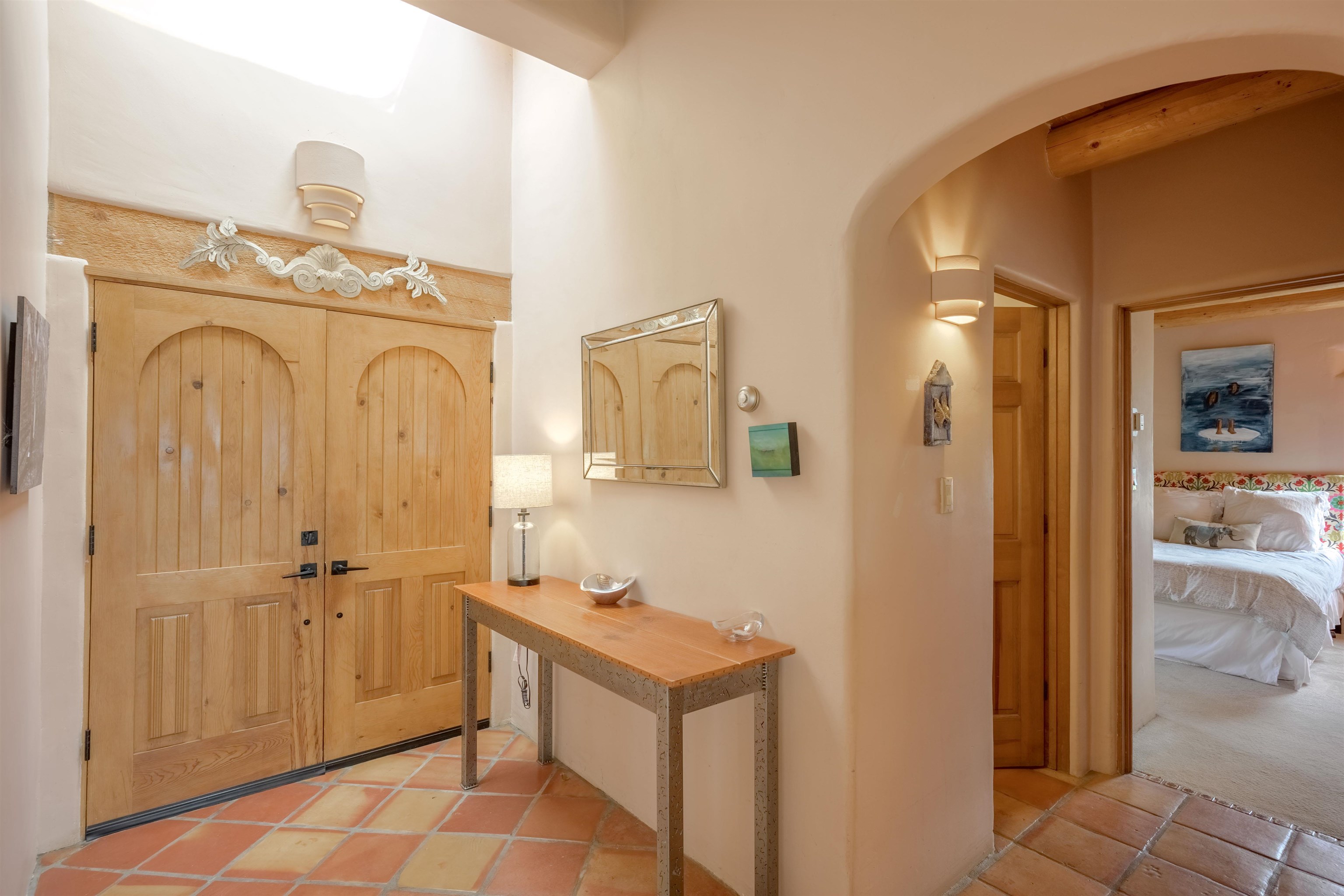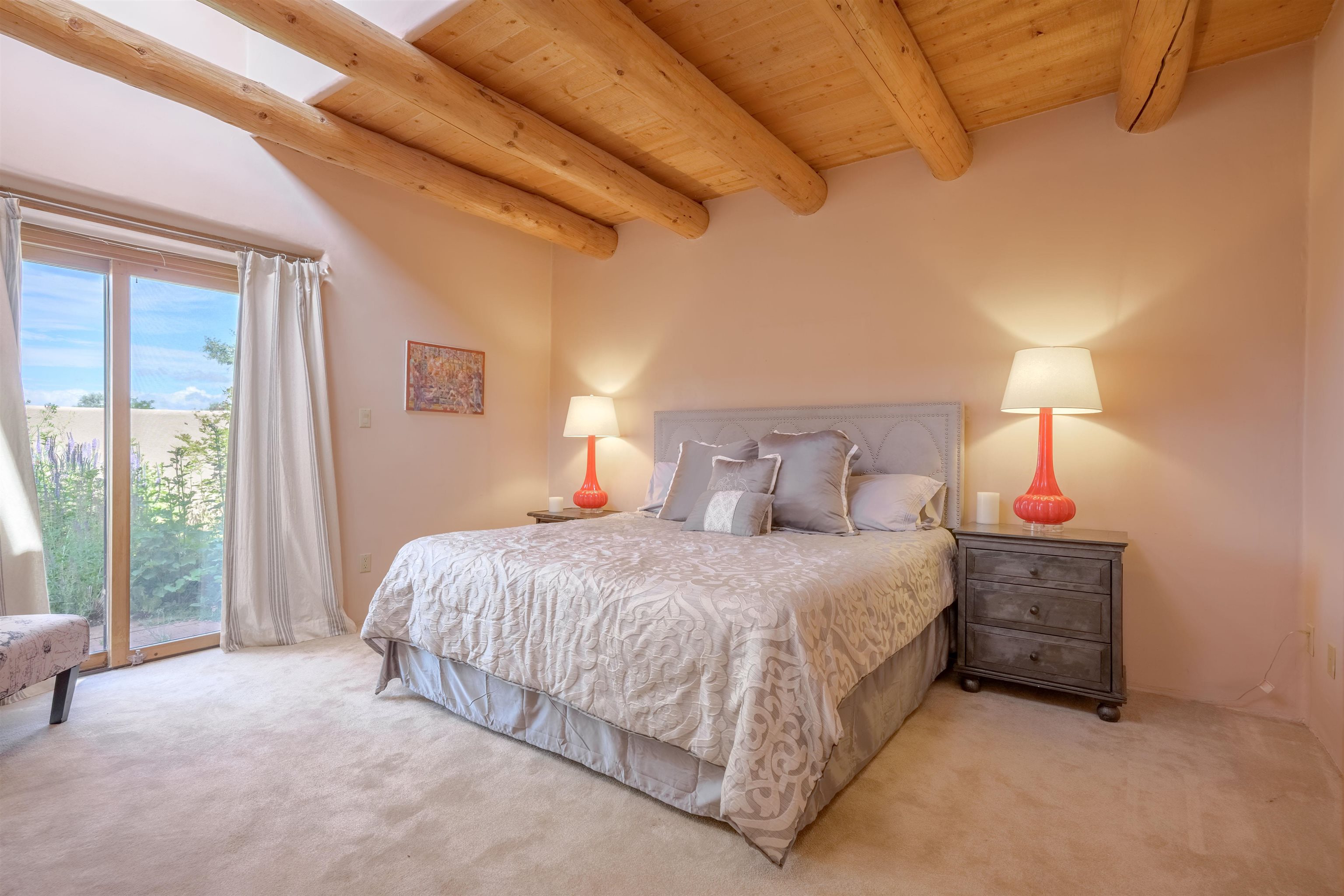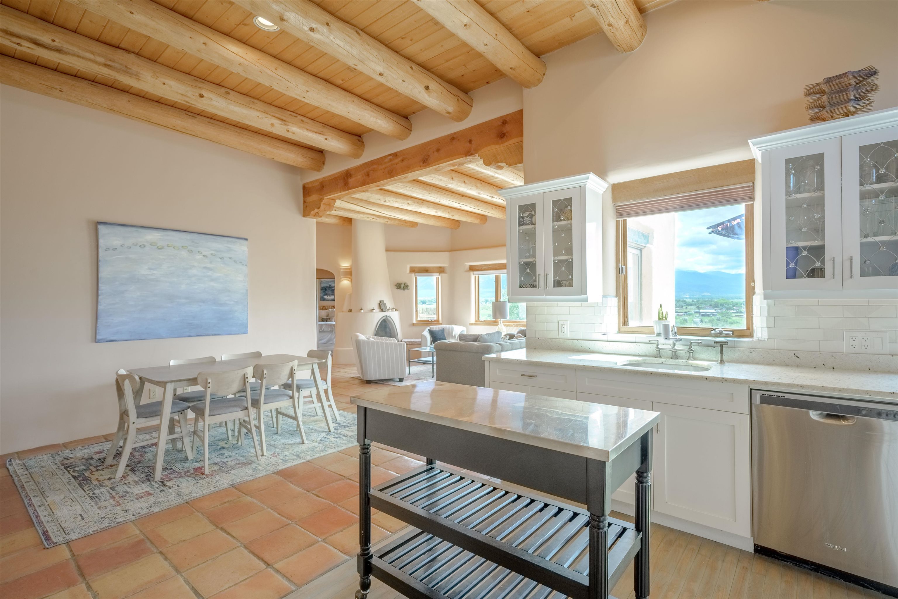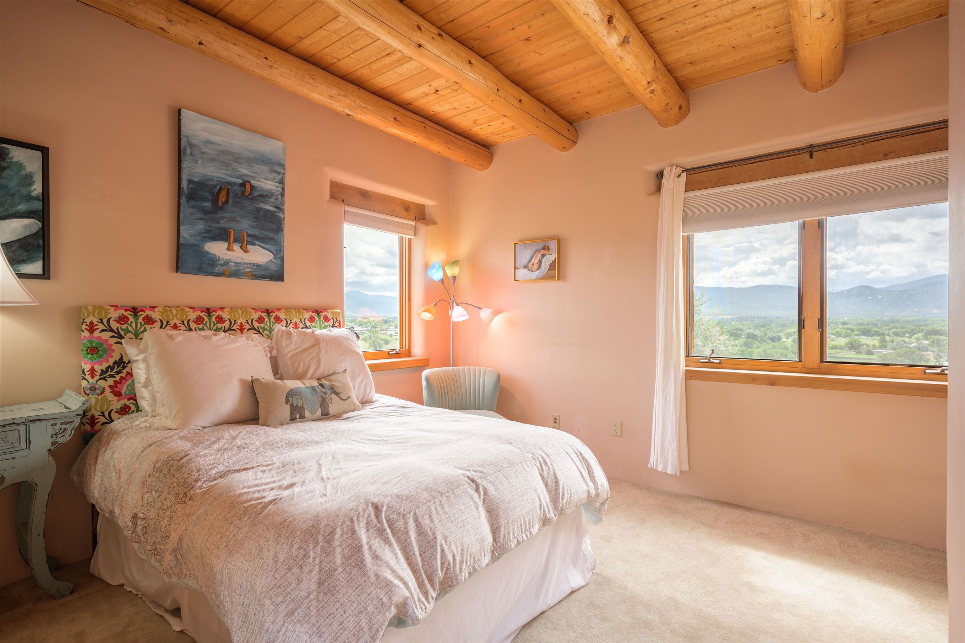 Imagine owning a house and guesthouse overlooking Taos Valley with big mountain views on 1.95 acres. This glorious home is private, yet close to town and Taos Ski Valley. From the house you can see El Salto, Pueblo Peak, and even Truchas Peak. The orientation of the house and guesthouse allow you to enjoy both sunrises and sunsets. The home was designed to take advantage of solar gain with large clerestories in two bedrooms, trombe walls on the guesthouse, metal clad wood windows, saltillo tiles ,and hardwood floors. The home is both energy efficient and welcoming. The main house has three bedrooms and two baths. The kitchen opens onto a large patio with lots of space for outdoor dining and seating. Tiered garden beds are ready to plant and there is a fenced area for your furry friends. A large covered portal welcomes visitors into the front of the home and provides shaded seating overlooking a nice lawn with trees. The guesthouse entrance is down a path from the portal area. It is nicely appointed and has quite a bit of storage with living and dining areas combined and an efficient kitchen. A full sized bathroom makes this a very livable unit. In addition the guesthouse has its own private patio area. Views and space, light and bright, sweetly located and ready to move in, this property has so much to offer.