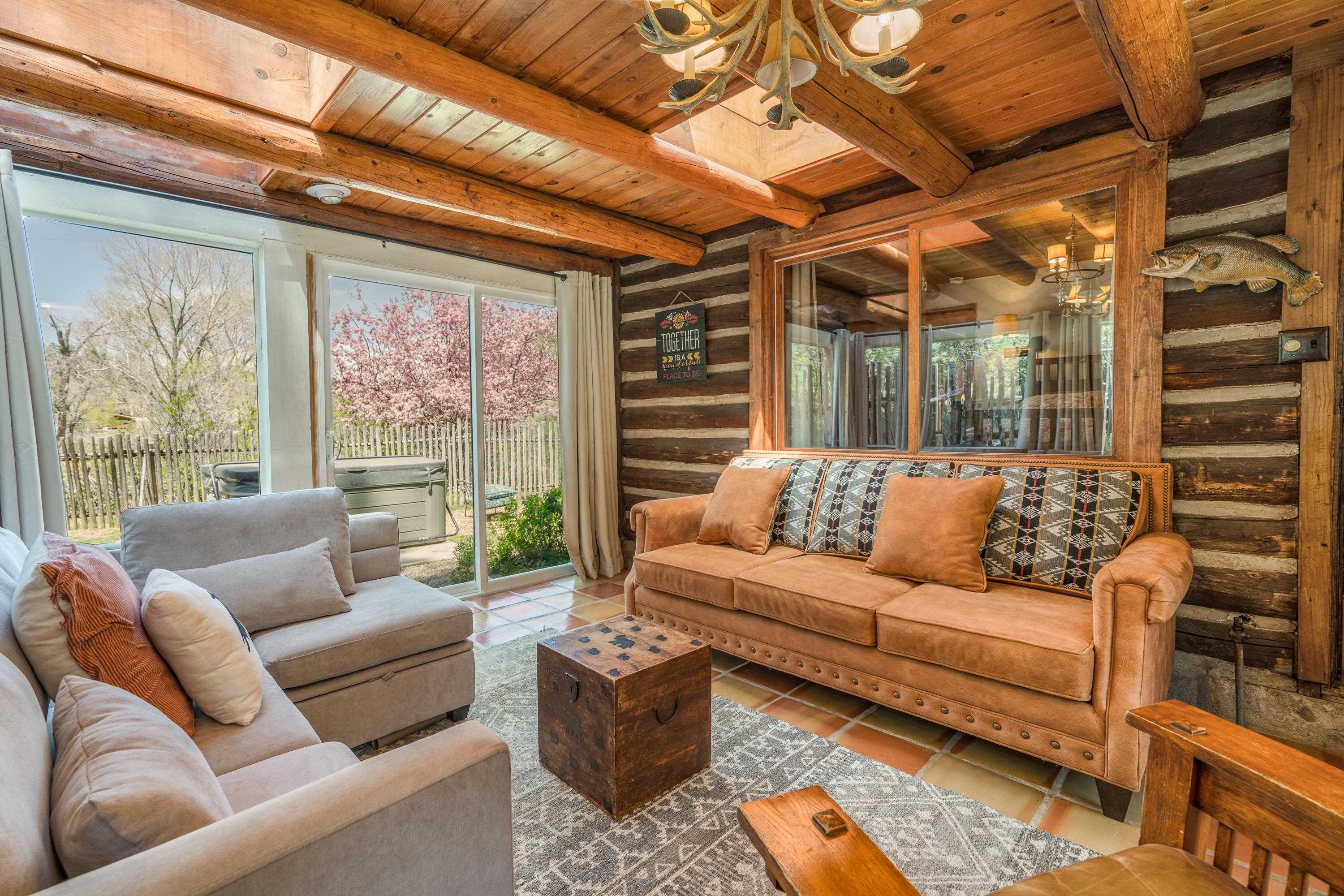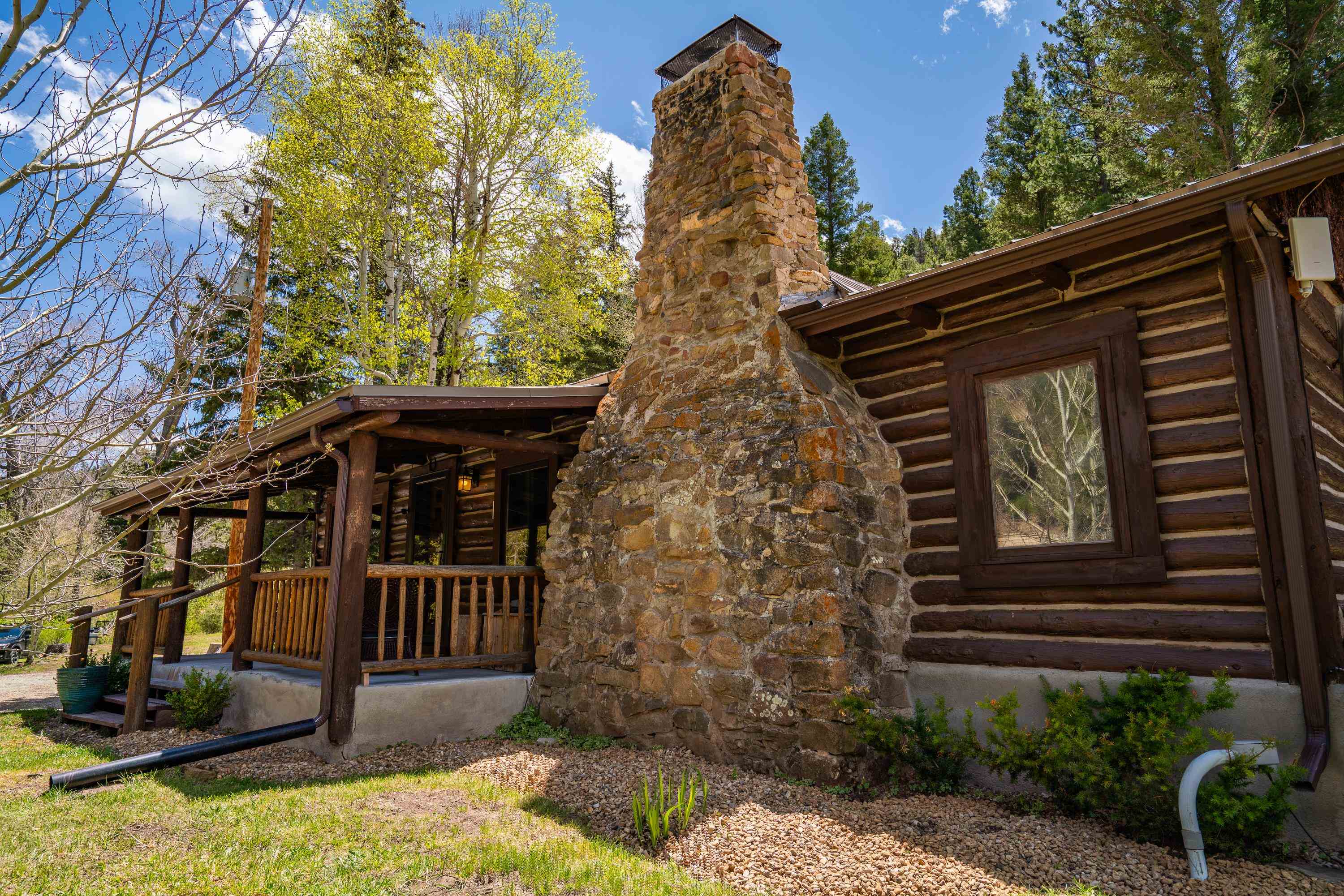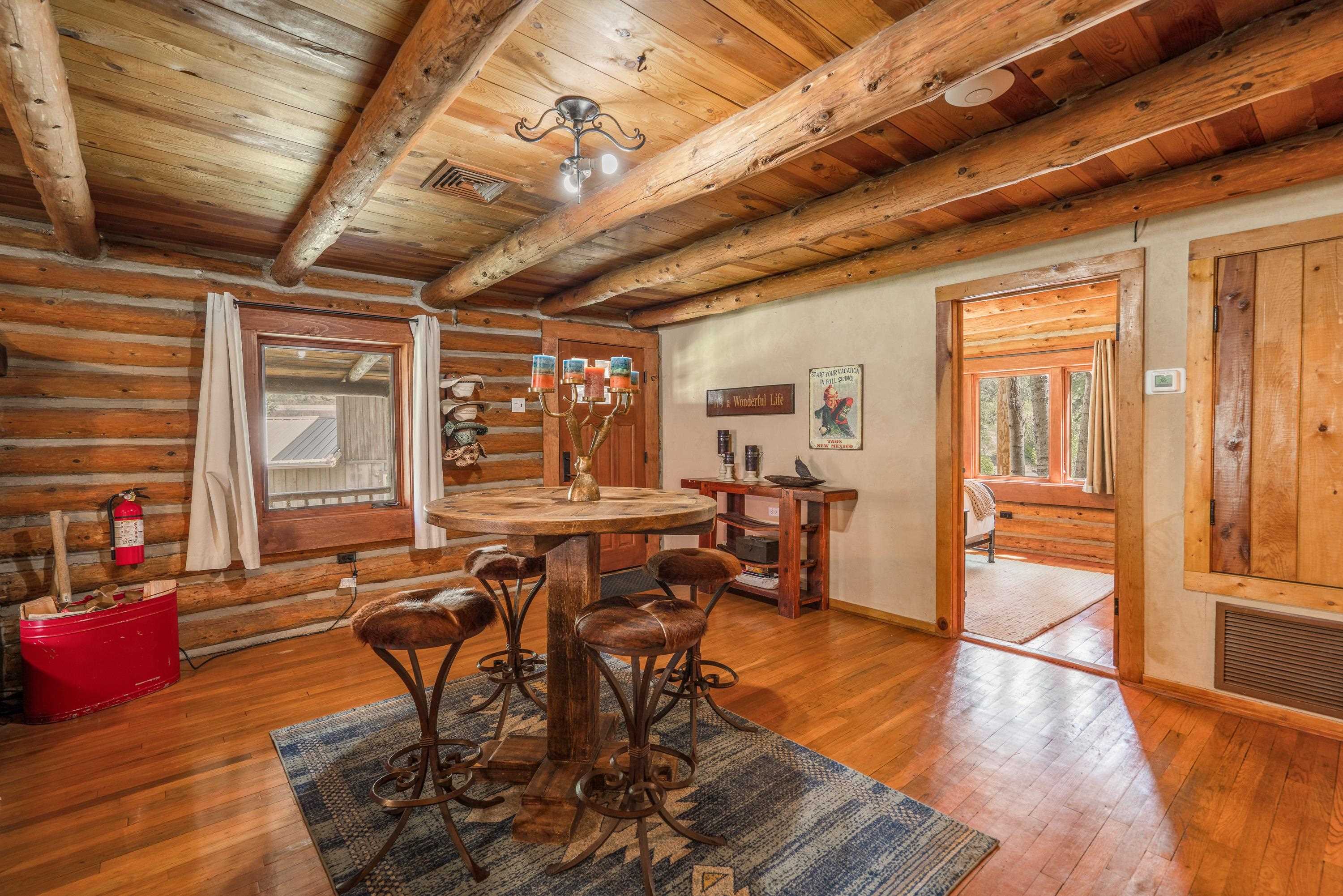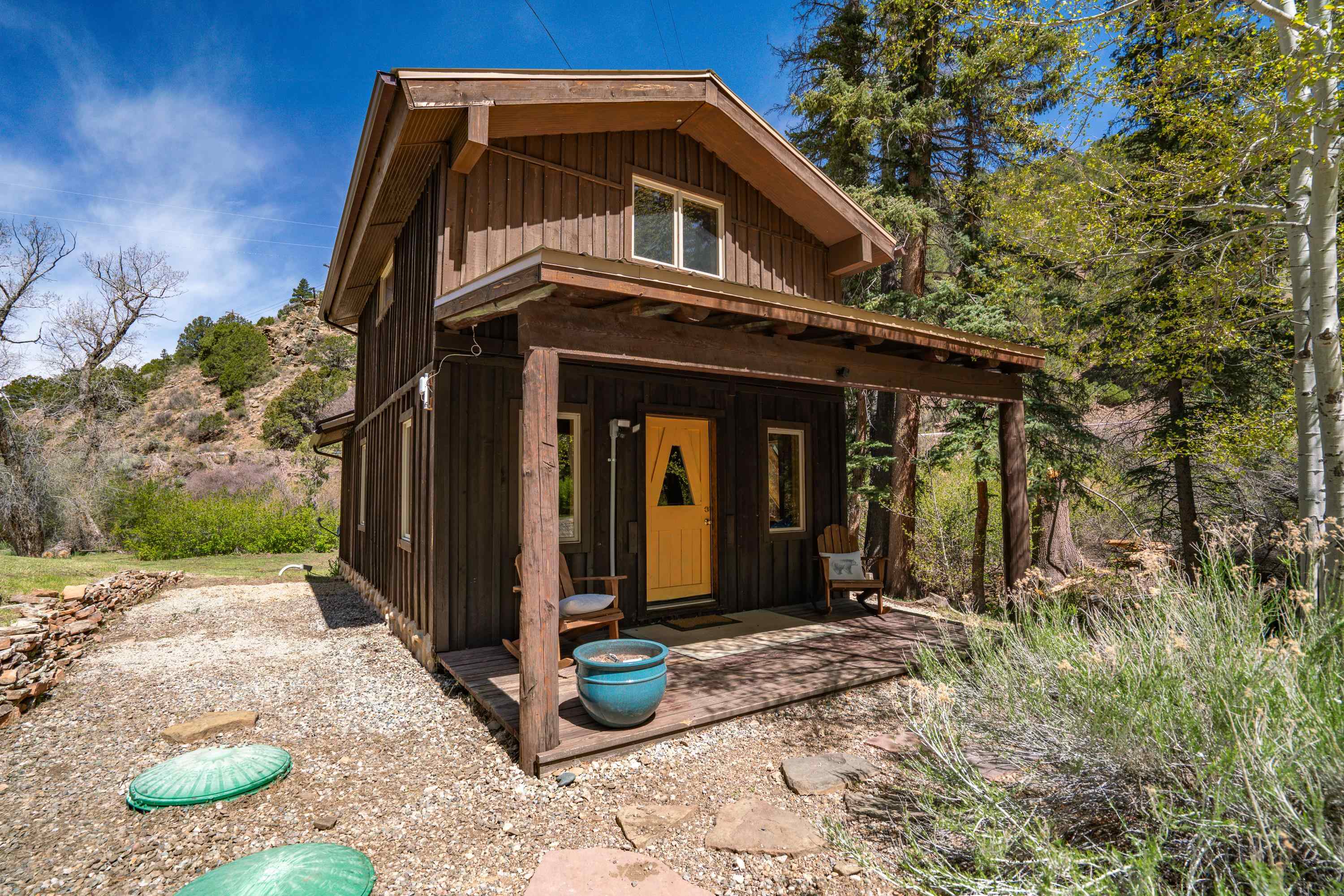 This 7.57-acre property includes a main house and a guest house, with the Rio Fernando running along the entire front portion and the Carson National Forest bordering the back portion. The main house is 1,780 sq ft with 2 bedrooms and 2 bathrooms—one with a shower, the other with a bathtub. It includes a large living room with a grand stone fireplace, a sunroom, and a fenced backyard perfect for pets, and a hot tub easily accessed off the master. The kitchen has travertine floors, a large enamel farm sink, new double door fridge, large pantry, and a light filled breakfast area with views of the surrounding forest. There’s a dedicated laundry room with additional cabinet storage. The home’s flooring includes oak in the living room and aged pine in the bedrooms; soft on the toes and warm in the winter! The master suite features a wood-burning kiva fireplace, a large walk-in closet, and an en suite bathroom. A stone patio with a built-in wood-fired grill sits off the kitchen and the front porch is covered and has a inviting view; two of many places around the property to enjoy the outdoors. A lawn gently slopes away from the main house leading to the river where you can find several good spots for sitting near the water. Stacked stone walls add borders where needed. The guest house is 1,168 sq ft with 1 bedroom and 1 bathroom. It has multiple closets for storage, and a large downstairs area suitable for use as a game room, living space, art studio, or anything else you may desire. The covered porch off the guest house keeps you dry when he thunderstorms roll in and would be a great place to put a chat set. A storage shed provides extra space; great for wood storage or all the gear you don’t want in the house! If the home and guest house were not enough, there are multiple building spots around the property, a couple with great views down the canyon. The acreage is comprised of two separate lots; affording you the ability to sell one or keep both! The property is accessed via a bridge over the Rio Fernando, making it an easy property to secure if you are away for long periods of time. You won’t be disconnected from the world as there is a high speed internet connection! The main house has forced air heating while the guest house has two gas heaters, both run off propane. A private well supplies all domestic water. This is the property dreams are made of; you’ll want to stay if you come visit so be prepared when booking a showing!